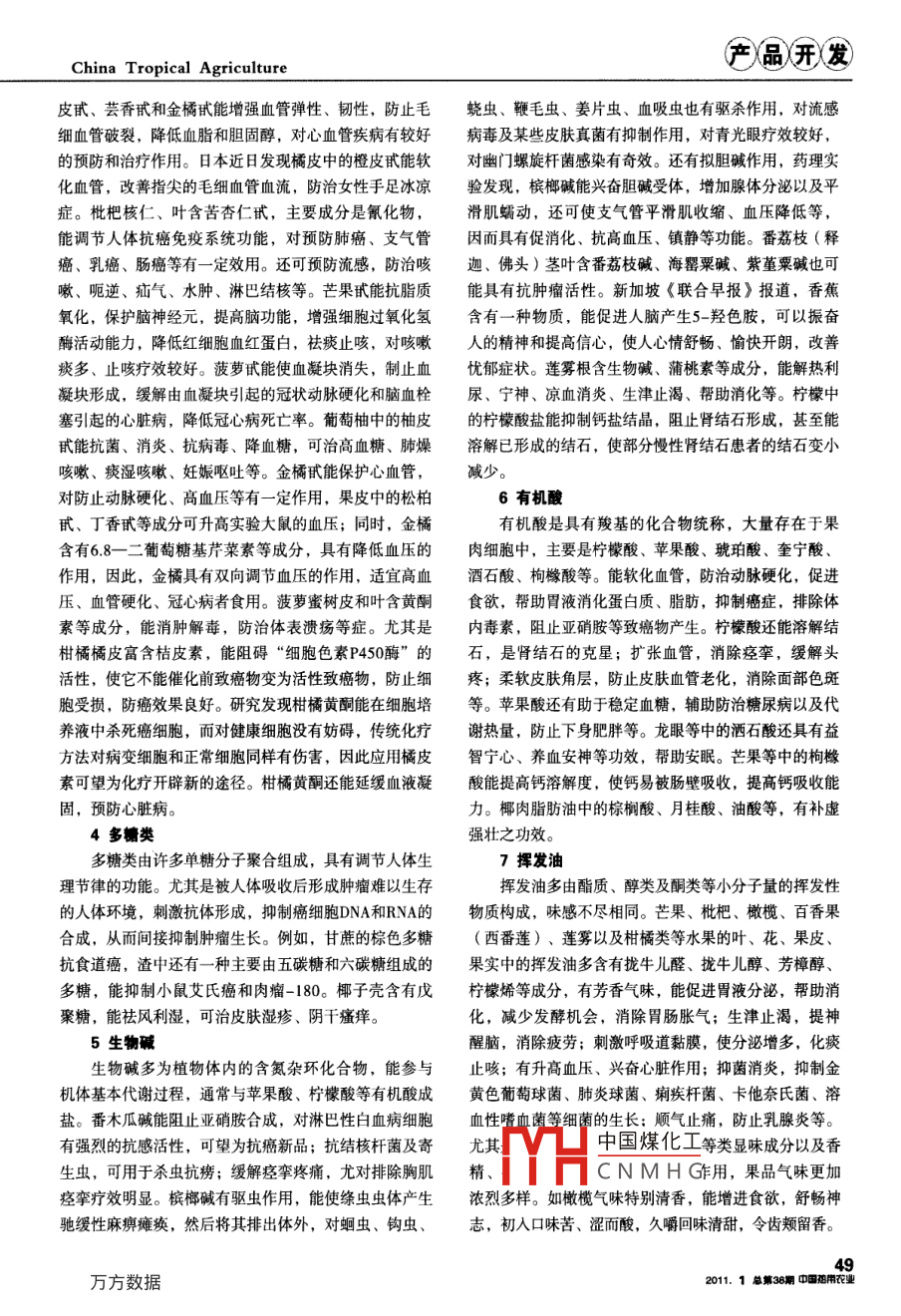 產(chǎn)品開發(fā)China Tropical Agriculture熱帶水果次生物質食療功效◎江蘇省大豐市農(nóng)業(yè)委員會李思義摘要:熱帶水果在新陳代謝過程中合成與積累了許多次生物質,生物活性顯著,食療功效良好。關鍵詞:熱帶水果;次生物質;食療;功效熱帶水果不僅含有豐富的營養(yǎng)成分與膳食纖維,營宮頸癌、乳腺癌等亦有一定的抑制作用;保護低密度脂養(yǎng)價值與保健功能高,而且隨著現(xiàn)代醫(yī)學的發(fā)展,日漸蛋白免受氧化,降低血脂、軟化血管、防治心腦血管疾明確這類水果在新陳代謝過程中合成與積累了許多次生病;保護皮膚免受紫外線的損傷,幫助女性祛斑美容物質,生物活性顯著,食療功效良好,越來越受到人們讓肌膚富有彈性;改善男子精子質量,提高男性生殖功青睞?,F(xiàn)將有關研究成果概覽于下。能;抑制脂質過氧化形成多種產(chǎn)物,促使細胞生長和再1植物色素生,增強抵抗力,延緩衰老等,故被譽為保障人類健康11類胡蘿卜素的“植物黃金”。類胡蘿卜素是植物葉綠體、有色體中的一類由異12花青素戊二烯殘基組成的共軛雙鍵長鏈類萜化合物,呈黃色或花青素是一種水溶性植物色素,存在于植物果實紅橙色。可分為3類:一是胡蘿卜素,由碳、氫組成,花、莖、葉液泡內的細胞液中,其顏色隨細胞液的變化有α、β、γ3種異構體。芒果、菠蘿、木瓜、枇杷、而改變,細胞液堿性時呈藍色或紫色,酸性時呈紅色。香蕉、黃皮、火龍果以及柑、橘、橙、柚、檸檬之類目前已知有18種,火龍果有一定含量。花青素是具有髙的柑橘類水果等含量較多。其中,β胡蘿卜素是Ⅴ和效抗氧化特性的自由基清除劑,其能力是Ⅴ的20倍視紫質的前身,在人體內可轉化為V,合成視紫質,V的50倍,對100多種疾病有防備和治療作用。例如,保護視力,防止人體缺乏時招致視網(wǎng)膜黃斑發(fā)育不良能防止對細胞DNA的破壞,組織衰老和引起腫瘤;預防視物模糊不清。保護T細胞,阻斷致癌物質亞硝胺的形腦細胞變性,抑制癡呆病發(fā)生;減少自由基對胰島β細成,防止苯并芘等致癌物附著肺細胞,穩(wěn)定上皮組織,胞的損害,修復被氧化損傷的胰腺組織,促進胰島素分阻止、延緩細胞癌變。芒果富含β胡蘿卜素和一種獨一泌,穩(wěn)定血糖,輔助治療糖尿病;消炎減痛,消除腫無二的酶,能激發(fā)肌膚細胞活力,促進廢棄物排出,保脹,防治關節(jié)炎和痛風;防止“黃斑退化”引起視力衰持膠原蛋白彈性,有效延緩皺紋出現(xiàn)。二是葉黃素類,退和防止“電腦眼”之類因用眼過度引起的干眼病等。由碳、氫、氧3種元素組成,有多種異構體。柑橘類水2檸檬苦囊類似物果葉黃素、芒果胡梅黃素等能強化心血管系統(tǒng)功能,防檸檬苦素類似物是一群三萜類衍生物,迄今已從柑止血管堵塞、動脈硬化及心臟病等發(fā)生,對吐瀉亦有較橘類水果中分離出36種,主要有檸檬苦素、諾米林、檸好療效。柑橘類水果還含有玉米黃質,抗癌效果比胡蘿檬苦素糖苷、諾米林糖苷等。能防止細菌、真菌侵害機卜中的β胡蘿卜素強5倍,有助于降低患癌風險。三是體,消滅原蟲,驅除體內寄生蟲;提高抗應激作用,緩番茄紅素,是自然界中最強的一種抗氧化劑。木瓜、葡和與防治應激綜合癥,催眠、抗焦慮效果明顯;增強肝萄柚有一定含量,在人體組織中主要分布于肝、肺、前臟谷胱甘肽轉移酶(GST)活力,提高解毒排毒能力。列腺、皮膚等部位,儲存最多的是男性前列腺和女性子尤其是諾米林,味道苦澀,可分解致癌化學物質,抑制宮、卵巢、乳房等器官,功能覆蓋多個方面,能促進前和阻斷癌細胞生長,成倍提高體內除毒酶活性,阻斷致列腺組織修復,保護前列腺組織生物膜免受損傷,防止癌物中國煤化工對胃癌療效龍佳前列腺增生、肥大;保護女性乳房、卵巢和子宮,降低乳腺增生、宮頸疾病的發(fā)病機率;阻止自由基對組織細CNMH3縮合而成,大多具有胞的基因的毒性作用與損傷,阻止癌變進程,減少男性苦味或特殊香氣,是卓越的抗氧化物質。枇杷、芒果、罹患前列腺癌的風險,對消化道癌、皮膚癌、膀胱癌、菠蘿以及柑橘類等水果含量較多,種類很多,其中:橙西教據(jù)CTropical Agriculture產(chǎn)儡開發(fā)皮甙、蕓香甙和金橘甙能增強血管彈性、韌性,防止毛蟯蟲、鞭毛蟲、姜片蟲、血吸蟲也有驅殺作用,對流感細血管破裂,降低血脂和膽固醇,對心血管疾病有較好病毒及某些皮膚真菌有抑制作用,對青光眼療效較好的預防和治療作用。日本近日發(fā)現(xiàn)橘皮中的橙皮甙能軟對幽門螺旋桿菌感染有奇效。還有擬膽堿作用,藥理實化血管,改善指尖的毛細血管血流,防治女性手足冰涼驗發(fā)現(xiàn),檳榔堿能興奮膽堿受體,增加腺體分泌以及平癥。枇杷核仁、葉含苦杏仁甙,主要成分是氰化物,滑肌蠕動,還可使支氣管平滑肌收縮、血壓降低等能調節(jié)人體抗癌免疫系統(tǒng)功能,對預防肺癌、支氣管因而具有促消化、抗高血壓、鎮(zhèn)靜等功能。番荔枝(釋癌、乳癌、腸癌等有一定效用。還可預防流感,防治咳迦、佛頭)莖葉含番荔枝堿、海罌粟堿、紫堇粟堿也可嗽、呃逆、疝氣、水腫、淋巴結核等。芒果甙能抗脂質能具有抗腫瘤活性。新加坡《聯(lián)合早報》報道,香蕉氧化,保護腦神經(jīng)元,提高腦功能,增強細胞過氧化氫含有一種物質,能促進人腦產(chǎn)生5-羥色胺,可以振奮酶活動能力,降低紅細胞血紅蛋白,祛
