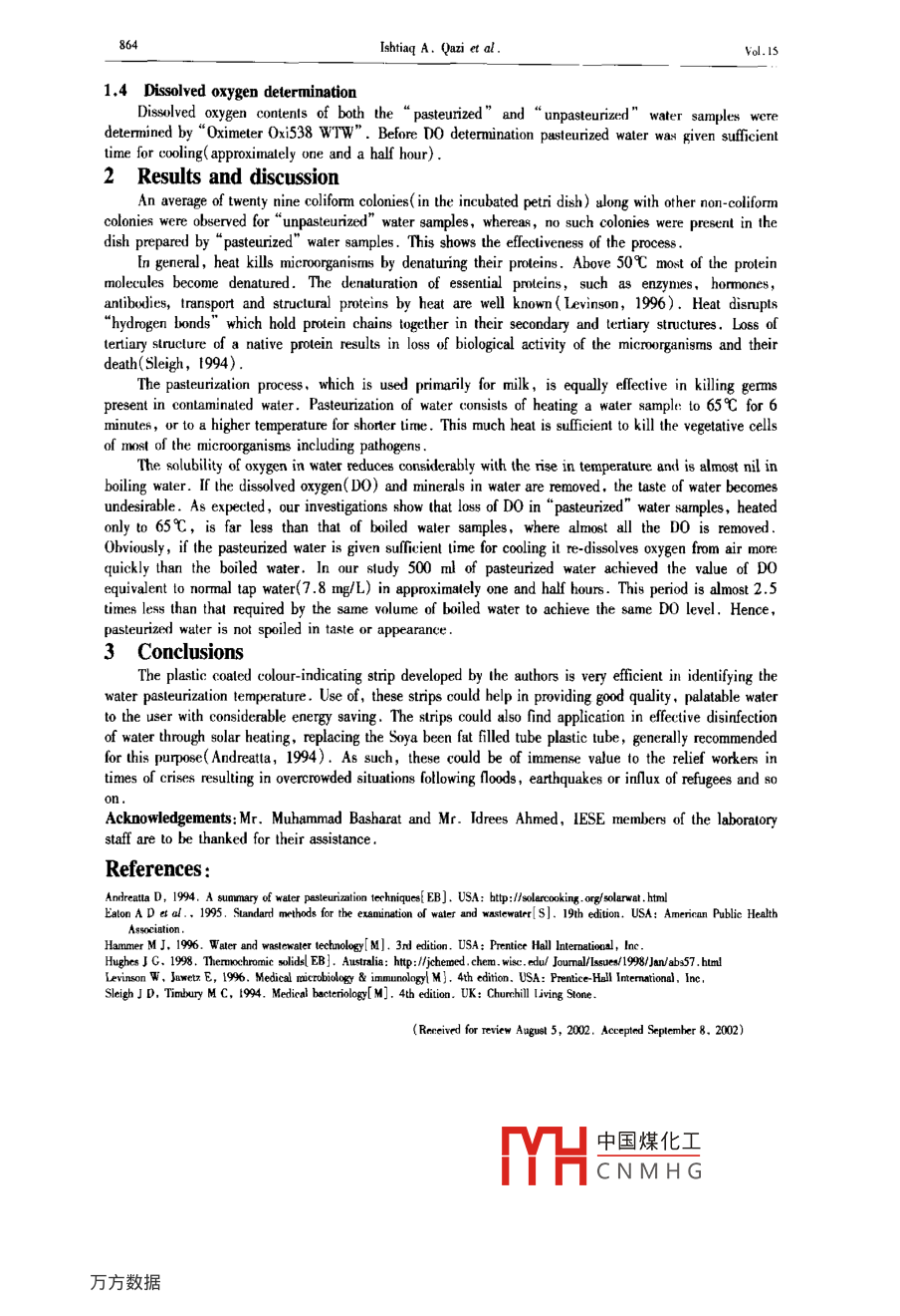 Jurud of Eninonenal Seienes Vol. l5.No6.pp.863- -864.2003IS 1001 10742CNI-2629XArtidle ID: 1074200-0863-020CLC number: X830.2Document code: ADevelopment of thermochromic strips as a water pasteurizationindicatorIshtiaq A. Qazil ,M. Ali Awan2 , M. Anwar Baig(1.Pakistan Council of Renewble Enesy Trhnogioe(PCRET), Islamahad, Palistun. E-mal: ihiag-qazaia @ yaoo vom; 2. Iatitnte ofEnvinometal Sciencer and Enincenge IESE), Natioal Univenily of Sienes & Technodug (xUSr). Realpindi, Palisea)Abstract: Biling of waler, for pufraion. cnmoly pertired in lbe wold, has meny poblems asociated wih it like danger of sealding.scealing in the vesspls. renoval of useful minerals and blandness ol taste elc. Water can be made safr for drinking simply by heating at 65T for6 minutes. A colour indicahing stip was dereloped which changes colour from red lo puple at 67r. Use of this strip cean help in peteunizingwater withnut the above problems and with considenable energy saring.balatn'Keywords: thermochromic srip; pasteurization indicator; PakistanIntroductionAccording to the United Nations Children' s Fund( UNICEF) about 60% of rural farmilies and 23% ofurban fanmilies in developing countries are withoul safe drinking waler and in some areas the waler suppliesmay be heavily contaminated with pathogenie organisms. Outbreaks of water bormne of infectious diseasesike hepatis are thus common in many parts of the world( Hanmer. 1996).Diarrhea, a common disease of children in the developing countries, is caused by the use ofmicrobialy contaminated waler . Dehydration, resulting from diarrhea, is the leading cause of death inchildren, under the age of five, klling an estimated five million children annually( Andreatla, 1994).Microbially contaminated water is usually boiled to make it free of microbials and safe for drinking.Boiling of waler. comnonly practiced, has many drawbacks associated with it, like danger of scalding,scaling of the boiling vessels, removal of useful minerals and blandness of taste( caused by the removal ofminerals and dissolved oxygen).It is generally known that heating water at 65C for six minutes will kill most of the nmicroorganisms(Andrealta,1994). The process is known as pasteurization a term is usually associated with milk.Pasteurization of water, performned al a lower temperalure than biling, can result in considerable savings infuel costs with associaled economic benefits.In order to do this, however, we need to have a convenient method of knowing, if and when, thewater being heated has atlained the cnitical lower temperature of 65 C. The present work describes thdevelopment and use of an indicator strip for this purpose that has been found to be very ronvenient andeffective in use.1 Methods.1 Thermochronic indicator stripsPaste of a thermochromic compound was prepared by following the method of Hughes( Hughes, 1998)by using sodium metabisulfite as the reducing agent. The thermochromic paste was then applied to anordinary filter paper and dried. The dried paper was cut inta strips, which were subsequently laminatedwith plastic. The resul was a low cost, plastic coated stip, which would change colour from“ red" to"purple" at 67C. The change is very sharp, easily noticeable and totally reversible . These characleristicsmake the strip an ideal indicator that can be conveniently used in monitoring the pasteurization lemperature(659C) of water.1.2 Pasteurization of water500 ml of tap water was heated on a Bunsen bumer . The temperalure was frequently monilored bydipping the above mentioned strip in the water. When the strip exhibited a colour change from red topurple the flame intensity under the water was reduced . This temperature monitoring was cuntinued for 6-7 minutes,in order to get pasteurized water. The procedure was applied to a number of waiter samples forreplication purposes .1.3 Standard coliform testThe standard total coliform test was performed on all the中國煤化工d" walersamples, using the Standard Menbrane Filtration Method( Eaton,TYHCNMHG864Ishtiaq A. Qazi et al.Vol.IS1.4 Dissolved oxygen delerminationDissolved oxygen contents of both the “ pasteurized”and “unpasteurized" water sanples weredelermined by“Oximeter 0xi538 WTW" . Before D0 detemination pasteurized water was given sufcienttime for cooling( approximately one and a half hour) .2 Results and discussionAn average of twenty nine coliform colonies( in the incubated petri dish) ulong with other non-coliformcolonies were observed for“unpasteurized" water samples,whereas, no such colonies were present in thedish prepared by' pasteurized" water samples . This shows the electiveness of the process .In general, heat kills microorganisms by denaturing their proteins. Above 509 most of the proteinmolecules become denatured. The denaturation of essential proteins, such as enzymes ,hormones,antibodies, transport and structural proteins by heat are well known ( Levinson,1996). Heat disnupts“hydrogen bonds”which hold protein chains together in their secondary and tertiary structures. Loss oftertiany struclure of a native protein results in loss of biological activity of the microorganisms and theirdeath( Sleigh, 1994) .The pasteurization process. which is used primarily for milk, is equally elective in klling germspresent in contaminated water. Pasteurization of water consists of heating a water sample: to 65C for 6minutes, or to a higher temperature for shorter time. This much heat is sufficient to kill the vegetative cellsof most of the microorganisms including pathogens .The solubility of oxygen in water reduces considerably with the rise in temperature and is almost nil inboiling waler. If the dissolved oxygen( D0) and minerals in water are removed, the taste of water becomesundesirable. As expected,our investigations show that loss of DO in“pasteurized" water sarmples, heatedonly to 65C, is far less than that of boiled waler samples, where almost all the D0 is removed .Ohviously, if the pasteurized wate