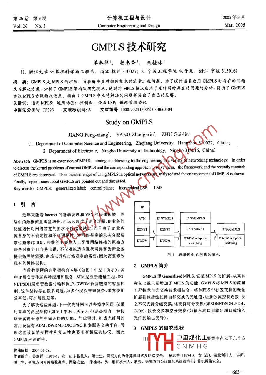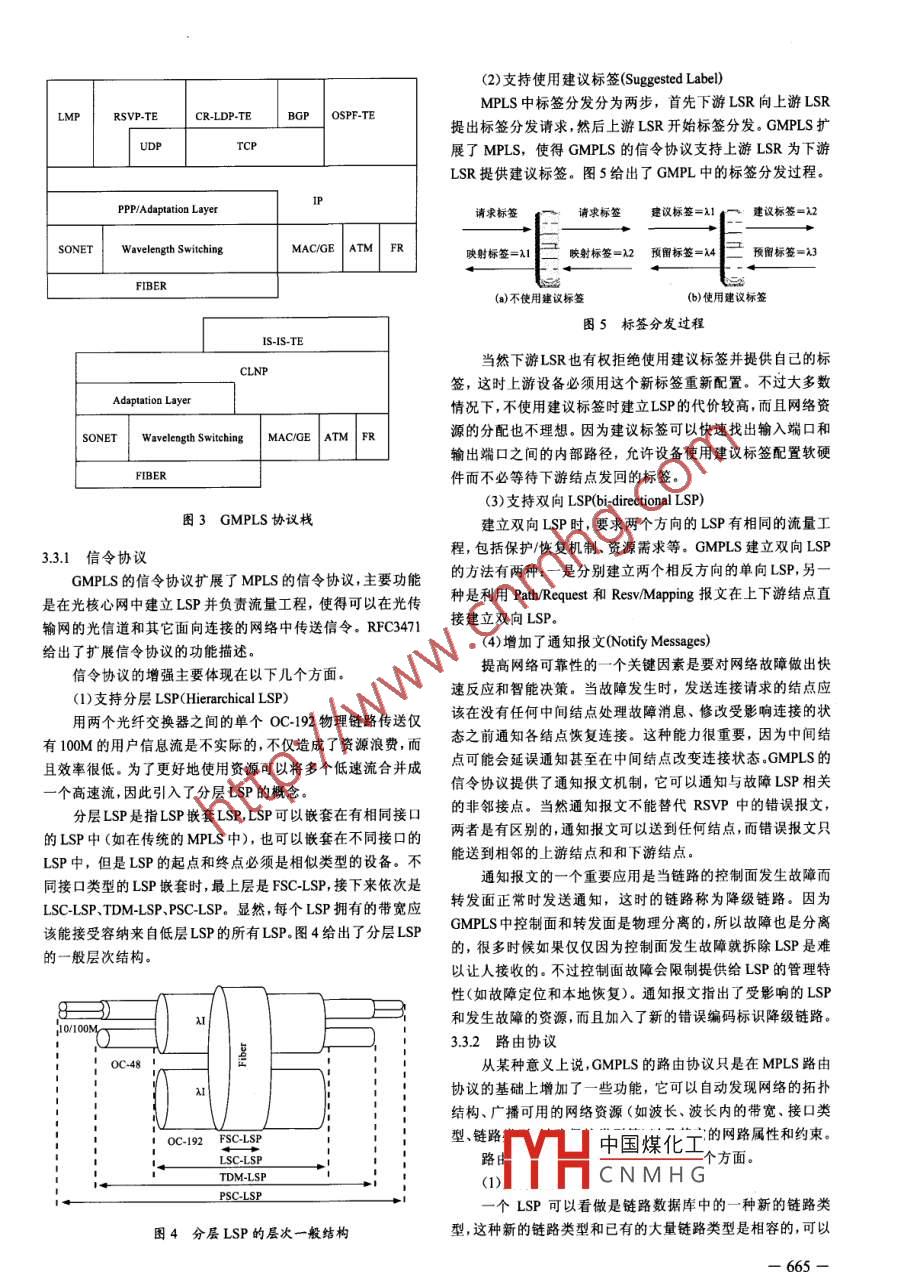 .第26卷第3期計算機工程與設(shè)計2005年3月Vol.26 No. 3Computer Engineering and DesignMar. 2005GMPLS技術(shù)研究姜奉祥',楊忠秀",朱桂林'(1. 浙江大學(xué)計算機科學(xué)與工程系,浙江杭州310027; 2. 寧波工程學(xué)院電子系,浙江寧波315016)摘要: GMPLS是MPLS的擴展,旨在解決多種組網(wǎng)技術(shù)的流量工程問題。為了探討當(dāng)前應(yīng)用GMPLS時存在的問題及其解決方案,分析了GMPLS架構(gòu)及研究現(xiàn)狀,通過對MPLS協(xié)議應(yīng)用于光纖網(wǎng)時存在的問題的分析,得出了GMPLS協(xié)議MPLS協(xié)議的改進點。指出了GMPLS中亟待解決的問題并提出了自己的見解。關(guān)鍵詞:通用MPLS;通用標(biāo)簽;控制面;分層LSP;鏈路管理協(xié)議中圖法分類號: TP393文獻標(biāo)識碼:A文章編號: 100 7024 (2005) 03-0663-04Study on GMPLSJIANG Feng-xiang',YANG Zhong-xiu',ZHU Gui-lin'(1. Depatment of Computer Science and Engineering, Zhejiang University, Hangzhou 310027, China;2. Department of Electronic, Ningbo University of Technology, Ningbo 315016, China)Abstract: GMPLS is an extension of MPLS, aiming at adressing trffic engineering to a variety of networking technology. In orderto discuss the kermel problems of curent GMPLS and the cresponding approach to solve them, the framework and the recently researchofGMPLS are described. Then the callenges of using MPLS in optical networks are analyzed and the enhancement ofGMPLS is drawn.Finally, open isues about GMPLS are pointed out and discussed.Key words: GMPLS; generalized label; control plane; hierarchical LSP; LMP1引言近年來隨著Intenet的蓬勃發(fā)展和VPN的快速傳播,網(wǎng)ATMIP WMPLSIP W/GMPLS絡(luò)中的數(shù)據(jù)流量迅猛增長,已遠(yuǎn)遠(yuǎn)超過了語音流量,IP業(yè)務(wù)的快速增長對網(wǎng)絡(luò)帶寬的要求不僅越來越大,而且由于IP業(yè)務(wù)SONET SONETThin SONET流自身的不確定性和不可預(yù)見性,對網(wǎng)絡(luò)帶寬的動態(tài)分配要DWDM w/optical求也越來越迫切。傳統(tǒng)的主要靠人工配置網(wǎng)絡(luò)連接的原始方DWDMswitching法費時費力且容易出錯,不僅難以適應(yīng)現(xiàn)代網(wǎng)路和為新業(yè)務(wù)提供拓展的需要,也難以適應(yīng)市場競爭的需要,因此需要修改圖1數(shù)據(jù)網(wǎng)向光網(wǎng)絡(luò)的演化現(xiàn)有的網(wǎng)絡(luò)架構(gòu)。2 GMPLS 簡介當(dāng)前數(shù)據(jù)網(wǎng)的典型架構(gòu)有4層(如圖1中左1所示),其中IP,層負(fù)責(zé)傳送各種應(yīng)用和服務(wù), ATM層負(fù)責(zé)流量工程, so-GMPLS即Generalized MPLS,它是MPLS的擴展,從某種NET/SDH層負(fù)責(zé)數(shù)據(jù)傳輸和保護,DWDM負(fù)責(zé)鏈路的容量控意義上說只是增加了MPLS的功能。GMPLS將MPLS的流量制。這種架構(gòu)存在很多問題,如多個層次管理復(fù)雜、帶寬使用工程技術(shù)與光交換技術(shù)相結(jié)合,將MPLS中標(biāo)簽交換的概念效率低、可擴展性差等。擴展到包括波長路由和交換的光通道,讓業(yè)務(wù)流控制連接,使為了解決這些問題,下一代光纖網(wǎng)可以去掉中間層,僅采之不僅支持分組交換,還支持時分交換(如SONET/SDH、PDH、用簡單的兩層架構(gòu)(如圖1中右1所示),但是必須有一種協(xié)G709)、波長交換和空分交換(如輸入端口到輸出端口或輸入議來實現(xiàn)去掉的中間兩層的功能。與此同時,組成光纖網(wǎng)的光纖到輸出光纖)。常用設(shè)備有ADM.DWDM、OXC、PXC和多服務(wù)交換平臺,管3 GMPLS 的研究現(xiàn)狀理這些設(shè)備的多樣性和復(fù)雜性也要求有相應(yīng)的協(xié)議,因此GMPLS應(yīng)運而生。中國煤化工要集中在以下幾個方Y(jié)HCNMHG收稿日期: 2004-06-08.作者簡介:姜奉祥(977.), 女,山東臨邑人,碩士生,研究方向為計算機網(wǎng)絡(luò)及網(wǎng)絡(luò)安全:楊忠秀 (1974), 女(苗),湖北利川人,講師,碩士生,研究方向為網(wǎng)絡(luò)數(shù)據(jù)庫、網(wǎng)絡(luò)安全:朱桂林, 男,浙江杭州人,教授, 研究方向為計算機系統(tǒng)結(jié)構(gòu)和計算機網(wǎng)絡(luò)安全。-663一面:標(biāo)簽的擴展、架構(gòu)的修改、協(xié)議的改進等。其中有些方面(3)TDM接口做的工作相對較多,有的方面只是投入了一些關(guān)注,對具體需TDM接口(Time-Division Multiplex Capable,時分交換接求進行了分析。下面就對這些方面分別進行討論和分析???根據(jù)數(shù)據(jù)在TDM時隙循環(huán)中的時隙轉(zhuǎn)發(fā)數(shù)據(jù),如SONET/3.1 GMPLS的標(biāo)簽SDH中的XC/TM/ADM設(shè)備上的接口。為了支持實現(xiàn)不同類型交換的各種設(shè)備,GMPLS擴展了在TDM中光纖的帶寬被分為- 個個時隙,LSR可以為特MPLS的標(biāo)簽,增加了一些新的內(nèi)容,這種新型標(biāo)簽稱為通用定的數(shù)據(jù)流請求分配一個或多個時隙,這時分配到的時隙就標(biāo)簽或G標(biāo)簽。G標(biāo)簽在很大程度上模擬了郵局遞送服務(wù)使是標(biāo)簽。用的標(biāo)簽。以遞送路徑編號定義的某種類型的標(biāo)簽可以用于(4)LSC接口所有的包裹和目的地址,同樣的標(biāo)簽可以用于遞送信件、包裹LSC接口(Lambda Swich Capable,波長交換接口)根據(jù)接或手提箱,遞送的東西可以跨越城鎮(zhèn)、國家甚至海洋,可以選收到的數(shù)據(jù)所在的波長轉(zhuǎn)發(fā)數(shù)據(jù),連續(xù)的波長組成-一個波帶 ,撣自行車運輸、卡車運輸、火車運輸或空運等方式中最適合的這時稱為波帶交換,原理和波長交換類似,如工作在波長級的-種遞送。標(bi