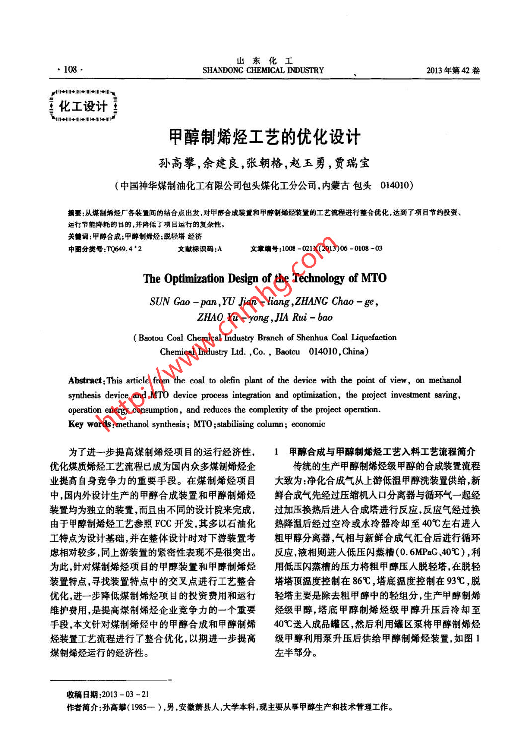 山東化工●108●SHANDONG CHEMICAL INDUSTRY2013年第42卷化工設(shè)計1111l11甲醇制烯烴工藝的優(yōu)化設(shè)計孫高攀,余建良,張朝格,趙玉勇,賈瑞寶(中國神華煤制油化工有限公司包頭煤化工分公司,內(nèi)蒙古包頭014010)摘要:從煤制烯烴廠各裝置間的結(jié)合點出發(fā),對甲醇合成裝和甲醇制烯烴裝置的工藝流程進(jìn)行整合優(yōu)化,達(dá)到了項目節(jié)約投資、運(yùn)行節(jié)能降耗的目的,并降低了項目運(yùn)行的復(fù)雜性。關(guān)鍵詞:甲醇合成;甲醇制烯烴;脫輕塔經(jīng)濟(jì)中國分類號:T0649.4*2文獻(xiàn)標(biāo)識碼:A文章編號:1008 -021X(2013)06 -0108 -03The Optimization Design of the Technology of MTOSUN Gao - pan, YU Jian - liang , ZHANG Chao- ge,ZHAO Yu - yong ,JIA Rui - bao( Baotou Coal Chemical Industry Branch of Shenhua Coal LiquefactionChemical Industry Ltd. ,Co.,Baotou 014010 ,China)Abstract:This article from the coal to olefin plant of the device with the point of view, on methanolsynthesis device and MTO device process integration and optimization, the project investment saving,operation energy consumption, and reduces the complexity of the project operation.Key words: methanol synthesis; MTO ;stabilising column; economic為了進(jìn)一步提高煤制烯烴項目的運(yùn)行經(jīng)濟(jì)性,1甲醇合成與甲醇制烯烴工藝入料工藝流程簡介優(yōu)化煤質(zhì)烯烴工藝流程已成為國內(nèi)眾多煤制烯烴企傳統(tǒng)的生產(chǎn)甲醇制烯烴級甲醇的合成裝置流程業(yè)提高自身競爭力的重要手段。在煤制烯烴項目大致為:凈化合成氣從上游低溫甲醇洗裝置供給,新中,國內(nèi)外設(shè)計生產(chǎn)的甲醇合成裝置和甲醇制烯烴鮮合成氣先經(jīng)過壓縮機(jī)入口分離器與循環(huán)氣- -起經(jīng)裝置均為獨立的裝置,而且由不同的設(shè)計院來完成,過加壓換熱后進(jìn)人合成塔進(jìn)行反應(yīng),反應(yīng)氣經(jīng)過換由于甲醇制烯烴工藝參照FCC開發(fā),其多以石油化熱降溫后經(jīng)過空冷或水冷器冷卻至40C左右進(jìn)入工特點為設(shè)計基礎(chǔ),并在整體設(shè)計時對下游裝置考粗甲醇分離器,氣相與新鮮合成氣匯合后進(jìn)行循環(huán)慮相對較多,同上游裝置的緊密性表現(xiàn)不是很突出。反應(yīng),液相則進(jìn)人低壓閃蒸槽(0.6MPaG、40C) ,利為此,針對煤制烯烴項目的甲醇裝置和甲醇制烯烴用低壓閃蒸槽的壓力將粗甲醇壓人脫輕塔,在脫輕裝置特點,尋找裝置特點中的交叉點進(jìn)行工藝整合塔塔頂溫度控制在86C ,塔底溫度控制在93C ,脫優(yōu)化,進(jìn)-步降低煤制烯烴項目的投資費用和運(yùn)行輕塔主要是除去粗甲醇中的輕組分,生產(chǎn)甲醇制烯維護(hù)費用,是提高煤制烯烴企業(yè)競爭力的一個重要烴級甲醇,塔底甲醇制烯烴級甲醇升壓后冷卻至手段,本文針對煤制烯烴中的甲醇合成和甲醇制烯40C送人成品罐區(qū),然后利用罐區(qū)泵將甲醇制烯烴烴裝置工藝流程進(jìn)行了整合優(yōu)化,以期進(jìn)- -步提高級甲醇利用泵升壓后供給甲醇制烯烴裝置,如圖1煤制烯烴運(yùn)行的經(jīng)濟(jì)性。左半部分。收稿日期:2013-03-21作者簡介:孫高攀(1985- ),男 ,安徽蕭縣人,大學(xué)本科,現(xiàn)主要從事甲醇生產(chǎn)和技術(shù)管理工作。.第6期孫高攀,等:甲醇制烯烴工藝的優(yōu)化設(shè)計. 109.反應(yīng)氣自三旋中間換熱器甲等-蒸汽換熱器p上甲醇-反應(yīng)氣換熱器甲醇至反應(yīng)器新鮮氣分離器循環(huán)氣壓縮機(jī)-,-日甲醇-凝結(jié)水換熱器二。粗甲醇分離器甲惠-汽提氣換熱器L水冷去燃料氣管網(wǎng)?8甲醇升壓泵內(nèi)取熱頭燃料《管網(wǎng)中甲醇-凝結(jié)水換熱器|粗甲A甲醇-凈化水換熱器|醉閃|塔TO甲醇產(chǎn)品顢LN JewT0甲醇外送泵圖1優(yōu)化前的甲醇合成-甲醇制烯烴裝置流程簡圖目前國內(nèi)運(yùn)行的甲醇制烯烴裝置人料甲醇預(yù)熱性,針對國內(nèi)煤制烯烴運(yùn)行項目做如下整合優(yōu)化:如工藝流程:甲醇成品罐區(qū)供給的甲醇制烯烴級甲醇圖 2,將甲醇裝置的脫輕塔下移至甲醇制烯烴裝置(40° 1. 15MPaG)進(jìn)人甲醇制烯烴裝置界區(qū),先分的甲醇人料預(yù)熱部分,以取代甲醇制烯烴裝置的甲成兩路:一路經(jīng)過反應(yīng)器內(nèi)取熱后與另- -路匯合,經(jīng).醇-凝結(jié)水換熱器(兩臺)、升壓泵(兩臺)和甲醇-過甲醇-凈化水換熱器(兩臺)換熱至約70C ,再經(jīng)汽提氣換熱器三部分設(shè)備。整合優(yōu)化后的流程為:甲醇-凝結(jié)水換熱器(兩臺)換熱后分成三路:一路甲醇裝置生產(chǎn)的粗甲醇經(jīng)過粗甲醇閃蒸罐閃蒸后,經(jīng)過升壓泵(兩臺)升壓,一路經(jīng)過甲醇-汽提氣換利用閃蒸罐的壓力直接將粗甲醇壓人粗甲醇儲罐,熱器,- -路經(jīng)過甲醇-蒸汽換熱器,三路匯合后溫度利用粗甲醇泵將甲醇升壓送至甲醇制烯烴裝置,先約為100C再經(jīng)過甲醇-反應(yīng)氣換熱器(兩臺)至經(jīng)過反應(yīng)器 的內(nèi)取熱和甲醇-凈化水預(yù)熱器預(yù)熱至250C左右進(jìn)人反應(yīng)器進(jìn)行反應(yīng),反應(yīng)器人口溫度可約70C ,送人脫輕塔,經(jīng)過脫輕塔將粗甲醇中的輕以通過甲醇-凝結(jié)水換熱器(二)進(jìn)行微調(diào),如圖1組分雜質(zhì)徹底脫除后,將93C合格甲醇制烯烴級甲右半部分。醇加壓后直接送入甲醇-蒸汽換熱器中,再經(jīng)甲醇2優(yōu)化后的甲醇合成和甲醇制烯烴裝置工藝-反應(yīng)氣換熱器升