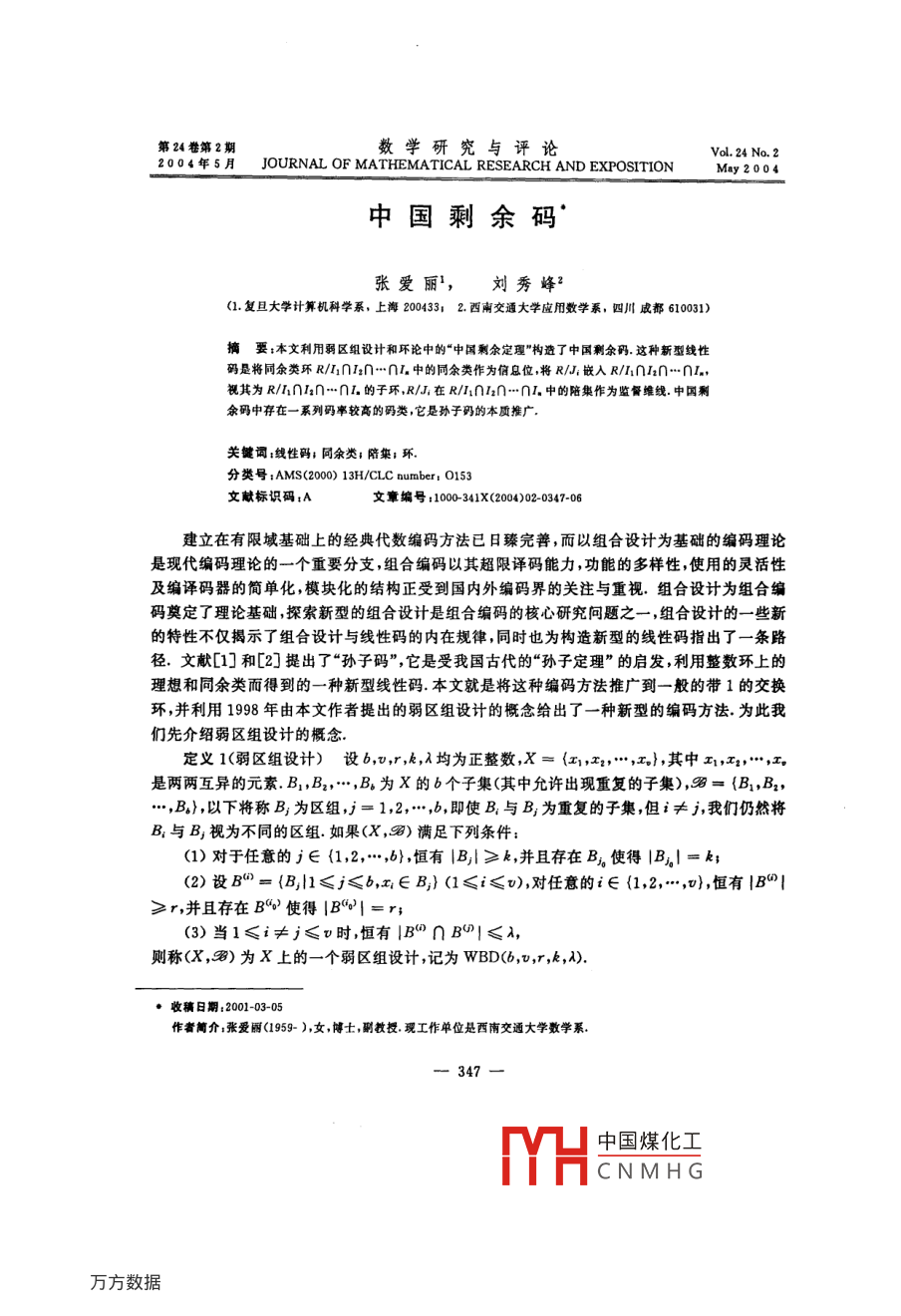 第24卷第2期數(shù)學(xué)研究與評(píng)論VoL 24 No. 22004F5 JOURNAL OF MATHEMATICAL RESEARCH AND EXPOSITION May 200中國(guó)剩余碼張愛麗劉秀峰1.復(fù)旦大學(xué)計(jì)算機(jī)科學(xué)系,上海20043312.西南交通大學(xué)應(yīng)用數(shù)學(xué)系,四川成都610031)搞要:本文利用弱區(qū)組設(shè)計(jì)和環(huán)論中的“中國(guó)剩余定理”杓造了中國(guó)剩余碼這種新型線性碼是將同余類環(huán)R/I∩I2∩…∩,中的同余類作為信息位,將R/J嵌入R/n∩2n…∩L,視其為R/n∩nan…∩L的子環(huán),R/J在R/1∩n2∩…∩中的陪集作為監(jiān)督維線中國(guó)剩余碼中存在一系列碼率較高的碼類,它是孫子碼的本質(zhì)推廣關(guān)鍵詞:線性碼;同余類;陪集;環(huán)分類號(hào):AMS(200013H/ CLC Dumber o153文獻(xiàn)標(biāo)識(shí)碼:A文章編號(hào):1000341X(2004)020347-06建立在有限域基礎(chǔ)上的經(jīng)典代數(shù)編碼方法已日臻完善,而以組合設(shè)計(jì)為基礎(chǔ)的編碼理論是現(xiàn)代編碼理論的一個(gè)重要分支,組合編碼以其超限譯碼能力,功能的多樣性,使用的靈活性及編譯碼器的簡(jiǎn)單化,模塊化的結(jié)構(gòu)正受到國(guó)內(nèi)外編碼界的關(guān)注與重視.組合設(shè)計(jì)為組合編碼奠定了理論基礎(chǔ),探索新型的組合設(shè)計(jì)是組合編碼的核心研究問(wèn)題之一,組合設(shè)計(jì)的一些新的特性不僅揭示了組合設(shè)計(jì)與線性碼的內(nèi)在規(guī)律,同時(shí)也為構(gòu)造新型的線性碼指出了一條路徑,文獻(xiàn)[1]和[2]提出了“孫子碼”,它是受我國(guó)古代的“孫子定理”的啟發(fā),利用整數(shù)環(huán)上的理想和同余類而得到的一種新型線性碼本文就是將這種編碼方法推廣到一般的帶1的交換環(huán),并利用1998年由本文作者提出的弱區(qū)組設(shè)計(jì)的概念給出了一種新型的編碼方法為此我們先介紹弱區(qū)組設(shè)計(jì)的概念定義1(弱區(qū)組設(shè)計(jì))設(shè)b,,r,k,λ均為正整數(shù),X=(x1,x2,…,x},其中x1,x23,…,x是兩兩互異的元素B1,B2,…,B為X的b個(gè)子集(其中允許出現(xiàn)重復(fù)的子集),圖={B1,B2,…,B},以下將稱B為區(qū)組,j=1,2,…b,即使B與B為重復(fù)的子集但i≠j我們?nèi)匀粚4與B視為不同的區(qū)組如果(X,)滿足下列條件(1)對(duì)于任意的j∈1,2,…,b},恒有|B≥k,并且存在B4使得|B|=k(2)設(shè)B={B1≤j≤b,x∈B}(1≤i≤v),對(duì)任意的∈(1,2,…,v),恒有|B°≥r,并且存在B使得|B|=r;(3)當(dāng)1≤i≠j≤v時(shí),恒有|B∩B|≤λ,則稱(X,)為X上的一個(gè)弱區(qū)組設(shè)計(jì),記為WBD(b,v,r,k,A)·收稿日期:2001-03-05作者簡(jiǎn)介:張愛麗(1959),女,博士,副教授,現(xiàn)工作單位是西南交通大學(xué)數(shù)學(xué)系347中國(guó)煤化工CNMHG由定義可以看出:弱區(qū)組設(shè)計(jì)(WBD)是平衡不完全區(qū)組設(shè)計(jì)(BIBD)和異元平衡區(qū)組設(shè)計(jì)(DBBD)的推廣,WBD不要求每個(gè)區(qū)組包含同樣多的元素,也不要求每個(gè)元素在區(qū)組中出現(xiàn)的次數(shù)相等或者每?jī)蓚€(gè)區(qū)組的交集包含同樣多的元素更重要的是,弱區(qū)組設(shè)計(jì)與線性碼在同構(gòu)意義下是一一對(duì)應(yīng)的任給一個(gè)弱區(qū)組設(shè)計(jì)WBD(b,U,,k,A),存在一個(gè)線性碼C[n,h,d]與之對(duì)應(yīng)其中nh,d分別表示碼長(zhǎng)維數(shù)與極小碼距并且諸參數(shù)滿足:n=b+v,h=v,[/4+1≤d≤r+1,[表示不小于/A的最小整數(shù)反之任給定一個(gè)線性碼C[n,h,d],則存在一個(gè)弱區(qū)組設(shè)計(jì)WBD(b,v,r,k,),使得該弱區(qū)組設(shè)計(jì)對(duì)應(yīng)的線性碼C1=C1[b+v,,d]與C同構(gòu)設(shè)WBD(b,v,r,k,)表示一個(gè)弱區(qū)組設(shè)計(jì),A=(a1)b是它的關(guān)聯(lián)矩陣,即∫1,如果x∈B,0,如果x;∈B,其中X={x1,x2,…,x}表示W(wǎng)BD的頂點(diǎn)集,={B1,B2,…,B}表示區(qū)組族令G表示下面的分塊矩陣G=(,A),其中表示v階單位矩陣,則以G為生成矩陣的線性碼就是WBD對(duì)應(yīng)的線性碼C[n,h,d]即以WBD的頂點(diǎn)為信息位以區(qū)組為監(jiān)督維線,同時(shí)以關(guān)聯(lián)矩陣為監(jiān)督關(guān)系的線性碼就是C[nh,d]引理設(shè)R是帶1的交換環(huán),I1,I2,…,是R的s個(gè)兩兩互素的理想,并且R/為有限環(huán),|R/I,|=m;,=1,2,…,5,J1=I:∩I3∩…∩I,J2=l1∩I3∩…∩r,J=l1∩l2∩…∩l-1(1)|R/1∩n2n…∩H=Ⅱm;(2)|R/,|=(mm2…m,)/m,證明(1)因?yàn)閘1,I2,…,是環(huán)R中兩兩互素的理想,由“中國(guó)剩余定理,則有環(huán)的自然同構(gòu)R/l1n2∩…∩L,R/1R/I2…④R/,a(mod∩)→(a(modl1),a(modl2),…,a(modl2)按假設(shè)|R/I,=m,1≤i≤s,對(duì)于任意的a∈R/l1∩I2∩…∩I,a能夠一意地表示為因此,R/1∩I2∩…∩I,=m1m2…m1(2)因?yàn)镽/J,=R/I1∩…∩I-1∩I+∩…∩L,再根據(jù)“中國(guó)剩余定理”,可以得到R/J≈R/1④…⊕R/I-1R/+1…R/I,348中國(guó)煤化工CNMHGa(modJ4)→(a(modI1),…,a(modI-1),a(modI,+1),…,a(mod)),所以有|R/J=m1…m-m+1…m,=(m1m2…m,)m定理1(1)設(shè)R是帶1的交換環(huán),l1,12,…,是R的5個(gè)兩兩互素的理想,并且R/I,為有限環(huán),1≤i≤5;I=l1nI2∩…∩I,J1=l2∩I3∩…∩I,r,∩I3∩…∩LJ=I∩I2∩…∩L(3)設(shè)|R/|=m1,1≤i≤5;(4)設(shè)R/J,中含有n個(gè)同余類,每一個(gè)同余類選取一個(gè)代表元素得到y(tǒng),y2…,y,用R/I·中的同余類作信息位,定義監(jiān)督維線B1=(∈R/I,=x+I,x≡y(modJ1)},1≤j≤nB2=(|∈R/,=x+I,x≡y(mod/2)},1≤j≤n2lB,={∈RH·,=x+I,xy(mod)},1≤j