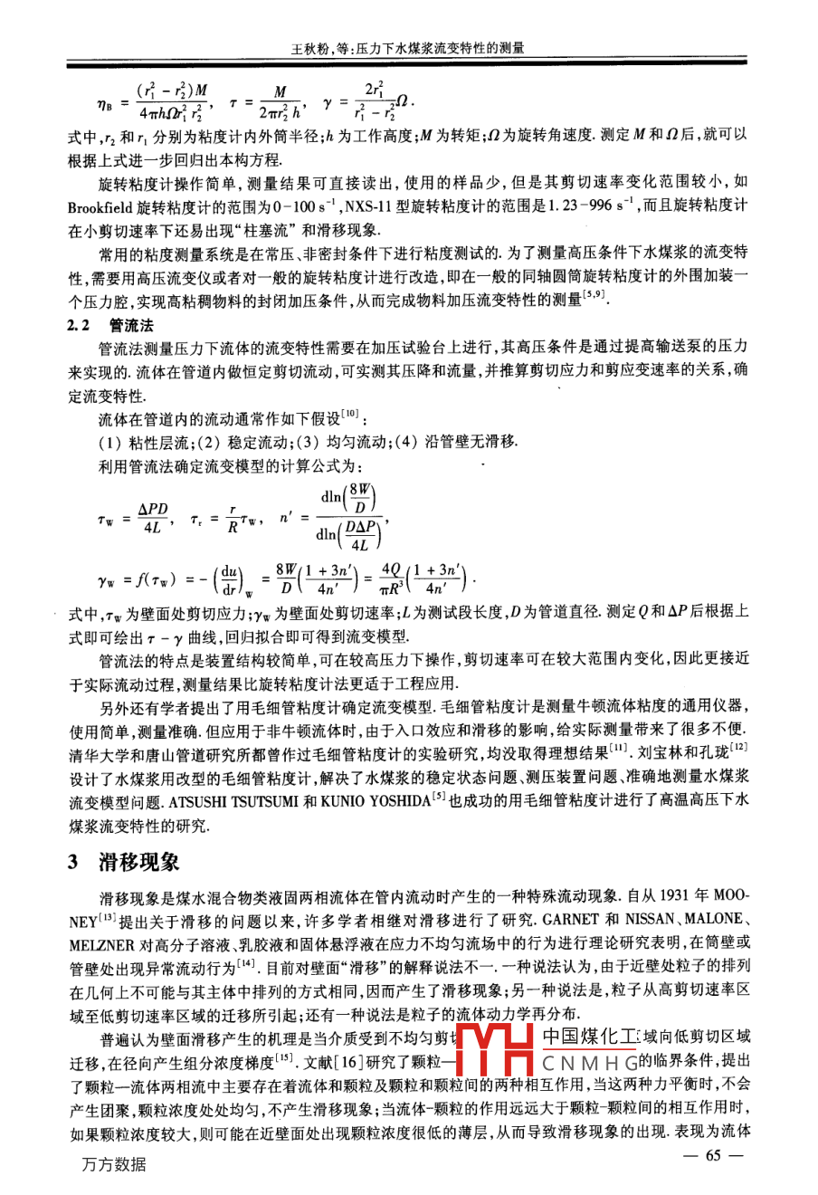 第6卷第2期南京師范大學學報(工程技術版)20064F6 F JOURNAL OF NANJING NORMAL UNIVERSITY(ENGINEERING AND TECHNOLOGY) Jun, 2006壓力下水煤漿流變特性的測量王秋粉,任遠,陳良勇,段鈺鋒東南大學潔凈煤發(fā)電和燃燒技術教育部重點實驗室江蘇南京210096)[摘要]水煤漿是一種髙濃度、高粘性、不透明的固液分散懸浮體系表現出非牛頓流體的特性,其流變特性十分復雜,迄今為止難以給出理論上的流變模型表達式水煤漿流變特性是研究水煤漿的穩(wěn)定性輸送的可泵性、流動的阻力特性和霧化特性的前提和基礎詳細介紹了確定壓力下水煤漿流變特性的兩種試驗方法:管流法和旋轉粘度計法并對水煤漿輸送中產生的滑移現象進行了較深入的分析和討論,討論了滑移產生的原因及修正方法[關鍵詞]水煤漿流變特性壓力測量滑移[中圖分類號]TQ3[文獻標識碼]A[文章編號]1672-1292(2006)0200305Measurement for the rheological Behavior ofCoal Water Surry at Elevated PressureWANG Qiufen, REN Yuan, CHEN Liangyong, DUAN YufengKey Laboratory of Clean Coal Power Generation and Combustion Technology of the Ministry of EducationSoutheast University, Nanjing 210096, ChinaAbstract: Coal water slurry(CWS)is solid-liquid suspended system with dense concentration, high viscosity and o-pacity, which features property of Non-Newtonian fluids. So far it is difficult to gain the rheological model in theorybecause of the complexity in its flows. The characterization study of rheological behavior in Cws is important for slur-ry stability, pumpability, flow resistance and atomization. Two experimental methods known as pipe-flow and rotation-al viscometer to determine the rheological behaviors of CWS are proposed. The slip phenomenon of Cws in pipe flow.is discussed deeply.Key words: coal water slurry, rheological behavior, pressure, measure, slippage0引言當前石油供給的安全性使人們越來越多地關注煤轉化技術,其中包括對水煤漿技術的研究水煤漿是由煤粉、水和少量添加劑混合而成的固液兩相懸浮流體,高濃度水煤漿的安全、穩(wěn)定和經濟地管道輸送是保證水煤漿高效應用的前提水煤漿的大規(guī)模商業(yè)應用取決于很多因素,包括漿的穩(wěn)定性,可泵性和霧化、燃燒特性,而這些因素又反過來影響水煤漿的流變特性特別地,水煤漿的穩(wěn)定性由其低剪切速率下的流變性決定,可泵性取決于中等剪切速率下漿的粘度,霧化和燃燒特性則取決于高剪切速率下漿的粘度可見,流變特性的研究是確定水煤漿管內其它流動規(guī)律(如速度分布、阻力損失計算等)的前提和基礎非牛頓流體的流變特性是研究剪切應力與剪切應變速率之間關系的規(guī)律,其分析表達式稱為流變模型或稱為本構關系.由于水煤漿是一種寬篩分、高含固量的復雜多級分散懸浮體系,影響其流變特性的因素十分復雜,往往同煤的化學性質特別是灰分和煤化程度、煤顆粒的粒度分布及形狀、煤粒之間的相互作用、溫度和濃度等因素有關23.另外,真實流變模型還受入中國煤化工水煤漿管內輸送收稿日期:2005-11-22.CNMHG基金項目:國家重點基礎研究發(fā)展計劃(973計劃)資助項目(2004CB217701)作者簡介:王秋粉(1982-),女碩士研究生,主要從事煤的潔凈燃燒與氣化等方面的學習和研究Emal;gwang1982@163.com通訊聯系人:段鈺鋒(1963-),教授博士生導師,主要從事煤的潔凈燃燒及污染物的控制等方面的教學與研究E-mail:yfduan@seu.edu.cn南京師范大學學報(工程技術版)第6卷第2期(2006的研究進展來看,世界各國都將水煤漿流變模型的確定作為研究的主要內容之般文獻都普遍認為水煤漿是不可壓縮的,因而都未考慮壓力對水煤漿流變特性的影響 GARRAT GW4等和 ATSUSHI TSUTSUM5等雖分別研究了高溫高壓下旋轉粘度計法和管流法的流變特性,但都沒有具體地分析壓力對水煤漿流變特性的影響為了發(fā)展大規(guī)模高效氣流床煤氣化技術,有必要確定高壓下水煤漿的真實流變模型,為氣流床煤氣化的規(guī)?;头糯蠡瘧锰峁┰O計依據.為此,本文研究內容成為國家重點基礎研究發(fā)展計劃(973計劃)的子課題“高濃度漿態(tài)非牛頓流體的流動特性和均配規(guī)律研究的一部分,對高濃度水煤漿在壓力下的流變特性進行了綜合分析和討論1流變模型流變特性的研究通常有兩種方法:一是從微觀角度出發(fā),即從懸浮液各部分的性質以及它們之間的相互作用,通過理論分析來建立關聯式;二是著眼于懸浮液的宏觀流動行為,即通過實驗來觀察懸浮液的流變特性,提出包含幾個參數的流變模型,然后利用流變學的知識通過實驗的方法來確定這些參數由于液固兩相高濃度水煤漿組成的復雜性,目前還無法從機理上探討流變特性的本構方程許多研究者對水煤漿流變特性的研究,通常是采用第二種方法,借助實驗數據由剪切應力的變化或某些與剪切速率相對應的“表觀粘度”的變化曲線得出流變模型大量實驗表明,水煤漿幾乎包括了非牛頓流體的各種類型,且存在明顯的結構化特征,即存在屈服應力.在較低剪切速率和較高的剪切速率下水煤漿呈現出牛頓流體特性,而在中等剪切速率下呈現假塑性體特性只有極少的水煤漿呈現出脹流性流體特性,此外,有的還具有較大的觸變性和粘彈性6目前,常采用的流變模型有以下幾種牛頓體:r=μy;冪率體:r=ky;n<1,偽塑性體;n>1膨脹體;賓漢體:r=丌+ηy;屈服冪率體r=r,+ky;n<1,有屈服應力的偽塑性體;n>1,有屈服應力的膨脹體;式中μ是粘度;k是流動相容系數(又叫稠度系數)以上模型簡單,