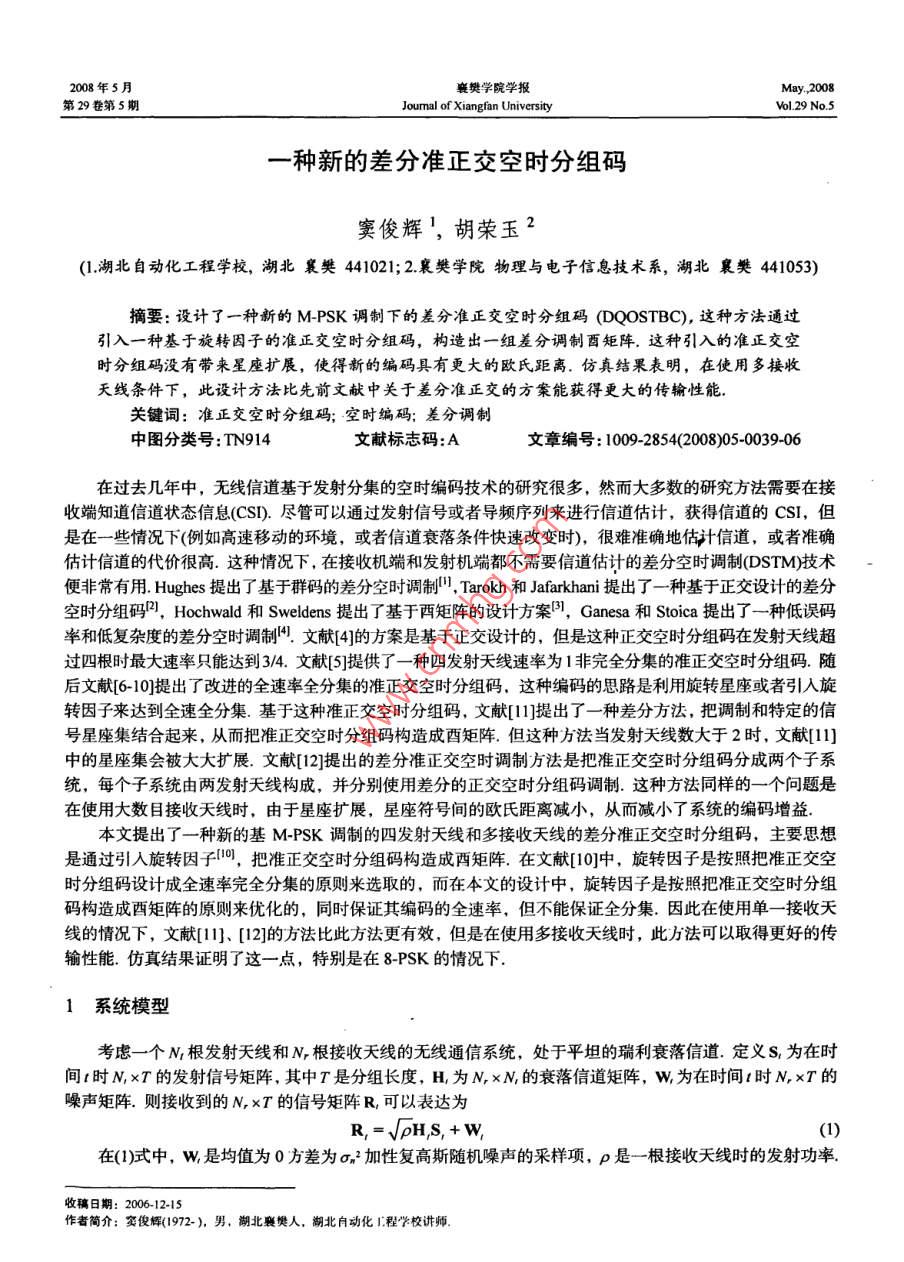 2008年5月襄樊學(xué)院學(xué)報May. 2008第29卷第5期Vol29 No 5一種新的差分準(zhǔn)正交空時分組碼竇俊輝,胡榮玉2(1湖北自動化工程學(xué)校,湖北襄樊441021;2.襄樊學(xué)院物理與電子信息技術(shù)系,湖北襄樊44053)摘要:設(shè)計了一種新的MPSK調(diào)制下的差分準(zhǔn)正交空時分組碼( DQOSTBC),這種方法通過引入一種基于旋轉(zhuǎn)因子的準(zhǔn)正交空時分組碼,構(gòu)造出一組差分調(diào)制酉矩陣.這種引入的準(zhǔn)正交空時分組碼沒有帶來星座擴展,使得新的編碼具有更大的歐氏距離.仿真結(jié)果表明,在使用多接收天線條件下,此設(shè)計方法比先前文獻中關(guān)于差分準(zhǔn)正交的方案能獲得更大的傳輸性能關(guān)鍵詞:準(zhǔn)正交空時分組碼;空時編碼;差分調(diào)制中圖分類號:TN914文獻標(biāo)志碼:A文章編號:1009-2854(2008)05-003906在過去幾年中,無線信道基于發(fā)射分集的空時編碼技術(shù)的研究很多,然而大多數(shù)的研究方法需要在接收端知道信道狀態(tài)信息(CSD).盡管可以通過發(fā)射信號或者導(dǎo)頻序列來進行信道估計,獲得信道的CSI,但是在一些情況下(例如高速移動的環(huán)境,或者信道衰落條件快速改變時),很難準(zhǔn)確地估計信道,或者準(zhǔn)確估計信道的代價很高.這種情況下,在接收機端和發(fā)射機端都不需要信道估計的差分空時調(diào)制(DSTM技術(shù)便非常有用 Hughes提出了基于群碼的差分空時調(diào)制", Tarokh和 Jafarkhani提出了一種基于正交設(shè)計的差分空時分組碼, Hochwald和 Sweldens提出了基于兩矩陣的設(shè)計方案, Ganesa和Soia提出了一種低誤碼率和低復(fù)雜度的差分空時調(diào)制.文獻[4的方案是基于正交設(shè)計的,但是這種正交空時分組碼在發(fā)射天線超過四根時最大速率只能達到34.文獻巧提供了一種四發(fā)射天線速率為1非完全分集的準(zhǔn)正交空時分組碼隨后文獻[6-10提出了改進的全速率全分集的準(zhǔn)正交空時分組碼,這種編碼的思路是利用旋轉(zhuǎn)星座或者引入旋轉(zhuǎn)因子來達到全速全分集.基于這種準(zhǔn)正交空時分組碼,文獻[提是出了一種差分方法,把調(diào)制和特定的信號星座集結(jié)合起來,從而把準(zhǔn)正交空時分組碼構(gòu)遣成酉矩陣.但這種方法當(dāng)發(fā)射天線數(shù)大于2時,文獻[ll中的星座集會被大大擴展.文獻2]提出的差分準(zhǔn)正交空時調(diào)制方法是把準(zhǔn)正交空時分組碼分成兩個子系統(tǒng),每個子系統(tǒng)由兩發(fā)射天線構(gòu)成,并分別使用差分的正交空時分組碼調(diào)制.這種方法同樣的一個問題是在使用大數(shù)目接收天線時,由于星座擴展,星座符號間的歐氏距離減小,從而減小了系統(tǒng)的編碼增益.本文提出了一種新的基MPSK調(diào)制的四發(fā)射天線和多接收天線的差分準(zhǔn)正交空時分組碼,主要思想是通過引入旋轉(zhuǎn)因子,把準(zhǔn)正交空時分組碼構(gòu)造成酉矩陣.在文獻[10中,旋轉(zhuǎn)因子是按照把準(zhǔn)正交空時分組碼設(shè)計成全速率完全分集的原則來選取的,而在本文的設(shè)計中,旋轉(zhuǎn)因子是按照把準(zhǔn)正交空時分組碼構(gòu)造成酉矩陣的原則來優(yōu)化的,同時保證其編碼的全速率,但不能保證全分集.因此在使用單一接收天線的情況下,文獻[1012]的方法比此方法更有效,但是在使用多接收天線時,此方法可以取得更好的傳輸性能.仿真結(jié)果證明了這一點,特別是在8PSK的情況下1系統(tǒng)模型考慮一個M根發(fā)射天線和N根接收天線的無線通信系統(tǒng),處于平坦的瑞利衰落信道.定義S,為在時間t時MxT的發(fā)射信號矩陣,其中T是分組長度,H為MxM的衰落信道矩陣,w為在時間t時NxT的噪聲矩陣.則接收到的NxT的信號矩陣R,可以表達為R,=√HS,+w(1)在(1)式中,W是均值為0方差為an2加性復(fù)高斯隨機噪聲的采樣項,p是一根接收天線時的發(fā)射功率收稿日期:2006-12-15作者簡介;竇俊輝(1972-),男,湖北襄樊人,湖北閂動化程學(xué)校講師.竇俊輝,等:一種新的差分準(zhǔn)正交空時分組碼為了保證平均發(fā)射功率為常量,S,應(yīng)滿足能量約束公式:T為了滿足全速率傳輸準(zhǔn)則,發(fā)射信號矩陣S可寫成4×4的方陣,那么分組長度T=M=4.在發(fā)射信號每幀的開始端,把單位矩陣S。=I作為第一個傳輸信號矩陣,其后的傳輸矩陣可以表達為S,=S-U其中U為酉矩陣(例如UU=1).由于S和U都是酉矩陣,所以S在所有的時間t都是酉矩陣.假設(shè)信道在兩個傳輸分組期間保持恒定,即H=H,-1(4)從(1)、(3)、(4)式可以得到接收機的接收信號R,可以表示為R,=pH,S, +W,=(R_-)U, +wR,U+w在這里,W=-WU4+w.差分空時調(diào)制相應(yīng)的最大似然解調(diào)由下式?jīng)Q定U,=E出m(,一R,U)(R,-R,URetr(rR,u式(6)中,Q定義為所有可能編碼矩陣的子集新的差分準(zhǔn)正交空時碼調(diào)制2.1差分編碼如上所述,差分空時調(diào)制中的碼矩陣U是酉矩陣.將利用旋轉(zhuǎn)因子構(gòu)造一組酉矩陣用于差分調(diào)制.在文獻巧5]中,給出了原始的準(zhǔn)正交空時分組碼CI-CI -C4由此可得000 a -bb00a600 a式中C是文獻S]中的 QOSTBC編碼矩陣,其中的c,c2,,c是MPSK調(diào)制符號,a=|e,b=ad+ca-(a+c).由(8)式知,編碼矩陣C不能用作差分處理.文獻[5]設(shè)計的這種 QOSTBC的可以使四根發(fā)射天線系統(tǒng)達到全速率,但不能保證編碼矩陣C取得全分集,因此文獻[S]設(shè)計的 QOSTBC是全速但不是全分集的為了解