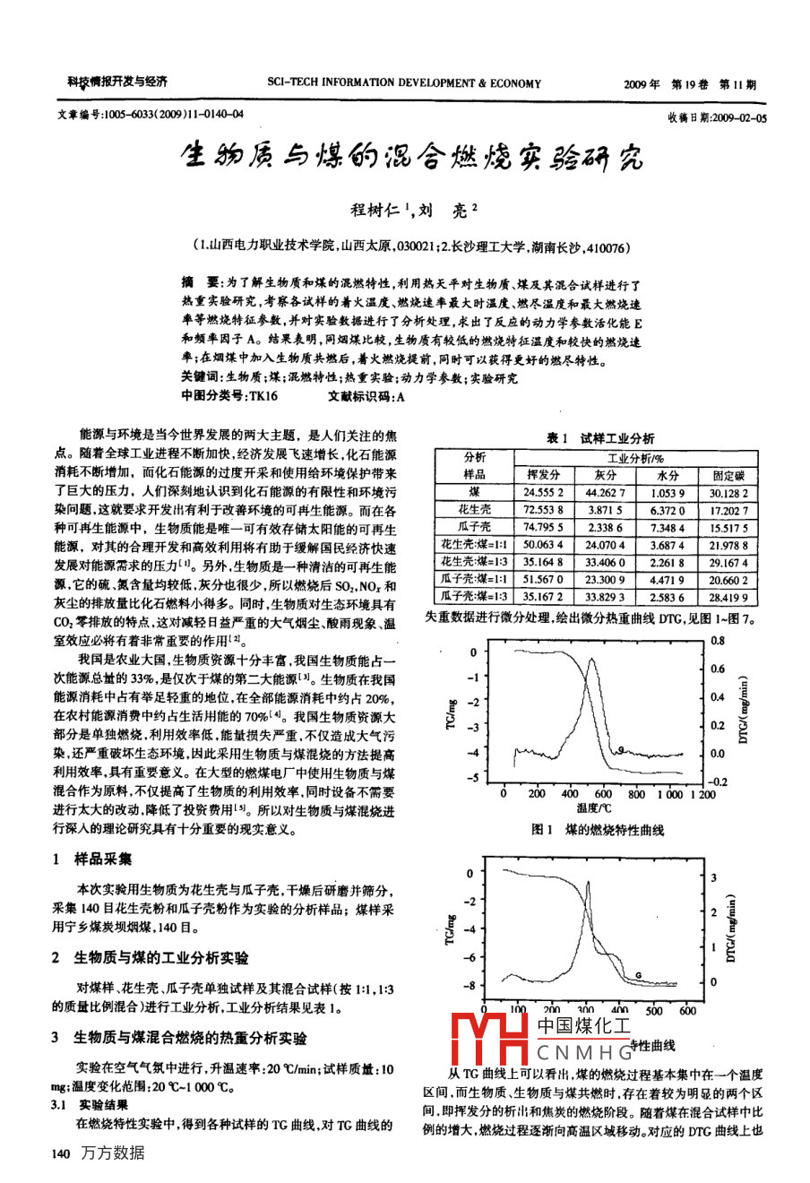 科蘋惘報開發(fā)與經(jīng)濟SCI-TECH INFORMATION DEVELOPMENT & ECONOMY2009年第19卷第1l期文章編號:1005-6033(2009)11-014004生物質(zhì)與煤的混合燃燒實硏究程樹仁!,劉亮2(1.山西電力職業(yè)技術(shù)學院山西太原,030021;2長沙理工大學湖南長沙,410076)摘要:為了解生物質(zhì)和煤的混燃特性,利用熱天平對生物質(zhì)、煤及其混合試樣進行了熱重實臉研究,考察各試樣的著火溫度、燃燒速率最大時溫度、燃盡溫度和最大燃燒速率等燃燒特征參數(shù),并對實驗數(shù)據(jù)進行了分析處理,求出了反應(yīng)的動力學參數(shù)活化能E和頻率因子A。結(jié)果表明同煙煤比較,生物質(zhì)有較低的燃燒特征溫度和較快的燃燒速率;在煙煤中加入生物質(zhì)共燃后,著火燃燒提前,同時可以獲得更好的燃盡特性。關(guān)鍵詞:生物質(zhì);煤;混燃特性;熱重實驗;動力學參數(shù);實驗研究中圖分類號:TK16文獻標識碼:A能源與環(huán)境是當今世界發(fā)展的兩大主題,是人們關(guān)注的焦衰1試樣工業(yè)分析點。隨著全球工業(yè)進程不斷加快經(jīng)濟發(fā)展飛速增長,化石能源分析工業(yè)分析%消耗不斷增加,而化石能源的過度開采和使用給環(huán)境保護帶來樣品揮發(fā)分灰分了巨大的壓力,人們深刻地認識到化石能源的有限性和環(huán)境污24554227[10539301282染問題這就要求開發(fā)出有利于改善環(huán)境的可冉生能源。而在各花生殼7255838715637017027種可冉生能源中,生物質(zhì)能是唯一可有效存儲太陽能的可再生955239673484155175能源、,對其的合理開發(fā)和高效利用將有助于緩解國民經(jīng)濟快速花生先煤=1500424043674219388發(fā)展對能源需求的壓力。另外,生物質(zhì)是一種清潔的可再生能花生殼煤=13351648334062261829.1674源它的硫氮含量均較低灰分也很少,所以燃燒后S02,NO2和瓜子殼煤=15567023009441920602灰塵的排放量比化石燃料小得多。同時生物質(zhì)對生態(tài)環(huán)境具有[子殼煤=1335172389325836284199CO2零排放的特點這對減輕日益嚴重的大氣煙塵酸雨現(xiàn)象、溫失重數(shù)據(jù)進行微分處理繪出微分熱重曲線DG,見圖1-圖7。室效應(yīng)必將有著非常重要的作用2我國是農(nóng)業(yè)大國,生物質(zhì)資源十分豐富我國生物質(zhì)能占0次能源總量的33%,是僅次于煤的第二大能源習。生物質(zhì)在我國能源消耗中占有舉足輕重的地位在全部能源消耗中約占20%,在農(nóng)村能源消費中約占生活用能的70%4。我國生物質(zhì)資源大部分是單獨燃燒,利用效率低能量損失嚴重不僅造成大氣污染還嚴重破壞生態(tài)環(huán)境因此采用生物質(zhì)與煤混燒的方法提高-2345利用效率具有重要意義。在大型的燃煤電廠中使用生物質(zhì)與煤混合作為原料不僅提高了生物質(zhì)的利用效率同時設(shè)備不需要020040060080010001200進行太大的改動降低了投資費用。所以對生物質(zhì)與煤混燒進溫度rC行深入的理論研究具有十分重要的現(xiàn)實意義圖1煤的燃燒特性曲線1樣品采集本次實驗用生物質(zhì)為花生殼與瓜子殼干燥后研磨并篩分采集140日花生殼粉和瓜子殼粉作為實驗的分析樣品;煤樣采用寧鄉(xiāng)煤炭壩煙煤,140目。2生物質(zhì)與煤的工業(yè)分析實驗對煤樣、花生殼、瓜子殼單獨試樣及其混合試樣(按1:1,13的質(zhì)量比例混合進行工業(yè)分析,工業(yè)分析結(jié)果見表1。5006003生物質(zhì)與煤混合燃燒的熱重分析實驗中國煤化工CNMHG性曲線實驗在空氣氣氛中進行,升溫速率:20℃min;試樣質(zhì)量:10從TG曲線上可以看出煤的燃燒過程基本集中在一個溫度mg;溫度變化范圍:20℃-1000℃。間,而生物質(zhì)、生物質(zhì)與煤共燃時存在著較為明顯的兩個區(qū)31實驗結(jié)果間即揮發(fā)分的析出和焦炭的燃燒階段。隨著煤在混合試樣中比在燃燒特性實驗中得到各種試樣的TG曲線對T曲線的例的增大,燃燒過程逐漸向高溫區(qū)域移動。對應(yīng)的DTG曲線上也140程樹仁劉亮生物質(zhì)與煤的混合燃燒實驗研究本刊E- mail:bjb@ bsxinfo nel科技論壇0100200300400500600溫度圖3瓜子殼的燃燒特性曲線圖7瓜子殼煤13的燃燒特性曲線初期揮發(fā)分的大量析出,從而導致了燃燒的第一階段形成。3.2燃料的燃燒特性和火特性分析在燃料燃燒的過程中,影響揮發(fā)分析出的因素也直接影響燃料的著火燃燒。影響揮發(fā)分析出的主要特性參數(shù)有6:揮發(fā)分初析溫度T;揮發(fā)分最大釋放速率即峰值(dGdn)-;對應(yīng)于(dC)的溫度T。等。其中;T越小,則表明燃料的著火性能越佳;(dG/d)越大,表明揮發(fā)分釋放程度劇烈;T越小,則表明揮發(fā)分釋放越快,此時燃燒就容易在較低的溫度下進行。010020030040050060070080同時,將DG曲線上燃燒后期的G點作為初始燃盡點,在G點以后,DTG曲線趨于平直曲線波動于零值附近;其所對應(yīng)圖4花生殼煤1:1的燃燒特性曲線的溫度用T來表示,T的大小反應(yīng)試樣的燃盡特性—7越小劂表明燃料試樣容易燃盡;其與揮發(fā)分初析溫度T的差值越小06反映該燃料燃燒過程時間越短燃料放熱反應(yīng)越集中。表2為燃料燃燒過程中主要燃燒特性參數(shù)值。表2燃料燃燒主要特性參數(shù)實驗數(shù)據(jù)試樣∧~【心 C/dt)/(mg/min)/花生殼2684730538283花生殼煤12676531489花生殼煤=13268473172523300.40665.56瓜子殼瓜子殼煤1[200209332圖5花生殼煤1:3的燃燒特性曲子殼煤:13261712546692042p32.1揮發(fā)分的析出特