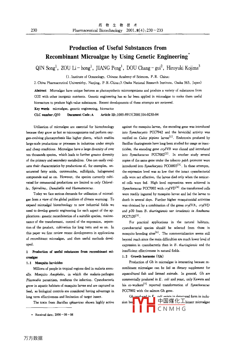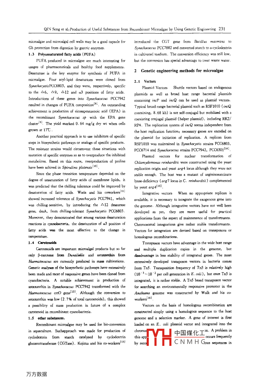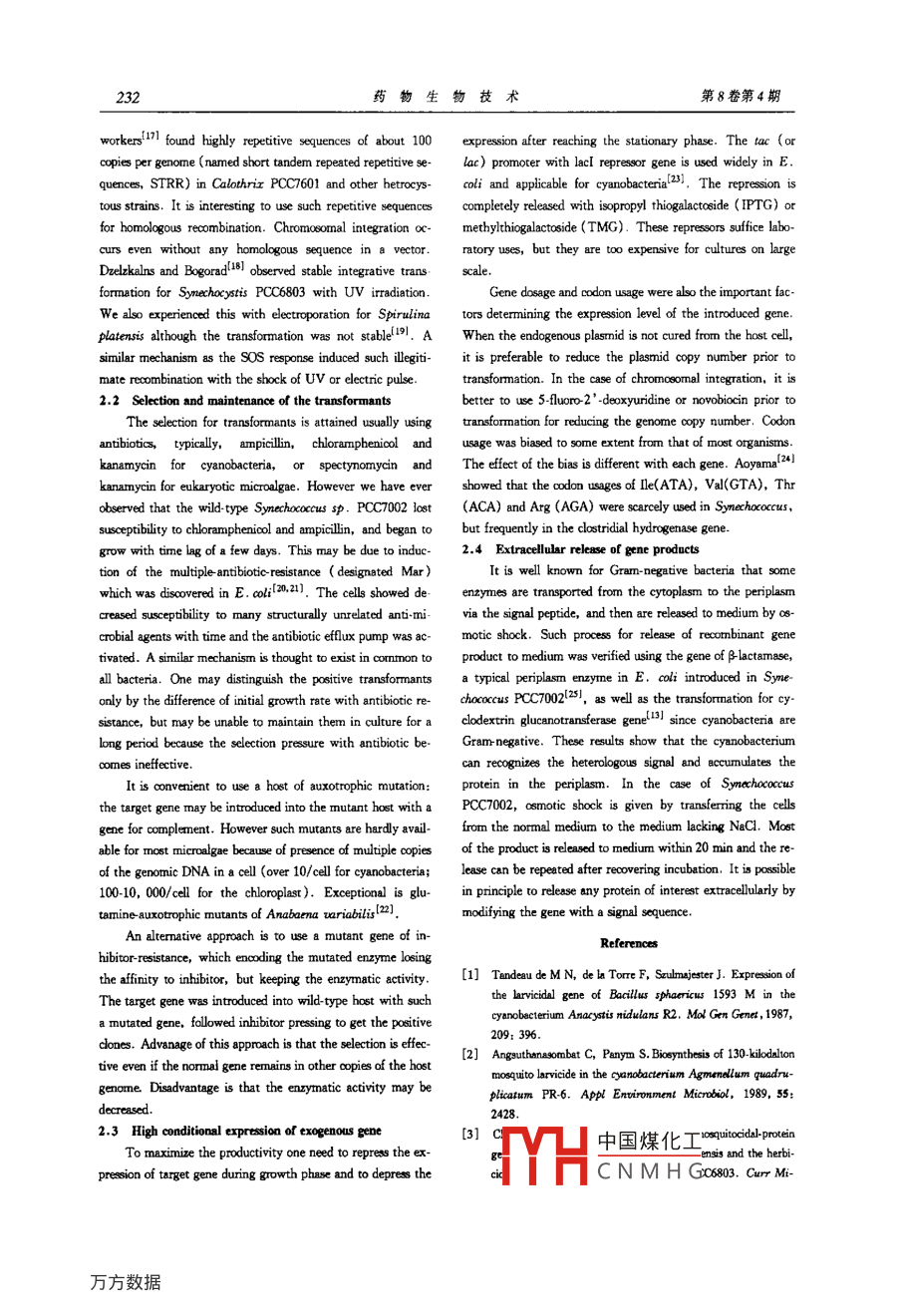 藥物生物技術(shù)30Pharmaceutical Biotechnology 2001, 8(4): 230-233Production of Useful Substances fromRecombinant Microalgae by Using Genetic EngineeringQIN Song, ZoU Li-hong, JIANG Peng, DOU Chang-gui, Hiroyuki Kojima2. China Pharmaceutical Universithy, Nanjing, P R China; 3. Osaka National Research Institute, Osaka 563, Japan)Abstract Microalgae have unique features as photosynthetic microorganisms and produce a variety of substances froma2 with other inorganic nutrients. Genetic engineering has so far been applied in microalgae to make them usefulbioreactors to produce high-value substances. Recent developments of these attempts are reviewedKey words microalgae, genetic engineering, bioreactorCLC number: Q50 Document Code: A Article ID: 1005-8915(2001)04-0230-04Utilization of microalgae are essential for biotechnology against the mosquito larvae, the encoding gene was introducedbecause they grow as fast as microorganisms and perform oxyinto Synechocystis PCC7942 and the larvicidal activitygen-evolving photosynthesis like higher plants, which enables verified on Culer pipiens larvae. Endotoxin produced byries under simple Bacillus thuringiensis have long been studied for usage as insecand cheap conditions. Microalgae have a large diversity of over ticides, the encoding gene cry/VB was cloned and introducedten thousands species, which leads to further greater diversity into Synechococcus PCC700212). In another study severalof the primary and secondary metabolites. One can easily eval. copies of the same gene under the tobacco psba promoter werecharacteristics by productions of, for examples, un- introduced into Synechocystis PCC6803 31. In these attempts,the expression level was so low that the intact cyanobacterialnds and so on. However, the species currently culti- cells were not effective, the larvae died only when the sonicatvated for commercial productions are limited to only Chlorel. ed cells were fed. High level expressions were achieved inSynechococcus PCC7002 with crylVD4the transformedcellsToday we face serious demands for utilization of microal- were readily ingested by mosquito larvae and led the larvae togae from a view of the global problem of climate warming. To death in several days. Further higher mosquitocidal activitiesexpand microalgal biotechnology to new industrial fields we was obtained by a combination of the genes crylvA, crylVDneed to develop genetic engineering for each aspect of the ap. and p20 from B. thuringiensis war israelensis in Anabaenaplications: genetic recombination of a suitable species, mainte- PCC7120 51nance of the transformant, control of the expression, separaFor practical applications intion of the product, cultivation for long term and so on. Inthis paper we first review recent developments in applications mosquito breeding sites[6l. The commercialization seems stillof recombinant microalgae, and then useful methods develbeyond reach since the main difficulties are much lower level ofexpression in cyanobacteria than in B. thuringiensis and the1 Production of usefal substances from recombinant mi. insufficient effectiveness in natural fields1.2 Growth hormone(Gh)1.1 Mosquito larvicidesProduction of Gh in microalgae is interesting because re-illions of people in tropical regions died in malaria annu. combinant microalgae can be fed as dietary supplement forly. Mosquito Anopheles, in which the malaria-pathogen aquacultured fish and farmed animals. In general, Gh arePlasmodia parasitizes, mediates the infection. Cyanobacteria commercially produced in E. coli and yeast, only Kawata andgrow in aquatic habitats of mosquito larvae and are captured as his co-workers reported transformation of Synechococcusological controls are considered having advantage in PCC7002 with the salmon Gh genelong term effectiveness and limitation of target insectmmii evicts in denatured formThe toxin from Bacillus sphaericus shown highly active sion b中國煤化工 bCNMHGReceived date: 2000-08-08QIN Song et al: Production of Useful Substances from Recombinant Microalgae by Using Genctic Engineering 231microalgae and microalgal cell walls may be a good capsule for introduced the CGit gene from Bacillus macerans toGh prorection from digestion by gastric enzymesSynechococcus PCC7002 and converted starch to a-cyclodextrit1.3 Polyunsaturated fatty acids( PUFA)in cultivated medium. The conversion efficiency was still low,PUFA produced in microalgae are much interesting for but the conversion has special advantage to treat waste waterusages of pharmaceuticals and healthy food supplementsDesaturase is the key enzyme for synthesPUFA in2 Genetic engineering methods formicroalgae. Four acyl-lipid desaturases were cloned from2.1 VectorsSymechoc ysis PCC6803, and they were, respectively, specifiPlasmid Vectors Shuttle vectors based on endogenousto the△6,△9,△12anda3 positions of fatty acidsIntroductions of these genes into Synechococcus PCC7942 plasmids as well as broad host range bacterial plasmidsg incP and incQ can be used as plasmid vectorsresulted in changes of PUFA composition. An outstanding Typical broad-range bacterial plasmid such as RSF1010(incQchievement is production of eicosapentaenoic acid(EPA)incontaining, 8.68 kb)is not self-conjugal but mobilized with athe recombinant Synechococcus sp with the EPA gene coexisting conjugal plasmid(helper plasmid), including Rk2,clusteri9i. The yield marked 0. 64 mg/g dry wt when cells RP4. The replication system of inc Q seems independent fromgrown at 17Cthe host replication function: necessary genes are encoded onAnother practical approach is to use inhibitors of specifthe plasmid for initiation of replication. A replicon fromsteps in biosynthetic pathways or analogs of specific products. RSF1010 was maintained in Synechocystis strains PCC6803he resistant strains wouldPCC6714 and Symechoroecus strains PCC7942, PCC6301 14)mutation of specific enzymes so as to overprePlasmid vectors for nuclear transformation ofave been 