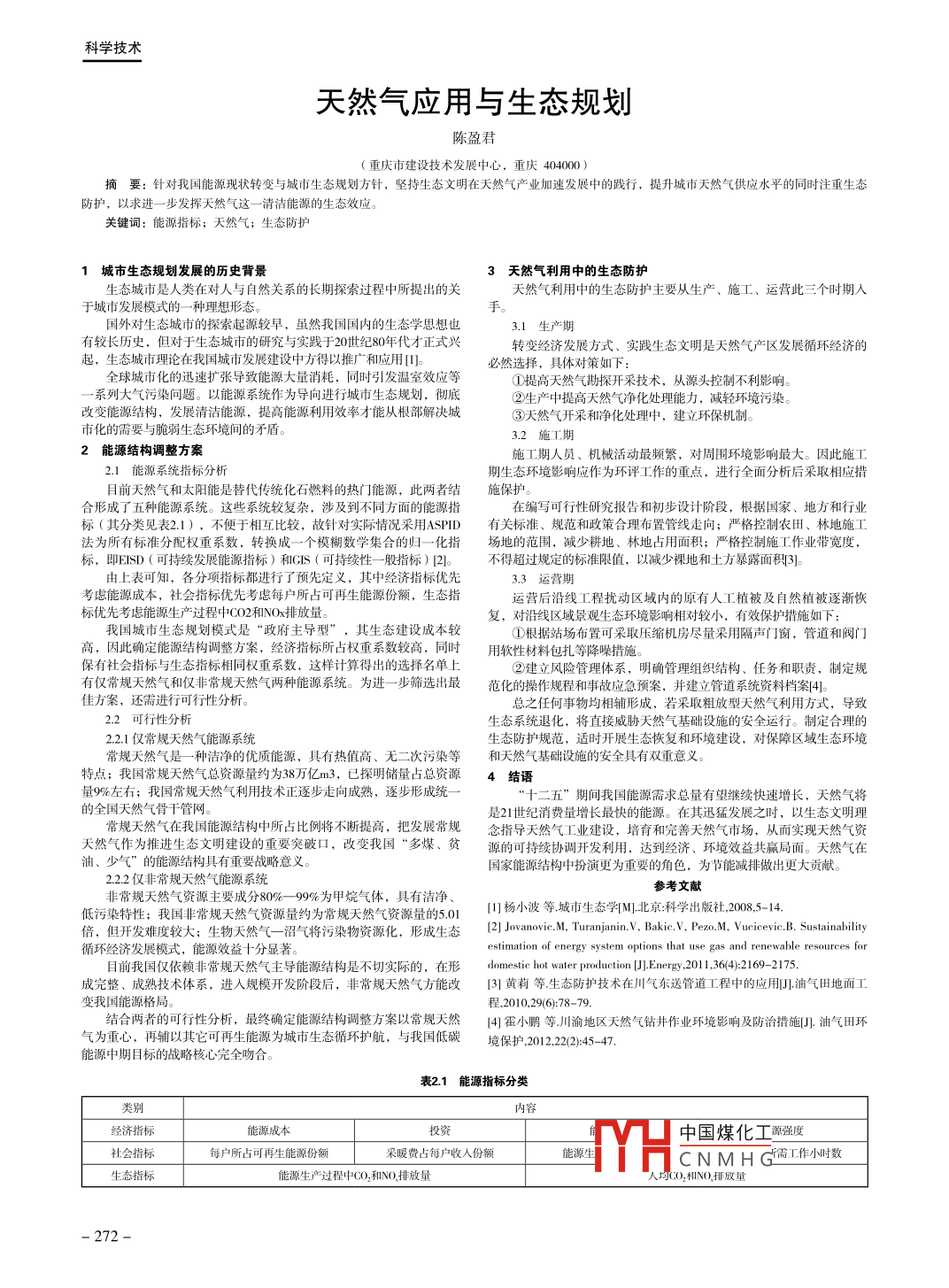 科學(xué)技術(shù)天然氣應(yīng)用與生態(tài)規(guī)劃陳盈君(重慶市建設(shè)技術(shù)發(fā)展中心,重慶404000)摘要:針對我國能源現(xiàn)狀轉(zhuǎn)變與城市生態(tài)規(guī)劃方針,堅持生態(tài)文明在天然氣產(chǎn)業(yè)加速發(fā)展中的踐行,提升城市天然氣供應(yīng)水平的同時注重生態(tài)防護,以求進一步發(fā)揮天然氣這一清潔能源的生態(tài)效應(yīng)關(guān)鍵詞:能源指標(biāo);天然氣;生態(tài)防護1城市生態(tài)規(guī)劃發(fā)展的歷史背景3天然氣利用中的生態(tài)防護生態(tài)城市是人類在對人與自然關(guān)系的長期探索過程中所提出的關(guān)天然氣利用中的生態(tài)防護主要從生產(chǎn)、施工、運營此三個時期入于城市發(fā)展模式的一種理想形態(tài)。手國外對生態(tài)城市的探索起源較早,雖然我國國內(nèi)的生態(tài)學(xué)思想也主產(chǎn)期有較長歷史,但對于生態(tài)城市的研究與實踐于20世紀80年代才正式興轉(zhuǎn)變經(jīng)濟發(fā)展方式、實踐生態(tài)文明是天然氣產(chǎn)區(qū)發(fā)展循環(huán)經(jīng)濟的起,生態(tài)城市理論在我國城市發(fā)展建設(shè)中方得以推廣和應(yīng)用[必然選擇,具體對策如全球城市化的迅速擴張導(dǎo)致能源大量消耗,同時引發(fā)溫室效應(yīng)等①提高天然氣勘探開采技術(shù),從源頭控制不利影響。系列大氣污染問題。以能源系統(tǒng)作為導(dǎo)向進行城市生態(tài)規(guī)劃,徹底②生產(chǎn)中提高天然氣凈化處理能力,減輕環(huán)境污染。改變能源結(jié)構(gòu),發(fā)展清潔能源,提高能源利用效率才能從根部解決城③天然氣開采和凈化處理中,建立環(huán)保機制。市化的需要與脆弱生態(tài)環(huán)境間的矛盾3.2施工期2能源結(jié)構(gòu)調(diào)整方案施工期人員、機械活動最頻繁,對周圍環(huán)境影響最大。因此施工2.能源系統(tǒng)指標(biāo)分析期生態(tài)環(huán)境影響應(yīng)作為環(huán)評工作的重點,進行全面分析后采取相應(yīng)措目前天然氣和太陽能是替代傳統(tǒng)化石燃料的熱門能源,此兩者結(jié)施保護合形成了五種能源系統(tǒng)。這些系統(tǒng)較復(fù)雜,涉及到不同方面的能源指在編寫可行性研究報告和初步設(shè)計階段,根據(jù)國家、地方和行業(yè)標(biāo)(其分類見表2.1),不便于相互比較,故針對實際情況采用 ASPID有關(guān)標(biāo)準(zhǔn)、規(guī)范和政策合理布置管線走向;嚴格控制農(nóng)田、林地施工法為所有標(biāo)準(zhǔn)分配權(quán)重系數(shù),轉(zhuǎn)換成一個模糊數(shù)學(xué)集合的歸一化指場地的范圍,減少耕地、林地占用面積;嚴格控制施工作業(yè)帶寬度,標(biāo),即SD(可持續(xù)發(fā)展能源指標(biāo))和GIS(可持續(xù)性一般指標(biāo))[2J。不得超過規(guī)定的標(biāo)準(zhǔn)限值,以減少裸地和土方暴露面積3由上表可知,各分項指標(biāo)都進行了預(yù)先定義,其中經(jīng)濟指標(biāo)優(yōu)先3.3運營期考慮能源成本,社會指標(biāo)優(yōu)先考慮每戶所占可再生能源份額,生態(tài)指運營后沿線工程擾動區(qū)域內(nèi)的原有人工植被及自然植被逐漸恢標(biāo)優(yōu)先考慮能源生產(chǎn)過程中CO2和NOx排放量復(fù),對沿線區(qū)域景觀生態(tài)環(huán)境影響相對較小,有效保護措施如下:我國城市生態(tài)規(guī)劃模式是“政府主導(dǎo)型”,其生態(tài)建設(shè)成本較①根據(jù)站場布置可采取壓縮機房盡量采用隔聲門窗,管道和閥門高,因此確定能源結(jié)構(gòu)調(diào)整方案,經(jīng)濟指標(biāo)所占權(quán)重系數(shù)較高,同時用軟性材料包扎等降噪措施。保有社會指標(biāo)與生態(tài)指標(biāo)相同權(quán)重系數(shù),這樣計算得出的選擇名單上②建立風(fēng)險管理體系,明確管理組織結(jié)構(gòu)、任務(wù)和職責(zé),制定規(guī)有僅常規(guī)天然氣和僅非常規(guī)天然氣兩種能源系統(tǒng)。為進一步篩選出最范化的操作規(guī)程和事故應(yīng)急預(yù)案,并建立管道系統(tǒng)資料檔案41佳方案,還需進行可行性分析總之任何事物均相輔形成,若采取粗放型天然氣利用方式,導(dǎo)致22可行性分析生態(tài)系統(tǒng)退化,將直接威脅天然氣基礎(chǔ)設(shè)施的安全運行。制定合理的22.僅常規(guī)天然氣能源系統(tǒng)生態(tài)防護規(guī)范,適時開展生態(tài)恢復(fù)和環(huán)境建設(shè),對保障區(qū)域生態(tài)環(huán)境常規(guī)天然氣是一種潔凈的優(yōu)質(zhì)能源,具有熱值高、無二次污染等和天然氣基礎(chǔ)設(shè)施的安全具有雙重意義特點;我國常規(guī)天然氣總資源量約為38萬億m3,已探明儲量占總資源4結(jié)語量9%左右;我國常規(guī)天然氣利用技術(shù)正逐步走向成熟,逐步形成統(tǒng)十二五”期間我國能源需求總量有望繼續(xù)快速增長,天然氣將的全國天然氣骨干管網(wǎng)是21世紀消費量增長最快的能源。在其迅猛發(fā)展之時,以生態(tài)文明理常規(guī)天然氣在我國能源結(jié)構(gòu)中所占比例將不斷提高,把發(fā)展常規(guī)念指導(dǎo)天然氣工業(yè)建設(shè),培育和完善天然氣市場,從而實現(xiàn)天然氣資天然氣作為推進生態(tài)文明建設(shè)的重要突破口,改變我國“多煤、貧源的可持續(xù)協(xié)調(diào)開發(fā)利用,達到經(jīng)濟、環(huán)境效益共贏局面。天然