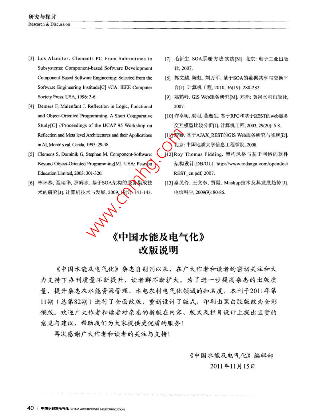 研究與探討Research & Discussion[3] Los Alamitos. Clements PC From Subroutines to[7]毛新生. SOA原理方法實(shí)踐[M].北京:電子工業(yè)出版Subsystems: Component-based Software Development社, 2007.Component-Based Software Engineering: Selected from the8] 郭文越,陳虹,劉萬(wàn)軍.基于SOA的數(shù)據(jù)共享與交換平Software Engineering Institude[C] //CA: IEEE Computer臺(tái)[J].計(jì)算機(jī)工程, 2010, 36(19): 280-282.Society Press. USA, 1996: 3-6.[9]姚鶴嶺. GIS Web服務(wù)研究[M].鄭州:黃河水利出版社,[4] Demers F, Malenfant J, Reflction in Logic, Functional2007.and Object-Oriented Programming, A Short Comparative[10]許卓明,栗明,董逸生.基于RPC和基于REST的web服務(wù)Study[C] /Proceedings of the IJCAI' 95 Workshop on交互模型比較分析[J].計(jì)算機(jī)工程, 2003, 29(20): 6-8.Reflection and Meta level Architectures and their Applications[11]管賽.基于AJAX REST的GIS Web服務(wù)研究與實(shí)現(xiàn)[D].inAI, Montr' s ceal, Canda, 1995: 29-38.北京:中國(guó)地質(zhì)大學(xué)信息工程學(xué)院,2008.[5] Clemens S, Dominik G, Stephan M. Component-Software:[12] Roy Thomas Fidding. 架構(gòu)風(fēng)格與基于網(wǎng)絡(luò)的軟件Beyond Object-Oriented Programming[M]. USA: Pearson架構(gòu)設(shè)計(jì)[DB/OL]. htp://ww.redsaga.com/opendoc/Education Limited, 2003: 301-320.REST_ cn.pdf, 2007.[6]林懷恭,聶瑞華,羅輝瓊.基于SOA架構(gòu)的服務(wù)集成技[13]秦靈伶,王文東,賈霞. Mashup技術(shù)及其發(fā)展趨勢(shì)[J].術(shù)的研究[D].計(jì)算機(jī)技術(shù)與發(fā)展, 2009, 19(7): 141-143.電信科學(xué), 2009(9): 80-86.《中國(guó)水能及電氣化》改版說(shuō)明《中國(guó)水能及電氣化》雜志自創(chuàng)刊以來(lái),在廣大作者和讀者的密切關(guān)注和大力支持下辦刊質(zhì)量不斷提升,讀者群不斷擴(kuò)大。為了進(jìn)一步提高雜志的出版質(zhì)量,提升雜志在水能資源管理、水電農(nóng)村電氣化領(lǐng)域的知名度,本刊于2011年第11期(總第82期)進(jìn)行了全面改版,重新設(shè)計(jì)了版式,印刷由黑白膠版改為全彩銅版。歡迎廣大作者和讀者對(duì)雜志的新版在內(nèi)容、版式及欄目設(shè)計(jì)上提出寶貴的意見(jiàn)與建議,幫助我們?yōu)榇蠹姨峁└鼉?yōu)質(zhì)的服務(wù)!再次感謝廣大作者和讀者的關(guān)注與支持!《中國(guó)水能及電氣化》編輯部.2011年11月15日401 中國(guó)水部及電化CHINAWATERPOWER& ELECTRIFICATION