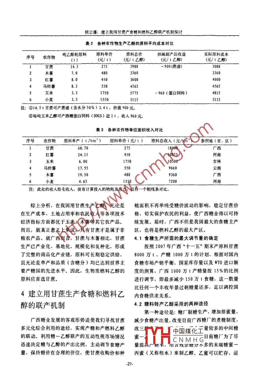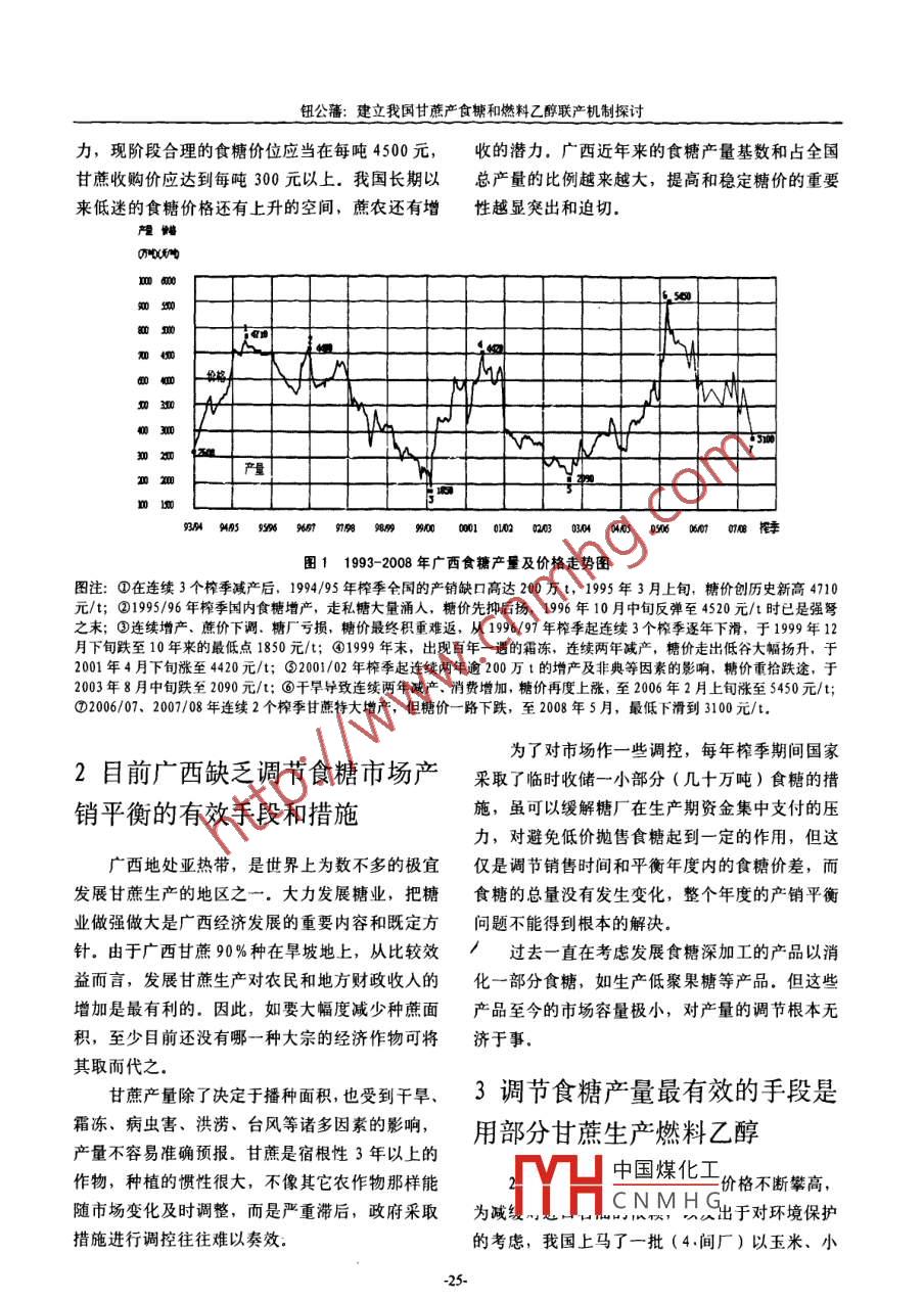 甘蔗糖業(yè)2008年第6期 Sugarcane and Canesugar2008年12建立我國甘蔗產(chǎn)食糖和燃料乙醇聯(lián)產(chǎn)機(jī)制探討鈕公藩(廣西糖業(yè)研究發(fā)展中心,南寧530001)摘要針對我國糖業(yè)長期存在糖價劇烈波動嚴(yán)重影響整個糖業(yè)健康有序發(fā)展這一重大的問題,提出廣西應(yīng)建立甘蔗產(chǎn)食糖和燃料乙醇聯(lián)產(chǎn)機(jī)制,自主調(diào)節(jié)食糖產(chǎn)量,控制糖價在一個合理的區(qū)間,使我國糖業(yè)發(fā)展實(shí)現(xiàn)長治久安。并提出了聯(lián)產(chǎn)方案、經(jīng)濟(jì)效益分析、相應(yīng)的政策措施和建議關(guān)鍵詞糖價;調(diào)控;甘蔗;多元化利用;燃料乙醇經(jīng)常出現(xiàn)這樣的情況,廣西甘蔗豐產(chǎn),全國0前食糖增產(chǎn),糖價應(yīng)聲下跌。甘蔗稍一減產(chǎn),食糖供應(yīng)偏緊,糖價立即恢復(fù)至合理價位。如1999年近幾年來,廣西糖業(yè)的發(fā)展尤為迅猛,食糖12月22日-26日,我國南方甘蔗產(chǎn)區(qū)突遭大面產(chǎn)量已近全國總產(chǎn)量的三分之二,廣西的食糖產(chǎn)積霜凍災(zāi)害,帶來可預(yù)見的食糖減產(chǎn)達(dá)150萬t量不但左右廣西的糖價,也極大地影響全國食糖糖價(每噸,下同)立即從一直低迷的1860元反市場。為了促使廣西蔗糖業(yè)的進(jìn)一步健康發(fā)展,彈至2500元,2個月后上升至3000元,到2000應(yīng)立即推進(jìn)甘蔗多元化利用,實(shí)施產(chǎn)糖和產(chǎn)燃料年8月底升至4100元,隨后,從2001/02年榨季乙醇的聯(lián)動機(jī)制,靈活、快速、自主調(diào)節(jié)食糖產(chǎn)起兩年增產(chǎn),糖價又重歸趺途,2003年8月中旬量,維護(hù)食糖市場的產(chǎn)銷平衡,恢復(fù)和穩(wěn)定合理跌至2000多元.到了2005/06年榨季,由于過去的糖價,切實(shí)保護(hù)廣大農(nóng)民和制糖企業(yè)的利益,連續(xù)兩年干旱,以及消費(fèi)量的增加,在國際糖價使廣西糖業(yè)得以健康、協(xié)調(diào)、可持續(xù)發(fā)展的帶動下,糖價再度飚升,到2006年2月漲至5450元,隨后連續(xù)兩年甘蔗大增產(chǎn),廣西產(chǎn)糖從1調(diào)節(jié)食糖產(chǎn)量的重要性和緊迫年產(chǎn)50多萬噸躍至206107年榨季的100萬t,性糖價又跌至3785元,2007/08年榨季又劇增至900多萬噸,糖價最低跌到3100元(見圖1)自1991年我國食糖市場價格放開后,糖業(yè)存以2005/06年榨季為例,廣西產(chǎn)糖539萬t在的最大問題就是食糖產(chǎn)量無法調(diào)節(jié),產(chǎn)銷稍不這是糖價最高的一年,糖業(yè)的稅收為20億元,利平衡便使糖價波動很大。17年來,糖業(yè)發(fā)展幾經(jīng)潤為43億元,每噸糖的年均銷售價為4314元大起大落,糖價急劇波動。其間,白砂糖的年均而2006/207年榨季產(chǎn)糖708萬t,較之上一榨價格最低為毎噸1652元,最高為4814元,相差季增產(chǎn)近200萬t,稅利不增反降(稅為19.94竟達(dá)3倍。其中2000元以下有一年,2000-3000億元,利潤為42億元),每噸糖的銷售價為3785元有8年,300~400元有6年,4000元以上僅元,降低了530元。按708萬t糖量計,銷售收有2年。糖價長期在低價位運(yùn)行,有5個榨季發(fā)人減少38億元如按2007/08年榨季的食糖產(chǎn)量生全行業(yè)虧損,出現(xiàn)大量蔗款白條,陷入了“糖及糖中國煤化工糖價的水平相比豐傷農(nóng)”的困境,極大地?fù)p害了蔗農(nóng),糖廠和地銷個CNMHG差額巨大方財政的利益。按照我國的物價總體水平和消費(fèi)者的承受能鈕公藩建立我國甘蔗產(chǎn)食糖和燃料乙醇聯(lián)產(chǎn)機(jī)制探討力,現(xiàn)階段合理的食糖價位應(yīng)當(dāng)在每噸4500元,收的潛力.廣西近年來的食糖產(chǎn)量基數(shù)和占全國甘蔗收購價應(yīng)達(dá)到每噸300元以上我國長期以總產(chǎn)量的比例越來越大,提高和穩(wěn)定糖價的重要來低迷的食糖價格還有上升的空間,蔗農(nóng)還有增性越顯突出和迫切09453996%胸9990001010000460500606m榨圖11993-2008年廣西食糖產(chǎn)量及價格走勢圖圖注:①在連續(xù)3個榨季減產(chǎn)后,1994/95年榨季全國的產(chǎn)銷缺口高達(dá)200萬t,1995年3月上旬,糖價創(chuàng)歷史新高470元/t;②1995/96年榨季國內(nèi)食糖增產(chǎn),走私糖大量涌人,糖價先抑后揚(yáng),1996年10月中旬反彈至4520元/t時已是強(qiáng)弩之末;③連續(xù)增產(chǎn)、蔗價下調(diào)、糖廠虧損,糖價最終積重難返,從1996/97年榨季起連續(xù)3個榨季逐年下滑,于1999年12月下旬跌至10年來的最低點(diǎn)1850元/t;④199年末,出現(xiàn)百年一遇的霜凍,連續(xù)兩年減產(chǎn),糖價走出低谷大幅揚(yáng)升,于2001年4月下旬漲至4420元/t;③2001/02年榨季起連續(xù)兩年逾200萬1的增產(chǎn)及非典等因素的影響,糖價重拾跌途,于2003年8月中旬跌至2090元/t;⑥干旱導(dǎo)致連續(xù)兩年減產(chǎn)、消費(fèi)增加,糖價再度上漲,至206年2月上旬漲至5450元/t;⑦2006/07、2007/08年連續(xù)2個榨季甘蔗特大增產(chǎn),但糖價一路下跌,至2008年5月,最低下滑到3100元/t為了對市場作一些調(diào)控,每年榨季期間國家2目前廣西缺乏調(diào)節(jié)食糖市場產(chǎn)采取了臨時收儲一小部分(幾十萬噸)食糖的措銷平衡的有效手段和措施施,雖可以緩解糖廠在生產(chǎn)期資金集中支付的壓力,對避免低價拋售食糖起到一定的作用,但這廣西地處亞熱帶,是世界上為數(shù)不多的極宜僅是調(diào)節(jié)銷售時間和平衡年度內(nèi)的食糖價差,而發(fā)展甘蔗生產(chǎn)的