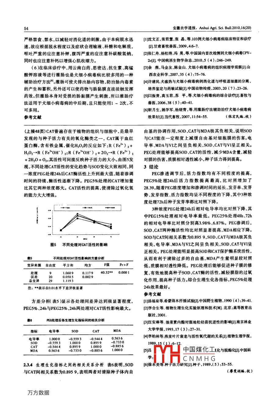 安徽農(nóng)學(xué)通報, Anhui Agri.Sd.Bul2010,l6(20)聚乙二醇(PEG)處理對希蒙德木種子活力的影響周建勇高捍東2(1滁州市林業(yè)局安徽滁州2390002南京林業(yè)大學(xué))摘要:希蒙德木種子經(jīng)過PEG處理后內(nèi)部酶的活性發(fā)生變化,不同濃度的PEG處理24h后,可以降低種子的膜透性和兩二醛的含量,提高超氧化物歧化酶和過氧化氫酶的活性;但隨著處理時間的延長,膜的透性增加,丙二醛含量上升,超氧化物歧化酶和過氧化氬酶的活性降低。PEG5%處理24h效果最好關(guān)鍵詞:聚乙二醇;希蒙德木種子;相對電導(dǎo)率;丙二醛;超氧化物岐酶;過氧化氬酶中圖分類號S793文獻(xiàn)標(biāo)識碼B文章編號1007-7731(2010)20-047-003Effect of PEG Pretreatment on Vigor of Simmondsia SeedZhou Jianyong Gao Handong1Chuzhou Forestry Bureau, Chuzhou339000, China: 2 Nanjing Forestry UniversityAbstrac: Simmondsia seeds were treated with PEG. The results showed that pretreatments of PEG with differentlevels after 24h can decrease relative electrical conductivity and MDA content, and increase SOD activity and CATactivity. But with the time longened, relative electrical conductivity and MDA content increase while SOD and CATactivity decrease. The treatment of PEG5% with 24h has the greatest effect.Key words: PEG; Simmondsis seed; Relative electrical conductivity; Malonaldehyde; Catalase; Superoxide dismutase希蒙德木 Simmondsia Chinensis(Link) Schneider)系 DUNCAN多重比較。希蒙德木科僅1屬1種,為多年生常綠灌木是一種耐干早2結(jié)果與分析的重要油料植物,原產(chǎn)地在美國西南部與墨西哥西北部接21PEG處理對種子活力的影響壤的索諾拉沙漠地區(qū)。PEG是一種優(yōu)良的高分子滲透劑種子發(fā)芽率是衡量種子生活力的重要指標(biāo),而種子發(fā)1973年 Heydecker首次利用PEG處理種子獲得了整齊的出芽指數(shù)和活力指數(shù)反映出該批種子萌發(fā)速率和活力狀況。苗效果。我們用PEG-6000處理希蒙德木種子,研究其對種PEG處理對種子的發(fā)芽勢、發(fā)芽率發(fā)芽指數(shù)、活力指數(shù)影響子生化指標(biāo)的影響,以期提高種子活力。如圖1。從圖中可以發(fā)現(xiàn),不同濃度、不同滲調(diào)時間處理對1試驗(yàn)材料與方法種子的發(fā)芽率有明顯的差異,B2處理比對照提高了1734%1.1試驗(yàn)材料其次是Cl、A1比對照相應(yīng)地增加了1667%、12%,而B3和C3試驗(yàn)用種子為以色列進(jìn)兩個處理反而比對照的發(fā)芽率低。在發(fā)芽勢發(fā)芽指數(shù)、活12試驗(yàn)方法力指數(shù)方面都比對照有明顯的提高。但隨著滲透調(diào)節(jié)時間121PEG滲透調(diào)節(jié)處理采用PEC-6000按下表處理,以清的延長,各項(xiàng)指標(biāo)都相應(yīng)地下降,這是因?yàn)镻EG溶液是粘稠水浸泡12h的種子為對照(5%、15%、25%的PEC-6000的的液體隨著濃度、時間的增加溶液中氧氣的含量下降,抑滲透勢分別相當(dāng)于025Mp、-0.75Mpa、-125Mpa,每處制了種子的有氧呼吸在某種程度上抑制了種子代謝理重復(fù)3次,每次隨機(jī)取100粒種子。122生化指標(biāo)的測定發(fā)芽測定:將各處理種子洗凈后放置在鋪有濕潤脫脂棉的發(fā)芽盒內(nèi),置于25℃恒溫發(fā)芽箱中發(fā)芽,定期統(tǒng)計(jì)發(fā)芽數(shù),并對發(fā)芽率發(fā)芽勢、發(fā)芽指數(shù)活力指數(shù)進(jìn)行計(jì)算。質(zhì)膜透性的測定采用相對電導(dǎo)率法;過氧化氫酶(CAT活性的測定采用高錳酸鉀滴定法;丙二醛MDA含量的測定方法參照汪安琳的硫代巴比妥酸圖1不同PEG處理對種子發(fā)芽的影響(TBA琺;超氧化物歧化酶SOD性的測定方法參照汪種子活力是指在適宜和不適宜的環(huán)境條件下種子的發(fā)安琳、李柏林,采用NBT光照化學(xué)還原法。芽和出苗能力包括幼苗生長勢和整齊度。因此在衡量種子3數(shù)據(jù)分析與處理活力中國煤化工合起來用活力指數(shù)采用 Microsoft Excel、SAS統(tǒng)計(jì)軟件進(jìn)行方差分析和反映CNMHG價時活力指數(shù)是作者簡介:周建勇1973-),男,工程師從事林學(xué)管理林木種苗研究收稿日期:2010-09-21安徽農(nóng)學(xué)通報, Anhui Agri.si.Bull200,16(20)一個比較靈敏的指標(biāo)。它綜合了種子發(fā)芽率發(fā)芽速度和膜脂過氧化指標(biāo),表示細(xì)胞膜過氧化程度和對逆境條件反幼苗生長勢等因素。方差分析表明表1)不同處理對活力應(yīng)的強(qiáng)弱。PEG處理對丙二醛含量的影響如圖3不同處理指數(shù)影響達(dá)到極顯著差異。多重比較表明表2),在005水的丙二醛的含量都比對照低。同一濃度,隨著滲透時間的平下,A1與B2、A2、C1、A3、C2、B3、C3、ck之間差異顯著、B1延長丙二醛的含量也逐步上升。PEG15%處理24h丙二醛與A3、C2、B3C3、ck之間差異顯著、B2與ck之間差異顯著,的含量最低,PEG25%處理72h丙二醛含量是PEG15%處理其它處理間不顯著;在001水平下,A1與A3C2、B3、C3、ck72h的1.99倍,是PEG5%處理72h的239倍。PEG處理的丙之間差異極顯著、B1與A3、C2、B3、C3、ck之間差異極顯著。二醛含量變化與電導(dǎo)率的變化是一致的。方差分析表3)綜合活力指數(shù)發(fā)芽指數(shù)發(fā)芽勢和發(fā)芽率,B1處理效果最表明各處理間差異極顯著好。其次是A1、C1,C3處理效果最差不同處理對種子活力指數(shù)影響的方差分析變異來源自由度平方和1444.1644160.4627507·00012632611331.63062076.7757注:··表示在001水平下差異極顯著圖3不同處理對MDA含量的影響表2不同處理對種子活力指數(sh