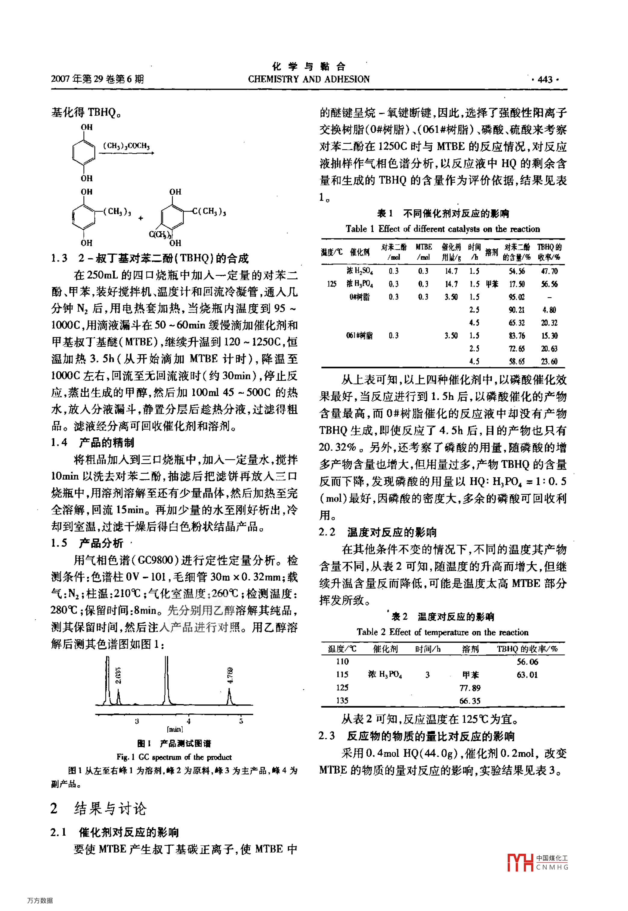 442·柴德季等合成TBHQ的工藝改進(jìn)vdL29.No,6,2007合成TBHQ的工藝改進(jìn)熊德琴,林培喜,胡相紅21.茂名學(xué)院化學(xué)與生命科學(xué)學(xué)院,廣東茂名525002北京武裝警察指揮學(xué)院數(shù)理教研室,北京10012)摘要研究了以工業(yè)品甲基叔丁基醚(MTBE)和對苯二酚(HQ)為原料,在磷酸催化下,合成TBHQ的工藝參數(shù)。對催化劑的活性原料的配比和反應(yīng)時(shí)間等進(jìn)行了優(yōu)化考察。當(dāng)對苯二酚:甲基叔丁基醚磷酸=1:1:0.5(ml),反應(yīng)溫度為125℃,反應(yīng)時(shí)間35h,TBHQ的收率達(dá)85.7%。與傳統(tǒng)方法相比該方法具有價(jià)廉操作簡單的特點(diǎn),具有較高的開發(fā)、應(yīng)用價(jià)值用MTBE作原料合成TBHQ未見有關(guān)文獻(xiàn)具體報(bào)道關(guān)鍵詞:對苯二酚;MTBE;TBHQ;抗氧劑;新工藝中圖分類號:TQ314.249文獻(xiàn)標(biāo)識碼:B文章編號:1001-0017(2007)06-0442-03Improvement of Synthesis Process of TBHQXIONG De-qin, LIN Pci-xin' and HU Xiang-hong2(l. College of Chemitry and Life Science, Maoming College, Maoming 525000, China;2. Bejing Command College f Armed Police Force, Beiing 100012, China)Abstract: With Hg, was used as catalyst, main technical parameters for synthesis of 2-tert-butylphenol(TBHQ)from industrial MTBE andHQ were studied. The factors such as activity of catalysts, molar ratio of materials and reaction Lime had been diacussed. When HQ: MTBE: H, PO, =1:1:0.5, the reaction temperature was 125C, the reaction time was 3. 5h, the yield of TBHQ could reach 85. 7%. Compared writh the tradition methodsthie method was cheap, simple operation and worthy to exploit and apply. Synthesis of TBHQ with MTBE had not been reported in the relafed literatureKey words: Hydroquinone MTBE; TBHQ; antioxidant; new craft前言成的影響,確定了較為理想的工藝過程和工藝參數(shù),該路線具有工藝簡單操作靈活成本低的特點(diǎn),為TBHQ(2-叔丁基對苯二酚)是一種低毒,高效TBHQ的工業(yè)生產(chǎn)提供了一定的理論依據(jù)。的新型食品抗氧劑,應(yīng)用范圍廣??捎糜谙鹉z、塑料也用于烯烴單體蒸餾阻聚劑聚酯原料嫉油熱1實(shí)驗(yàn)部分焦劑,感光劑及化妝品添加劑-。但其重要用途1.1儀器與試劑是作為食用油脂的抗氧劑,BHQ作為食用油脂的磁力電動攪拌機(jī)(JB50-D)型,KDM型調(diào)溫電抗氧劑具有高效低毒、熱穩(wěn)定好的優(yōu)點(diǎn)其安全性熱套,上皿電子天平,氣相色譜儀(CC9800),對苯二已有FAO/WHO評價(jià)屬A類,而且除了對植物性油酚,濃硫酸濃磷酸,甲苯均為分析純,甲基叔丁基醚脂有抗氧化性外,同時(shí)還能有效的抑制細(xì)菌霉菌的(MTBE)(工業(yè)級),0號強(qiáng)酸性陽離子交換樹脂(0#生長,對黃曲霉等危害人體健康的霉菌也有很好的樹脂),061號強(qiáng)酸性陽離子交換樹脂,(061#樹脂)。抑制作用。現(xiàn)階段TBHQ的生產(chǎn)還存在著產(chǎn)品收率1.2實(shí)驗(yàn)原理低質(zhì)量差,工藝復(fù)雜等問題,造成產(chǎn)品的成本高影由于HQ苯環(huán)上有羥基的存在,所以其苯環(huán)極響和限制了它的推廣應(yīng)用。合成TBHQ目前可行的易發(fā)生親電取代反應(yīng)。在TBHQ的合成中,其實(shí)質(zhì)有三類:(1)以叔丁醇與對苯二酚為原料;(2)異都是在苯環(huán)上引人叔丁基的反應(yīng),屬于 Friedel丁烯與對苯二酚:(3)甲基叔丁基醚(MTBE)與對苯Crs烴化反應(yīng),這過程的關(guān)鍵是碳正離子的生成,二酚為原料。其前兩類的報(bào)道較多,第三類的合成叔丁醇和異丁烯在催化劑作用下能生成叔丁基碳正國內(nèi)未見有具體報(bào)道。離子然后向芳環(huán)的大鍵發(fā)動親電進(jìn)攻生成T本文用甲基叔丁基醚(MTBE)與對苯二酚為原絡(luò)合物進(jìn)而得α-絡(luò)合物,a-絡(luò)合物消除一個(gè)質(zhì)料,以磷酸為催化劑合成TBHQ,重點(diǎn)考察了硫酸、子使芳環(huán)叔丁基化。而甲基叔丁基醚在酸催化下同磷酸為催化劑原料的配比和反應(yīng)時(shí)間對TBHQ合樣能產(chǎn)生叔丁基碳正離子,因而同樣能使芳環(huán)叔丁收稿日期:2007-05-09中國煤化工作者簡介:熊德季(194-),女重慶人講師在讀硬士,從事化學(xué)實(shí)驗(yàn)教學(xué)和應(yīng)用化學(xué)方面的研究工作。CNMHG化學(xué)與黏合2007年第29卷第6期CHEMISTRY AND ADHESION443基化得TBHQ。的醚鍵呈烷-氧鍵斷鍵,因此,選擇了強(qiáng)酸性陽離子OH交換樹脂(0樹脂)、(061#樹脂)、磷酸、硫酸來考察CH3)3COCH3對苯二酚在1250C時(shí)與MTBE的反應(yīng)情況,對反應(yīng)液抽樣作氣相色譜分析,以反應(yīng)液中HQ的剩余含OH量和生成的THQ的含量作為評價(jià)依據(jù),結(jié)果見表OHOH(cH3)3-C( CH3)表1不同催化劑對反應(yīng)的影響Table 1 effect of different catalvsts on the reactionCoHAOH132-叔丁基對苯二酚(TBHQ)的合成/ml/m用址h劑尉苯二酚TEH的溫度八催化對苯二酚MTBE催化荊時(shí)間的含量/%收率/在250mL的四口燒瓶中加入一定量的對苯二濃HO4030314715554.7125滋H2PO4030314715甲苯1.5055酚、甲苯,裝好攪拌機(jī)溫度計(jì)和回流冷凝管,通入幾味樹脂030335015分鐘N2后,用電熱套加熱,當(dāng)燒瓶內(nèi)溫度到952590.214.801000,用滴液漏斗在50~60min緩慢滴加催化劑和4.5653220.32甲基叔丁基醚( MTBE),繼續(xù)升溫到120~1250C,恒3501.52.572.652.6溫加熱3.5h(從開始滴加MTBE計(jì)時(shí)),降溫至4.548.652.61000左右,回流至無回流液時(shí)(約30min),停止反從上表可知,以上四種催化劑中,以磷酸催化效應(yīng)蒸出生成的甲醇然后加00m145-500C的熱果最好,當