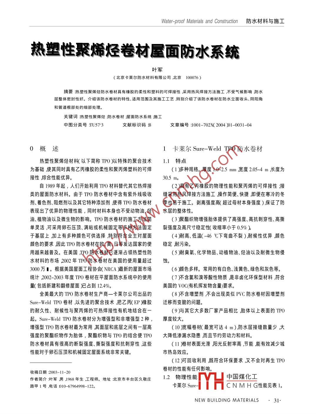 Water- proof Materials and Construction防水材料與施工熱塑性聚烯烴卷材屋面防水系統(tǒng)葉軍北京卡萊爾防水材料有限公司北京100076)摘要熱塱性聚烯烴防水卷材具有橡膠的柔性和塑料的可焊接性采用熱風(fēng)焊接方法施工不受氣候影響防水層整體密封性好。介紹該防水卷材的特性、適用范圍及其施工工藝特別介紹了該防水卷材在防水立面收頭、陰陽角和管道根部處的細(xì)部處理關(guān)鍵詞熱塑性聚烯烴防水卷材渥面防水系統(tǒng)施工中圖分類號(hào)TU573文獻(xiàn)標(biāo)識(shí)碼文章編號(hào):1001-702X(20041-0031-040概述1卡萊爾Sure- Weld tpo防水卷材熱塑性聚烯烴材料(以下簡(jiǎn)稱TPO)以特殊的聚合技術(shù)1.1特點(diǎn)為基礎(chǔ)使其同時(shí)具有乙丙橡膠的柔性和聚丙烯塑料的可焊(1≥多種規(guī)格。厚度10-2.5mm寬度205-4m長(zhǎng)度為接性綜合性能優(yōu)異。30.5自1989年起,人們開始利用TPO材料替代其它熱焊接2)有乙丙橡膠的物理性能和聚丙烯的可焊接性接類的屋面防水材料。由于TPO防水卷材中含有紫外線吸收縫采用熱風(fēng)焊接方法施工操作簡(jiǎn)便、快捷即便在寒冷的冬劑、著色劑、阻燃劑以及其它特種添加劑使得TPO防水卷材季也易于施工。剝離強(qiáng)度高(超過母材本身強(qiáng)度),保證了防表現(xiàn)出了優(yōu)異的物理性能,同時(shí)材料本身也不受動(dòng)物油、烴水層的整體性。油、植物油以及微生物的影響。TPO防水卷材的施工方法簡(jiǎn)(3饜酯織物增強(qiáng)胎體提供了高強(qiáng)度、高抗刺穿性、高撕?jiǎn)戊`活可采用卵石壓頂、滿粘或機(jī)械固定等多種方法固定裂強(qiáng)度及高尺寸穩(wěn)定性(收縮率小于05%于基層上加上有多種顏色可供選擇特別符合業(yè)主對(duì)屋面(4)高、低溫(-46℃下彎曲不裂)耐候性優(yōu)異顏色顏色的要求因此TPO防水卷材在歐、美、日等發(fā)達(dá)國家的使穩(wěn)定耐污染。用越來越普及。在美國TPO防水卷材已逐漸占領(lǐng)熱塑性防(5〕耐臭氧、化學(xué)物品、動(dòng)植物油、烴油以及耐微生物侵水材料的市場(chǎng)2002年TPO防水卷材在美國的使用量超過蝕3000萬■。根據(jù)美國屋面工程協(xié)會(huì)NRCA)新的屋面市場(chǎng)(6顏色多樣。常用的有白色、淺黃色、綠色和灰色等。統(tǒng)計(jì)2002~2003年度TPO卷材在平屋面防水系統(tǒng)中的使用(7不含氯和溴等酸性物質(zhì)是非鹵化環(huán)保型材料符合量(包括新建和翻修屋面尼占到12.4%。美國的vOC(有機(jī)揮發(fā)物含量)要求。全美最大的TPO防水卷材生產(chǎn)商一卡萊爾公司出品的(8)不含增塑劑不會(huì)出現(xiàn)類似PVC防水卷材因增塑劑Sure- Weld tpo卷材以先進(jìn)的聚合技術(shù)把乙丙(EP橡膠遷移而變脆的問題。的耐久性、耐候性與聚丙烯的可熱焊接性有機(jī)地結(jié)合在(9)與其它大多數(shù)廠家產(chǎn)品相比胎體以上表面的TPO起。Sure- Weld tpo防水卷材分為增強(qiáng)型和非增強(qiáng)型2種,厚度較大。增強(qiáng)型TPO防水卷材最為常用其面層和底層之間有一層高10)幅卷材(最寬可達(dá)4m)防水層接縫數(shù)量少大強(qiáng)度的聚酯織物作為胎體,聚酯織物與TPO的結(jié)合使TPO大降低滲漏水隱患而且節(jié)約勞動(dòng)力和材料防水卷材具有很高的斷裂強(qiáng)度、撕裂強(qiáng)度和抗刺穿性這些(11)卷材表面光滑陽光反射率高節(jié)能能有效減少城性能對(duì)于卵石壓頂和機(jī)楲固定屋面系統(tǒng)非常關(guān)鍵。市熱島效應(yīng)。(12)可回收利用既符合環(huán)保要求又不會(huì)對(duì)再生TPO收稿日期2003-11-20卷材的性能有任何影響作者簡(jiǎn)介葉軍男1968年生工程師。地址北京市豐臺(tái)區(qū)久敬莊1.2物理性能中國煤化工路甲1號(hào)電話⑩10-67964998-122卡萊爾SuHCNMHG性能見表1。NEW BUILDING MATERIALS31防水材料與施工Waer- proof Materials and Construction表1卡萊爾Sure- Weld TPo增強(qiáng)型防水卷材的物理性能老化前性能老化后性能斷裂強(qiáng)度/kNASTM D 751聚酯增強(qiáng)胎體的斷裂延伸率/%ASTM D 751撕裂強(qiáng)度①/N≥245≥24578ASTM D 751冷脆點(diǎn)/℃STM D 2137收縮率/%抗臭氧性能2無裂紋無裂紋無裂紋無裂紋ASTM D 114970℃7d水浸后質(zhì)量變化/%≤4.0陽光反射率/%87(白)70淺黃)ASTM E 903抗霉菌生長(zhǎng)性9-10ASTM D 3274接縫密封強(qiáng)度/kN/m)ASTM D 1876抗刺穿性/N≥l110≥II101330FTM101C方法2031抗紫外線性能無裂紋斷裂強(qiáng)度和撕裂強(qiáng)度不降低) ASTM G26①20.3cmx20.3cm樣片②2臭氧體積分?jǐn)?shù)為10(100pphm),168hA0℃繞76cm圓棒;③1表示抗霉菌性很差,10表示霉菌不能生長(zhǎng)④氙弧燈總輻射量5040kJ/m2相當(dāng)于70℃環(huán)境下在黑色表面照射8000h1.3配套材料(1)設(shè)卷材的基層必須平整、干凈不得有任何尖銳突Sure- Weld tpo卷材防水系統(tǒng)的主要配套材料包括:配出物,以免破壞卷材套基層膠粘劑,卷材清潔劑切邊密封膏CCW-102收頭密(2滿粘系統(tǒng)對(duì)基層的要求湛層上的塵士必須清掃干封膏30-60cm寬、1.5mm厚的非增強(qiáng)TPO泛水材料成型凈以保證卷材與基層粘結(jié)牢固。基層可用掃帚清掃必要時(shí)陰、陽角預(yù)制件成型管道泛水預(yù)制件澆注密封膏及配套箍應(yīng)采用吹風(fēng)機(jī)吹凈。槽HP-X固定墊片和螺釘保溫板以及可焊接的人行走道保(3械固定系統(tǒng)對(duì)基層的要求壓型鋼板的厚度應(yīng)大護(hù)板等。于0