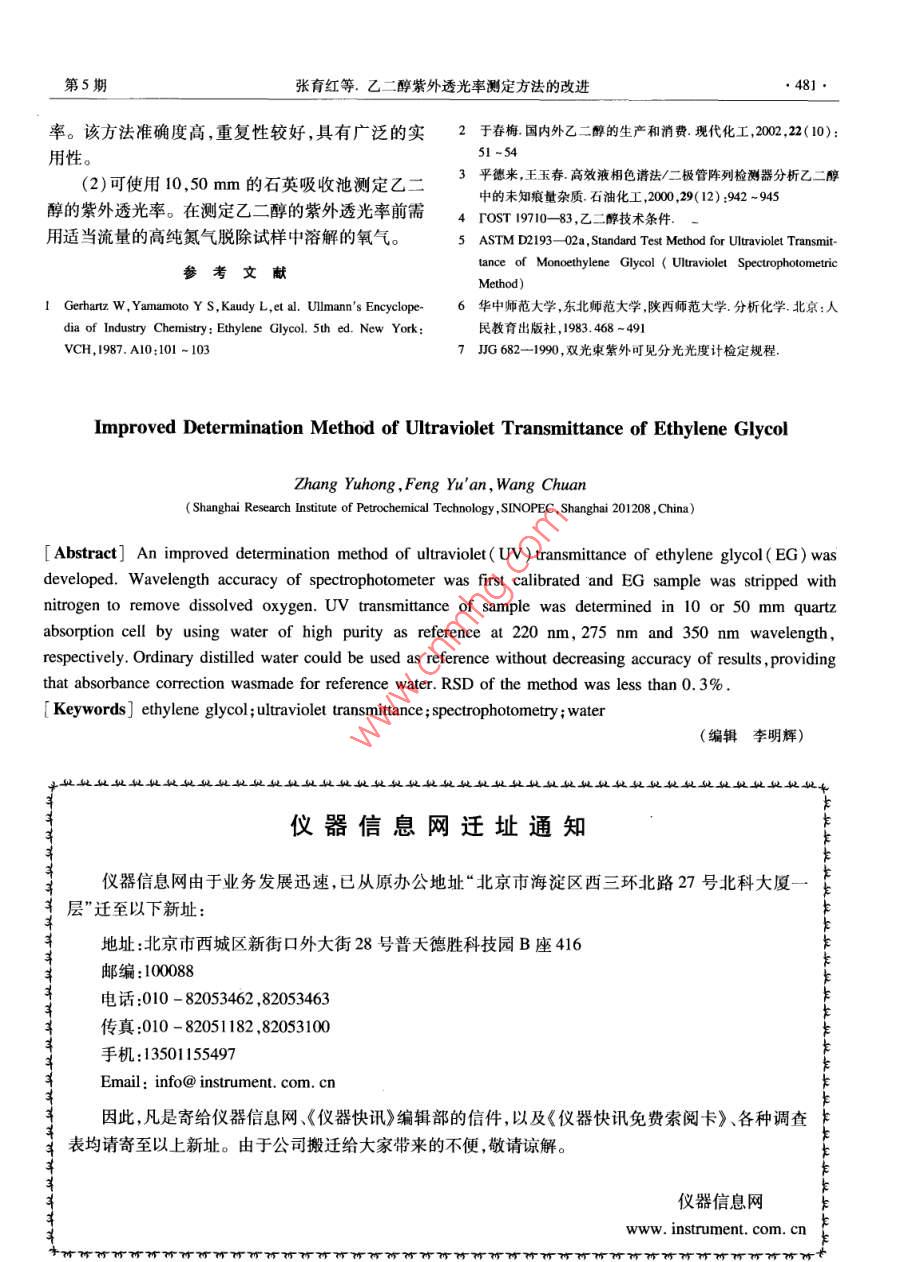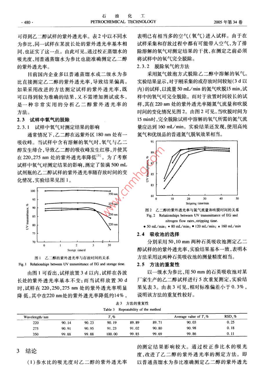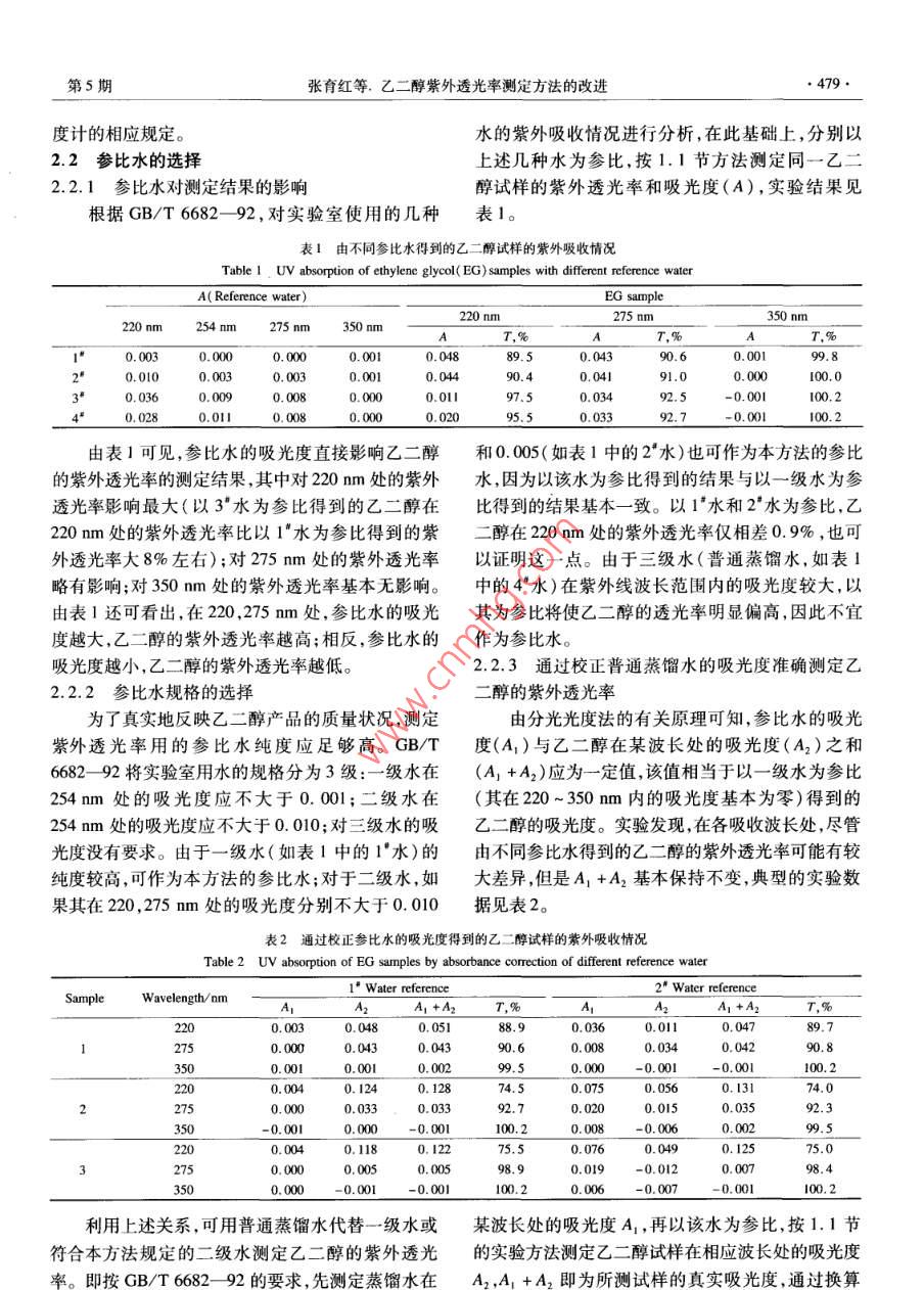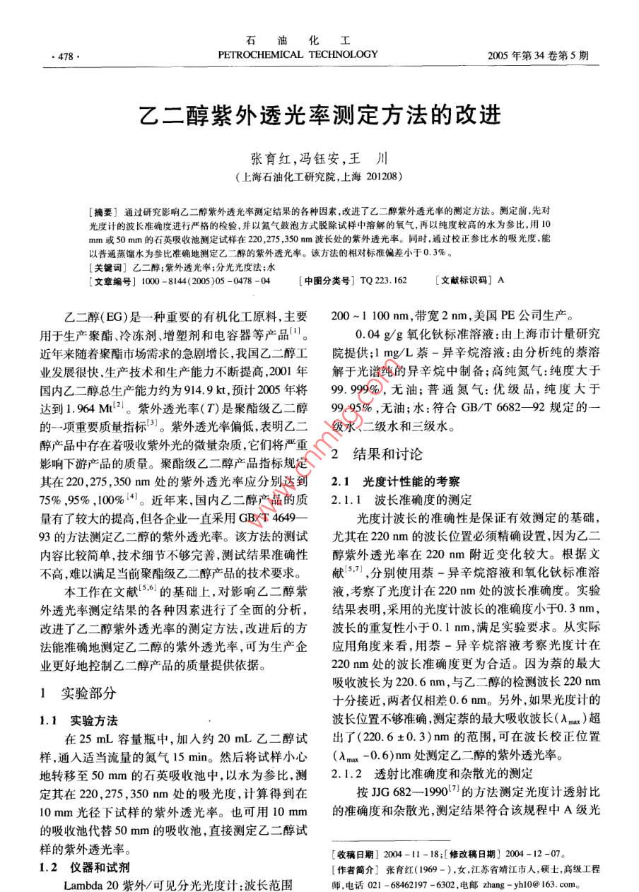 石油化工478PETROCHEMICAL TECHNOLOGY2005年第34卷第5期乙二醇紫外透光率測定方法的改進張育紅,馮鈺安,王川(上海石油化工研究院,上海201208)[摘要]通過研究影響乙二醇紫外透光率測定結(jié)果的各種因素改進了乙二醇紫外透光率的測定方法。測定前先對光度計的波長準確度進行嚴格的檢驗,并以氮氣鼓泡方式脫除試樣中溶解的氧氣,再以純度較高的水為參比,用10mm或50mm的石英吸收池測定試樣在220,275,350m波長處的紫外透光率。同時,通過校正參比水的吸光度以普通蒸餾水為參比準確地測定乙二醇的紫外透光率。該方法的相對標準偏差小于0.3%。關(guān)鍵詞]乙二醇;紫外透光率;分光光度法;水[文章編號]1000-81442005)05-0478-04中圖分類號]TQ23.162[文獻標識碼]A乙二醇(EG)是一種重要的有機化工原料,主要200~1100m,帶寬2mm,美國PE公司生產(chǎn)。用于生產(chǎn)聚酯冷凍劑、增塑劑和電容器等產(chǎn)品0.04g/g氧化鈥標準溶液:由上海市計量研究近年來隨著聚酯市場需求的急劇增長,我國乙二醇工院提供;1mg/L萘-異辛烷溶液:由分析純的萘溶業(yè)發(fā)展很快,生產(chǎn)技術(shù)和生產(chǎn)能力不斷提高,2001年解于光譜純的異辛烷中制備;高純氮氣:純度大于國內(nèi)乙二醇總生產(chǎn)能力約為9149k,預計2005年將99.99%,無油;普通氮氣:優(yōu)級品,純度大于達到1964Mt2。紫外透光率(T)是聚酯級乙二醇99.95%,無油;水:符合GB/T668292規(guī)定的的一項重要質(zhì)量指標3。紫外透光率偏低,表明乙二級水、二級水和三級水。醇產(chǎn)品中存在著吸收紫外光的微量雜質(zhì),它們將嚴重影響下游產(chǎn)品的質(zhì)量。聚酯級乙二醇產(chǎn)品指標規(guī)定2結(jié)果和討論其在220,275,350mm處的紫外透光率應分別達到2.1光度計性能的考察75%,95%,100%。近年來國內(nèi)乙二醇產(chǎn)品的質(zhì)2.1.1波長準確度的測定量有了較大的提高,但各企業(yè)一直采用GB/T4649光度計波長的準確性是保證有效測定的基礎(chǔ)93的方法測定乙二醇的紫外透光率。該方法的測試尤其在220nm的波長位置必須精確設(shè)置,因為乙二內(nèi)容比較簡單,技術(shù)細節(jié)不夠完善測試結(jié)果準確性醇紫外透光率在220m附近變化較大。根據(jù)文不高,難以滿足當前聚酯級乙二醇產(chǎn)品的技術(shù)要求。獻,分別使用萘-異辛烷溶液和氧化鈥標準溶本工作在文獻6的基礎(chǔ)上,對影響乙二醇紫液,考察了光度計在220mm處的波長準確度。實驗外透光率測定結(jié)果的各種因素進行了全面的分析,結(jié)果表明,采用的光度計波長的準確度小于0.3m改進了乙二醇紫外透光率的測定方法,改進后的方波長的重復性小于0.1m,滿足實驗要求。從實際法能準確地測定乙二醇的紫外透光率,可為生產(chǎn)企應用角度來看,用萘-異辛烷溶液考察光度計在業(yè)更好地控制乙二醇產(chǎn)品的質(zhì)量提供依據(jù)。220mm處的波長準確度更為合適。因為萘的最大實驗部分吸收波長為220.6m,與乙二醇的檢測波長220mm十分接近,兩者僅相差0.6m。另外,如果光度計的1.1實驗方法波長位置不夠準確,測定萘的最大吸收波長(Amx)超在25mL容量瓶中,加入約20mL乙二醇試出了(220.6±0.3)m的范圍,可在波長校正位置樣,通入適當流量的氮氣15min。然后將試樣小心(Am-0.6)m處測定乙二醇的紫外透光率。地轉(zhuǎn)移至50mm的石英吸收池中,以水為參比,測2.1.2透射比準確度和雜散光的測定定其在220,275,350mm處的吸光度,計算得到在按JG682-19907的方法測定光度計透射比l0mm光徑下試樣的紫外透光率。也可用10mm的準確度和雜散光,測定結(jié)果符合該規(guī)程中A級光的吸收池代替50mm的吸收池,直接測定乙二醇試樣的紫外透光率。[收稿日期]2004-11-18;[修改稿日期]2004-12-07。12儀器和試劑作者簡介】張育紅(1969-),女,江蘇省靖江市人,碩士,高級工程ambda20紫外/可見分光光度計:波長范圍師電話021-68462197-6302,電郵zhang-yho@163.com5張育紅等.乙二醇紫外透光率測定方法的改進度計的相應規(guī)定。水的紫外吸收情況進行分析,在此基礎(chǔ)上,分別以2.2參比水的選擇上述幾種水為參比,按1.1節(jié)方法測定同一乙二2.2.1參比水對測定結(jié)果的影響醇試樣的紫外透光率和吸光度(A),實驗結(jié)果見根據(jù)GB/T6682—92,對實驗室使用的幾種表1。表1由不同參比水得到的乙二醇試樣的紫外吸收情況Table 1 UV absorption of ethylene glycol( EG)samples with different reference waterA( Reference water)220nm22350T %o0.0030.0000.0002340.0100.0030.040.0491.00.0000.0080.03492.5-0.0010.0280.0l0.0200.033由表1可見,參比水的吸光度直接影響乙二醇和0.005(如表1中的2水)也可作為本方法的參比的紫外透光率的測定結(jié)果,其中對220mm處的紫外水,因為以該水為參比得到的結(jié)果與以一級水為參透光率影響最大(以3·水為參比得到的乙二醇在比得到的結(jié)果基本一致。以1水和2水為參比,乙220mm處的紫外透光率比以1”水為參比得到的紫二醇在220nm處的紫外透光率僅相差0.9%,也可外透光率大8%左右);對275mm處的紫外透光率以證明這一點。由于三級水(普通蒸餾水,如表1略有影響;對350mm處的紫外透光率基本無影響。中的4水)在紫外線波長范圍內(nèi)的吸光度較大,以由表1還可看出,在220,275mm處,參比水的吸光其為參比將使乙二醇的透光率明顯偏高,因此不宜度越大,乙二醇的紫外透光率越高;相反,參比水的作為參比水吸光度越小,乙二醇的紫外透光率越低。2.2.3通過校