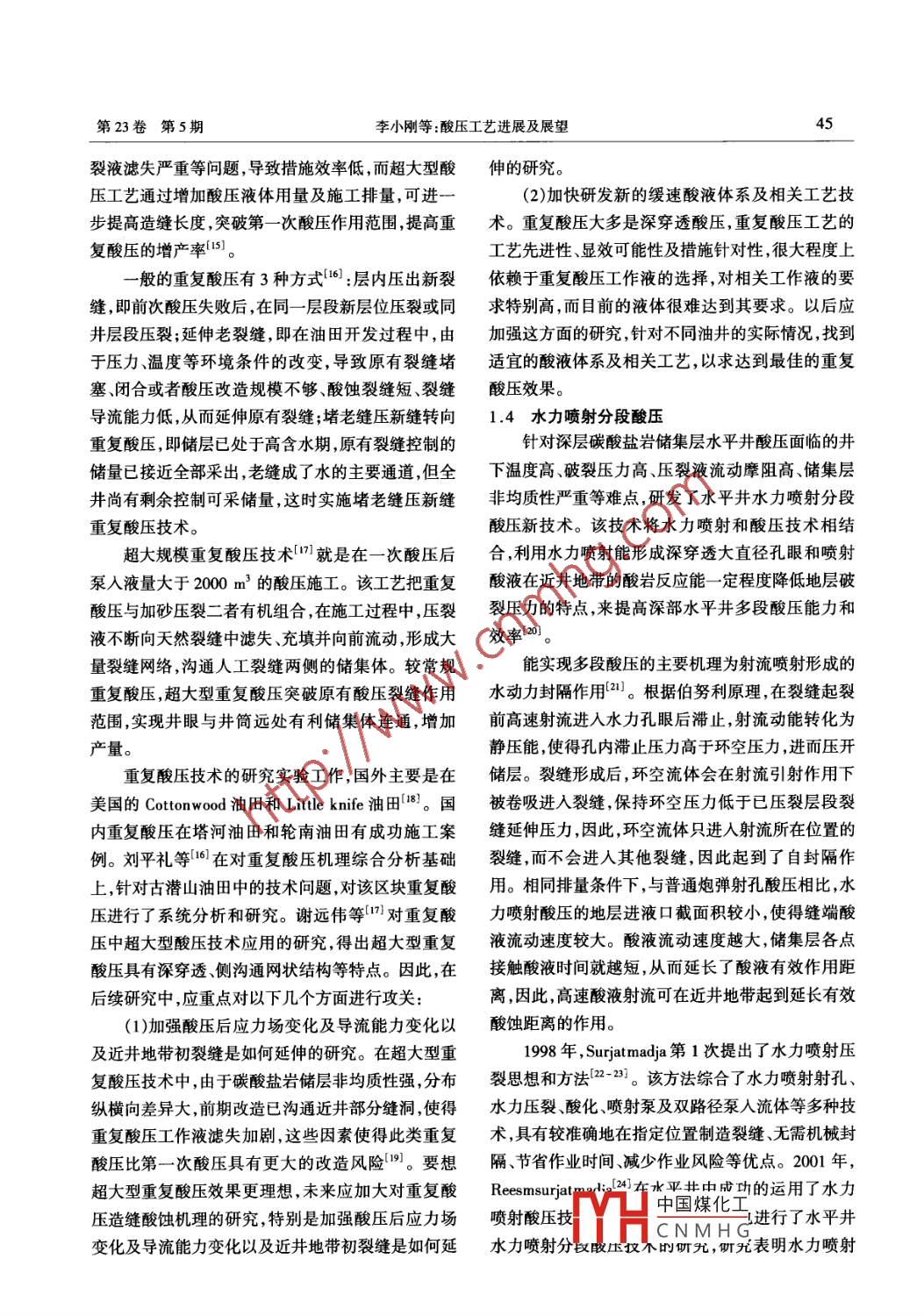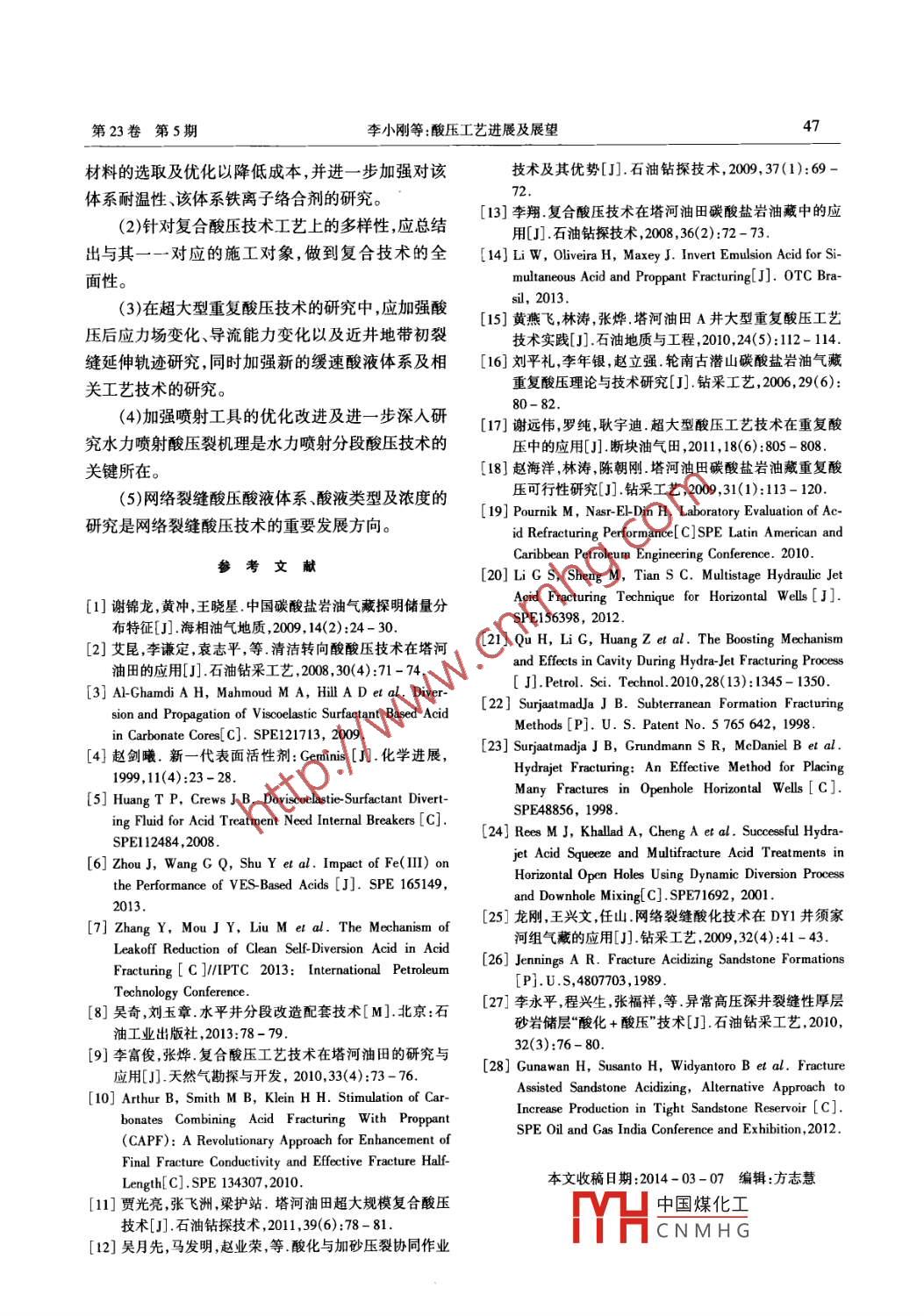 2014年10月油氣井測試第23卷第5期酸壓工藝進展及展望李小剛雷騰蛟!楊兆中!張嘯楓2蘇洲1(1西南石油大學四川成都601500;2.中國石油天然氣股份有限公司對外合作部北京100007搞要隨著油氣田開發(fā)技術(shù)的不斷提高,酸壓技術(shù)不斷得到重視和推廣,已成為重要的儲層改造措施。從技術(shù)原理、工藝特點和發(fā)展瓶頸等方面,剖析了清潔自轉(zhuǎn)向酸酸壓、復合酸壓、超大型重復酸壓、水力噴射分段酸壓和網(wǎng)絡裂縫酸壓等幾項新工藝,進一步結(jié)合理論和實踐研究動態(tài),闡述了上述工藝的發(fā)展趨勢。關(guān)鍵詞酸壓轉(zhuǎn)向酸復合酸壓重復酸壓網(wǎng)絡裂縫文章編號:1004-4388(2014)05-0043-05中圖分類號:TE357文獻標識碼:B0引言淹。為了改善非均質(zhì)儲層酸壓效果,一種新的酸液體系——清潔轉(zhuǎn)向酸應運而生。該體系依靠反應生從全球范圍來看,碳酸鹽巖儲層油氣藏分布廣成的鹽類物質(zhì)濃度自然調(diào)節(jié)酸液黏度,遇油降解遇泛儲量巨大。截止2005年底,世界上已發(fā)現(xiàn)碳水后還能保持一定的結(jié)構(gòu),對油層進行改造的同時酸鹽巖儲層油氣探明可釆儲量1434.5×10°t油當兼具控水功能2l。量,約占506%。酸壓改造技術(shù)早已成為碳酸鹽巖這種新型的轉(zhuǎn)向酸體系,酸液中含有具有獨特油氣藏開發(fā)井增產(chǎn)和穩(wěn)產(chǎn)的主導技術(shù)之一。隨著酸性能的黏彈性表面活性劑,活性劑在鮮酸中分散為壓技術(shù)不斷發(fā)展,該技術(shù)從最初的普通酸壓發(fā)展到單個小分子,因此鮮酸黏度低。鮮酸會首先進入阻現(xiàn)在的深度酸壓,從僅限于對碳酸鹽巖儲層的開發(fā)力較小的高滲透層或天然裂縫,隨著酸巖反應的進發(fā)展到對裂縫發(fā)育連通性好的裂縫性砂巖儲層中行,pH值升高,活性劑形成片狀膠束酸液快速變開發(fā)。因此酸壓改造技術(shù)已成為碳酸鹽巖儲層和黏增加了酸液在高滲透層中的滲透阻力,從而使鮮裂縫性砂巖儲層增產(chǎn)改造的主導技術(shù)。酸轉(zhuǎn)向其他的低滲透層,實現(xiàn)對非均質(zhì)性儲層或低目前,酸壓改造新工藝主要包括清潔自轉(zhuǎn)向酸滲裂縫性儲層的全面改造。當酸液與地層內(nèi)的烴類酸壓、復合酸壓超大型重復酸壓水力噴射分段酸或大量水接觸后膠束結(jié)構(gòu)轉(zhuǎn)變?yōu)榍驙顨埶狃ざ妊笁汉途W(wǎng)絡裂縫酸壓等工藝。這些工藝在國內(nèi)外得到速下降,利于后期返排。廣泛應用且增產(chǎn)效果理想,為油田的增儲上產(chǎn)提供近年來,由于儲層條件越來越苛刻,常規(guī)酸體系了重要保障。適用范圍受到限制,國內(nèi)外關(guān)于清潔自轉(zhuǎn)向酸酸壓工藝技術(shù)研究也越來越活躍。1988年,日本 Osaka1酸壓新工藝大學的 Okuhara等人4合成并研究了柔性基團連接1清潔自轉(zhuǎn)向酸酸壓親水基團的若干雙烷烴鏈表面活性劑,而真正系統(tǒng)目前使用的常規(guī)酸、綜合解堵酸等酸液體系主開展這類新型表面活性劑的研究工作,則是從1991要存在兩個問題:一是由于儲層的非均質(zhì)性注酸過年開始。同年 Menger合成了以剛性基團連接親水程中,酸液優(yōu)先進入高滲帶或裂縫發(fā)育區(qū)域而低滲基團的雙烷烴鏈表面活性劑。 Tianping Huang等透和污染嚴重的層,得不到相應的改造;二是酸壓過人5研究表明,兩相不混容的體系如果不能充分混程中,裂縫向下延伸至水層,導致壓后產(chǎn)水和快速水合,而僅僅依靠地層能量使低黏相以黏性指進方式[基金項目]國家自然科學基金項目“碳酸鹽巖基質(zhì)酸化中蚓孔生長的三維擴散限中國煤化工縫導流能力定量預測模型研究”內(nèi)容(項目編號:51204138,51074134)。[作者簡介]李小剛,男,1981年出生博士副教授現(xiàn)主要從事油氣藏增產(chǎn)理論與THCnmhg3@qg.coMe油氣井測試2014年10月流經(jīng)高黏相(自轉(zhuǎn)向酸)很難充分破膠。 Yi Shu等義為3種情況:①不同酸液復合酸壓施工;②酸壓人6的研究表明酸化施工過程中如果酸液中Fe3與水力加砂壓裂復合施工0;③高能氣體壓裂與酸的含量高,會嚴重影響表面活性劑的性能造成相分壓復合施工。因此,復合酸壓技術(shù)在推動油田的增離絮凝及沉淀,對儲層會造成嚴重傷害,進而研究儲上產(chǎn)中發(fā)揮了重大作用出一種絡合劑能減小Fe3對自轉(zhuǎn)向酸的影響。復合酸壓技術(shù)是20世紀80年代末產(chǎn)生的一種總之,國內(nèi)外關(guān)于清潔自轉(zhuǎn)向酸及其酸壓工藝新型的油氣井增產(chǎn)技術(shù),由于不同改造技術(shù)的組合的研究已經(jīng)取得了顯著成果。但由于轉(zhuǎn)向酸體系的形式較多,其研究的內(nèi)容也比較廣泛。吳月先等2復雜性,該工藝還存在很多有待解決問題。根據(jù)目研究了酸化與加砂壓裂協(xié)同作業(yè)技術(shù),其研究表明前的研究狀況可以預見,在今后一段時期內(nèi),以下幾酸化不僅解除了近井帶堵塞還降低了施工泵壓,同個方面將成為該工藝研究的重點樣也提高了壓裂液的破膠效率和裂縫的導流能力(1)對其材料的選取及制造上進行優(yōu)化以降低等。李翔等1研究了不同酸液的復合酸壓技術(shù),其其成本。在清潔轉(zhuǎn)向酸酸壓技術(shù)中,清潔轉(zhuǎn)向酸體研究表明清潔轉(zhuǎn)向酸與常規(guī)酸復合可解除大段非均系雖然具有很高的剪切穩(wěn)定性和熱穩(wěn)定性,其變黏質(zhì)儲層的污
