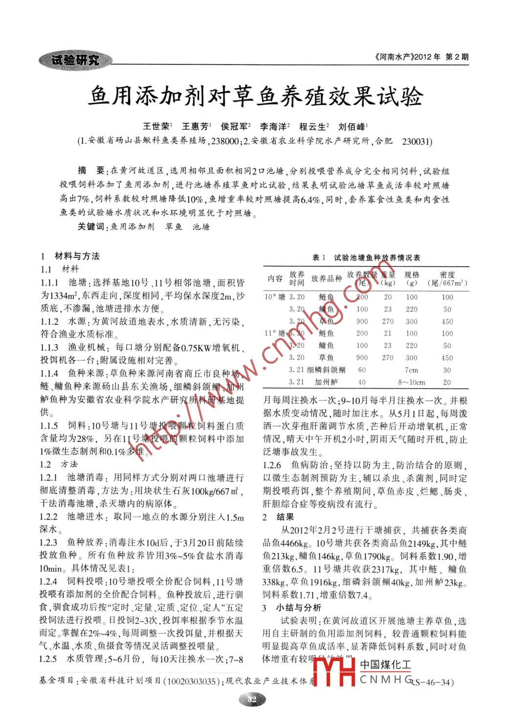 試驗(yàn)研究《河南水產(chǎn)>2012年第2期魚用添加劑對(duì)草魚養(yǎng)殖效果試驗(yàn)王世榮王惠芳侯冠軍2 李海洋2程云生2劉佰峰!(1.安徽省碭山縣鰍科魚類養(yǎng)殖場(chǎng),238000;2.安徽省農(nóng)業(yè)科學(xué)院水產(chǎn)研究所,合肥230031)摘要:在黃河故道區(qū) ,選用相鄰且面積相同2口池塘,分別投喂?fàn)I養(yǎng)成分完全相同飼料,試驗(yàn)組投喂飼料添加了魚用添加劑,進(jìn)行池塘養(yǎng)殖草魚對(duì)比試驗(yàn),結(jié)果表明試驗(yàn)池塘草魚成活率較對(duì)照塘高出7%,飼料系數(shù)較對(duì)照塘降低10%,魚增重率較對(duì)照塘提高6.4%,同時(shí),套養(yǎng)寡食性魚類和肉食性魚類的試驗(yàn)塘水質(zhì)狀況和水環(huán)境明顯優(yōu)于對(duì)照塘。關(guān)鍵詞:魚用添加劑草魚池塘1材料與方法表1試驗(yàn)池塘 魚種放養(yǎng)情況表1.1材料內(nèi)容放養(yǎng)放養(yǎng)品種.放養(yǎng)數(shù)量重量規(guī)格密度1.1.1 池塘:選擇基地10號(hào)、11號(hào)相鄰池塘,面積皆時(shí)間(尾) (kg) (g) (尾/667m2 )為1334m2,東西走向,深度相同,平均保水深度2m,沙10*塘3.20鰱魚 .200 20 100100質(zhì)底,不滲漏,池塘進(jìn)排水方便。3.20鱅 魚100 23 2201.1.2 水源:為黃河故道地表水, 水質(zhì)清新,無污染,3.20草 魚900 270 300450符合漁業(yè)水質(zhì)標(biāo)準(zhǔn)。11“塘3.20 鰱魚.2002001.1.3漁業(yè)機(jī)械: 每口塘分別配備0.75KW增氧機(jī)、50投餌機(jī)各一臺(tái);附屬設(shè)施相對(duì)完善。3.20 草魚900270 3001.1.4魚種來源:草魚種來源河南省商丘市良種場(chǎng),3. 21細(xì)鱗斜頜鲴6(7cm鰱、鳙魚種來源碭山縣東關(guān)漁場(chǎng),細(xì)鱗斜頜鲴、加州3.21加州鱸4(8~10cm_ 2鱸魚種為安徽省農(nóng)業(yè)科學(xué)院水產(chǎn)研究所科研基地提月每周注換水一次;9~10月每半月注換水一次。并根據(jù)水質(zhì)變動(dòng)情況,隨時(shí)加注水。從5月1日起,每周潑1.1.5 飼料:10號(hào)塘與11號(hào)塘投喂顆粒飼料蛋白質(zhì)灑一次芽孢肝菌調(diào)節(jié)水質(zhì),芒種后開動(dòng)增氧機(jī),正常含量均為28%,另在11號(hào)塘投喂的顆粒飼料中添加情況,晴天中午開機(jī)2小時(shí),陰雨天氣隨時(shí)開機(jī),防止1%微生態(tài)制劑和0.1%多維。泛塘事故發(fā)生。1.2方法1.2.6 魚病防治:堅(jiān)持以防為主,防治結(jié)合的原則,1.2.1池塘消毒:用同樣方式分別對(duì)兩口池塘進(jìn)行以微生態(tài)制劑預(yù)防為主,輔以殺蟲、殺菌劑,同時(shí)定徹底清整消毒,方法為:用塊狀生石灰10k/667nf,期投喂藥餌,整個(gè)養(yǎng)殖期間,草魚赤皮、爛鰓、腸炎、干法消毒池塘,殺滅塘內(nèi)的病原體。肝膽綜合癥等疫病沒有流行。1.2.2池塘進(jìn)水: 取同一地點(diǎn)的水源分別注人1.5m2結(jié)果深水。從2012年2月2號(hào)進(jìn)行干塘捕獲,共捕獲各類商1.2.3魚種放養(yǎng):消毒注水10d后,于3月208前陸續(xù)品魚4466kg。10號(hào)塘共獲各類商品魚2149kg,其中鰱投放魚種。所有魚種放養(yǎng)皆用3%-5%食鹽水消毒魚213kg,鳙魚146kg,草魚1790kg。飼料系數(shù)1.90,增10min。具體情況見表1:重倍數(shù)6.5。11號(hào)塘共收獲2317kg,其中鰱、鳙魚1.2.4飼料投喂 :10號(hào)塘投喂全價(jià)配合飼料,11號(hào)塘338kg,草魚1916kg,細(xì)磷斜頜鯝40kg,加州鱸23kg。投喂有添加劑的全價(jià)配合飼料。魚種投放后,進(jìn)行馴飼料系數(shù)1.71 ,增重倍數(shù)7.4。食,馴食成功后按“定時(shí)、定量、定質(zhì)、定位、定人”五定3小結(jié)與分析投飼法進(jìn)行投喂。日投飼2- -3次,投餌率根據(jù)季節(jié)水溫試驗(yàn)表明:在黃河故道區(qū)開展池塘主養(yǎng)草魚,選而定。掌握在2%~4%,每周調(diào)整--次投餌量,并根據(jù)天用自主研制的魚用添加劑飼料,較普通顆粒飼料能氣水溫、水質(zhì)、魚攝食等情況靈活調(diào)整投喂量。明顯提高草魚成活率,顯著降低飼料系數(shù),同時(shí)對(duì)魚1.2.5水質(zhì)管理:5~6月份, 每10天注換水一次;7~8體增重有較明呂當(dāng)"中國(guó)煤化工基金項(xiàng)目:安徽省科技計(jì)劃項(xiàng)目(10020303035);現(xiàn)代農(nóng)業(yè)產(chǎn)業(yè)技術(shù)體TYHCNMH Gs-46-34).