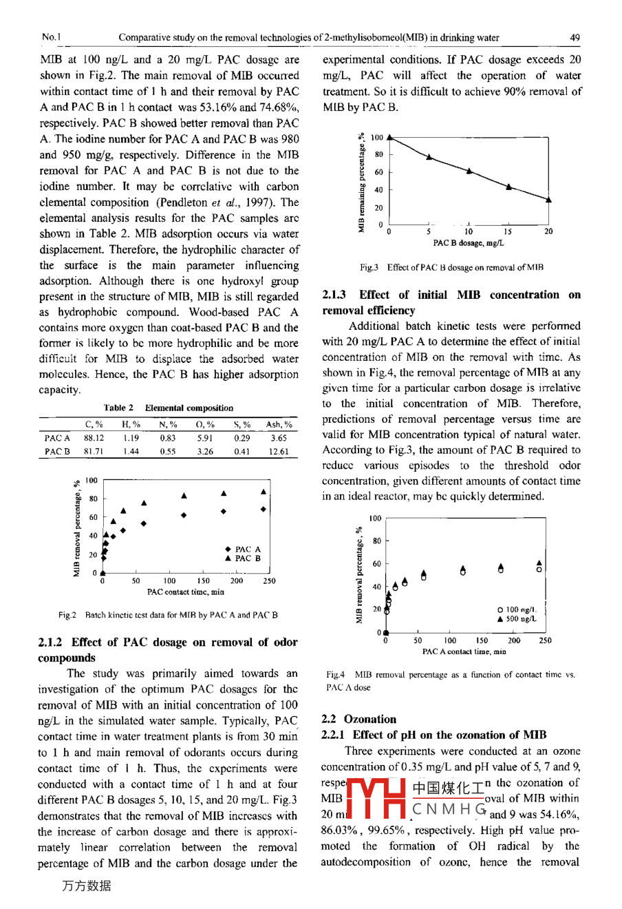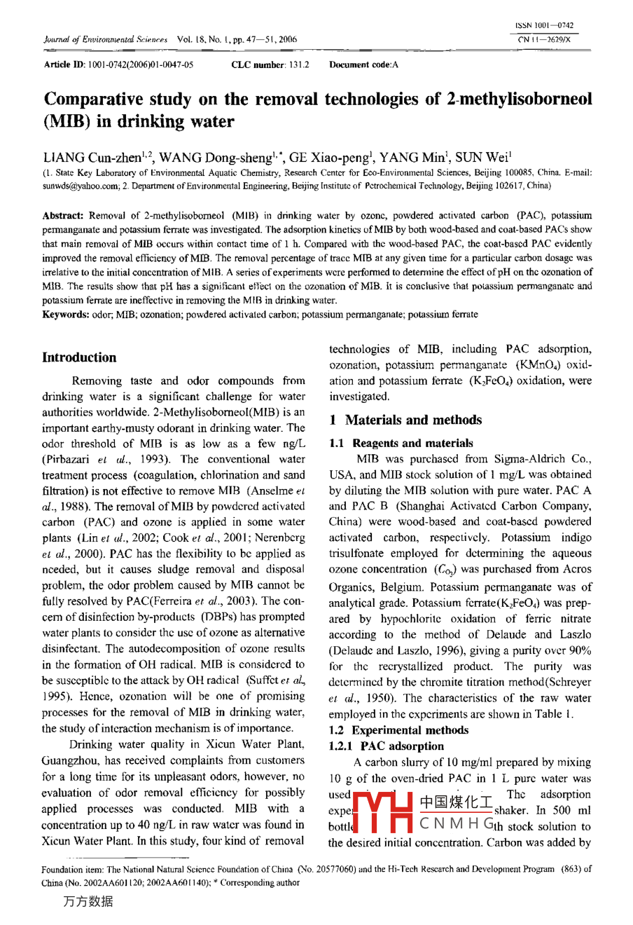 ISSN 1001- 0742Journal of Environmentad Sciences Vol. 18. No. l, pp. 47- -S1, 2006CNI!- 2629/XArticle ID: 1001-0742(2006)01-0047-05CLC number: 131.2Document code:AComparative study on the removal technologies of 2 methylisoborneol(MIB) in drinking waterLIANG Cun-zhen+2, WANG Dong sheng'", GE Xiao-peng', Y ANG Min', SUN Weil(1. State Key Laboratory of Environmental Aquatic Chemistry, Research Centcr for Eco-Environmental Sciences, Bejjing 100085, China. E-mail:sunwds@yaboo.com; 2. Department of Environmental Engineering, Beijing Institute of Pctrochenical Techinology, Beijing 102617, China)Abstract: Removal of 2-methylisobomeol (MIB) in drnking water by ozonc, powdered activated carbon (PAC), potassiumpemanganate and potassium ferrate was investigated. The adsorption kinetics of MIB by both wood-based and coat-based PACS showthat main removal of MIB occurs within contact time of 1 h. Compared with the wood-based PAC, the coat-bascd PAC evidentlyimproved the removal eficiency of MIB. The removal percentage of tracc MIB at any given time for a particular carbon dosagc wasirrelative to the initial concentration of MIB. A series of experiments wcre perfomed to determine the efect of 'pH on the ozonation ofMIB. The resuits show that pH has a significant eftet on the ozonation of MIB. It is conclusive that poassium pemanganatc andpotassium ferrate are ineffectivc in removing the MIB in drink ing water.Keywords: odor, MIB, ozonation; powdered activaled carbon; potassium permanganate; potassiumn ferratetechnologies of MIB,including PAC adsorption,Introductionozonation, potassium permanganate (KMnO4) oxid-Removing taste and odor compounds fromation and potassium ferrate (K2FeO4) oxidation, weredrinking water is a significant challenge for waterinvestigated.authorities worldwide. 2-Methylisobormeol(MIB) is an1 Materials and methodsimportant earthy-musty odorant in drinking water. Theodor threshold of MIB is as low as a few ng/L1.1 Reagents and materials(Pirbazari el ul.,, 1993). The conventional waterMIB was purchascd from Sigma- Aldrich Cotreatment process (coagulation, chlorination and sandUSA, and MIB stock solution of l mg/L was obtainedflration) is not effective to remove MIB (Anselme elby diluting the MIB solution with pure water. PAC A .al, 1988). The removal of MIB by powdered activatedand PAC B (Shanghai Activatcd Carbon Company,carbon (PAC) and ozone is applied in some waterChina) were wood-based and coat-bascd powderedplants (Lin el ul., 2002; Cook el al., 2001; Nerenbergactivated carbon, respectively. Potassium indigoel al, 2000). PAC has the flexibility to be applied astrisulfonate employed for dctermining the aqueousnceded, but it causes sludge removal and disposalozone concentration (Co) was purchased from Acrosproblem, the odor problem caused by MIB cannot be :Organics,Belgium. Potassium permanganate was offully resolved by PAC(Ferreira et al, 2003). The con-analytical grade. Potassium ferrate(K:FeO) was prep-cem of disinfection by-products (DBPs) has promptedared by hypochloritc oxidation of ferric nitratewater plants to consider the use of ozone as alternativeaccording to the method of Delaude and Laszlodisinfectant. The autodecomposition of ozone results(Delaude and Laszlo, 1996), giving a purity over 90%in the formation of OH radical. MIB is considered tofor thc recrystallized product. The purity wasbe susccptible to the attack by OH radical (Suffct et al,dctermincd by the chromite titration method(Schreyer1995). Hence, ozonation will be one of promisingel aul., 1950). The characteristics of the raw waterprocesses for the removal of MIB in drinking water,employed in the cxpcriments are shown in Table I.the study of interaction mechanism is of importance.1.2 Experimental methodsDrinking water quality in Xicun Water Plant,1.2.1 PAC adsorptionGuangzhou, has received complaints from customersA carbon slurry of 10 mg/ml prepared by mixingfor a long time for its unpleasant odors, however, no10 g of the oven-dried PAC in 1 L purc water wasevaluation of odor removal efficicncy for possiblyused中國煤化工。The adsoptionapplied processcs was conducted. MIB with aexpeshaker. In 500 mlconcentration up to 40 ng/L in raw watcr was found inbottleMYHC N M H Gth stock solution toXicun Water Plant. In this study, four kind of removalthe desired initial concentration. Cartbon was added byFoundation item: The Nutional Natural Science Foundation of China (No. 20577060) and the Hi- Tech Rescarch and Development Program (863) ofChina (No. 2002AA601 I20; 2002AA601140); * Corresponding author48LIANG Cun- zthen et al.Vol.18Table 1Characteristic of row waterwater with 2.5 mgL polyaluminum chloride(PACI) asAlkalinity, Hardness, Total organic Turbidiy,Al2O3. TOC of raw water and settled water was 4.61pHmg/L CaCO, mg/L CaCO3 carbon, mg/LNTUand 2.87 mg/L, respectively. Ozone stock solution was71-7.252-60110-130 4.5-4.9- 3.2-3.6_first obtained by bubbling ozone gas into pure water.aliquots of carbon slury. The bottle without theOzone was introduced by adding aliquots of the ozoneintroduction of carbon was used to determine thestock solution to obtain the desired ozone doses.initial concentration. These bottles were covcred withExperiments were conduced at 20C and pH 7. Thea PTFE-faced silicone septum and a screw cappH was stabilized with 50 mmol/L sodium phosphateSamples were then withdrawn at the predeterminedbuffer. After a 10-min O3 contact time, a part oftime intervals up to 240 min and were filtercd withsample was qucnched with Indigo reagent for theglass microfiber filters. The remaining concentrationmeasurement of the O3 residuai and the other sarmpleof MIB was determined immediately.was quenched by sodium sulfite for MIB analysis.1.2.2 Ozonation of MIB1.2.3 Potassium permanganate oxidationA series of experiments were performed toA stock solution of KMnO4 was prepared bydetermine the effect of pH on the ozonation of MIB indissolving crystal permanganate in pure water.a stainless-steel reactor(Fig. 