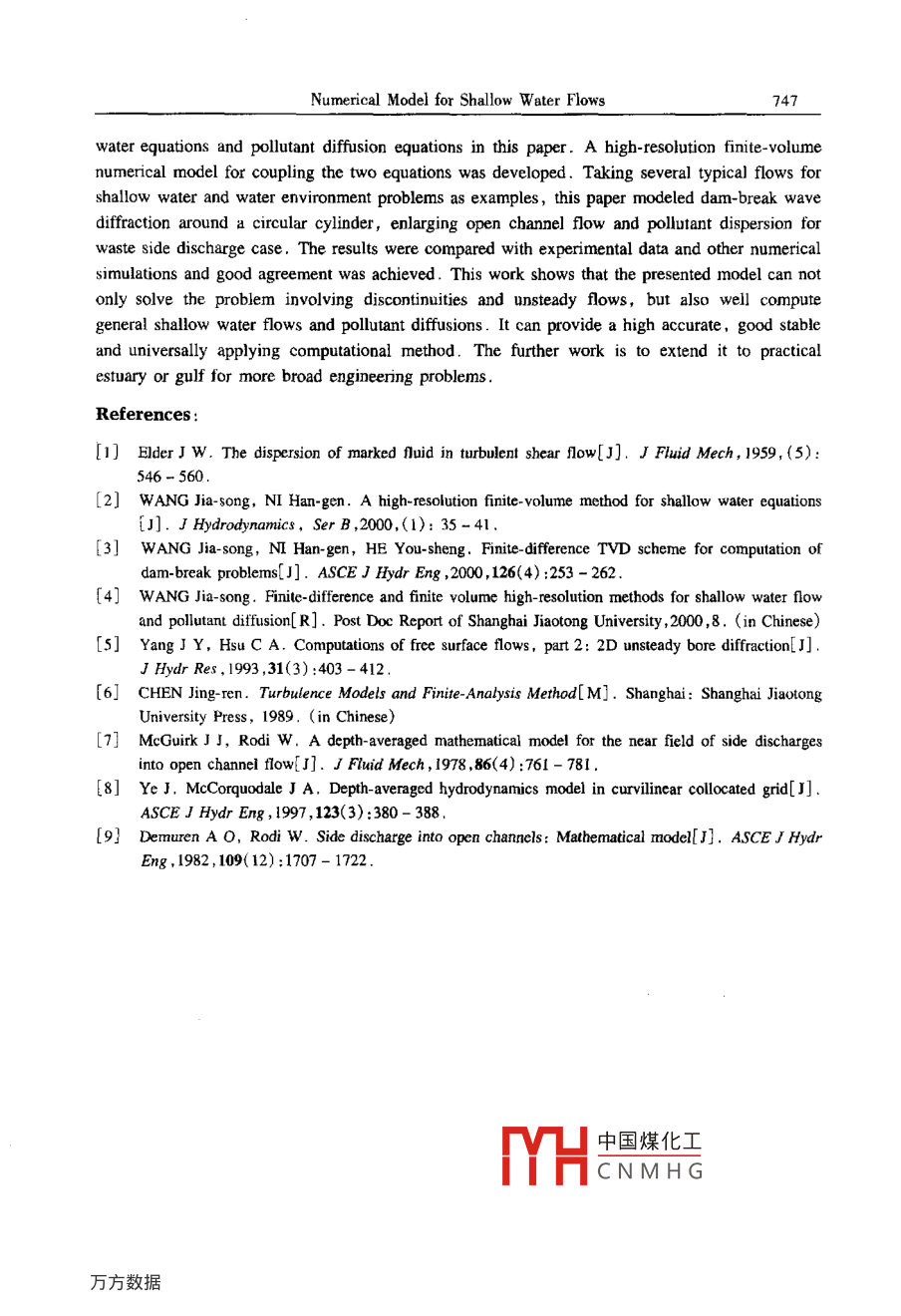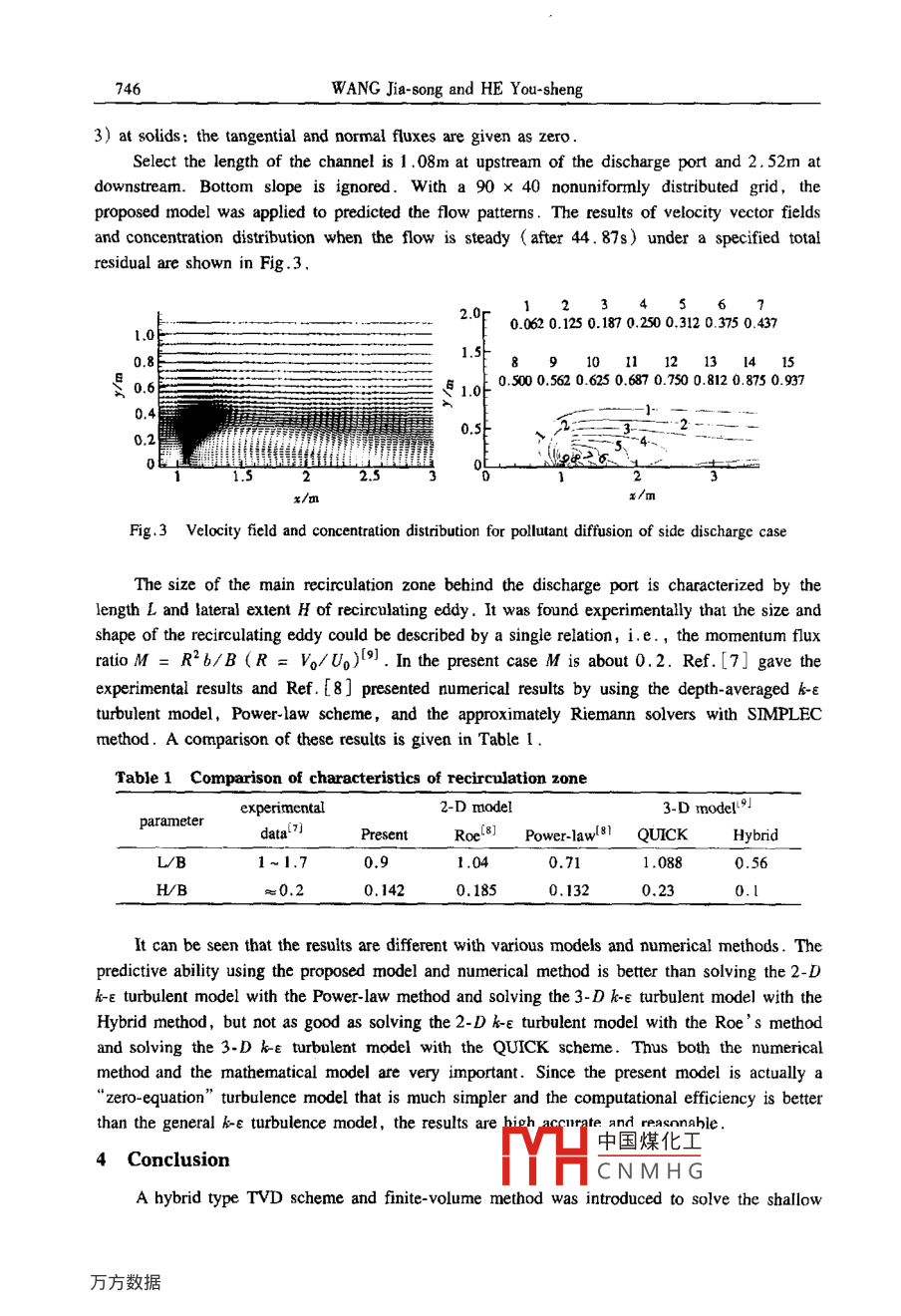 Applicd Mathemaiss and MechanicsPublished by Shanghai University,( English Edition, Vol 23,No 7, Jul 2002)Shanghai,ChinaArticle ID: 0253-4827(2002)07-0741-07HIGH-RESOLUTION NUMERICAL MODEL FOR SHALLOWWATER FLOWS AND POLLUTANT DIFFUSIONSWANG Jia-scng (王嘉松)',HE You-sheng (何友聲)2(1. School of Mechanic Engineering, Shanghai Jiaotong University,Shanghai 200030, P R China;2. Department of Engineering Mechanics , Shanghai Jiaotong University,Shanghai 200030, P R China)(Contributed by HE You-sheng)Abstract: A finite- volume high resolution numerical model for coupling the shallow waterflows and pollutant diffusions was presented based on using a hybrid TVD scheme in spacediscretization and a Runge- Kutta method in time discretization. Numerical simulations formodelling dam break,enlarging open channel flow and pollutant dispersion were implementedand compared with experimental data or other published computations . The validation of thismethod shows that it can not only deal with the problem involving discontinuities and wnsteadyflows,but also solve the general shallow water flows and pollutant diffusions.Key words: shallow water flow; pollutant diffusion; TVD scheme ; finite-volume method;numerical simulationCLC numbers: 035; TV131.4Document code: AIntroductionShallow water flow exists very widely in hydraulic engineering ,Polutant diffusion that ismainly controlled by the shallow water flow has brought increasingly attention in environmentalengineering. The two- dimensional model for describing the flow characteristics has been usedextensively in engineering and the three- dimensional model has been greatly developed. But thetwo- dimensional model would continue to be widely applied in engineering considering the statusin engineering application and quality of computer. However, both the computations of theshallow water flow and the pollutant diffusion are necessary to be further developed. Forexample, the tidal flow and the pollutant dispersion at an estuary with strong upsurge require moreeffective scheme to simulate them than the conventional method. Natural water field with arbitrarycomplex boundaries requires the computational model having a flexibility to treat the complextopology of boundaries . Sewage emissions of large area demand a uniform model to describe theflow so as not to differentiate the computational domain as a near- and a far-filed. In these+ Received date: 2001-06-08; Revised date: 200中國煤化工、Foundation item: the National Natural Science FBiographies: WANG Jia song (1909-), Asscciate ProYHcNMHG@st.cdu.cn);IE You sheng (1931 - ), Professor , Academician of Chinese Academy of Engineering741742WANG Jia-song and HE You- shengsituations it is necessary to develop a high accurate and more flexible computational model. Thetotal variation diminishing (TVD) scheme is used very widely in aerodynamics because of itsnumerical performance of high accuracy, good shock capturing ability and strong stability .Recently the finite- volume method is being applied extensively to the shallow water equations forits advantages of flexibility of geometry, simplicity of a finite-difference method and lesscomputational effort than the finite-element method. The purpose of this paper is using a high-resolution method based on the finite- volume method and the TVD scheme for solving shallowwater flow and environmental hydrodynamics problems. As we know, the water flow impacts onthe pollutant concentration distribution and diffusion, whereas pollutant diffusions do not affect onthe water flows if the density of pollutants is not considered . Therefore coupling or uncoupling tosolve the shallow water equations or the pollutant concentration equations is optional. In thispaper,the two equations were coupled to be solved for convenience to apply the TVD scheme1 Governing EquationsThe governing equations for describing the shallow water flows and pollutant dispersions arethe shallow water equations and the pollutant diffusion equations . The coupling and conservativeform can be written asQ: + [r(Q)], + [G(Q)], = s(Q),(1)whereQ = (h,q,q,C)",(2)F(Q) = (q。,q驗/h + 0.5gh2 ,qxg,/h,qC/h)",(3)G(Q) = (g,,9xg,/h,q;/h + 0.5gh2 ,q,C/h)",4)s(Q) = (S,S2,Sg,S4)",5)Si=0,(6Sz =--(2v。(7)pS3 =-520,影)+(。.(”號; +器)小(8)S4=二(K.)+元(K,)+ Se,(9)where Q,F(Q),G(Q) and S( Q) denote the conserved physical vector, flux vectors in the 必and r- directions, and the source terms, respectively; h is water flow depth (m); g is gravityacceleration, qr,qy,, Thx, Tby,K, and K, are components of discharge per unit width (m2 /s),bottom shear stress and concentration dispersion coefficients, along 第and y- directions ,respectively; C is the pollutant averaged concentration (mg/1); v。= v + v is the effectiveviscosity stress; u is the turbulence viscosity and Sc is the source term .It is assumed that the turbulence viscosity is dominated from the shear stress, then it can beexpressed as!:中國煤化工以=6(10)MHCNMHG.where K is the von Karman constant ( =0.41). u. is the shear speed and given byNumerical Model for Shallow Water Flows743(11)where Tb is the bottom shear stressTb=√壇+壇,,(12)andTby = pghSg(13)The friction Sgx,Sjy can be obtained by the Manning formula_n2qa√q: + q_n2q,√q+qSfx =h 10/3Sp =(14)where n is the Manning coarse coefficient.Based on the experiential formulael11 ,the diffusion coefficients are used asKz = 5.93↓gn1 qx 1/hl/6,(15)K, = 5.93Vgn 1 q, 1/hV6.(16)2 Numerical SchemeConsider any quadrilateral element i, the integral form of Eg.(1) for the domain Q2 ofinterest and the boundary an can be written asedA+jao(F,G). ndl =Jf。_SdA,(17)。J0where A is the area of domain Q,dl denotes the arc length of the boundary日∩,n is an unitoutward vector normal to the boundary a0, which is constituted of four sides . The second term ofabove equation can be given by(F,G). ndl = 2/(Q)t*,(18)where k is the number of the sides, where * is the length of the side h, and fk denotes the ou