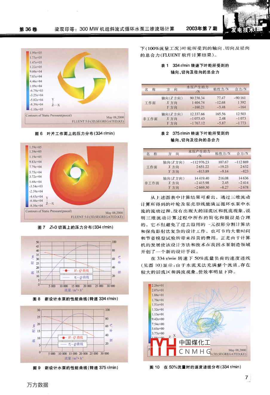 第36卷第7期中國電力vo.36,No.72003年7月ELECTRIC POWERJuL,2003發(fā)電技術(shù)300Mw機(jī)組斜流式循環(huán)水泵三繼流場計(jì)算梁雙印,李興平2,胡三高’,張志明,康志忠,徐鴻(1.華北電力大學(xué)(北京),北京102206;2.山東電力科學(xué)研究院,山東濟(jì)南25000)摘要:針對國產(chǎn)300MW機(jī)組循環(huán)水泵現(xiàn)場運(yùn)行效率低的問題,對循環(huán)水泵進(jìn)行改進(jìn)設(shè)計(jì)。通過改進(jìn)設(shè)計(jì)和制造的300MW機(jī)組斜流式循環(huán)水泵在額定工況下效率可達(dá)90%左右。為了解其變工況特性,采用商業(yè)軟件 FLUENT對其新的葉輪及泵殼型線進(jìn)行三維流場計(jì)算和分析,并對其在不同流量工況的流體狀態(tài)分布進(jìn)行模擬,為改進(jìn)設(shè)計(jì)以滿足變工況要求提供了理論依據(jù)。關(guān)鍵詞:火電廠;斜流式循環(huán)水泵;三維模型中圖分類號:TK264.1文獻(xiàn)標(biāo)識碼:A文章編號:10049649(2003)07-000504由于電網(wǎng)調(diào)峰的需要,300MW及以上機(jī)組參度等物性參數(shù)變化時(shí)流體控制方程;還包括流體能與調(diào)峰已成為必然。日前我國300MW機(jī)組的設(shè)計(jì)量守恒的能量方程主要以帶基本負(fù)荷考慮,其變工況運(yùn)行經(jīng)濟(jì)性較差。因此,提尚機(jī)組調(diào)峰過程變工況運(yùn)行經(jīng)濟(jì)性是當(dāng)前2葉輪及泵殼幾何模型的建立火電廠節(jié)能降耗的重要任務(wù)之一。鑒于電廠絕大部分輔機(jī)如循環(huán)水泵在設(shè)計(jì)時(shí)未考慮變速運(yùn)行,所以借助混流式水泵的一元流動(dòng)設(shè)計(jì)方法,首先確機(jī)組在變工況下循環(huán)水泵的運(yùn)行工況與實(shí)際τ況偏定水泵葉輪和泵殼近似外形尺寸、葉輪進(jìn)出口的幾離較大,使能耗增加。為改善這一狀況,對循環(huán)水泵何參數(shù),通過三維CAD軟件包和HENT的前處理的電機(jī)進(jìn)行了單速變雙速的改造,同時(shí)對泵的葉輪功能產(chǎn)生計(jì)算的初始幾何模型,同時(shí)進(jìn)行幾何模艱和泵殼型線進(jìn)行了改進(jìn)設(shè)計(jì),使新泵的實(shí)際運(yùn)行性的網(wǎng)格剖分,并將沿流動(dòng)方向葉輪和泉?dú)さ耐鞑磕艿玫胶艽筇岣?效率達(dá)到90%左右。因此,從理論分的坐標(biāo)尺寸作為計(jì)算的目標(biāo)。該幾何模型經(jīng)上進(jìn)行流場分析和計(jì)算,分析新泵在變工況下的運(yùn) FLUENT軟件包的流動(dòng)計(jì)算后,將不符合流線和有行特性為進(jìn)一步改進(jìn)設(shè)計(jì)有重要現(xiàn)實(shí)意義和工程應(yīng)回流區(qū)附近的尺寸修改后重新進(jìn)行計(jì)算。本計(jì)算所用價(jià)值使用的軟件版本還不能達(dá)到完全自動(dòng)的趨勢辯識通流部分的流動(dòng)計(jì)算在國際通用的大型計(jì)算流有時(shí)還需人為干預(yù)并進(jìn)行最趨勢調(diào)整。圖1示出體力學(xué)、燃燒和傳熱商業(yè)軟件包 FLUENT-3D上完了葉輪工作面的網(wǎng)格分布。泵殼和葉輪橫截中分面成。該軟件包和其它同類型商業(yè)軟件包如 Phoenix的網(wǎng)格劃分見圖2和Flow3D等相比,采用非結(jié)構(gòu)化單元網(wǎng)格,復(fù)雜工程問題的流動(dòng)邊界網(wǎng)格剖分和前后處理吏加簡單方便。在理論計(jì)算的基礎(chǔ)上,對新泵的水力特性和汽蝕性能進(jìn)行了定量分析,提出了進(jìn)一步提高該泵流動(dòng)性能和可靠性的理論建議,為完善其設(shè)計(jì)和提高運(yùn)行的經(jīng)濟(jì)性提供了理論依據(jù)。1理論模型流動(dòng)、燃燒及傳熱商業(yè)軟件包 FLUENT-3D算流體流動(dòng)主要應(yīng)用流體動(dòng)量守恒的運(yùn)動(dòng)方程(納FLUENT 5.0(d, segregated, k維埃——斯托克斯方程),相應(yīng)的其它控制方程包中國煤化工括:流體質(zhì)量守恒的連續(xù)性方程;考慮流體密度、粘格分布CNMHG收稿日期:200209-03;修回日期:2003-0426作者簡介;梁雙印(1963-),河北井陘人,副教授,從事發(fā)電廠熱經(jīng)濟(jì)性分析研究。E- mail: liangshuangyin@263nmet發(fā)電技術(shù)2003年第7期中國電力第36卷與收斂速度之間的關(guān)系曲線。4計(jì)算結(jié)果及分析經(jīng)三維流動(dòng)計(jì)算,得到葉輪及泵殼的幾何參數(shù)(見圖4):出口邊=16°的傾斜角。葉輪的出口寬度b與葉輪出口最人直徑D2之比b/D2=0.38,葉輪的出口寬度b與葉輪出口最小直徑D1之比b/D0.52,葉片包角約為84°。殼體的螺線升角α與安放角B之比為0.5May08200FLUENT 5.00d segregated, ke圖2橫截中分面上的葉輪及泵殼的3D網(wǎng)格分布3計(jì)算過程的簡化及計(jì)算方案鑒丁電廠循環(huán)水泵及其T質(zhì)的運(yùn)行工況處在環(huán)圖4葉輪及泵殼的幾何參數(shù)境溫度,其物性參數(shù)一般變化不大,為簡化計(jì)算,略了溫度變化對工質(zhì)粘度及密度的影響。在流量由于泵殼結(jié)構(gòu)的不對稱性,相應(yīng)的空間平面Z=0定時(shí),假設(shè)水流不可壓縮、水流充滿入口及出口截定義為垂直于泵軸凡通過泵殼圓形出口直徑的切面。面,即在入口(導(dǎo)流環(huán)下側(cè)截面)及出口截面(泵殼圖5為n=334rmin(Q=17500t/h,100%流量工原形出I截面)速度場分布均勻。葉輪入口段預(yù)旋況)計(jì)算得到的流體速度跡線分布。從圖中可看出,在及出口段環(huán)流與相應(yīng)部位的葉輪旋轉(zhuǎn)速度相同并采該型線上的流體速度跡線和葉輪及泵殼的型線吻合用動(dòng)