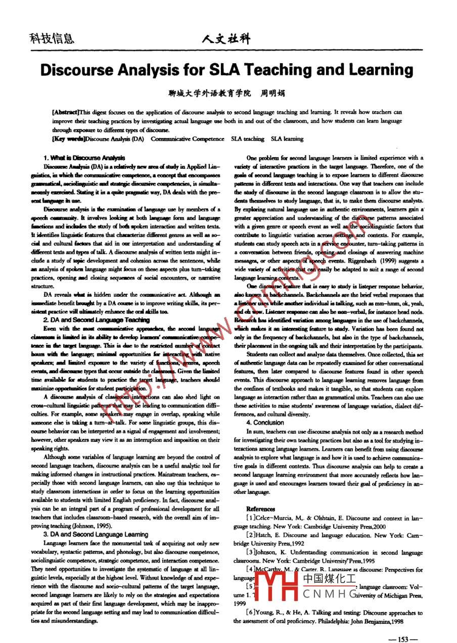 科技信息人文社科Discourse Analysis for SLA Teaching and Learning聊城大學(xué)外語教育學(xué)院周明娟[Abetract]This digcst focuses on the application of discouse analysis to second language teaching and leamning. It reveals how teachers canimprove their taching practices by invesigting actual banguage se both in and out of the chsroom, and how students can learm languagehrough apout tw dferent oypes of discounse.[Key werds]Discouse Analyis (DN) Commoanicative Competence SLA taching SLA leaming1. Whatis Diacourse AnalysisOne problem for second language leamers is limited experience with aDicoame Amabysis DA)is arcl tivdyow arad study in Applied lin- variety of intern ctive practics in tbe target language. Therefore, one of thegistics, im hich dhe comunica tive onmpdenc,s coocp that emompsesgpale of second langnago tee ching i 10 expose leamen to dfferent discouneos tind,samiolingistica nd taunltegic discunsive compedencies, i simulta-pettcrms in dfcrcnt texts and inters ctions. One way that teachers can inchudethe stundy of discourse in the soond language lasroon is to alow the stu-Dieourse andlysis is the eminmion of langusge ue by members of a By explo ring natural language e in authentie enriroaments, learmners gain aapochcom rtownily. t involves lookinga both lmgug form and languagp grealer appreciation and understandling of the discourse patterms asociatedfumnctions and indodes the study of boeth spoken intraction and witen texte.with a given geare or speech event幽well 8s the sociolinguistic factors that勤identifies lngistic fentures that cha o cterize dfferent genres 8s well曬80-contribute如o linguistic variation acroes sttings and contexts. For example,cid and culturnl 6 chors that aid in our interpretation and understanding ofstudents can study speech acts in a service encounter, tum-taking palterns infereat texts and tpes of tk A diecoure analyis of witen texts might in-clude a stuady of topic development and coheaion acroes the sentences, while messngs, or other aspect of speech events. Riggenbach (1999) sugests a部analysis of spokea language might focus on these aspects plus tum-aking wide v riedy o activitice that can easily be adapted t如o suit a range of secondpa ctics, openings nd cloeing sequa wes of social encounters, or narrative language leaning ontests.structure.One discoure So sure that iag cary 0 study is lstepe reponse behavior,DA reveals t i hidden under the coroa unicative act. Altbough咀alao knom m幽badochannels. Be ckchannds are the brief verbal responses thatm ediae beneft brught by a DA couase is 1o improve writing kill, its per-■liscor uses wbile nother individual is tlking such as mm- -humm, ok, yeah,oisent peactice will uhimacly eanhs noe the orul sill too2 DA and Second Language Teachingwhich makes i旭interenting lcature to study. Variation has been found notdaeroomis imiedia幽abliy derdopls mcn' com unica tive compe-only in the froqucncy of backchannels, but also in the type of backchannela,anceintbeuanget lngme. This is de to the心ricted mumber of contacttheir placement in the ongeing tlk and their itretaion by the participants.bouns with the lngyugz; minimal oppo tuniticas bor imtera cting with rativeStudents can olloct and analyue data themsclres. Once cllected, this setspeatax,nd larited expoeure wo the varicy of functions, gearea, speechof autheatic language data can be repeatedly exsnined for other conversationaltime available lor students to poa cticec the tanget langeugs, teachen shouldevents. This discourse approach to language learming removes language frommximize oppo aunitice for student participation.the confines of textbooks and makes it tangible, s0 that students can exploreA disounse snalysis of casrom interections can also shed light onlanguage. 88 interaction rather than的granmatical units. Teachers can also ueecros- cultural linguistic patterns that may be leading to comunication di-these activities to raise students' awareness of language variation, dialect dif-culties. For example, some speakers may enprge in overdap, speaking whilesoneone elbe is taking a tum- a-takgoupe, this dis-4. Conclusionecourse behavior can be interpreted 8 a signal of engpgement and involvement;In sum, teachen can use discourse analysis not only as a reearch methodhowever, other epeakens may view it 8助iterruption and imposition on their for inveligting their own teaching practices but alo曬a tol for studying in-speaking rights.teractions among language learmens. Leamers can benefit from using discouneAlthough some varisbles of language learming re beyond the controd of analygis to explore what language is and how it in used to achieve conmounica-scood language teachen, discourse analysis can be a useful analytic tool fortive goals in dfferent contexts. Thus discourse analyais can help to create amaking informed changes in instructional practices. Mantream teachers, es-pecialy thoee with sccond language learmners, can also us this technique toguage i used and encourages leamens toward their goul of proficiency in an-study lasroom interactions in order to focus on the leaming opportunitiesother. language.available to students with limited English proiciency. In fac, discourse anal-yais can be an integral part of a progan of prfessional development for allRelereacesteachers that includes classroom-based research, with the overall aim of im-[1]Celce-Murcia, M. & Oshain, E. Discourse and context in ban-proving teaching (Johnson, 1995).guage teaching. New York: Cambidge Univeaity Pes,20003. DA and Second Language Leaming[2 ]Hatch, E. Discouse and kanguage education. New York: Cam- -Language learmen face the monumental task of acquiring not only newbridge Univesity Pes,1992vocabulary, syatatie ptten, and phonology, but also discouse competence,[3J]ohason, K. Understanding communicaion in second languagesociolinguistic competence, strategic competence, and interaction competence.cassrooms. New York: Cambridge UniesitPes,1995The