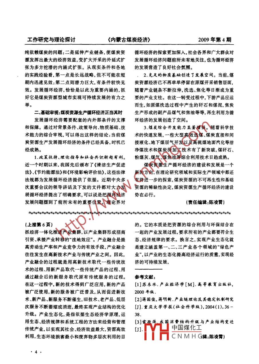 工作研究與理論探討<內蒙古煤炭經(jīng)濟>2009年第4期《工作研究與理論探討》煤炭生產(chǎn)與循環(huán)經(jīng)濟建設康海軍(神華集團煤炭運銷有限責任公司烏海辦事處, 內蒙古烏海 016000)摘要:煤炭作為國 民經(jīng)濟中重要的資源組成部分.其生產(chǎn)需要可循環(huán)經(jīng)濟的同步建設,以增強經(jīng)濟發(fā)展的可持續(xù)性。本文從意義、條件等方面對發(fā)展煤炭循環(huán)經(jīng)濟進行了深入的思考和探索。關鍵詞:循環(huán)經(jīng)濟;煤炭生產(chǎn)中圖分類號: F20S文獻標志碼:B文章編號:1008 - 0155(2009)05 - 0003 - 02所謂“循環(huán)經(jīng)濟”是指建立在對物質不斷進行建設節(jié)約型社會的戰(zhàn)略部署,是新形勢下的一個重循環(huán)利用基礎上的新型經(jīng)濟發(fā)展模式。其基本特大決策,其工作的重點是抓好能源、資源的節(jié)約。點是主導產(chǎn)業(yè)鏈條前后拉伸,實現(xiàn)閉合循環(huán)發(fā)展,當 前我國煤炭資源開采中的浪費現(xiàn)象十分嚴重,存遵循“減量化、再利用、再循環(huán)”三個原則。作為經(jīng)在采厚棄薄、采易棄難等問題,工藝粗放、加工層次濟發(fā)展的新模式,在發(fā)展循環(huán)經(jīng)濟的實踐中,不可淺,一些原本可以再深加工利用的煤炭產(chǎn)品廢棄嚴再生的特別是關系到國計民生的資源是重點,煤炭重,主要耗能設備設計效率平均低于國外先進水生產(chǎn)更是有其特殊性和緊迫性。平,遠遠不符合建設節(jié)約型社會的要求。-理論思考:加快發(fā)展煤炭資源生產(chǎn)循環(huán)經(jīng)3、從構建和諧社會的角度思考,發(fā)展煤炭循環(huán)濟在當前具有特殊意義經(jīng)濟有其特珠意義。建國初,受“有水快流"思想的1、從維護能源安全的角度思考,發(fā)展煤炭資源影響,煤炭資源型城市先生產(chǎn)建設、后污染治理帶生產(chǎn)的循環(huán)經(jīng)濟有其特殊意義。當前,能源安全問來的 后遺癥較為嚴重。粗放、不能循環(huán)利用的生產(chǎn)題已成為世界范圍內競爭和斗爭的焦點,也成為我方式造成大量廢棄物,對土地資源的破壞和占用,國經(jīng)濟能否持續(xù)健康發(fā)展的最大癥結和隱患。解對水資源的破壞和污染,對大氣環(huán)境的污染等日益決瓶頸制約、確保能源安全已成為黨和政府極為關嚴重,這既不符合入與自然和諧發(fā)展的要求,也不注和投入巨大精力破解的問題。在這一背景下,作.利于政治的安定、人心的穩(wěn)定、社會的和諧,需靠循為一次性能源主體的煤炭,怎樣對其實現(xiàn)科學利環(huán)經(jīng)濟來充分挖掘資源的利用潛能。用、合理利用、高效利用,是我們必須解決的難題。4、從煤炭資源城市可持續(xù)發(fā)展的角度思考,發(fā)而發(fā)展煤炭資源生產(chǎn)的循環(huán)經(jīng)濟,恰恰是科學、合展煤炭循環(huán)經(jīng)濟有其特殊意義。煤炭是不可再生理、高效利用煤炭的一把“金鑰匙",對于緩解我國資源,所有煤炭資源型城市都將面臨煤炭資源枯竭的能源壓力意義深遠。城市經(jīng)濟衰退的潛在威脅。因此,從長遠發(fā)展的角2、從建設節(jié)約型社會的角度思考,建設和發(fā)展度看,煤炭資源型城市必須高度重視兩個問題:一煤炭資源生產(chǎn)循環(huán)經(jīng)濟有其特殊意義。中央做出是不失時 機地發(fā)展非煤替代產(chǎn)業(yè),解決經(jīng)濟發(fā)展單中國煤化工收稿日期:2009-02-11作者簡介:康海軍(1971 - ),大學畢業(yè),中共黨員,現(xiàn)任神華集團YHCNMHG主任。.工作研究與理論探討<內蒙古煤炭經(jīng)濟>2009年第4期.純依賴煤炭的問題:二是延伸產(chǎn)業(yè)鏈條,使煤炭資循環(huán)經(jīng)濟的探索更加深入,社會各界和廣大群眾對源發(fā)揮出最大的經(jīng)濟效益,變擴大開采的外延式擴發(fā)展循環(huán)經(jīng)濟問題前所未有地關注,也為循環(huán)經(jīng)濟張為多方挖潛的內涵式擴張。從現(xiàn)實條件和各地的發(fā)展營造了良好杜會氛圍。的實踐經(jīng)驗看,第-點是長 遠戰(zhàn)略,但不可能在短2.充足的物質基礎創(chuàng)造了發(fā)展空間。當前,煤期內迅速見效:第二點則潛力巨大,有條件較快見炭資源經(jīng)濟已不再單單停留在原煤開采銷售層面,效。發(fā)展循環(huán)經(jīng)濟,恰恰是以此為重要內涵的,抓隨著產(chǎn)業(yè)鏈條不斷拉伸,洗選、焦化等日漸成為重好它是煤炭資源型城市實現(xiàn)可持續(xù)發(fā)展的有力之要的產(chǎn)業(yè)支柱。在這-轉變過程中,下游產(chǎn)品應運舉。而生,如原煤洗選過程中產(chǎn)生的矸石和煤泥,焦炭二、基礎審視:煤炭資源生產(chǎn)循環(huán)經(jīng)濟正當其時生產(chǎn)形成的副產(chǎn)品煤氣和焦油等等,再生利用為循發(fā)展循環(huán)經(jīng)濟需要配套的內外部條件的支撐環(huán)經(jīng)濟的發(fā)展創(chuàng)造了空間。和保障。通過對背景條件、政策導向、物質基礎、技3.煤炭綜合開發(fā)能力顯著增強。隨著科學技術能力的綜合審視,可以得出這樣的結論:當前煤術的快速發(fā)展,一些大型高效選煤、煤炭直接和間炭資源生產(chǎn)發(fā)展循環(huán)經(jīng)濟的條件已經(jīng)具備,時機已接液化、地下煤層氣開發(fā)以及高硫煤地面汽化等潔經(jīng)成熟。凈煤技術和煤炭深加工技術有了新突破,煤矸石、1.政策扶持、理論指導和社會共識漸趨有利。粉堞灰、煤
