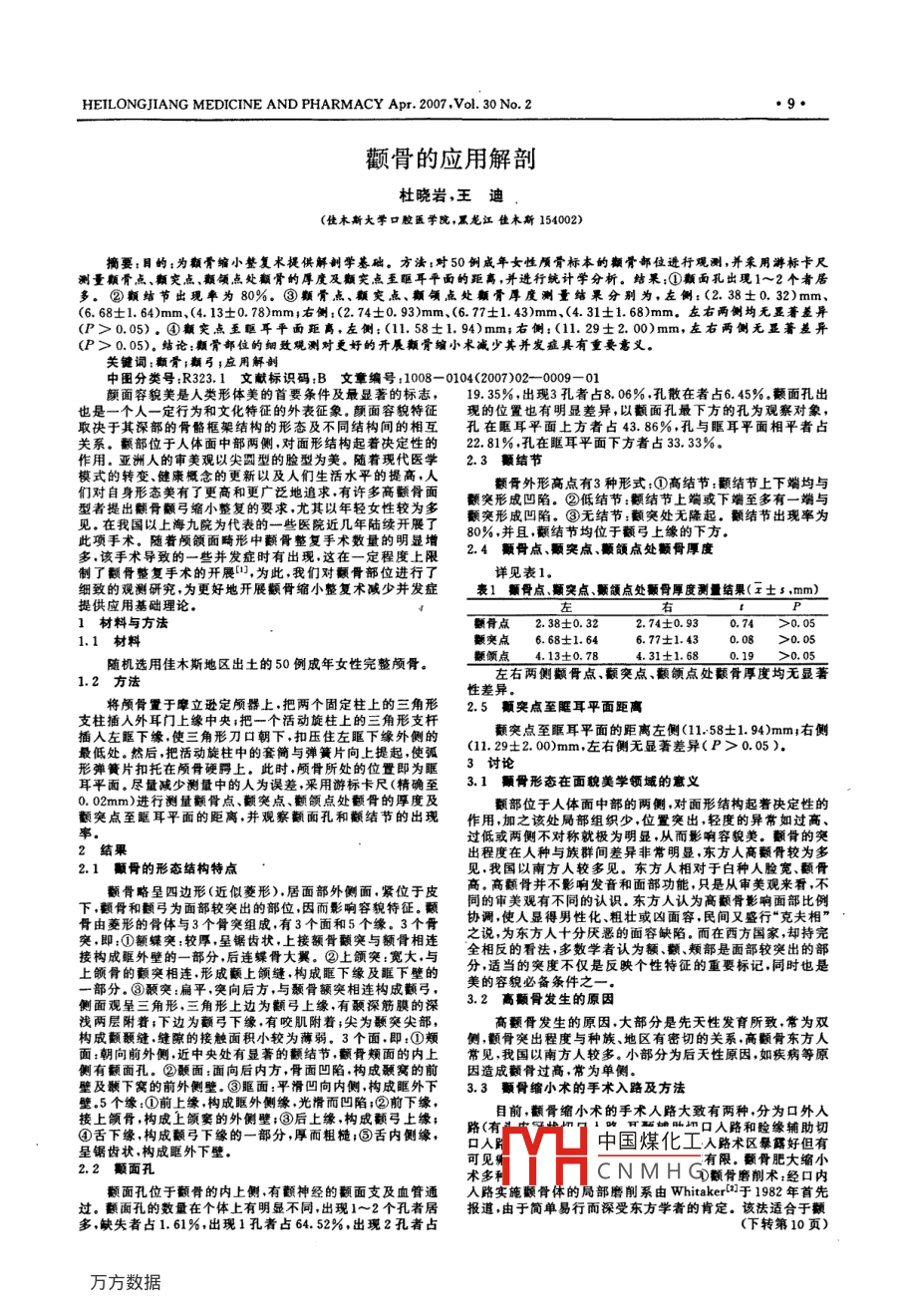 HEILONG JIANG MEDICINE AND PHARMACY Apr. 2007. Vol 30 No. 29顴骨的應用解剖杜曉巖,王迪(佳木斯大季口膠畫學院,黑龍江佳木斯154002)摘要:目的:為顴骨縮小整復術提供解剖學基礎。方瀆:對50例成年女性顱骨標本的瓤骨部位進行觀測,并采用游標卡尺測量顆骨點、顆突點、顆領點處顴骨的厚度及癲突點至眶耳平面的距高,并進行統(tǒng)計學分析。結果:①顆面孔出現(xiàn)1~2個者居多。②結節(jié)出現(xiàn)率為80%③顆骨點、顴突點、瓤領點處瓤骨厚度測量結果分別為左側:(2.38±0.32)mm(6.68士1.64)mm、(4.13±0.78)mm;右側:(2.74土0.93)mm、(6.77±1.43)mm、(4.31士1.68)mm,左右兩側均無顯著差異(P>0.05)。④瓤突點至眶耳平面距離,左側:(11.58士1.94)mm;右側:(11.29士2.00)mm,左右兩側無顯著差異(P>0.05)。結論:顆骨部位的細致觀測對更好的開展瓤骨編小術減少其并發(fā)癥具有重要意義。關鍵詞:顴骨;顆引;應用解剖中圖分類號:R323.1文獻標識碼:B文章編號:1008-0104(2007)02-0009-01顏面容貌美是人類形體美的首要條件及最顯著的標志,19.35%出現(xiàn)3孔者占8.06%孔散在者占6.45%顆面孔出也是一個人一定行為和文化特征的外表征象,顏面容貌特征現(xiàn)的位置也有明顯差異,以顴面孔最下方的孔為觀察對象,取決于其深部的骨骼框架結構的形態(tài)及不同結構間的相互孔在眶耳平面上方者占43.86%孔與眶耳平面相平者占關系。翻部位于人體面中部兩側,對面形結構起著決定性的22.81%孔在眶耳平面下方者占33.33%。作用.亞洲人的審美觀以尖圓型的臉型為美。隨著現(xiàn)代醫(yī)學2.3顆結節(jié)模式的轉變、健康概念的更新以及人們生活水平的提高,人們對自身形態(tài)美有了更高和更廣泛地追求,有許多高翻骨面顆骨外形高點有3種形式:①高結節(jié):顆額結節(jié)上下端均型者提出骨額弓縮小整復的要求,尤其以年輕女性較為多翻突形成凹陷,②低結節(jié)顆結節(jié)上端或下端至多有一端與見。在我國以上海九院為代表的一些醫(yī)院近幾年陸續(xù)開展了颥突形成凹陷。③無結節(jié):顴突處無隆起。結節(jié)出現(xiàn)率為此項手術。隨著顱頜面畸形中顴骨整復手術數(shù)量的明顯增0%并且,顴結節(jié)均位于額弓上緣的下方多該手術導致的一些并發(fā)癥時有出現(xiàn),這在一定程度上限24顳骨點顆突點顆頜點處顆骨厚度制了骨整復手術的開展,為此,我們對額骨部位進行了詳見表1細致的觀測研究,為更好地開展顴骨縮小整復術減少并發(fā)癥表顆骨點顆突點顆點處顆骨厚度測量結果(x土提供應用基礎理論1材料與方法題骨點2.38±0.322.74士0.930.74>0.051.1材料題突點6.68士1.646.77±1.430.080.05隨機選用佳木斯地區(qū)出土的50例成年女性完整顱骨題頜點13士0.784.31士1.680.19>01.2方法左右兩側額骨點、額突點、顴頜點處額骨厚度均無顯性差異將顱骨置于摩立遜定顱器上,把兩個固定柱上的三角形2.5顆突點至耳平面距離最低處,然后把活動旋柱中的套筒與彈簧片向上提起使弧(19:2.00m,左右側無顯著差異(P>005),爺衡插入左眶下緣,使三角形刀口朝下,扣壓住左眶下緣外側的顳突點至眶耳平面的距離左側(11.58士1.94)mm;右側耳平面,盡量減少測量中的人為誤差采用游標卡尺(精確至31顆骨形態(tài)在面貌美學領域的意義0.02mm)進行測量颥骨點、顴突點、翻頜點處顫骨的厚度及部位于人體面中部的兩側,對面形結構起著決定性的顫突點至眶耳平面的距離并觀察翻面孔和翻結節(jié)的出現(xiàn)作用,加之該處局部組織少,位置突出輕度的異常如過高過低或兩側不對稱就極為明顯,從而影響容貌美。顫骨的突2結果出程度在人種與族群間差異非常明顯,東方人高額骨較為多2.1顆骨的形態(tài)結構特點見,我國以南方人較多見。東方人相對于白種人臉寬、額骨額骨略呈四邊形(近似菱形),居面部外側面,緊位于皮高,高翻骨并不影響發(fā)音和面部功能,只是從審美觀來看,不下,顴骨和顴弓為面部較突出的部位,因而影響容貌特征。颥骨由菱形的骨體與3個骨突組成,有3個面和5個緣。3個骨協(xié)調,使人顯得男性化、粗壯或兇面容,民間又盛行“克夫相”突即:①額蝶突:較厚呈鋸齒狀,上接額骨突與額骨相連之說,為東方人十分厭惡的面容缺陷。而在西方國家卻持完接成外的部分,后連蠅骨大屬,但上突寬大,與分適當?shù)耐欢炔粌H是反映個性特征的重要標記,同時也是y鄱分,⑧突:扁平,突向后方,與顳骨額突相連構成顴弓,美的容貌必備條件之側面觀呈三角形,三角形上邊為翻弓上緣,有深筋膜的深32高顆骨發(fā)生的原因淺兩層附著;下邊為顴弓下緣,有咬肌附著;尖為顳突尖部高額骨發(fā)生的原因,大部分是先天性發(fā)育所致,常為雙構成颥顳縫,縫隙的接觸面積小較為薄弱。3個面,即:①頰側,顴骨突出程度與種族、地區(qū)有密切的關系,高顆骨東方人面:朝向前外側,近中央處有顯著的額結節(jié),顴骨頰面的內上常見,我國以南方人較多。小部分為后天性原因如疾病等原側有額面孔。②醺面:面向后內方,骨面凹陷,構成顳窩的前因造成額骨過高,常為單側壁及顳下窩的前外側壁,③眶面:平滑凹向內側構成眶外下3.3顆骨縮小術的手術入路及方法壁。5個緣:①前上緣,構成眶外側緣光滑而凹陷;②前下緣,樓上骨構成上額室的外側吧③后上構成副弓上續(xù)路(有目前,顴骨縮小術的手術人路大致有兩種,分為口外入呈鋸齒狀構成眶外下壁??谌胫袊夯と肼沸g區(