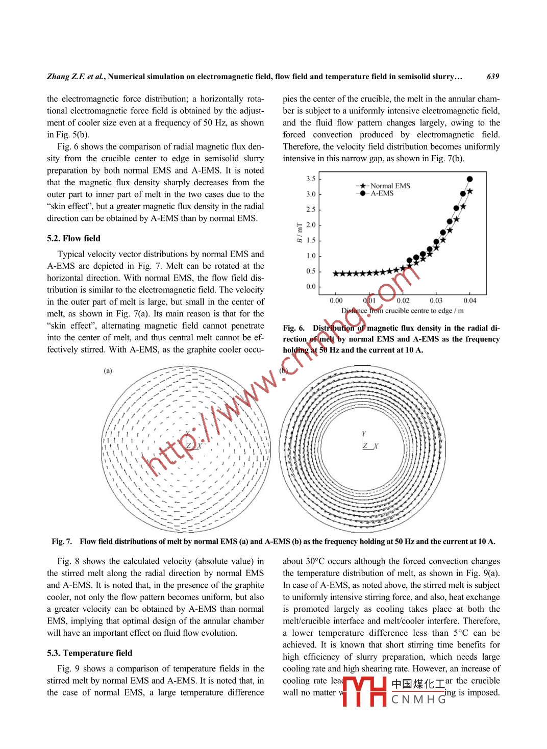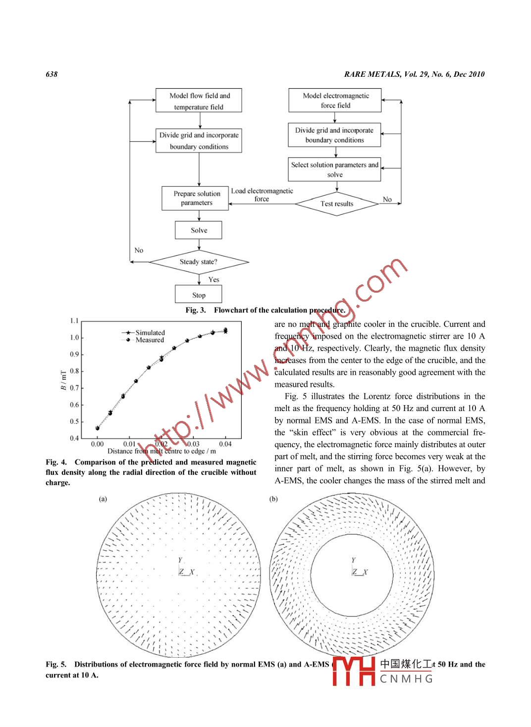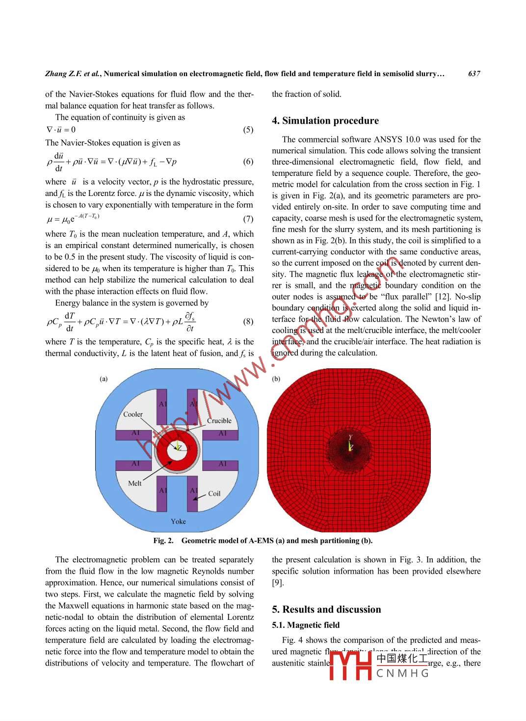 RARE METALSVol. 29, No.6, Dec 2010, p.635DOI: 10.1007/s 12598-010-0184-2Numerical simulation on electromagnetic field, flow field and temperaturefield in semisolid slurry preparation by A-EMSZHANG Zhifeng, CHEN Xingrun, XU Jun, and SHI LikaiNational Engineering & Technology Research Center for Nonferrous Metal Matrix Composites, General Research Instiute for Nonferrous Metals, Beijing 100088,ChinaReceived 2 November 2009; received in revised form 14 January 2010; accepted 28 January 2010◎The Nonferous Metals Society of China and Springer-Verlag Berlin Heidelberg 2010AbstractA two-dimensional computational model coupling an annular electromagnetic stiring (A-EMS) with a macroscopic heat and fluid flowanalysis in Al-alloys semisolid slurry preparation was developed. The dynamic evolutions of the electromagnetic field, flow field, and tem-perature field were presented sccesfully by commercial software ANSYS 10.0 with corresponding experimental verification. A horizon-tally rotational electromagnetic field and, thereby, a more intensive velocity field were uniformly distributed in the stired melt even at com-mercial frequency, and thus, a lower temperature difference in the strred melt and subsequent uniformly fine microstructures were obtainedcompared with the normal electromagnetic strring. The simulation resuts were in good agreement with experimental ones.Keywords: metal forming; electromagnetic stiring; numerical analysis; semisolid slury1. Introductionimportant to precisely control the solidification process.The purpose of the present study is to develop a compu-Electromagnetic stiring characterized by nonpollution,tational model coupling electromagnetic stiring with alow cost, and easy process control has been a main method macroscopic heat and fluid flow in semisolid slurry prepara-for producing Al-alloys semisolid slurry or billets [1-5]. tion by A-EMS. The effects of electromagnetic stiring onHowever, there still exist inhomogeneous microstructures inthe flow field and temperature field dstribution were inves-the semisolid billets especially large-sized ones due to thetigated with corresponding experimental verification.skin effect resulting from electromagnetic induction [6-7].Although a low strring frequency can be chosen to enhance2. Description of physical processesthe penetration depth of the alternating electromagnetic field,an additional conversion equipment leads to a lower shear-A schematic diagram of a typical semisolid slurry prepa-ing rate and an increase of slurry preparation cost. To solveprocess with A-EMS is ilustrated in Fig. 1. The su-the problem, an advanced semisolid metal slurry preparation perheat melt was poured in a crucible around which aprocess, namely, the annular electromagneticstiringhome-made electromagnetic stirrer consisting of yokes,(A-EMS) was developed, and an intensively forced shearingcores, and coils was set up. The yoke and core of the elec-could be achieved at a higher shear rate inside the annular tromagnetic system were made of silicon steel with highchamber at the commercial frequency by means of innova-permeability, and coils made of copper wire were installedtively combining noncontact electromagnetic stirring and anon the core, forming a pair of poles. The stirrer design en-annular chamber with specially designed profiles, and thus,tails the placement of the coils around the crucible to gener-more uniformly fine microstructures of Al-alloys slurryate a rotational motion along the horizontal direction. Thewere produced in comparison with normal EMS. Neverthe-crucible with an external radius of 90 mm, an internal radiusless, few quantitative studies have been carried out to pre-of 80 mm, and a height of 300 mm was made of austeniticsent the interactive effects of electromagnetic field, flowstainless steel. The coil size was 0.02 mx 0.14 m, the ex-field, and temperature field in the A-EMS process in spite of ternal size of the stirrer yoke was 0.32 m x 0.32 m, and thethe indisputable experimental results [8], which is virtuallyintermal size was 0.24 m X 024 m. The current intensity was中國(guó)煤化工Corresponding author: ZHANG ZhifengE-mail: zhangzf@grinm.comMHCNMH G.636R4RE METALS, Vol. 29, No.6, Dec 2010changed by the adjustment of AC voltage input employed inTable 1. Physical properties of materials used in the calcula-a range of 0-200 V and frequency input employed in a rangetionof 0-50 Hz. A graphite cooler was set in the center of thePhysical propertiescrucible, and thus, an annular chamber was designed inno-Liquidus temperature, TL/K 888vatively by adjusting the gap distance between the crucibleSolidus temperature, Ts/K 830wall and the cooler wall. Therefore, an intensively forcedDensity, ρ/ (g.cm 3)2680 (A357 alloy melt)shearing could be achieved at a higher shear rate by fullyThermal conductivity,taking advantage of the intensive magnetic field distribution522/(Wm-'.K)in the penetration depth.Specife heat, C/(J.kg-"K) 973φ90 mmViscosity cofficient, pμo/3.0x 10-3φ80mm(kg:ml:s)1 (copper coil)φ40 mm2000 (ilicon steel)Relative permeabilty, φ8 (A357 aloy melt)1 (cooling graphite cooler)1 (austenitic stainless steel)1.5 x 10-7 (copper coi),0 (silicon steel)Elctrical rsistivity,,2.1 x 10-7 (A357 alloy melt)(Q:m)8.0x 10(cooling graphite cooler)1.45 x 10%(austenitic stainless ste)500 (melt/crucible)Interfacial heat transfer50 (crucible/air)十5coefficient, h/ (W.m-2.K- ')1000 (melt/cooler)our electromagnetic system and heat flow in the radial direc-Fig. 1. Schematic view of semisolid metal slurry preparationtion [9] The laminar model is adopted in the present studyapparatus by A-EMS. 1: crucible; 2: electromagnetic strrer; 3:because of the small Reynold's number of fluid flow in themelt; 4: graphite cooler; 5: insulation kaowool.slurry preparation system. The effects of thermal or solutalThe commercial A357 aluminum alloy was used in thisbuoyancy forces are relatively small and can be neglected.study. The melt with a temperat