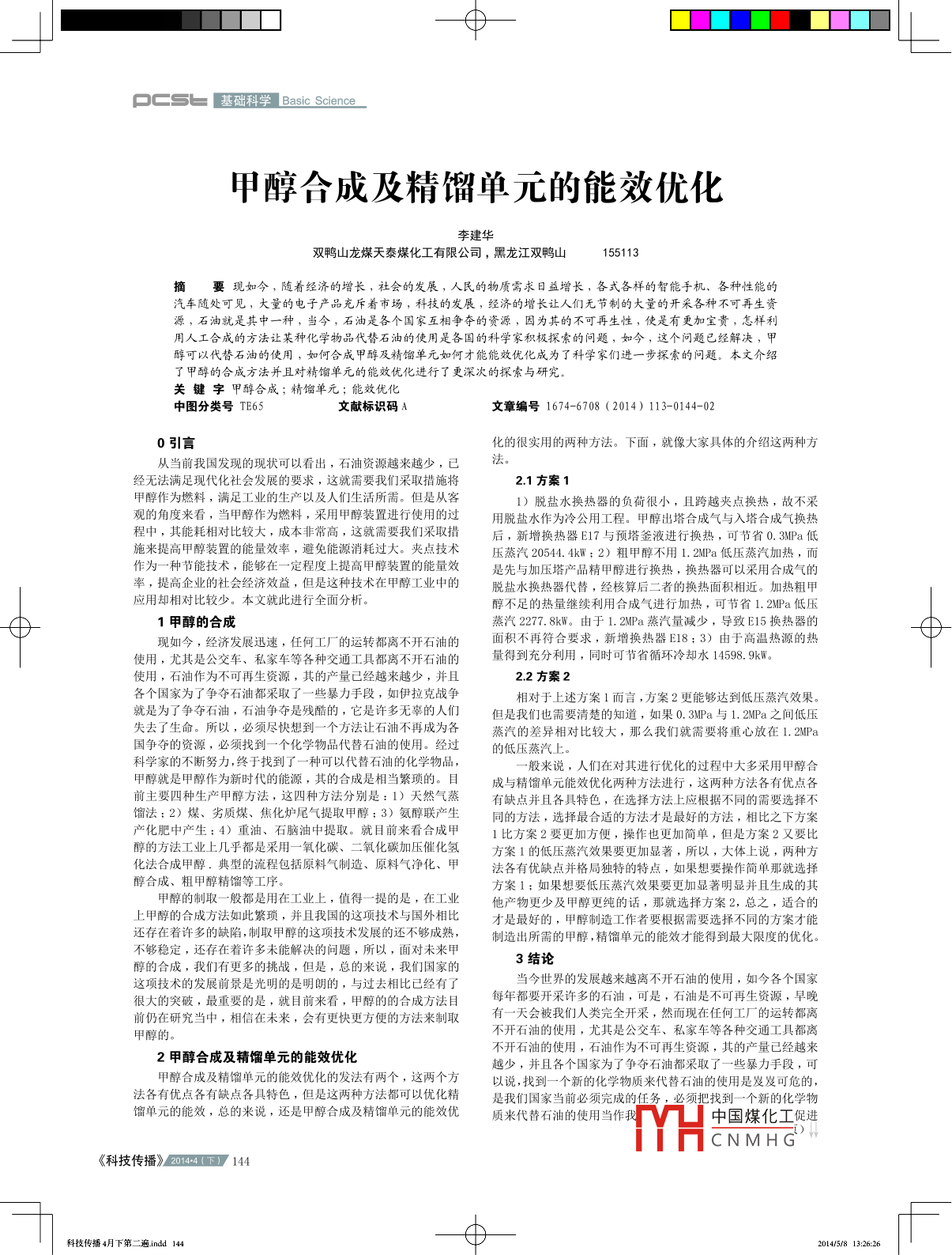 口cs□【基礎(chǔ)科學(xué) Basic Science甲醇合成及精餾單元的能效優(yōu)化李建華雙鴨山龍煤天泰煤化工有限公司,黑龍江雙鴨山155113摘要現(xiàn)如今,隨著經(jīng)濟的增長,社會的發(fā)展,人民的物質(zhì)需求日益增長,各式各樣的智能手機、各種性能的汽車隨處可見,大量的電子產(chǎn)品充斥著市場,科技的發(fā)展,經(jīng)濟的増長讓人們無節(jié)制的大量的開采各種不可再生資源,石油就是其中一種,當(dāng)今,石油是各個囯家互相爭奪的資源,因為其的不可再生性,使是有更加寶貴,怎樣利用人工合成的方法讓某種化學(xué)物品代替石油的使用是各國的科學(xué)家積極探索的問題,如今,這個問題已經(jīng)解決,甲醇可以代替石油的使用,如何合成甲醇及精餾單元如何才能能效優(yōu)化成為了科學(xué)家們進(jìn)一步探索的問題。本文介紹了甲醇的合成方法并且對精餾單元的能效優(yōu)化進(jìn)行了更深次的探索與研究關(guān)鍵字甲醇合成;精餾單元;能效優(yōu)化中圖分類號TE65文獻(xiàn)標(biāo)識碼A文章編號1674-6708(2014)113-0144-020引言化的很實用的兩種方法。下面,就像大家具體的介紹這兩種方從當(dāng)前我國發(fā)現(xiàn)的現(xiàn)狀可以看出,石油資源越來越少,已經(jīng)無法滿足現(xiàn)代化社會發(fā)展的要求,這就需要我們采取措施將21方案1甲醇作為燃料,滿足工業(yè)的生產(chǎn)以及人們生活所需。但是從客1)脫鹽水換熱器的負(fù)荷很小,且跨越夾點換熱,故不采觀的角度來看,當(dāng)甲醇作為燃料,采用甲醇裝置進(jìn)行使用的過用脫鹽水作為冷公用工程。甲醇出塔合成氣與入塔合成氣換熱程中,其能耗相對比較大,成本非常高,這就需要我們采取措施來提高甲醇裝置的能量效率,避免能源消耗過大。夾點技術(shù)壓蒸汽20544kW:2)粗甲醇不用1.2MPa低壓蒸汽加熱,而作為一種節(jié)能技術(shù),能夠在一定程度上提高甲醇裝置的能量效是先與加壓塔產(chǎn)品精甲醇進(jìn)行換熱,換熱器可以采用合成氣的率,提高企業(yè)的社會經(jīng)濟效益,但是這種技術(shù)在甲醇工業(yè)中的脫鹽水換熱器代替,經(jīng)核算后二者的換熱面積相近。加熱粗甲應(yīng)用卻相對比較少。本文就此進(jìn)行全面分析醇不足的熱量繼續(xù)利用合成氣進(jìn)行加熱,可節(jié)省1.2Pa低壓1甲醇的合成蒸汽2277.8kW。由于1.2wPa蒸汽量減少,導(dǎo)致E15換熱器的現(xiàn)如今,經(jīng)濟發(fā)展迅速,任何工廠的運轉(zhuǎn)都離不開石油的面積不再符合要求,新增換熱器E18:3)由于高溫?zé)嵩吹臒崾褂?尤其是公交車、私家車等各種交通工具都離不開石油的量得到充分利用,同時可節(jié)省循環(huán)冷卻水14598.9kW使用,石油作為不可再生資源,其的產(chǎn)量己經(jīng)越來越少,并且22方案2各個國家為了爭奪石油都采取了一些暴力手段,如伊拉克戰(zhàn)爭相對于上述方案1而言,方案2更能夠達(dá)到低壓蒸汽效果就是為了爭奪石油,石油爭奪是殘酷的,它是許多無辜的人們但是我們也需要清楚的知道,如果0.3Pa與1.2Ma之間低壓失去了生命。所以,必須盡快想到一個方法讓石油不再成為各蒸汽的差異相對比較大,那么我們就需要將重心放在1.2Pa國爭奪的資源,必須找到一個化學(xué)物品代替石油的使用。經(jīng)過的低壓蒸汽上科學(xué)家的不斷努力,終于找到了一種可以代替石油的化學(xué)物品般來說,人們在對其進(jìn)行優(yōu)化的過程中大多采用甲醇合甲醇就是甲醇作為新時代的能源,其的合成是相當(dāng)繁瑣的。目成與精餾單元能效優(yōu)化兩種方法進(jìn)行,這兩種方法各有優(yōu)點各前主要四種生產(chǎn)甲醇方法,這四種方法分別是:1)天然氣蒸有缺點并且各具特色,在選擇方法上應(yīng)根據(jù)不同的需要選擇不餾法:2)煤、劣質(zhì)煤、焦化爐尾氣提取甲醇:3)氨醇聯(lián)產(chǎn)生同的方法,選擇最合適的方法才是最好的方法,相比之下方案產(chǎn)化肥中產(chǎn)生:4)重油、石腦油中提取。就目前來看合成甲1比方案2要更加方便,操作也更加簡單,但是方案2又要比醇的方法工業(yè)上幾乎都是采用一氧化碳、二氧化碳加壓催化氫方案1的低壓蒸汽效果要更加顯著,所以,大體上說,兩種方化法合成甲醇·典型的流程包括原料氣制造、原料氣諍化、甲法各有優(yōu)缺點并格局獨特的特點,如果想要操作簡單那就選擇醇合成、粗甲醇精餾等工序方案1;如果想要低壓蒸汽效果要更加顯著明顯并且生成的其甲醇的制取一般都是用在工業(yè)上,值得一提的是,在工業(yè)也產(chǎn)物更少及甲醇更純的話,那就選擇方案2,總之,適合的上甲醇的合成方法如此繁瑣,并且我國的這項技術(shù)與國外相比才是最好的,甲醇制造工作者要根據(jù)需要選擇不同的方案才能還存在著許多的缺陷,制取甲醇的這項技術(shù)發(fā)展的還不夠成熟制造出所需的甲醇,精餾單元的能效才能得到最大限度的優(yōu)化不夠穩(wěn)定,還存在著許多未能解決的問題,所以,面對未來甲醇的合成,我們有更多的挑戰(zhàn),但是,總的來說,我們國家的3結(jié)論這項技術(shù)的發(fā)展前景是光明的是明朗的,與過去相比已經(jīng)有了當(dāng)今世界的發(fā)展越來越離不開石油的使用,如今各個國家很大的突破,最重要的是,就目前來看,甲醇的的合成方法目每年都要開采許多的石油,可是,石油是不可再生資源,早晚前仍在研究當