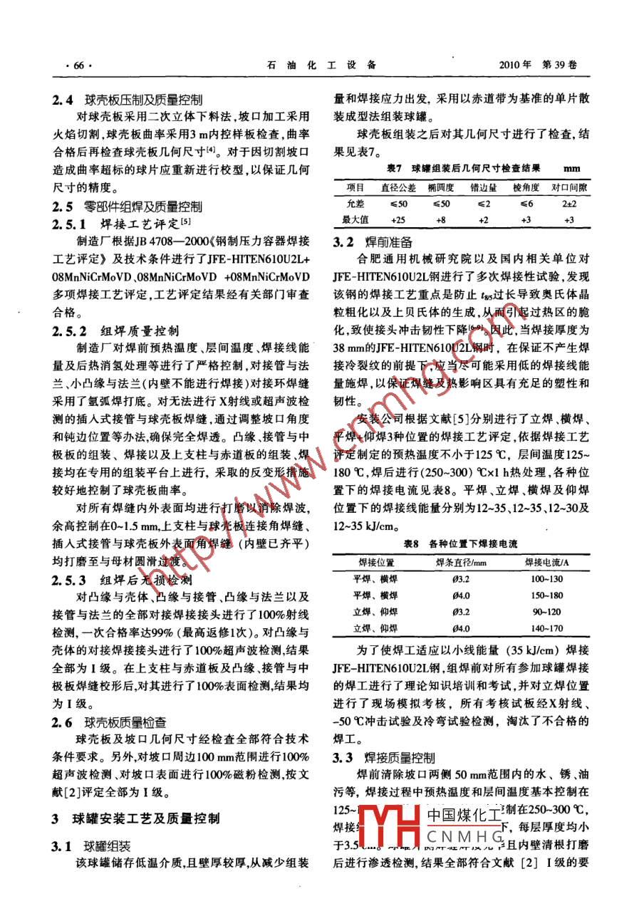 第39卷第3期石油化工設(shè)備Vol.39 No.32010年5月PETRO-CHEMICAL EQUIPMENTMay 2010文章編號: 1000-7466 (2010) 03-0064-042000m3乙烯球罐建造張一任',全春華2,王勇2(1.合肥通用機械研究院,安徽合肥230088;2.中國石油獨山子石化公司,新疆獨山子833600)摘要:介紹了某2000m乙烯球罐的技術(shù)特點、制造工藝及質(zhì)量要求,在球罐建造過程中對其安裝工藝及質(zhì)量進行了嚴格控制,制造的球罐整體質(zhì)量良好,各項指標達到了較高水平。關(guān)鍵詞:球罐;乙烯;技術(shù)指標:建造中圖分類號: TE 972文獻標志碼: BFabrication of 2 000 m3 Ethylene Spherical TankZHANG Yi-ren', QUAN Chun-hua', WANG Yong(1.Hefei General Mechanical Research Institute, Hefei 230088, China;2.CNPC Dushanzi Petrochemical Company, Dushanzi 833600, China)Abstract:The technical specification, process and quality requirement of 2 000 m3 ethylene sphericaltank were introduced. A strict installation procedure and quality were controlled. The entire sphericaltank was good in quality and all items reached high level.Key words: spherical tank; ethylene; technical index; fabrication2006年某單位在化工裝置全壓力罐區(qū)建造了1.2承壓部件12臺乙烯球罐,這些球罐體積均為2000 mr',內(nèi)直徑承壓部件采用08MnNiCrMoVD鍛件,人孔、凸緣15.7 m。球殼板材質(zhì)為JFE-HITEN610U2L鋼板,壁厚及進出口接管鍛件級別為IV級,其余鍛件級別為I38 mm。球罐設(shè)計溫度- 45 C,設(shè)計壓力1.90 MPa,采級,其-50 C的Axv(平均值)≥60J。用分析設(shè)計法設(shè)計。文中對該球罐的建造情況進行1.3焊接簡要介紹。球罐主體焊接采用LB-65L焊條,其-50 C的Axv(平均值)≥60J。1球罐技術(shù)指標球罐焊接時應(yīng)嚴格控制焊接線能量不大于1.1球殼用鋼板35 kJ/cm,球罐整體熱處理工藝評定試板熱處理規(guī)球殼用JFE-HITEN610U2L鋼板的化學成分(熔范為(570+15) Cx2 h。焊接工藝評定和產(chǎn)品試板焊煉分析)在滿足GB 19189- -2003《壓 力容器用調(diào)質(zhì)縫、熱影響區(qū)的-45 C的Axv(平均值)≥47J。高強度鋼板>的前提下",還應(yīng)保證w(P)≤0.015%、1.4無損檢測w(S)≤0.005%。鋼板-50 C低溫沖擊功Axv平均制造和安裝時需按文獻[2]對球罐進行無損檢值應(yīng)不小于80J。鋼板應(yīng)逐張按JB/T 4730- -2005測,檢驗率均比GB 12337- -1998 《鋼制球形儲罐》《承壓設(shè)備無損檢測》進行超聲波檢測及復(fù)驗2,的要求有較大幅度的提高B)。100%達到I級。對凸緣與殼體、凸緣與法蘭的對接焊縫,除進.中國煤化工收稿日期: 2010-01-10YHCNMHG作者簡介:張一任(1955-),男, 安徽合肥人,教授級高級工程師,學士,長期從事壓力容器用鋼研究、設(shè)備建造及設(shè)備監(jiān)理工作。第3期張一任,等:2000m'乙烯球罐建造,65●行100%X射線檢測( I級為合格)外,對凸緣與殼體球罐球殼板幾何尺寸(除坡口外)以及球罐安的對接焊縫還應(yīng)進行100%超聲波檢測(I級為合裝幾何尺寸允差均比文獻[3]的要求有所提高。格)。球罐主體對接焊縫熱處理前除進行100%X射2球罐制造工藝及質(zhì)量要求線檢測(I級為合格)外,還要求進行100%超聲波檢測(I級為合格)。球罐整體熱處理前后以及水壓試2.1 JFE-HITEN610U2L鋼板驗收及復(fù)驗驗后,應(yīng)分別對球殼板上所有焊縫及其工卡具清除制造單位對12臺球罐共408張JFE-HITEN后焊跡等部位進行100%表面檢測( I級為合格)。610U2L鋼板進行了復(fù)驗,復(fù)驗結(jié)果為,鋼板的超聲球罐水壓試驗后,對主體對接焊縫進行100%超聲波波檢測均達到I級標準,元素S、P質(zhì)量分數(shù)均在要檢測( I級為合格)。求范圍之內(nèi),-50C低溫沖擊功遠高于要求值80J,1.5球罐幾何尺寸各項指標均符合表1和表2的規(guī)定。表1 JFE-HITEN610U2L鋼板化學成分 (熔煉分析)技術(shù)要求%元素SMnNiMNP Pg質(zhì)景分數(shù)≤0.090.15-0.40 1.00-1.60 ≤0.015 ≤0.005 0.30-0.60 ≤0.30 ≤0.30 ≤0.06 ≤0.03 ≤0.20 ≤0注: P=w(C)+tw(Si )/30+wo( Mn )/20+w(Ca )/20+w0(N )60++(>)/20+u(Mo)/I5+w(V )/10+5w(B)Pox=w(r)+w(Cu)+2w(Mo)+10w(V)+7@(Nb>+5w(T)-2表2 JFE-HITEN610U2L鋼板力 學性能技術(shù)要求拉伸試驗沖擊試驗冷彎試驗交貨狀態(tài)回火板厚/mm取樣方向及 部位試驗Ax平均Av單 個溫度/心RJMPaRs/MPaA1%b=2a,180溫度/C值/J調(diào)質(zhì)≥6102或38 橫向14、板厚114 610-730≥490≥19-50≥80≥64d=3a2. 208MnNiCrMoVD鍛件復(fù)驗成分技術(shù)要求值和力學性能技術(shù)要求值分別見表3該乙烯球罐承壓部件所采用的08MnNiCrMoVD和表4。復(fù)驗結(jié)果表明鍛件各項指標均高于其技術(shù)鍛件是由無錫法蘭鍛件廠生產(chǎn)的,該鍛件的化學要求。費3 08MnNiCrMoVD鍛件化學成分 (熔煉分析) 技術(shù)要求PViC4ovcm質(zhì)量分數(shù)≤0.100.20-0.40 1.10-1.40≤0.015≤0.010 1.35-1.60 0.20-0.60 0.20-0.50 0.02-0.06 ≤0.25≤0.25注: P_=w (C)加(Si) /30+w (Mn) /20+wu (Cu) /20+w (Ni) 160+wo (C2) 20+wo (Mo) /15+uo (M /10+5w (B)表408MnNiCrMoVD鍛 件力學性能技術(shù)要求取樣方向公稱Axv平均Ax單個溫度/心C厚度/mmRsMPa溫度心C .切向、軸向或徑向≤300600-770≥480≥l≥60≥422.3 LB-65L焊條復(fù)驗如表5和表6中所列出的規(guī)定。焊條經(jīng)400 Cx1 h烘干乙烯球罐主體焊接采用與JFE-HTTEN610U2L后以色譜法測定的焊條熔敷金屬擴散氫含量[H]≤材質(zhì)相配套的LB-65L焊條。經(jīng)過復(fù)驗,LB-65L焊條0.05 mLg。熔敷金屬的化學成分及力學性能(SR狀態(tài))分別符合表6 LB-65L焊條熔敷金屬力學性能技術(shù)要求表5 LB-65L焊 條熔敷金屬化學成分技術(shù)要求%-50C沖 擊試驗元隸CSiMnPSNli B中國煤化工,