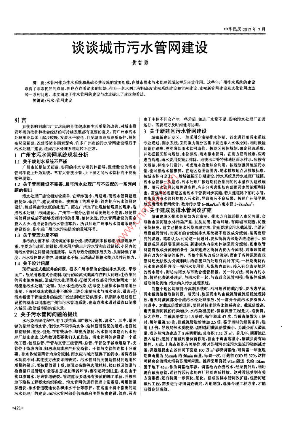 中華民居2012年7月談?wù)劤鞘形鬯芫W(wǎng)建設(shè)黃智勇摘要:水管網(wǎng)作為摔水系統(tǒng)和基砒公共設(shè)施的重要組成,在城市排水與水處理領(lǐng)域起舉足輕重作用。這些年廣州排水系統(tǒng)的建設(shè)取得了非常優(yōu)異的成績(jī)但也存在著諸多的短缺、作為一名水利工程因高度重視系統(tǒng)建設(shè)和官網(wǎng)建設(shè)、重視新管網(wǎng)建設(shè)及老化管網(wǎng)改造等一系列問(wèn)題。本文闡述了排水管網(wǎng)的建設(shè)與改造提出了建議和看法關(guān)鍵詞:污水;管網(wǎng)建設(shè)引言由于主體不同會(huì)產(chǎn)生一些矛盾,如進(jìn)廠水量不足、影響污水處理廠正常直接影響到城市廣大居民的身體健康和生活質(zhì)量的改善,對(duì)城市投|運(yùn)行;需要雙方及時(shí)溝通與協(xié)調(diào)資環(huán)境的改善和社會(huì)經(jīng)濟(jì)的可持續(xù)發(fā)展都有重要的意義,而廣州市污水|3關(guān)于新建區(qū)污水管網(wǎng)建設(shè)處理事業(yè)總體上起步較晚,發(fā)展水平較低,且受城市地形地質(zhì)條件、規(guī)劃城鎮(zhèn)新建開(kāi)發(fā)區(qū),一般采用分流制排水體制。首先進(jìn)行雨污水系統(tǒng)布局及新建、改建等諸多因素影響許多廣州市的污水管網(wǎng)建設(shè)滯后于專業(yè)規(guī)劃雨水系統(tǒng):采用重力流分區(qū)集中就近排入水體原則利用低洼污水處理廠建設(shè)造成污水處理系統(tǒng)運(yùn)轉(zhuǎn)不正常。地蕃存避峰,更能降低雨水管網(wǎng)造價(jià)。按地區(qū)總體規(guī)劃,確定徑流系數(shù)廣州市污水管網(wǎng)系統(tǒng)現(xiàn)狀分析并依據(jù)新區(qū)豎向規(guī)劃、水位標(biāo)高,雨水排水管網(wǎng)。在南方沿海城市應(yīng)考1.1關(guān)于規(guī)劃水系統(tǒng)不嚴(yán)謹(jǐn)慮當(dāng)高潮、雨水要用泵提后排除,地鐵出口等特殊地區(qū)雨水排水應(yīng)按有廣州市長(zhǎng)期缺乏超前實(shí)用的排水專項(xiàng)具體指導(dǎo)致使敷設(shè)的污水關(guān)規(guī)范標(biāo)準(zhǔn)專門(mén)設(shè)計(jì),考慮雨水收集綜合利用,按規(guī)劃推算地區(qū)污水管網(wǎng)不能上升為系統(tǒng),常有大管小管上下游之間污水管標(biāo)高不能銜最可按給水量推算,在地區(qū)總圖范圍內(nèi)尾水排放地點(diǎn)及排放標(biāo)準(zhǔn)按城市豎向設(shè)計(jì)。一般城鎮(zhèn)新區(qū)分期建設(shè),污水系統(tǒng)及污水處理廠規(guī)模12關(guān)于管網(wǎng)建設(shè)不完善且與污水處理廠與不匹配的一系列問(wèn)污水總管擬次建成污水處理技近期酰收集到的污水量作為建設(shè)規(guī)題的指出污水處理廠建設(shè)相對(duì)較簡(jiǎn)單它牽涉面小周期短,而污水管網(wǎng)建設(shè)出,需強(qiáng)調(diào)的是新建區(qū)雨污水干管要同步實(shí)施若只建道路下的污水管,則街坊內(nèi)雨水管只能接入污水管,導(dǎo)致雨污不良后果。按照廣州等平原較復(fù)雜牽涉廣設(shè)周期長(zhǎng),按照施工的順序是:首先把應(yīng)污水管網(wǎng)建|地區(qū)污水管網(wǎng)統(tǒng)計(jì)數(shù)為污水管6mA南水管5m成污水處理廠形同虛設(shè),廣州市一些分區(qū)管網(wǎng)系統(tǒng)規(guī)劃不完善致使排4關(guān)于建成區(qū)排水管網(wǎng)改擴(kuò)建污管網(wǎng)建成后不能夠發(fā)揮拌污的作用整體來(lái)說(shuō),污水管網(wǎng)建設(shè)的資金城鎮(zhèn)建成區(qū)排水體制如為合流制,排水方向就近排入市區(qū)河道會(huì)投入太少造成設(shè)備的污水管道落后。所以加地廣州市污水管道系統(tǒng)的導(dǎo)致市區(qū)河道水體污染嚴(yán)重發(fā)臭發(fā)黑影響環(huán)境有礙城市觀牌問(wèn)題建設(shè)資金,是今后廣州市水污染防治的重視環(huán)節(jié)。亟待解決。前文已提出水污染治理方法,首先要埋設(shè)污水截流管,當(dāng)沿河13關(guān)于管理力度不夠埋設(shè)截污管時(shí),對(duì)原有的合流制排水系統(tǒng)要不要改成分流制,是需要研排污的力度不夠該分流的未按分流或該截流末按截流亂接現(xiàn)象嚴(yán)究的課題,筆者認(rèn)為討論這一問(wèn)題時(shí)要從街坊內(nèi)部是否改造著手。如重主要為市政雨的錯(cuò)接排水用戶的出戶污水管和市政錯(cuò)接,小區(qū)內(nèi)的果建成區(qū)某區(qū)要重新布局新建街坊內(nèi)排水體制采用分流制則市政管雨污水管到之問(wèn)錯(cuò)誤的連接等,從而導(dǎo)致分流制系統(tǒng)失效,從而降低了濃網(wǎng)就有改成分流制的條件如果建成區(qū)街坊內(nèi)仍為合液制則市政管道度,污水阿缺乏維護(hù),造成輸水不,無(wú)法滿足原輸水能力及排污能力沒(méi)有改為分流制的條件當(dāng)整個(gè)傷坊改成分流制而由于各種原因市政14關(guān)于設(shè)計(jì)問(wèn)題現(xiàn)行溢流式截流井的問(wèn)題很多廣州市都為合流制排水系統(tǒng)牽涉污水出路采用埋沒(méi)一根污水專用管,從街坊內(nèi)部起接入有分流制地區(qū)的污水管中,街坊內(nèi)雨水與市政合流管相接。另一種方法,街坊內(nèi)污水故采用截流式合流制現(xiàn)行的滋流式截流存在囚大問(wèn)題0收集到管,哲經(jīng)化糞池處理后與雨水管一起與市政合流管相接特條件成熟水濃度偏低,造成污水處理困難;②雨天時(shí)僅部分污水和雨水一起混流至污水處理廠處理,對(duì)水體渣成