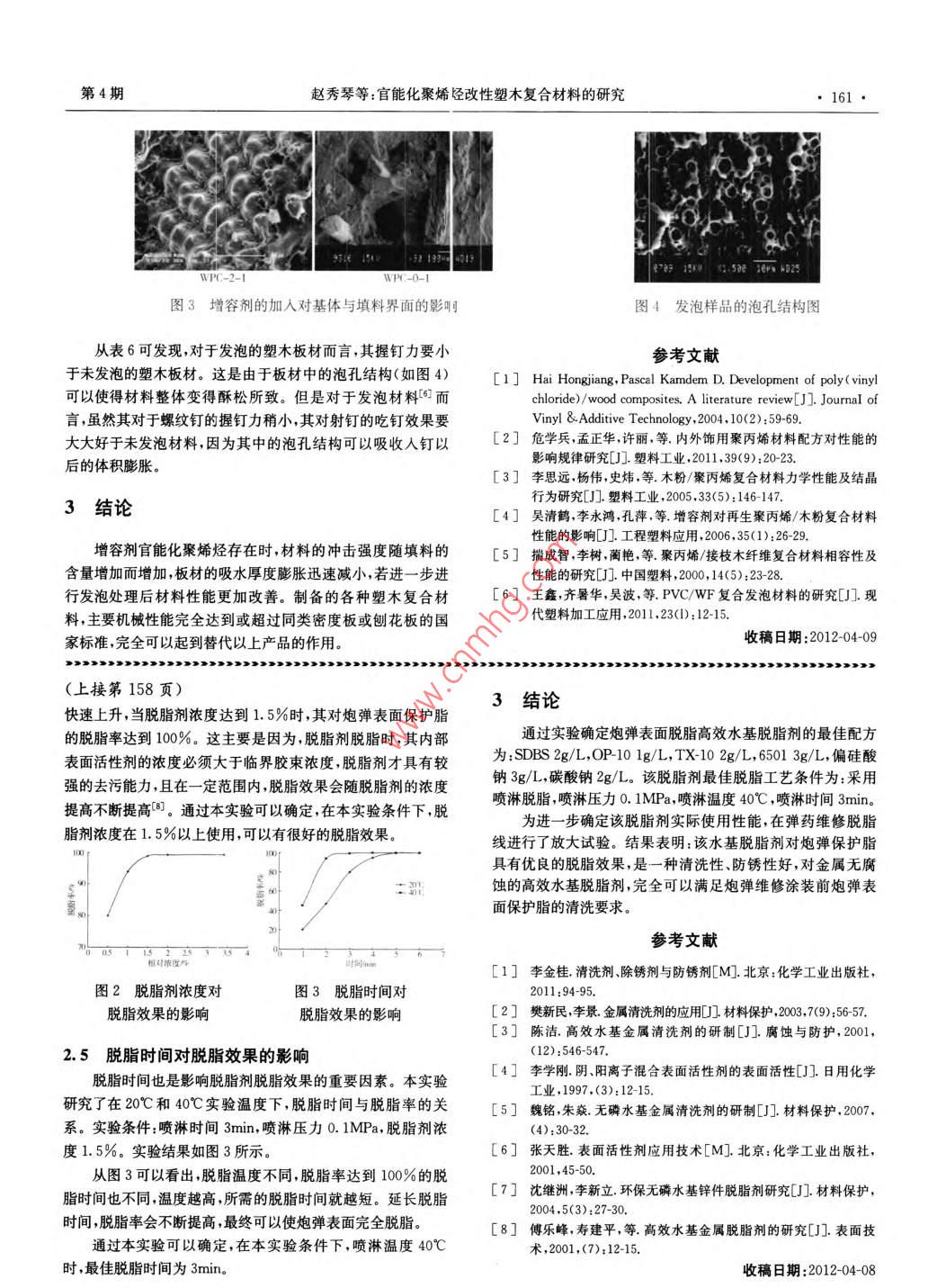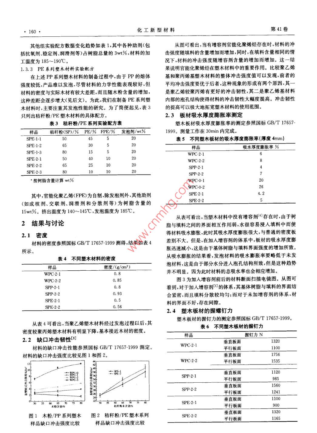 第41卷第4期化工新型材料Vol. 41 No. 42013年4月NEW CHEN ICAL MATERIALS●159●官能化聚烯烴改性塑木復(fù)合材料的研究趙秀滲向乾坤(武漢生物工程學(xué)院化學(xué)與環(huán)境工程系,武漢430415)摘要采用官能化的聚烯烴樹(shù)脂代替?zhèn)鹘y(tǒng)的未改生的聚烯烴樹(shù)脂,提高了基體樹(shù)脂的流動(dòng)性和樹(shù)脂與木粉之間的界面粘結(jié)。從而增強(qiáng)了塑木復(fù)合材料的性能。結(jié)果表明該材料的性能指標(biāo)可以通過(guò)調(diào)整官能化聚烯烴的種類(lèi)(如PE.PP等)和含量而方便調(diào)節(jié)。關(guān)鍵詞官能化聚烯烴,塑木復(fù)合材料,改性Research of function:alized polyolefin modifiedplastic wood composite materialsZhao Xiuqir Xiang Qiankun(Department of Chemistry and Environmeng Engineering, Wuhan Bioengineering Institute , Wuhan 430415 )Abstract Using functionalized polyolefin resin ins ead of the conventional unmodified polyolefin resin, while impro-ving the fluidity of matrix resin and the adhesion at the in erface between resin and wood flour ,thereby enhancing the per-formance of wood piastic composites. The results showed that the properties of the material can be conveniently adjusted byregulation of functionalized polyolefin species ( such as PI, PP etc. )and content.Key words functionalized polyolefin, wood plastic composite,modification塑木復(fù)合材料(WPC)是由天然纖維與合成樹(shù)脂構(gòu)成的復(fù)1.3.1木粉/PP 系列塑木材料實(shí)驗(yàn)配方合材料,是環(huán)保材料”。傳統(tǒng)的提高植物纖維在樹(shù)脂中分散實(shí)驗(yàn)樣品編號(hào)及配方(2]見(jiàn)表1(為質(zhì)量比)。性的方法是在共混前對(duì)植物纖維進(jìn)行絲光處理或者使用耦聯(lián)表1木粉/PP 系列實(shí)驗(yàn)配方表劑進(jìn)行耦合。雖然這些方法可以一定程度上促進(jìn)其與樹(shù)脂的樣品木粉/9PP/%FPP/%相容性,增加其分散度,從而提高塑木產(chǎn)品的力學(xué)性能,但是WPC-1-150455WPC-1-255存在操作復(fù)雜、生產(chǎn)成本提高等問(wèn)題。針對(duì)這些問(wèn)題,本研究WPC-1-315采用了提高樹(shù)脂極性和加工流動(dòng)性的方法,解決了植物纖維WPC-2-101與基體樹(shù)脂之間的界面粘合問(wèn)題,同時(shí)解決了植物纖維在加WPC-2-225工過(guò)程中的分散問(wèn)題,而這一技術(shù)的關(guān)鍵就在于基體樹(shù)脂的官能化。WPC-3-1WPC-3-21實(shí)驗(yàn)部分2.WPC-4-1101.1 主要原材料WPC-4-2官能化聚丙烯(FPP)、官能化聚乙烯(FPE)均為實(shí)驗(yàn)室自制;木粉(鋸末):粒徑0. 25 ~0.35mm,武漢市木材加工廠;WPC-0-1WPC-0-2PP. PE及其它加工助劑:市售。WPC-0-3.20_c1.2 主要設(shè)備與儀器高速混合機(jī): SHR-50A,江蘇貝爾機(jī)械有限公司;同向平1.3.2秸稈粉/PP 系列塑木材料實(shí)驗(yàn)配方行雙螺桿造粒機(jī)組:SHJ-35型,廣州華新科機(jī)械有限公司;沖實(shí)驗(yàn)樣品編號(hào)及配方見(jiàn)表2(為質(zhì)量比)。擊試驗(yàn)機(jī): HIT 50,德國(guó)Zwick/Roell集團(tuán);維卡熱變形測(cè)試表2秸稈粉/PP 系列實(shí)驗(yàn)配方表儀:ZWK1000,MTS工業(yè)系統(tǒng)(中國(guó))有限公司;掃描電子顯微秸稈粉(SP)/%P/%鏡(SEM)(XL-30 FEG型):荷蘭Philips公司。1.3實(shí)驗(yàn)配方及過(guò)程SPP-1-26530實(shí)驗(yàn)過(guò)程:高速混料- +熔融擠出造?!鷫喊?性能測(cè)試。SPP-1-3基金項(xiàng)目:武漢市科研項(xiàng)目(2010093)作者簡(jiǎn)介;趙秀琴(1979- ),女,碩士,講師.主要從事復(fù)合材料研究。.●160●化工新型材料第41卷其他組實(shí)驗(yàn)配方數(shù)據(jù)變化趨勢(shì)如表1,其中各種助劑(包從圖可看出,當(dāng)有增容劑官能化聚烯烴存在時(shí),材料的沖括抗氧劑、穩(wěn)定劑潤(rùn)滑劑等)占樹(shù)脂總量的3wt%,材料的加擊強(qiáng)度隨填料的含量增加而增加,同時(shí),在填料含量相同的情工溫度為185~ 190C。況下,材料的沖擊強(qiáng)度隨增容劑含量的增加而增加。這一結(jié)1.3.3PE系列塑木材料實(shí)驗(yàn)配方果說(shuō)明官能化聚烯烴在塑木材料中的重要作用。比較聚乙烯在上述PP系列塑木材料的制備過(guò)程中,由于PP的熔體基和聚丙烯基塑木材料的整體沖擊強(qiáng)度值可以發(fā)現(xiàn),前者的強(qiáng)度較低,產(chǎn)品難以發(fā)泡,盡管材料的力學(xué)性能表現(xiàn)較好,但平均沖擊強(qiáng)度要優(yōu)于后者,這種現(xiàn)象的形成有兩個(gè)原因,其一材料的密度與實(shí)際木材有較大差距,而且隨木粉含量的增加,是聚乙烯較聚丙烯有更好的沖擊韌性,其二是聚乙烯基材料這種差距會(huì)逐步增大(見(jiàn)后文)。為此,我們?cè)谥苽銹E系列塑內(nèi)部的泡孔結(jié)構(gòu)使得材料的沖擊韌性大幅度提高。沖擊韌性木材料時(shí),主要注重其發(fā)泡性能的研究。為了簡(jiǎn)便起見(jiàn),表3的提高可以極大地拓寬塑木材料的使用范圍。只列出秸稈粉/PE塑木材料的具體配方。2.3 板材吸水厚度膨脹率測(cè)定3秸稈粉/PE系列實(shí)驗(yàn)配方表塑木板材吸水厚度膨脹率的測(cè)定參照國(guó)標(biāo)GB/T 17657-樣品秸稈粉(SP)/%_ PE/% FPE/%_ 發(fā)泡劑/wt%_1999。測(cè)量工作在30min內(nèi)完成。SPE-1-14552(表5不同塑木板材的吸水厚 度膨脹率(厚度4mm)SPE-1-23020吸水厚度膨脹率%SPE-1-315WPC-2-1SPE-2-1401WPC-2-2SPE-2-2251C2CSPP-2-1SPF-2-310SPP-2-2●按樹(shù)脂含量計(jì)算wt%WPC-0-1WPC-0-22其中,官能化聚乙烯(FPE)為自制,除發(fā)泡劑外,其他助劑SPE2-14. ;(如成核劑、交聯(liá