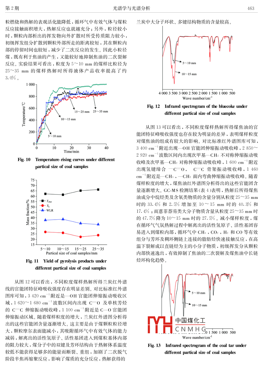 Vol.36,No.2,pp459-4652016年2Spectroscopy and Spectral AnalysisFebruary, 2016氐變質(zhì)煤-循環(huán)煤氣微波共熱解研究周軍2,楊哲,劉曉峰°,吳雷,田宇紅12,趙西成121.西安建筑科技大學(xué)冶金工程學(xué)院,陜西西安710055陜西省冶金工程技術(shù)研究中心,陜西西安7100553,榆林市科學(xué)技術(shù)信息研究所,陜西榆林7190004.新疆化工設(shè)計研究院有限責(zé)任公司,新疆烏魯木齊830006摘要低變質(zhì)煤干餾熱解生產(chǎn)蘭炭、煤焦油、煤氣被認(rèn)為是其清潔高效轉(zhuǎn)化利用的最佳途徑?,F(xiàn)有主流生產(chǎn)工藝普遍對原煤具有一定的粒度要求,煤焦油產(chǎn)量較低、質(zhì)量不高,煤氣中H2,CH4,CO等有效組分含量較低。為進(jìn)一步提髙低變質(zhì)煤熱解時煤焦油收率和質(zhì)量,提岀將微波熱解低變質(zhì)煤產(chǎn)生的煤氣循環(huán)通入微波熱解反應(yīng)器中,進(jìn)行低變質(zhì)煤-循環(huán)煤氣微波共熱解。結(jié)合FTIR及GC-MS等對熱解產(chǎn)品的分析表征系統(tǒng)考察了微波功率、熱解時間、煤樣粒度對熱解產(chǎn)品收率及組成的影響。硏究結(jié)果表明:低變質(zhì)煤在循環(huán)煤氣流量為0.4L·微波功率為800W、熱解時間為40min、煤樣粒度為5~10mm的工藝條件下熱解,所得固體產(chǎn)品蘭炭收率達(dá)62.2%6,液體產(chǎn)品(煤焦油和熱解水)收率達(dá)26.8%6。不同微波功率及熱解時間下所得蘭炭紅外譜線基本重合;不同粒度煤樣熱解所得蘭炭中OH,CO,CC和C-O官能團(tuán)含量差別較大。提高微波功率、延長熱解時間、減小煤樣粒度均有利于煤焦油的輕質(zhì)化。關(guān)鍵詞微波熱解;低變質(zhì)煤;循環(huán)煤氣;煤焦油;蘭炭中圖分類號:TQ530.2文獻(xiàn)標(biāo)識碼:ADOI:10.3964/1isn.100093(201602-045907蘭炭和焦油的收率以及焦油中BTX(苯、甲苯、二甲苯)言PCX(苯酚、甲酚、二甲酚)和萘的含量均明顯增加,同時水分也有所增加。 Silvera scaccia等研究發(fā)現(xiàn)煤樣在100近年來,煤微波熱解技術(shù)作為低變質(zhì)煤轉(zhuǎn)化利用的一種℃時就開始析出CO和CO2,隨著反應(yīng)溫度的升高,SO新途徑,以其傳熱傳質(zhì)規(guī)律獨(dú)特、熱解速度快,生產(chǎn)效率高,COS以及脂肪烴類化合物(CH4和C2H)析出。煤樣在CO目標(biāo)產(chǎn)物收率高,熱解尾氣中氫氣、甲烷和一氧化碳等有價環(huán)境下熱解時其揮發(fā)分產(chǎn)量明顯高于N2環(huán)境,且CO2環(huán)境成分含量高、熱值高等優(yōu)越性,最大程度實現(xiàn)了低變質(zhì)下焦炭的膨脹效果也明顯好于N2環(huán)境。 Kayser等研煤分級提質(zhì)利用的目的,得到了國內(nèi)外越來越多同行的關(guān)注究發(fā)現(xiàn)Ⅴ ictorian褐煤在CO2氣氛中熱解時CO2與碳在700與研究。國內(nèi)外相關(guān)研究表明,以較為廉價的焦?fàn)t氣、合成℃以后發(fā)生劇烈的氣化反應(yīng),對熱解產(chǎn)品有著很大的影響氣代替純氫進(jìn)行煤的加氫熱解是切實可行的,并已展現(xiàn)出其雷玉研究發(fā)現(xiàn)中國神府煤在氮?dú)鈿夥罩袩峤鈺r焦油收率由優(yōu)越性。熱解氣氛通過參與煤的熱解反應(yīng),改變其反應(yīng)600℃時的3.98%增加到800℃的8.03%,在氫氣、甲烷和機(jī)理,可以很好地改善和提高熱解產(chǎn)品的質(zhì)量和產(chǎn)量,并且HCO氣氛中熱解時,焦油收率普遍增加。不同的熱解氣氛對熱解結(jié)果的影響很大。煤樣的脫硫率在日前國內(nèi)蘭炭主流生產(chǎn)工藝多采用循環(huán)煤氣與新鮮空氣氣氛中隨著微波輻射時間的延長而増髙,黏結(jié)性指欻總混合燃燒的內(nèi)熱式熱解爐,其熱解煤氣中由于氮?dú)夂矿{而體上呈增大趨勢,煤樣中富氫的中小分子化合物含量增熱值較低,大部分企業(yè)通過“點(diǎn)天燈”燃燒排放或作為燃燒氣加。 Ariana等研究發(fā)現(xiàn)油頁巖在合成氣和氫氣氣氛中用于中國煤化x環(huán)境污染嚴(yán)重、能源浪熱解焦油收率高于在氮?dú)鈿夥罩?氣體收率低于氮?dú)鈿夥罩匈M(fèi)巨YHa的煤氣中,N2含量極低的。與相同氫分壓下的加氫熱解相比,煤焦?fàn)t氣共熱解所得HCNMHG近20%6,CO含量接近收稿日期:2015-01-23,修訂日期:2015-04-21基金項目:國家自然科學(xué)基金面上項目(51374166),國家高技術(shù)研究發(fā)展計劃(863計劃)項目(2011AA05A202),陜西省科技統(tǒng)籌創(chuàng)新工程目(201 IKTDZ01-05-04),陜西省教育廳科研計劃項目(12JK0583),榆林市科技計劃項目(2012173)資助作者簡介:周軍,1977年生,西安建筑科技大學(xué)冶金工程學(xué)院教授e-mail:xazhoujun126.com460光譜學(xué)與光譜分析第36卷l0%2)??紤]其“富氫”及廉價優(yōu)勢,進(jìn)行該煤氣與低變質(zhì)煤式中:Ym為蘭炭收率,%;Y為液體產(chǎn)品(煤焦油和熱解的微波共熱解是實現(xiàn)低變質(zhì)煤更加高效清潔轉(zhuǎn)化利用的一種水)率,%;WLR為失重率,%;W為固體產(chǎn)品蘭炭質(zhì)新方法,具有重要的科學(xué)意義及實用價值。本工作主要通過量,g;W。為煤樣質(zhì)量,g;W為液體產(chǎn)品質(zhì)量單因素實驗考察低變質(zhì)煤-循環(huán)煤氣微波共熱解過程中微波功率、熱解時間和煤樣粒度等對熱解產(chǎn)品產(chǎn)量及質(zhì)量的影2結(jié)果與討論響2.1微波功率的影響實驗部分圖2和圖3分別為循環(huán)煤氣流量為0.4L·min-、熱解時間為40min、煤樣粒度為10~15mm時,不同微波功率下1.1煤樣的煤樣升溫曲線及熱解產(chǎn)品收率變化實驗用煤取自
