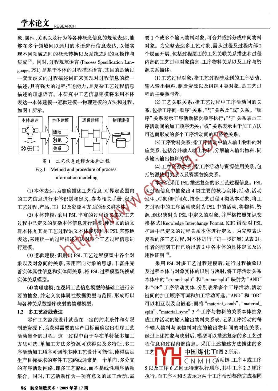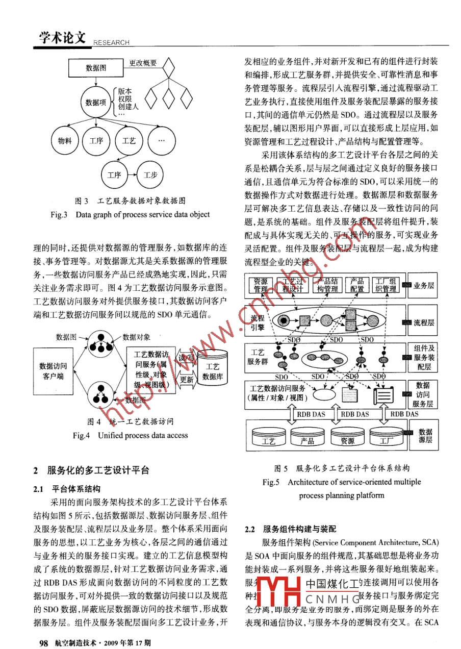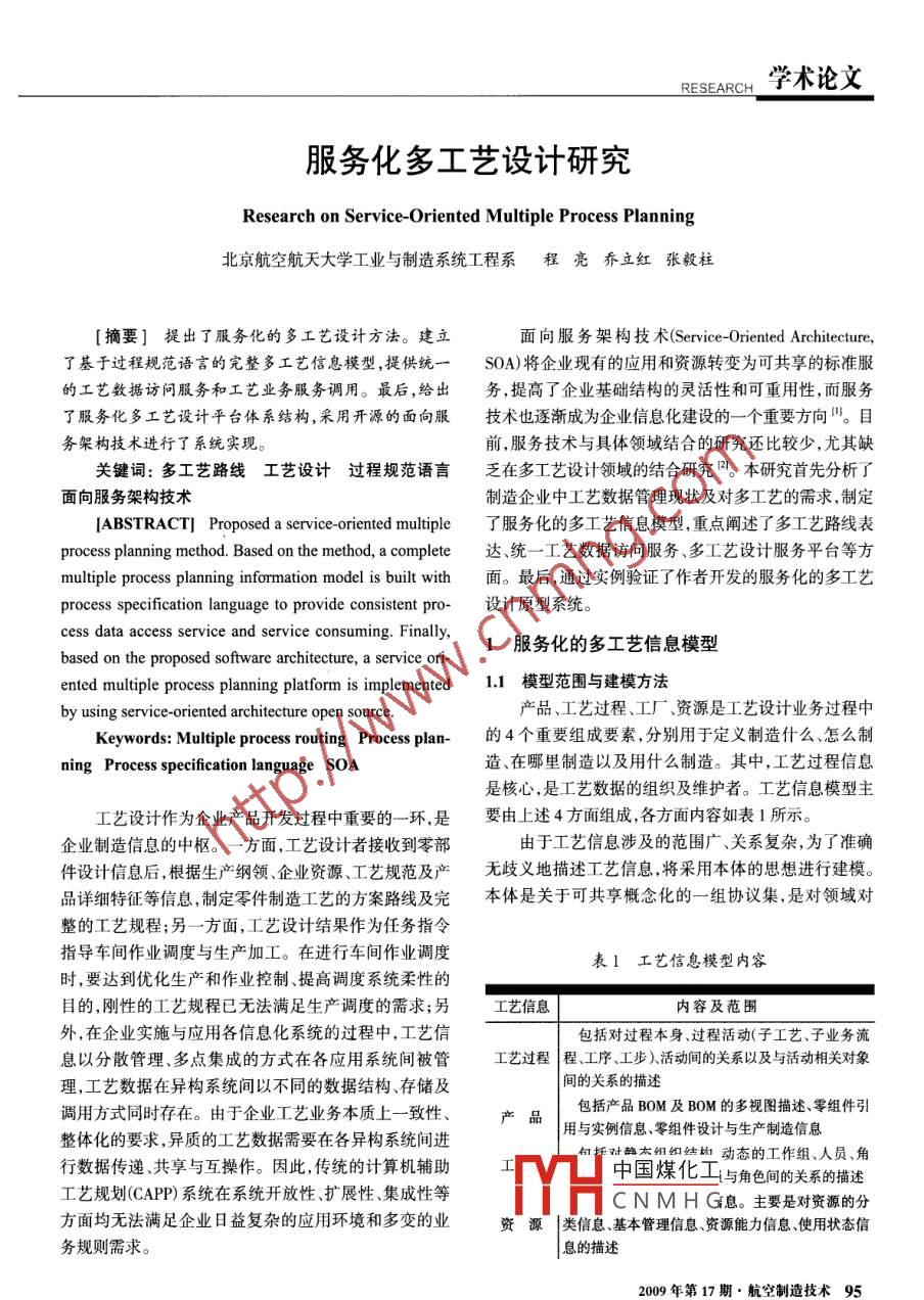 RESEARCH學術(shù)論文服務化多工藝設計研究Research on Service-Oriented Multiple Process Planning北京航空航天大學工業(yè)與制造系統(tǒng)工程系程亮喬立紅張毅柱[摘要]提出了服務化的多工藝設計方法。建立面向服務架構(gòu)技術(shù)( Service- Oriented Architecture,了基于過程規(guī)范語言的完整多工藝信息模型,提供統(tǒng)一SOA)將企業(yè)現(xiàn)有的應用和資源轉(zhuǎn)變?yōu)榭晒蚕淼臉藴史墓に嚁?shù)據(jù)訪問服務和工藝業(yè)務服務調(diào)用。最后,給出務,提高了企業(yè)基礎結(jié)構(gòu)的靈活性和可重用性,而服務了服務化多工藝設計平臺體系結(jié)構(gòu),采用開源的面向服技術(shù)也逐漸成為企業(yè)信息化建設的一個重要方向。目務架構(gòu)技術(shù)進行了系統(tǒng)實現(xiàn)。前,服務技術(shù)與具體領域結(jié)合的研究還比較少,尤其缺關(guān)鍵詞:多工藝路線工藝設計過程規(guī)范語言乏在多工藝設計領域的結(jié)合研究。本研究首先分析了面向服務架構(gòu)技術(shù)制造企業(yè)中工藝數(shù)據(jù)管理現(xiàn)狀及對多工藝的需求,制定lABSTRACTI Proposed a service-oriented multiple了服務化的多工藝信息模型,重點闡述了多工藝路線表process planning method. Based on the method, a complete達、統(tǒng)一工藝數(shù)據(jù)訪問服務、多工藝設計服務平臺等方multiple process planning information model is built with面。最后,通過實例驗證了作者開發(fā)的服務化的多工藝process specification language to provide consistent pr設計原型系統(tǒng)cess data access service and service consuming. Finally,1服務化的多工藝信息模型based on the proposed software architecture, a service oriented multiple process planning platform is implemented1.模型范圍與建模方法by using service-oriented architecture open source產(chǎn)品、工藝過程、工廠、資源是工藝設計業(yè)務過程中Keywords: Multiple process routing Process plan的4個重要組成要素,分別用于定義制造什么、怎么制ning Process specification language SOA造、在哪里制造以及用什么制造。其中,工藝過程信息是核心,是工藝數(shù)據(jù)的組織及維護者。工藝信息模型主工藝設計作為企業(yè)產(chǎn)品開發(fā)過程中重要的一環(huán),是要由上述4方面組成,各方面內(nèi)容如表1所示。企業(yè)制造信息的中樞。一方面,工藝設計者接收到零部由于工藝信息涉及的范圍廣、關(guān)系復雜,為了準確件設計信息后,根據(jù)生產(chǎn)綱領、企業(yè)資源、工藝規(guī)范及產(chǎn)無歧義地描述工藝信息,將采用本體的思想進行建模。品詳細特征等信息,制定零件制造工藝的方案路線及完本體是關(guān)于可共享概念化的一組協(xié)議集,是對領域?qū)φ墓に囈?guī)程;另一方面,工藝設計結(jié)果作為任務指令指導車間作業(yè)調(diào)度與生產(chǎn)加工。在進行車間作業(yè)調(diào)度表1工藝信息模型內(nèi)容時,要達到優(yōu)化生產(chǎn)和作業(yè)控制、提高調(diào)度系統(tǒng)柔性的目的,剛性的工藝規(guī)程已無法滿足生產(chǎn)調(diào)度的需求;另工藝信息內(nèi)容及范圍外,在企業(yè)實施與應用各信息化系統(tǒng)的過程中,工藝信包括對過程本身、過程活動(子工藝、子業(yè)務流息以分散管理、多點集成的方式在各應用系統(tǒng)間被管藝過程|程、工序、工步活動間的關(guān)系以及與活動相關(guān)對象理,工藝數(shù)據(jù)在異構(gòu)系統(tǒng)間以不同的數(shù)據(jù)結(jié)構(gòu)、存儲及間的關(guān)系的描述調(diào)用方式同時存在。由于企業(yè)工藝業(yè)務本質(zhì)上一致性、包括產(chǎn)品BOM及BOM的多視圖描述、零組件引整體化的要求,異質(zhì)的工藝數(shù)據(jù)需要在各異構(gòu)系統(tǒng)間進用與實例信息零組件設計與生產(chǎn)制造信息計辭太組如續(xù)卦動態(tài)的工作組、人員、角行數(shù)據(jù)傳遞共享與互操作。因此,傳統(tǒng)的計算機輔助中國煤化工與角色間的關(guān)系的描述工藝規(guī)劃(CAPP)系統(tǒng)在系統(tǒng)開放性、擴展性、集成性等CNMHG息。主要是對資源的分方面均無法滿足企業(yè)日益復雜的應用環(huán)境和多變的業(yè)資源類信息基本管理信息、資源能力信息使用狀態(tài)信務規(guī)則需求。息的描述2009年第17期·航空制造技術(shù)95學術(shù)論文RESEARCH象、屬性、關(guān)系以及行為等各種概念信息的規(guī)范表達,能要1個或多個輸入物料對象,可合并或拆分成中間物料夠在多個領域間以通用的術(shù)語進行信息表達,以便實對象。為完整表達多工藝對象需從過程及過程內(nèi)部2現(xiàn)不同領域之間的概念轉(zhuǎn)換以及系統(tǒng)之間的互操作與個層面開展,包括過程層面的工藝關(guān)聯(lián)關(guān)系描述和過程集成國。同時,過程規(guī)范語言( Process Specification Lan-內(nèi)部的工藝過程對象信息、工序物料關(guān)系以及工序與資guage,PSL是基于本體的過程描述語言,其目的是通過源關(guān)系描述。套無歧義的過程描述詞匯來實現(xiàn)對過程信息的統(tǒng)一(1)工藝過程對象:指工藝過程涉及到的工序活動描述,具有強大的過程描述能力,是復雜工藝過程信息輸入輸出物料、制造資源以及組織4類對象,是工藝過描述的理想語言。本研究中工藝信息建模將采用本體程的主要參與者。表達→本體建?!壿嫿!锢斫5姆椒ê瓦^程,(2)工藝關(guān)聯(lián)關(g