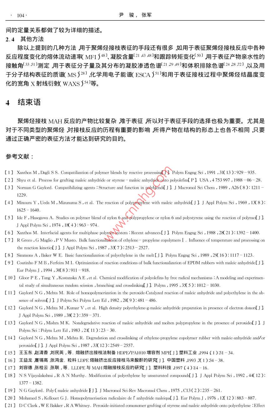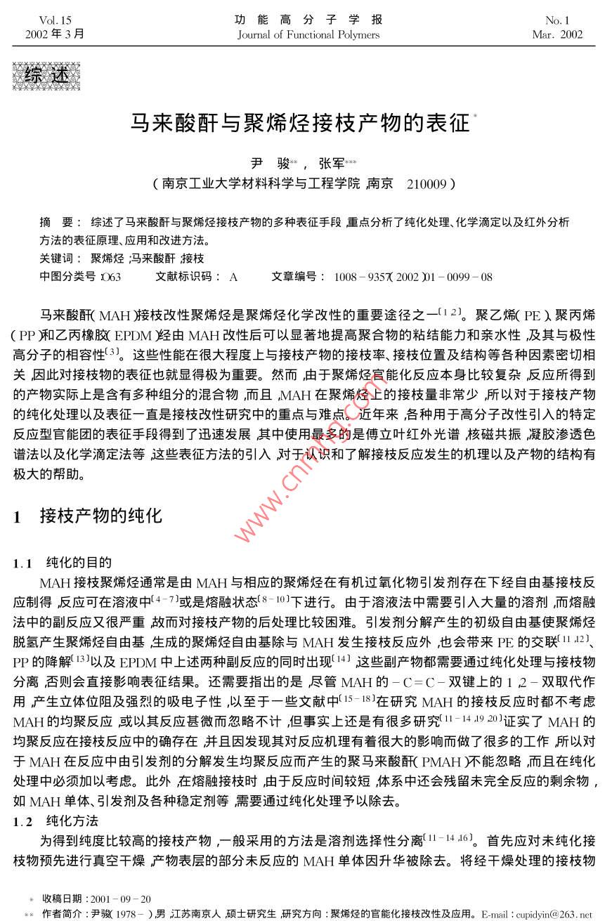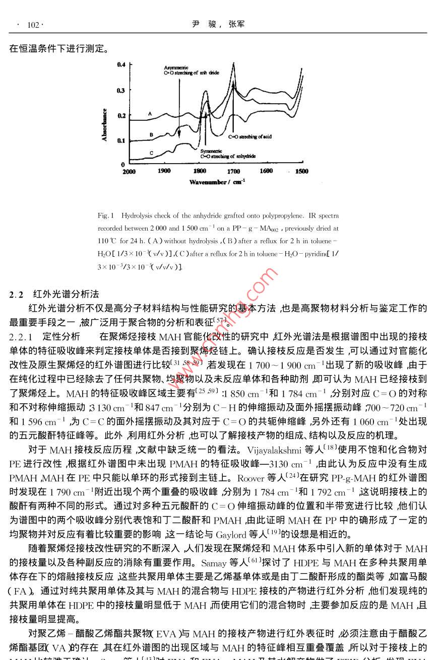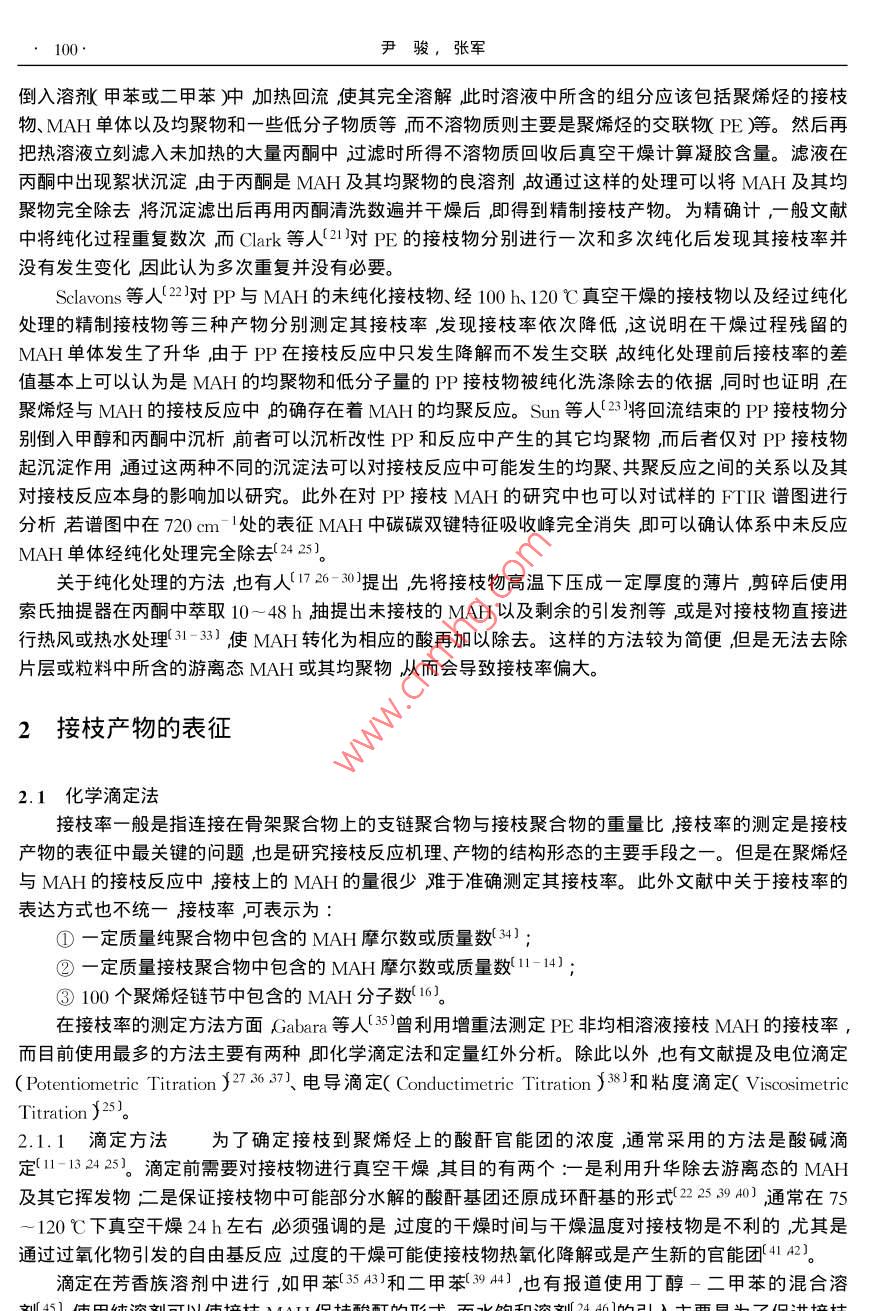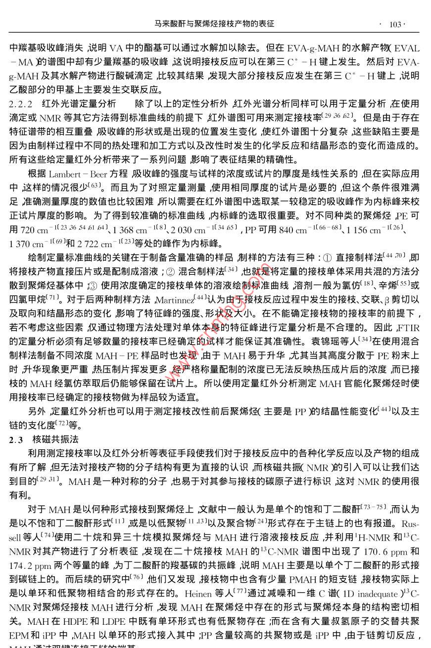 Vol. 15功能高分子學報No.12002年3月Journal of Functional PolymersMar. 2002綜述”馬來酸酐與聚烯烴接枝產物的表征尹駿,張軍**(南京工業(yè)大學材料科學與工程學院南京210009)摘要:綜述了馬來酸酐與聚烯烴接枝產物的多種表征手段重點分析了純化處理、化學滴定以及紅外分析方法的表征原理、應用和改進方法。關鍵詞:聚烯烴;馮來酸酐接枝中圖分類號:063 .文獻標識碼: A文章編號: 1008 - 9357( 2002 )1 - 0099- 08馬來酸酐( MAH )接枝改性聚烯烴是聚烯烴化學改性的重要途徑之- -(12。聚乙烯( PE )聚丙烯(PP和乙丙橡膠(EPDM)經由MAH改性后可以顯著地提高聚合物的粘結能力和親水性,及其與極性高分子的相容性(3。這些性能在很大程度上與接枝產物的接枝率、接枝位置及結構等各種因素密切相關,因此對接枝物的表征也就顯得極為重要。然而,由于聚烯烴官能化反應本身比較復雜反應所得到的產物實際上是含有多種組分的混合物,而且,MAH在聚烯烴上的接枝量非常少,所以對于接枝產物的純化處理以及表征-直是接枝改性研究中的重點與難點。近年來,各種用于高分子改性引入的特定反應型官能團的表征手段得到了迅速發(fā)展其中使用最多的是傅立葉紅外光譜核磁共振凝膠滲透色譜法以及化學滴定法等這些表征方法的引入對于認識和了解接枝反應發(fā)生的機理以及產物的結構有極大的幫助。1接枝產物的純化1.1純化的目的MAH接枝聚烯烴通常是由MAH與相應的聚烯烴在有機過氧化物引發(fā)劑存在下經自由基接枝反應制得反應可在溶液中(4-7)或是熔融狀態(tài)[8- 10]下進行。由于溶液法中需要引入大量的溶劑,而熔融法中的副反應又很嚴重故而對接枝產物的后處理比較困難。引發(fā)劑分解產生的初級自由基使聚烯烴脫氫產生聚烯烴自由基生成的聚烯烴自由基除與MAH發(fā)生接枝反應外,也會帶來PE的交聯(lián)11.12)、PP的降解13)以及EPDM中上述兩種副反應的同時出現(xiàn)14)這些副產物都需要通過純化處理與接枝物分離,否則會直接影響表征結果。還需要指出的是盡管MAH的-C=C-雙鍵上的1 2-雙取代作用產生立體位阻及強烈的吸電子性,以至于-些文獻中( I5- 18)在研究MAH的接枝反應時都不考慮MAH的均聚反應或以其反應甚微而忽略不計,但事實上還是有很多研究11-14.1920)證實了MAH的均聚反應在接枝反應中的確存在并且因發(fā)現(xiàn)其對反應機理有著很大的影響而做了很多的工作所以對于MAH在反應中由引發(fā)劑的分解發(fā)生均聚反應而產生的聚馬來酸酐(PMAH)不能忽略,而且在純化處理中必須加以考慮。此外在熔融接枝時,由于反應時間較短,體系中還會殘留未完全反應的剩余物,如MAH單體、引發(fā)劑及各種穩(wěn)定劑等需要通過純化處理予以除去。1.2 純化方法為得到純度比較高的接枝產物,-般采用的方法是溶劑選擇性分離11-14.160。首先應對未純化接枝物預先進行真空干燥產物表層的部分未反應的MAH單體因升華被除去。將經干燥處理的接枝物收稿日期:2001-09 -20**作者簡介:尹駿( 1978- )男江蘇南京人碩士研究生研究方向:聚烯烴的官能化接枝改性及應用。E mail : cupidyin@263. net*** 通訊聯(lián)系人:張軍( 1964- )男江蘇姜堰人副教授研究方向:高分子材料改性及功能高分子。E - mail : zhangjun@ njuct. edu.100 .尹駿,張軍倒入溶劑甲苯或二甲苯)中加熱回流使其完全溶解此時溶液中所含的組分應該包括聚烯烴的接枝物、MAH單體以及均聚物和一些低分 子物質等而不溶物質則主要是聚烯烴的交聯(lián)物( PE等。然后再把熱溶液立刻濾入未加熱的大量丙酮中過濾時所得不溶物質回收后真空干燥計算凝膠含量。濾液在丙酮中出現(xiàn)絮狀沉淀,由 于丙酮是MAH及其均聚物的良溶劑故通過這樣的處理可以將MAH及其均聚物完全除去將沉淀濾出后再用丙酮清洗數(shù)遍并干燥后,即得到精制接枝產物。為精確計,-般文獻中將純化過程重復數(shù)次而Clark等人(21)對PE的接枝物分別進行- -次和多次純化后發(fā)現(xiàn)其接枝率并沒有發(fā)生變化,因此認為多次重復并沒有必要。Sclavons等人22]對PP與MAH的未純化接枝物、經100 h、120 C真空干燥的接枝物以及經過純化處理的精制接枝物等三種產物分別測定其接枝率發(fā)現(xiàn)接枝率依次降低,這說明在干燥過程殘留的MAH單體發(fā)生了升華,由于PP在接枝反應中只發(fā)生降解而不發(fā)生交聯(lián)故純化處理前后接枝率的差值基本.上可以認為是MAH的均聚物和低分子量的PP接枝物被純化洗滌除去的依據(jù),同時也證明在聚烯烴與MAH的接枝反應中的確存在著MAH的均聚反應。Sun 等人(23將回流結束的PP接枝物分別倒入甲醇和丙酮中沉析前者可以沉析改性PP和反應中產生的其它均聚物,而后者僅對PP接枝物起沉淀作用通過這兩種不同的沉淀法可以對接枝反應中可能發(fā)生的均聚、共聚反應之間的關系以及其對接枝反應本身的影響加以研究。此外在對PP接枝MAH的研究中也可以對試樣的FTIR譜圖進行分析若譜圖中在720cm-1處的表征MAH中碳碳雙鍵特征吸收峰完全消失即可以確認體系中未反應MAH單體經純化處理完全除去(2425。關于純化處理的方法,也有人(1726- 30]提出先將接枝物高溫下壓成-定厚度的薄片剪碎后使用索氏抽提器在丙酮中萃取10~48h抽提出未接枝的MAH以及剩余的引發(fā)劑等或是對接枝物直接進行熱風或熱水處理(31 - 331使MAH轉化為相應的酸再加以除去。這