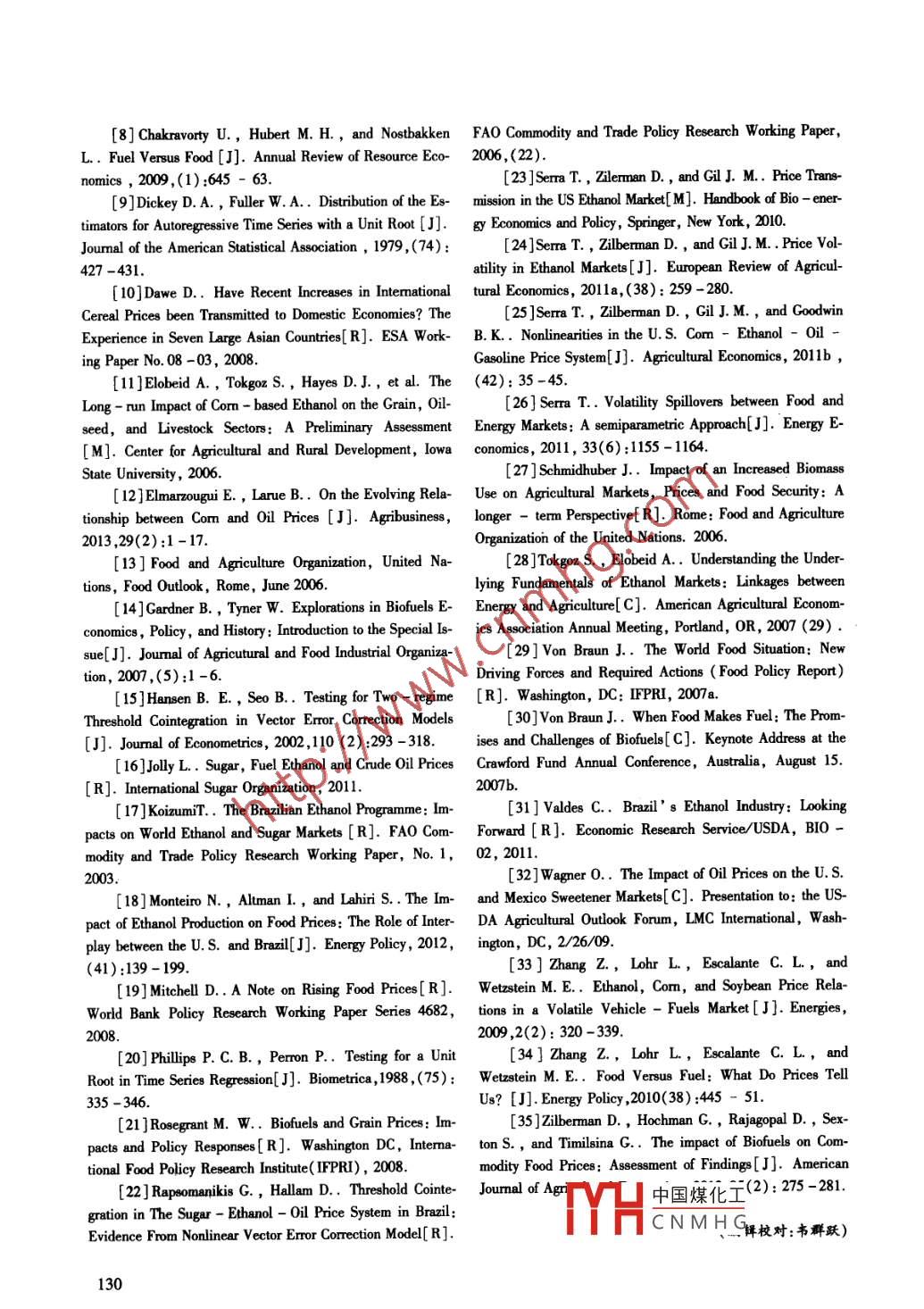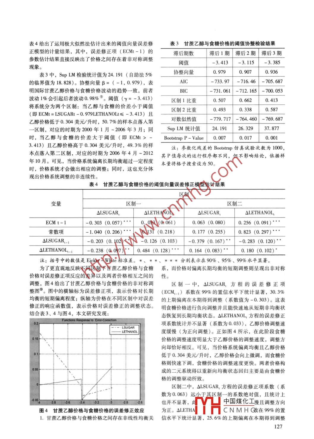 《經(jīng)濟(jì)問題探索》2014年第2期國際甘蔗燃料乙醇與食糖市場間的非對(duì)稱價(jià)格傳導(dǎo)效應(yīng)黃春全,司偉(中國農(nóng)業(yè)大學(xué),北京100083)摘要:為了探究國際甘蔗燃料乙醇與食糖市場間價(jià)格聯(lián)系的內(nèi)在規(guī)律,本文運(yùn)用值向量誤差修正模型對(duì)兩者價(jià)格間的動(dòng)態(tài)傳導(dǎo)效應(yīng)進(jìn)行了研究。研究證實(shí):在長期內(nèi),甘蔗燃料乙醇價(jià)格與食糖價(jià)格之間存在非線性的闊值均衡關(guān)系,且相互之間產(chǎn)生雙向格蘭杰因果影響。在短期內(nèi),價(jià)格對(duì)偏離長期均衡的短期調(diào)整則呈現(xiàn)出非對(duì)稱性,其調(diào)整方向與速度在不同的價(jià)格水平上存在著明顯的差異。當(dāng)價(jià)格系統(tǒng)偏離均衡且乙醇價(jià)格較低時(shí),乙醇價(jià)格會(huì)向上微調(diào),而食糖價(jià)格則快速下調(diào);此時(shí),食糖價(jià)格受到乙醇價(jià)格的顯著格蘭杰影響,較低的乙醇價(jià)格有力地遁制了食糖價(jià)格的上漲。當(dāng)乙醇與食糖的價(jià)差拉大且乙醇價(jià)格較高時(shí),乙醇價(jià)格和食糖價(jià)格都向上調(diào)整,但乙醇價(jià)格調(diào)整速度明顯更快;此時(shí),價(jià)格之間存在雙向格蘭杰因果關(guān)系,不斷葶升的乙醇價(jià)格帶動(dòng)食糖價(jià)格持續(xù)上揚(yáng),同時(shí),不斷上漲的食糖價(jià)格又反過來正向推動(dòng)乙醇價(jià)格上升。隨著近年來甘蔗能源屬性的不斷強(qiáng)化,甘蔗乙醇價(jià)格對(duì)食糖價(jià)格的彩響正在不斷加強(qiáng)。最后,本文針對(duì)性地提出了維護(hù)甘蔗乙醇和食糖價(jià)格穩(wěn)定的相關(guān)政策建議。關(guān)鍵詞:甘蔗燃料乙醇;食糖;價(jià)格傳導(dǎo);闔值協(xié)整;非對(duì)稱調(diào)整引言價(jià)格之間的聯(lián)系正在強(qiáng)化已是不爭的事實(shí)。已有大量研隨著世界經(jīng)濟(jì)的高速發(fā)展,經(jīng)濟(jì)對(duì)能源的依賴不斷究表明生物能源發(fā)展正是近期全球農(nóng)產(chǎn)品價(jià)格(玉米增強(qiáng),從而使能源安全、環(huán)境保護(hù)與經(jīng)濟(jì)發(fā)展之間的矛食糖、小麥、大豆、油菜籽等)快速上漲的重要原因盾日益突出。此時(shí),生物能源的興起無疑給世界帶來了(例如:仇煥廣等,2009;劉志雄,2012; Elobeid et aL,希望。目前已有許多國家將對(duì)生物能源的開發(fā)與利用作206; Schmidhuber,2006; Von braun,2007a,2007b為解決問題的突破口。然而,生物能源既是問題的解決 Tokgoz and El007; Wagner, 2009; Serra et al.者又是問題的制造者( Gardner and Tyner,2007)。與食2010,201l,20b; Monteiro et al.,2012; Elmarzougui用和飼用農(nóng)產(chǎn)品消費(fèi)需求相比,生物能源對(duì)農(nóng)產(chǎn)品的需 and Larue,2013),甚至更有部分學(xué)者將農(nóng)產(chǎn)品價(jià)格的求不僅增長迅速,而且潛在需求量也十分巨大。目前,高漲主要或全部歸咎于生物燃料產(chǎn)業(yè)的快速發(fā)展越來越多的甘蔗、玉米、植物油和動(dòng)物脂肪正被用來生( Mitchel,2008; Rosegrant,2008; Chakravorty,2009)。產(chǎn)燃料乙醇或生物柴油,以替代石油用作汽車燃料,以可見,學(xué)界普遍認(rèn)同,生物能源產(chǎn)業(yè)的發(fā)展緊密了能源致生物能源在農(nóng)產(chǎn)品價(jià)格上漲中所扮演的角色飽受爭價(jià)格與農(nóng)產(chǎn)品價(jià)格之間的聯(lián)系,并且開始影響甚至主導(dǎo)議農(nóng)產(chǎn)品價(jià)格的走向。目前,有關(guān)生物能源產(chǎn)業(yè)發(fā)展對(duì)農(nóng)產(chǎn)品價(jià)格影響的甘蔗燃料乙醇與食糖市場是觀察生物能源與農(nóng)產(chǎn)品命題已經(jīng)引起了學(xué)界的廣泛關(guān)注( silberman et al.,市場價(jià)格聯(lián)系的典型案例。 Rapsomanikis和Hlam2013)。從現(xiàn)有研究文獻(xiàn)來看,雖有部分學(xué)者認(rèn)為,生(2006)研究發(fā)現(xiàn),巴西國內(nèi)原油價(jià)格、甘蔗乙醇價(jià)格物能源產(chǎn)業(yè)發(fā)展對(duì)農(nóng)產(chǎn)品價(jià)格的正向推動(dòng)作用并不大和食糖價(jià)格之間存在長期協(xié)整關(guān)系,外生于該經(jīng)濟(jì)系統(tǒng)(例如:Dawe,2008; Bole and Londo,2008; Zhang et的石油價(jià)格是乙醇價(jià)格和食糖價(jià)格的長期驅(qū)動(dòng)因素;乙al.,2009,2010;Sema,2011)。然而,早在30年前就醇價(jià)格與食糖價(jià)格之間呈現(xiàn)出了線性調(diào)整過程,并未發(fā)有學(xué)者研究指出,在隨后的十年內(nèi),乙醇燃料的生產(chǎn)極現(xiàn)兩者之間存在非線性關(guān)系;食糖價(jià)格對(duì)乙醇價(jià)格產(chǎn)生有可能干擾國際農(nóng)產(chǎn)品市場的價(jià)格體系(例如:Bar-格蘭杰影響,其因果關(guān)系層次是原油價(jià)格通過食糖價(jià)格nard,1983)。尤其是近幾年來,生物能源價(jià)格與農(nóng)產(chǎn)品影響乙醇價(jià)格,而并非是最初預(yù)計(jì)的原油價(jià)格通過乙醇作者簡介:黃春仝(1981-),男,廣東省高州人,中國農(nóng)業(yè)大學(xué)經(jīng)濟(jì)管理學(xué)院博士研究生(經(jīng)濟(jì)師),研究方向?yàn)檗r(nóng)產(chǎn)品市場與貿(mào)易及產(chǎn)業(yè)經(jīng)濟(jì);司偉(1978-),男,安徽省太和縣人,中國農(nóng)業(yè)大學(xué)經(jīng)濟(jì)管理學(xué)中國煤化工向?yàn)橐庐a(chǎn)品貿(mào)易與產(chǎn)業(yè)經(jīng)濟(jì)基金項(xiàng)目: