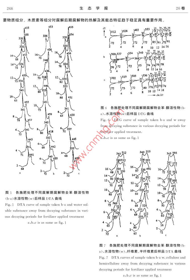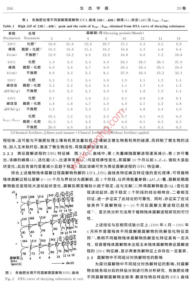 第20卷第2期生態(tài)學(xué)報Vol. 20.No. 22000年3月ACTA ECOLOGICA SINICAMar. ,2000衣田生態(tài)條件下玉米秸桿腐解過程腐解物的熱解變化特征張春慧',張一平2 ,竇連彬3(1.天津市大港經(jīng)濟(jì)技術(shù)開發(fā)區(qū)管委會.天津300270;2. 西北農(nóng)業(yè)大學(xué)資環(huán)系,陜西楊陵712100;3. 天津市大港區(qū)農(nóng)林畜牧局,天津300270)摘要:用熱分析法研究了農(nóng)田生態(tài)條件下玉米秸桿腐解過程腐解物的熱解變化特征,并探討了腐解物中不同組分對腐解物熱解特征的影響,結(jié)果表明.腐解物DTA曲線的280C、330C、450C放熱峰,DTG曲線的第二失重峰和h33o0c/husoc值可作為表征腐解進(jìn)程的特征峰和特征值。由腐解物DTA、DTG所得能量各參數(shù)(OH,E)與文獻(xiàn)[3]所述腐解物能態(tài)(Q呈現(xiàn)波動起伏,趨于穩(wěn)定2個階段相符.二者相互印證,顯示熱分析方法用于植物殘體腐解進(jìn)程研究的可行性。DTA的280C放熱峰主要由苯醇溶性物、水溶性物引起。苯醇溶性物、水溶性物和纖維素、半纖維素是影響腐解物熱解及其能態(tài)變化特征的主要物質(zhì)組分。木質(zhì)素組分對腐解后期腐解物的熱解及其能態(tài)特征趨于穩(wěn)定具有重要作用。關(guān)鍵詞:玉米秸桿;腐解物;熱解;能態(tài)Pyrolytic features of corn residues in the decaying process underfield conditionsZHANG Chun-Hui' ,ZHANG Yi- Ping2 ,DOU Lian-Bin'(1. Administrative Compmisso of DagangEcomomic and Technologic Development Area , Tianjin 300270, Chinc; 2. Northrvestern Agricultural University . Shanti,Yangling 300270. hina ;3. Agricultural Forestry Livestock Bureau of Tianjin Dagang .Tianjin 300270.China)Abstract: This research proved that a thermal analysis could be used to study the plant residue decaying.Variations in pyrolytic features of corn residues in the decaying process was investigated under field condi-tions. The results show that 280C,330C ,and 450C peaks of DTA curve and the second peak of DTGcurve could be regarded as the featured peak" and the ratio of hssoc /hasoc as "the featured index" . Energyparameters (OH . E)brought out such two stages as the fluctuating- rolling stage and the stage which tendedto be stable. The results show that 280C peak of DTA curve was mainly given by benzene- alcohol solublesubstances(b-a) and water soluble substances (w); b-a, w,cellulose , hemicellulose were the main compo-nents which aected pyrolitic feature. Lignin had a important function in the latter decaying period in whichporolitic feature and energetics tended to be stable.Key words :corn residue ;decaying subs tance ;pyrolytic feature ;energetic文章編號:1000 -0933(2000>02 0264-06中圖分類號 :Q948文獻(xiàn)標(biāo)識碼:A近代一些學(xué)者借助于熱分析方法對土壤有機(jī)質(zhì)研究的結(jié)果表明,該方法不僅可以獲得腐解物質(zhì)分子結(jié)構(gòu)有價值的資料,而且還可以估價有機(jī)物質(zhì)的腐殖化程度[.2)。作者曾用氧彈量熱計法研究了農(nóng)田生態(tài):條件下玉米秸桿腐解過程腐解物的能態(tài)變化特征,并探討了腐解物中不同組分對腐解物能態(tài)的影響。為深化這方面的研究,本文在以往研究的基礎(chǔ)上采用熱分析方法、沿用動態(tài)研究途徑,對農(nóng)田生態(tài)條件下植物殘體腐解過程腐解物的熱分解(熱解)特征進(jìn)行探討,為植物殘體腐解過程能態(tài)變化研究探索新的途徑和累積新的資料。1材料與方法2期張春慧等:農(nóng)田生態(tài)條件下玉米秸桿腐解過程腐解物的熱解變化特征265本試驗利用西北農(nóng)業(yè)大學(xué)有機(jī)質(zhì)轉(zhuǎn)化研究定位試驗450地進(jìn)行,土壤系口土,安排本試驗時,定位試驗已連續(xù)進(jìn)行了13a.小區(qū)面積為19.8m2,每年小麥玉米連作。本試驗選330用定位試驗中化肥,廄肥+化肥,不施肥3個處理,供試小區(qū)施肥處理,小區(qū)土壤化學(xué)性質(zhì)及供試腐解物樣品的采集16<、45及制備同文獻(xiàn)[3]。用島津DT-30B型熱分析儀進(jìn)行供試樣¥$2335332品的差熱(DTA),熱重(TG )和微商熱重(DTG)分析。DTAM\稱樣6. 00mg.TG稱樣10. 00mg,參比物為AlO,試樣氣456氛為靜態(tài)空氣,升溫速度10C/min. DTA中腐解物的能態(tài)1m ) 4s5 16160用焓變(0H)表示,其計算公式為0H=k●s/m(S:測試峰75s2 7面積.m:峰區(qū)熱解物重量,k:用苯甲酸測得的標(biāo)定常3314.數(shù))+[1.DTG中腐解物熱解活化能(E),比速率常數(shù)(ke)依據(jù)Turner等C5.1的計算公式推求。322結(jié)果與討論7474492.1植物殘體腐解過程腐解物熱分析曲線特征12333各施肥處理不同腐解期腐解物的DTA曲線如圖1。各7434212~曲線特征基本相似,共同點(diǎn)是.60~85C有-吸熱谷,32210、~342C和419~475C有兩個主放熱峰,480C左右有' -尖85 34010 340狀放熱峰。此外,腐解前期265~321C有-小放熱峰。58104281 I 454各施肥處理不同腐解期腐解物的DTG曲線如圖2。各270 \DTG曲線亦有共性,均顯示3個失重峰,其中第2失重峰Bi 238314最突出。59 4502.2植物殘體腐解過程腐解物熱解的動態(tài)變化特征308)683102.2.1表征腐解進(jìn)程的DTA特征峰和特征值圖6-50661321401DTA曲線中.265~321C小放熱峰(簡稱280C峰),各施420435肥處理在腐解前期(10個月前)均明顯,以后消失,此峰的306出現(xiàn)顯示腐解過程處于前期,因此可作為表征腐解進(jìn)程的330 4-47432654特征峰(280C特征峰);322~342C放熱峰(簡稱330C.475‘ 613201峰),各施肥處理及各腐解期皆突出,峰較高,峰面積較大,305|峰溫變幅小,基本處于330C 左右,同時從表1可見,腐解過程此峰的峰高(h),焓變(0H)呈現(xiàn