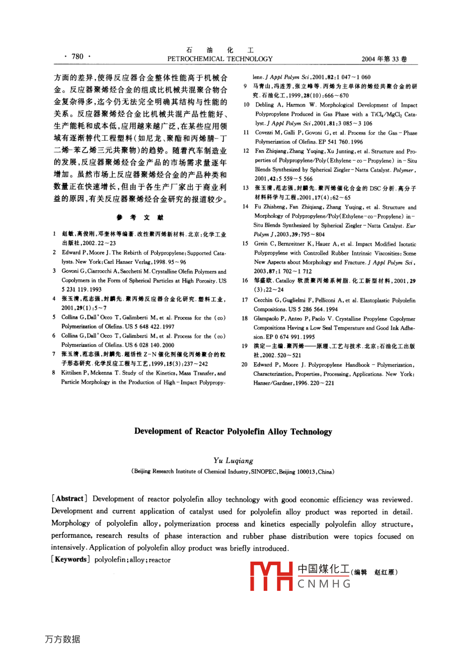 石油化004年第33卷第8期PETROCHEMICAL TECHNOLOGY777進展與述評反應(yīng)器聚烯烴合金技術(shù)的進展于魯強國石化集團北京化工研究院,北京100013)[摘要]綜述了反應(yīng)器聚烯烴合金技術(shù)的進展情況,介紹了反應(yīng)器聚烯烴合金的催化劑及最新應(yīng)用的發(fā)展方向;介紹了反應(yīng)器聚烯烴合金的聚合物顆粒形態(tài)、聚合動力學(xué)及聚合工藝特點;在反應(yīng)器聚烯烴合金結(jié)構(gòu)與性能表征方面,介紹了相界面相容性和橡膠相顆粒分散的研究成果;介紹了目前反應(yīng)器聚烯烴合金產(chǎn)品及其應(yīng)用情況[關(guān)鑣詞]聚烯烴;合金;反應(yīng)器[文章端號]1000-8144(2004)08-0777-04[中圈分類號]TQ052文獻標識碼]A聚烯烴合金是指含有多種烯烴均聚物或共聚物高孔隙度的均聚物顆粒,在共聚反應(yīng)過程中才能容組分的聚烯烴多相混合物。反應(yīng)器聚烯烴合金是指納更多烯烴共聚物。1983年, Himont公司在研究在反應(yīng)器中直接反應(yīng)生成的聚烯烴多相共聚物。由“低白點”聚丙烯抗沖共聚物過程中發(fā)現(xiàn),加入一定于 Ziegler-Natt“第四代”聚烯烴催化劑在催化劑量的高密度聚乙烯(HDPE)能夠有效地減少抗沖聚微觀孔結(jié)構(gòu)控制方面取得了突破,從而奠定了烯烴丙烯應(yīng)力變白的現(xiàn)象。根據(jù)上述結(jié)論,他們進行了聚合的“反應(yīng)器顆粒技術(shù)”( Reactor Granule Tech中試聚合試驗:在丙烯均聚、乙烯丙烯多相共聚產(chǎn)生nology)基礎(chǔ)“反應(yīng)器顆粒技術(shù)”為生產(chǎn)反應(yīng)器聚烯乙烯丙烯無規(guī)共聚物(EPR)之后,再串聯(lián)上一個氣烴合金提供了基本保證。相反應(yīng)器用于生成HDPE,但實驗結(jié)果并沒有得到烯烴聚合“反應(yīng)器顆粒技術(shù)”是指烯烴單體在以HDPEMgC2為載體的催化劑上進行可控復(fù)形聚合,逐漸研究發(fā)現(xiàn),經(jīng)過多相共聚以后,聚合物顆粒內(nèi)部生成一個多孔的球形顆粒,其后可以引入其它單體已被EPR“填滿”,乙烯單體無法擴散到活性中心繼進行聚合形成聚合物合金。續(xù)反應(yīng)生成HDPE。后來, Himont公司運用催化劑本工作跟蹤了反應(yīng)器聚烯烴合金技術(shù)近期的進載體高度脫醇技術(shù)制備出高孔隙率的催化劑解展,分別從反應(yīng)器聚烯烴合金催化劑聚烯烴合金聚決了這個問題。隨后 Himont公司對催化劑進一步合動力學(xué)和聚合工藝特點、聚烯烴合金產(chǎn)品的結(jié)構(gòu)改進,使得聚合物顆粒中可以容納更多的橡膠和其與性能及聚烯烴合金的產(chǎn)品應(yīng)用等方面進行了它特殊的添加劑3綜述。目前商業(yè)化的以MgCl2為載體的高孔隙率的Ziegler-Na“第四代”球形聚丙烯催化劑可以用來1用于反應(yīng)器聚烯烴合金的催化劑生產(chǎn)聚烯烴合金。用于生產(chǎn)反應(yīng)器聚烯烴合金的催化劑必須具備文獻4報道,北京化工研究院的DQ系列催化以下5個條件1:(1)大的比表面積;(2)高的空原劑生成的聚丙烯合金中乙烯質(zhì)量分數(shù)高達27%時率,孔徑分布均勻;(3)催化劑活性中心分布均勻;聚合物顆粒仍具有很好的流動性能(4)催化劑的機械強度足以承受機械變化過程,但又均相茂金屬催化劑雖具有很好的均聚和共聚性能夠讓聚合物增長時產(chǎn)生的壓力將內(nèi)部結(jié)構(gòu)破碎成能,但由于很難控制生成聚合物的顆粒形態(tài),所以限制了其應(yīng)用的范圍。將茂金屬催化劑負載到多孔的較小顆粒,并均勻地分布在膨脹著的聚合物內(nèi)部;(5)單體可以自由地擴散到催化劑內(nèi)部而發(fā)生聚合聚合物顆粒上后,可以得到等規(guī)、間規(guī)、無規(guī)、EPR反應(yīng)。等所有茂金屬催化劑能夠得到的聚合物并且可中國煤化工反應(yīng)器聚烯烴合金的催化劑具有高孔隙率是稿日別于以往催化劑最主要的特點之一。高孔隙率的催作著簡介手(0),男,山東省煙臺市人,士,高級工程化劑可以使反應(yīng)生成高孔隙度的均聚物顆粒,具有師電話010-64273136電郵yq@bri.ae.cm石778PETROCHEMICAL TECHNOLOGY2004年第33卷控制聚合物顆粒的形態(tài)。了樹脂產(chǎn)品的范圍。然而,在無規(guī)共聚物方面液相具體方法是用高孔隙率 Ziegler- Natta催化劑本體聚合工藝(如 Spheripol工藝),即使采用高孔隙進行丙烯均聚后,使殘余的催化劑失活,然后在聚合率催化劑,也達不到增加無規(guī)共聚物含量的目的物上負載茂金屬催化劑進行二段共聚反應(yīng)56。與因為當無規(guī)共聚物乙烯質(zhì)量分數(shù)達到4%時,無規(guī)傳統(tǒng)的 Ziegler-Nat催化劑相比,茂金屬共聚物結(jié)共聚物會大量溶解在液相單體中而出現(xiàn)粘釜現(xiàn)象,構(gòu)均勻,尤其是通過改變茂金屬的結(jié)構(gòu),可在很大范聚合反應(yīng)之后經(jīng)過閃蒸脫出未反應(yīng)的單體時,溶解圍內(nèi)調(diào)控聚合物的微觀結(jié)構(gòu),合成出具有新型鏈結(jié)在單體中的無規(guī)共聚物會沉積在聚合物顆粒的表構(gòu)的共聚物。面,聚合物顆粒容易相互粘連造成結(jié)塊。通常情況“反應(yīng)器顆粒技術(shù)”的另外一個引人矚目的應(yīng)用下,乙烯質(zhì)量分數(shù)為4%的聚丙烯無規(guī)共聚物的起是引人非烯烴聚合物,即不同種類的聚合催化劑負始軟化溫度大約在120℃左右,因此采用本體淤漿載到多孔的聚丙烯顆粒上,引人液相或氣相的非烯聚合工藝生產(chǎn)低于