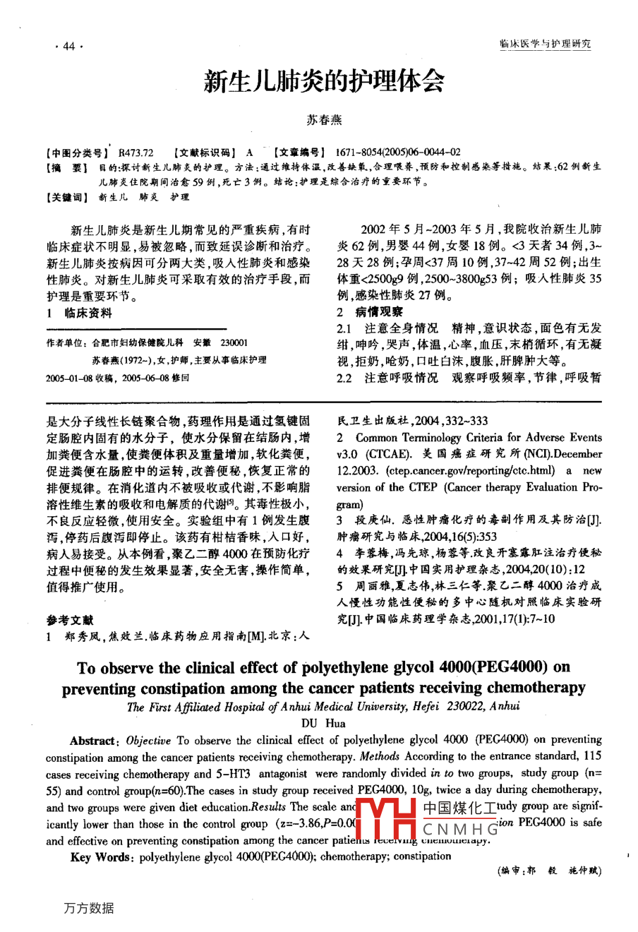 安徽衛(wèi)生職業(yè)技術學院學報2005 年第4卷第6期,.43.聚乙二醇4000預防化療過程中便秘的效果觀察杜華[中圖分類號] R975[文獻標識碼] A [文章編號] 1671-8054(2005)06-0043-02[摘 要]目的:評價聚乙二醇4000預防化療過程中便秘的效果。方法:按入選標準抽取115例化療并同時使用5-HTg受體阻滯劑的病人,隨機分為實驗組55人,對照組60人。實驗組化疔同時口服聚乙二醇4000,每日2次,每次10克,兩組病人同祥接受飲食健康指導。結果:實驗組便秘的發(fā)生程度及發(fā)生率明顯低于對照組(= -3.86.0-0.00;x2=13.66,Pe<0.01)。結論:聚乙二醇4000是預防化療過程中便秘的有效安全的藥物。[關鍵詞]聚乙二醇4000 化療便秘隨著抗癌新藥的不斷涌現(xiàn),聯(lián)合化療藥物的合化療期間均接受同樣飲食健康指導。理使用,腫瘤化療的療效有了較大的提高,然而多1.2.3資料搜集方法:為了保證資料搜集標準的統(tǒng)數(shù)抗癌藥在殺傷或抑制癌細胞的同時,對正常組織一,指定專人負責詢問及搜集資料,時間從化療當和器官有損害和毒性作用。為了減輕化療藥物引起日至化療結束。內(nèi)容包括首次排便時間每日排便的嘔吐,化療過程中常使用5-HT3受體阻滯劑(如次數(shù)、排便時伴隨癥狀、是否使用了大便軟化劑及格拉司瓊、托烷司瓊、潔丹等),可選擇性的阻斷外緩瀉劑、是否采用了手摳大便或灌腸、是否有腸梗周和中樞的5- HT3受體,與5-HT3受體結合而發(fā)生阻或腸麻痹癥狀。止吐作用”。5-HT,體阻滯劑及--些化療藥物均可引1.2.4 便秘程度標準判定4:0級無便秘(本試驗中,起不同程度的便秘,而嚴重影響癌癥病人的生活質(zhì)超過原先排便習慣日數(shù)~ -天以上視為便秘)。I 級量。我科于2004年6月~9月對部分化療病人口服需要用大便軟化劑(如開塞露)或食物調(diào)整。II 級需聚乙二醇4000來預防化療過程中便秘的發(fā)生。聚要,用緩瀉劑。I級需要用手摳出大便或灌腸。IV級乙二醇4000(商品名:福松F0RLAX)是一種長鏈高腸梗阻或中毒性腸麻痹。V級與便秘相關的死亡。分子聚合物,通過氫鍵結合并固定腸腔內(nèi)固有的水1.2.5 統(tǒng)計方法:資料分析用spss10.0軟件,便秘程分子,增加糞便的含水量,軟化糞便。該藥物減輕化度采用秩和檢驗(wilicoxonw),便秘發(fā)生率采用x2療過程中的便秘,效果顯著?,F(xiàn)將結果報告如下。檢驗。1對象與方法 .2結果1.1 對象兩組便秘發(fā)生程度及發(fā)生率見表11.1.1納人標準 :2004年6月-2004年9月人住本表1兩組病人發(fā)生便秘程度及 發(fā)生率比較例院腫瘤科行化療并同時使用5-HT3受體阻滯劑的程度(級)病人。組別例數(shù)0TIM及以上發(fā)生率(%)1.1.2排除標準 :①化療前>3天未解大便者。②有實驗組5549"4210.9習慣性便秘者。③椎體轉移排便異常者。④腸道手術后大便改道者。⑤使用麻醉性止痛藥者。對照組503415843.31.2 方法注:*指49例中包括發(fā)生腹瀉1例。兩組便秘1.2.1 分組:按以上標準抽取病人115例,隨機分發(fā)生程度比較,z=- 3.86,P=0.000;便秘發(fā)生率比較,為2組,實驗組55人,其中男性35人,女性20人x2=13.66,P<0.01。說明兩組之間便秘發(fā)生程度及發(fā)年齡16~81歲,平均年齡58.3歲。對照組60人,其生率差異有顯著性,實驗組療效高于對照組。中男性37人,女性23人,年齡17~78歲,平均年齡3討論56.2歲。兩組在性別、年齡KPS評分方面,經(jīng)統(tǒng)計為了減輕化療藥物引起的嘔吐,我科在化療前學處理,P值均>0.05 ,差別均無顯著性意義,具有可常規(guī)使用5-HT3受體阻滯劑,其止吐效果好的同時,比性。卻引發(fā)了便秘的發(fā)生,加之- -些化療藥物如長春堿1.2.2用法與指導:①試驗組化療同時口服聚乙二類藥物、泰素帝、米托蒽醌類等化療藥物均可引起便醇4000,每袋10克,每次1袋,每天2次,將藥物溶秘,長春堿類藥物偶可發(fā)生麻痹性腸梗阻凹,因而化于水中攪勻后服用。②對照組未服用。③兩組病人療期中國煤化工本例中對照組便秘的發(fā)=影響了病人的生活作者單位:安徽醫(yī)科大學第-附屬醫(yī)院腫輸科合肥23002質(zhì)量CN MHG,可見便秘的危害杜華,女。主管護士,護士長性。便秘重在預防,但如果病人已經(jīng)發(fā)生了便秘,只2005- 09-20收稿, 2005-10-17 修回有采取醫(yī)學干預,為其解除便秘1。聚乙二醇4000,44●臨床醫(yī)學與護理研究新生兒肺炎的護理體會蘇春燕(中團分類號」R473.2 l文獻標識碼] A“[文章編號 1671-8054(2005)06 004-02[摘要]目的:探討新生兒肺炎的護理。 方法:通過維持體溫,改善缺氧,合理喂養(yǎng),預防和控制感染等措施。結果:62例斷生幾肺炎住院期間治愈59例,死亡3例。結論:護理是綜合治療的重要環(huán)節(jié)。[關鍵詞]斷生兒肺炎護理新生兒肺炎是新生兒期常見的嚴重疾病,有時2002年5月-2003年5月,我院收治新生兒肺臨床癥狀不明顯,易被忽略,而致延誤診斷和治療。炎62例,男嬰44例,女嬰18例。<3天者34例,3~新生兒肺炎按病因可分兩大類,吸人性肺炎和感染28天28例;孕周<37周10例,37~42周52例;出生性肺炎。對新生兒肺炎可采取有效的治療手段,而體重<2500g9例,2500~3800g53例;吸入性肺炎35護理是重要環(huán)節(jié)。例,感染性肺炎27例。.1臨床資料2病情觀察2.1注意全身情況 精神 ,意識狀態(tài),面色有無發(fā)作者單位:合肥市婦幼保健院兒科安徽230001紺,呻吟,哭聲,體溫,心率,血壓,末梢循環(huán),有無凝蘇春燕(1972-),女,護師,主要從事臨床護理視,拒奶,嗆奶,口吐