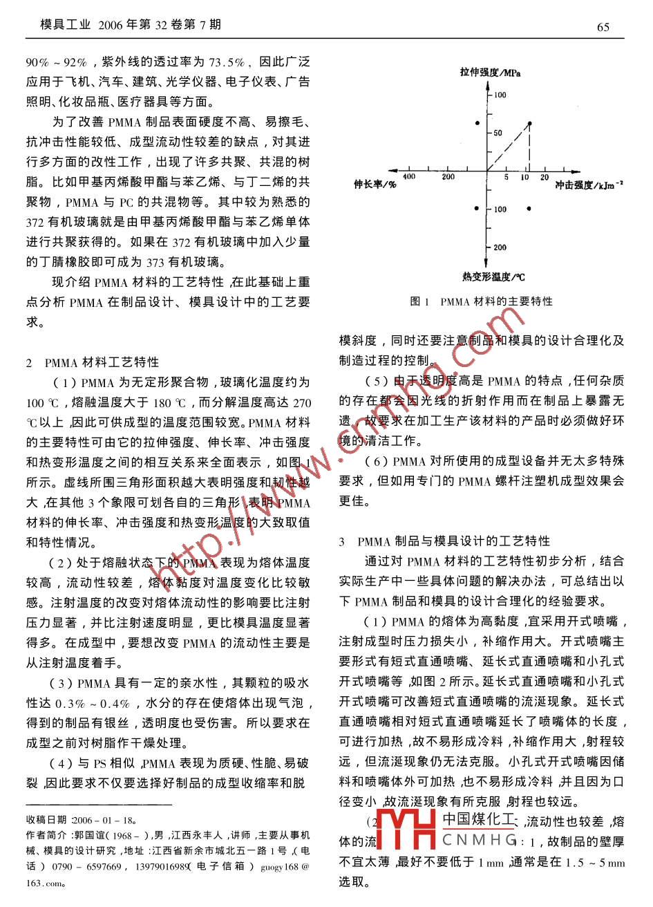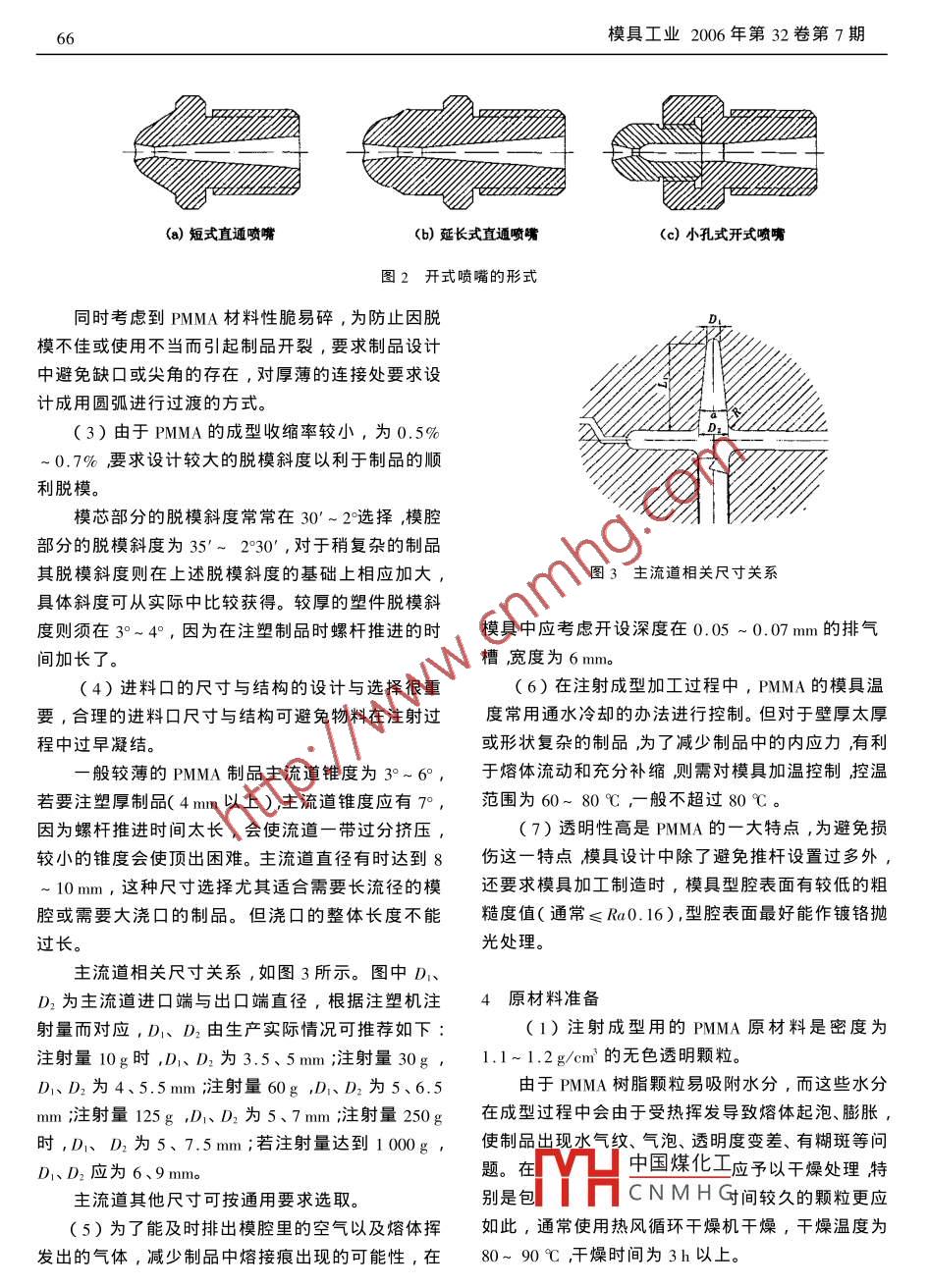 模具工業(yè)2006年第32卷第7期PMMA成型工藝分析郭國誼新余高等??茖W(xué)校機電與自動化工程系,江西新余338031)摘要:在對PMMA材料工藝特性的分析及闡述的基礎(chǔ)上,重點分析PMMA在制品設(shè)計、模具設(shè)計中的工藝要求并分析其制品在注射成型生產(chǎn)中的工藝方法和特點關(guān)鍵詞冮藝特性減型工藝汾分析中圖分類號:TG241獻(xiàn)標(biāo)識碼B文章編號:1001-2168(2006)07-0064-05Analysis on molding process of PMMAGUO Guo-y(Department of Electromechanical and Automation EngineeringXinyu College, Xinyu, Jiangxi 338031, China)Abstract: Based on the analysis on technological characteristic of PMMA materials, the technologicalrequirements in designing products and injection mould for PMMA materials were discussed in de-tails. Then the injection molding process and characteristic were introducedKey words: technological characteristic; molding process; analysis1引言有機玻璃又稱亞加力。它最大特點是透明性好,可PMMA材料的全名為聚甲基丙烯酸甲酯,俗稱與普通的無機玻璃相媲美其太陽光的透光率達(dá)到5切邊程度上減弱凸模和毛坯間的摩擦力對金屬流動的不切邊模如圖14所示,切除終鍛時形成的飛邊,利影響促使金屬從中間向兩端流動在兩端聚集較鍛件靠外形定位。多的金屬。(3)通過制定合適的模鍛工藝,成功模鍛出表面光滑、輪廓清晰、沒有工藝缺陷的活塞尾鍛件,相對于壓鑄工藝,這將在一定程度上提高鍛件的機械性能和汽車空調(diào)壓縮機的整體質(zhì)量。參考文獻(xiàn)]夏巨諶,丁永祥胡國安.閉式模鍛[M].北京機械工圖14切邊模示意圖業(yè)出版社,1991.切邊凸模2.鍛件3.切邊凹?!?]孫海亭施張.高溫強度和耐曆性優(yōu)良的粉末冾金鋁合金活塞[J].小型內(nèi)燃機,9985)26426結(jié)束語3]夏巨諶.精密塑性成形工藝[M].北京機械工業(yè)出版1)在高溫區(qū)450~500℃,傳統(tǒng)的壓鑄成型鋁社,l9合金材料sC00-16可以精密模鍛成型,材料中的硅「4]洪深澤·擠壓工藝及模具設(shè)計[M.北京機械工業(yè)岀組織被細(xì)化,原材料中巨大的硅顆粒打碎成細(xì)小且版社,1996分布均勻的組織,成功開發(fā)了高硅鋁合金鍛造成型5]王江次!M,北京機械工業(yè)出版社中國煤化工工藝(2)對于活塞尾精密模鍛成型工藝,預(yù)鍛成型[6]王CNMHG煙)[M」.北京機械工是關(guān)鍵工步。底面為對稱斜面的預(yù)鍛凸模能在一定業(yè)出版社,1980模具工業(yè)2006年第32卷第7期6590%~92%,紫外線的透過率為73.5%,因此廣泛拉伸強度MPa應(yīng)用于飛機、汽車、建筑、光學(xué)儀器、電子儀表、廣告照明、化妝品瓶、醫(yī)療器具等方面為了改善PMMA制品表面硬度不高、易擦毛抗沖擊性能較低、成型流動性較差的缺點,對其進(jìn)行多方面的改性工作,出現(xiàn)了許多共聚、共混的樹脂。比如甲基丙烯酸甲酯與苯乙烯、與丁二烯的共伸長率/%沖擊強度/kJm2聚物,PMMA與PC的共混物等。其中較為熟悉的372有機玻璃就是由甲基丙烯酸甲酯與苯乙烯單體進(jìn)行共聚獲得的。如果在372有機玻璃中加入少量的丁腈橡膠即可成為373有機玻璃?,F(xiàn)介紹PMMA材料的工藝特性在此基礎(chǔ)上重?zé)嶙冃螠囟?℃點分析PMMA在制品設(shè)計、模具設(shè)計中的工藝要圖1PMMA材料的主要特性求模斜度,同時還要注意制品和模具的設(shè)計合理化及2PMMA材料工藝特性制造過程的控制1)PMMA為無定形聚合物,玻璃化溫度約為(5)由于透明度高是PMMA的特點,任何雜質(zhì)00℃,熔融溫度大于180℃,而分解溫度高達(dá)270的存在都會因光線的折射作用而在制品上暴露無℃以上因此可供成型的溫度范圍較寬。PMMA材料遺,故要求在加工生產(chǎn)該材料的產(chǎn)品時必須做好環(huán)的主要特性可由它的拉伸強度、伸長率、沖擊強度境的清潔工作。和熱變形溫度之間的相互關(guān)系來全面表示,如圖1(6)PMMA對所使用的成型設(shè)備并無太多特殊所示。虛線所圍三角形面積越大表明強度和韌性越要求,但如用專門的PMMA螺桿注塑機成型效果會大在其他3個象限可劃各自的三角形表明PMMA更佳。材料的伸長率、沖擊強度和熱變形溫度的大致取值和特性情況3PMMA制品與模具設(shè)計的工藝特性2)處于熔融狀態(tài)下的PMMA表現(xiàn)為熔體溫度通過對PMMA材料的工藝特性初步分析,結(jié)合較高,流動性較差,熔體黏度對溫度變化比較敏實際生產(chǎn)中一些具體問題的解決辦法,可總結(jié)出以感。注射溫度的改變對熔體流動性的影響要比注射下PMMA制品和模具的設(shè)計合理化的經(jīng)驗要求。壓力顯著,并比注射速度明顯,更比模具溫度顯著1)PMMA的熔體為高黏度,宜采用開式噴嘴,得多。在成型中,要想改變PMMA的流動性主要是注射成型時壓力損失小,補縮作用大。開式嘖嘴主從注射溫度著手。要形式有短式直通噴嘴、延長式直通噴嘴和小孔式3)PMMA具有一定的親水性,其顆粒的吸水開式噴嘴等如圖2所示。延長式直通噴嘴和小孔式性達(dá)θ.3%~0.4%,水分的存在使熔體岀現(xiàn)氣泡,開式嘖嘴可改莕短式直通噴嘴的流涎現(xiàn)象。延長式得到的制品有銀絲,透明度也受傷害。所以要求在直通噴嘴相對短式直通噴嘴延長了噴嘴體的長度成型之前對樹脂作干燥處理可進(jìn)行加熱,故不易形成冷料,補縮作用大,射程較4)與四S相似PMMA表現(xiàn)為質(zhì)硬、性脆、易破遠(yuǎn),但流涎現(xiàn)象仍無法克服。小孔式開式噴嘴因儲裂因此要求不僅要選擇好制品的成型