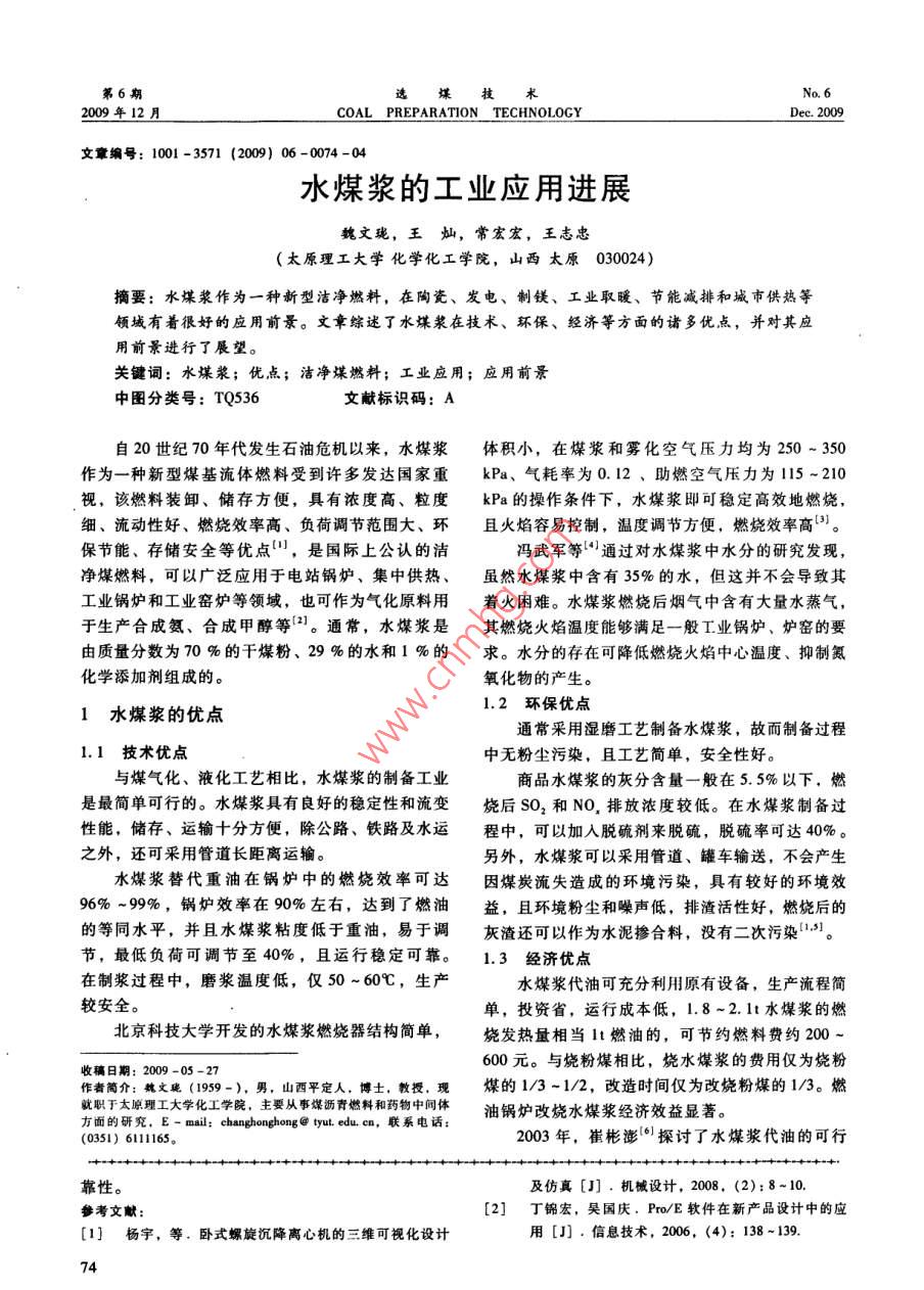 第6期選煤技求2009年12月COAL PREPARATION TECHNOLOGYDec.2009文章編號:1001-3571(2009)06-0074-04水煤漿的工業(yè)應(yīng)用進展魏文瓏,王燦,常宏宏,王志忠(太原理工大學(xué)化學(xué)化工學(xué)院,山西太原030024)摘要:水煤漿作為一種新型潔凈燃料,在陶瓷、發(fā)電、制鎂、工業(yè)取暖、節(jié)能減排和城市供熱等領(lǐng)城有著很好的應(yīng)用前景。文章綜述了水煤漿在技術(shù)、環(huán)保、經(jīng)濟等方面的諸多優(yōu)點,并對其應(yīng)用前景進行了展望。關(guān)鍵詞:水煤漿;優(yōu)點;潔凈煤燃料;工業(yè)應(yīng)用;應(yīng)用前景中圖分類號:TQ536文獻標識碼:A自20世紀70年代發(fā)生石油危機以來,水煤漿體積小,在煤漿和霧化空氣壓力均為250~350作為一種新型煤基流體燃料受到許多發(fā)達國家重kPa、氣耗率為0.12、助燃空氣壓力為ll5~210視,該燃料裝卸、儲存方便,具有濃度高、粒度kPa的操作條件下,水煤漿即可穩(wěn)定高效地燃燒,細、流動性好、燃燒效率高、負荷調(diào)節(jié)范圍大、環(huán)且火焰容易控制,溫度調(diào)節(jié)方便,燃燒效率高保節(jié)能、存儲安全等優(yōu)點,是國際上公認的潔馮武軍等通過對水煤漿中水分的研究發(fā)現(xiàn),凈煤燃料,可以廣泛應(yīng)用于電站鍋爐、集中供熱、雖然水煤漿中含有35%的水,但這并不會導(dǎo)致其工業(yè)鍋爐和工業(yè)窯爐等領(lǐng)域,也可作為氣化原料用著火困難。水煤漿燃燒后煙氣中含有大量水蒸氣于生產(chǎn)合成氨、合成甲醇等]。通常,水煤漿是其燃燒火焰溫度能夠滿足一般工業(yè)鍋爐、爐窯的要由質(zhì)量分數(shù)為70%的干煤粉、29%的水和1%的求。水分的存在可降低燃燒火焰中心溫度、抑制氮化學(xué)添加劑組成的。氧化物的產(chǎn)生。1水煤漿的優(yōu)點1.2環(huán)保優(yōu)點通常采用濕磨工藝制備水煤漿,故而制備過程1.I技術(shù)優(yōu)點中無粉塵污染,且工藝簡單,安全性好。與煤氣化、液化工藝相比,水煤漿的制備工業(yè)商品水煤漿的灰分含量一般在5.5%以下,燃是最簡單可行的。水煤漿具有良好的穩(wěn)定性和流變燒后SO2和NO,排放濃度較低。在水煤漿制備過性能,儲存、運輸十分方便,除公路、鐵路及水運程中,可以加入脫硫劑來脫硫,脫硫率可達40%。之外,還可采用管道長距離運輸。另外,水煤漿可以采用管道、罐車輸送,不會產(chǎn)生水煤漿替代重油在鍋爐中的燃燒效率可達因煤炭流失造成的環(huán)境污染,具有較好的環(huán)境效96%~99%,鍋爐效率在90%左右,達到了燃油益,且環(huán)境粉塵和噪聲低,排渣活性好,燃燒后的的等同水平,并且水煤漿粘度低于重油,易于調(diào)灰渣還可以作為水泥摻合料,沒有二次污染13。節(jié),最低負荷可調(diào)節(jié)至40%,且運行穩(wěn)定可靠。1.3經(jīng)濟優(yōu)點在制漿過程中,磨漿溫度低,僅50~60℃,生產(chǎn)水煤漿代油可充分利用原有設(shè)備,生產(chǎn)流程簡較安全。單,投資省,運行成本低,1.8~2.1t水煤漿的燃北京科技大學(xué)開發(fā)的水煤漿燃燒器結(jié)構(gòu)簡單,燒發(fā)熱量相當lt燃油的,可節(jié)約燃料費約200收稿日期:2009-05-27600元。與燒粉煤相比,燒水煤漿的費用僅為燒粉作者簡介:魏文瓏(1959-),男,山西平定人,博士,教授,現(xiàn)煤的1/3~1/2,改造時間僅為改燒粉煤的1/3。燃就職于太原理工大學(xué)化工學(xué)院,主要從事媒瀝青燃料和藥物中間體油鍋爐改燒水煤漿經(jīng)濟效益顯著。(0351)6ll11652003年,崔彬澎0探討了水煤漿代油的可行靠性。及仿真[J].機械設(shè)計,2008,(2):8-10.參考文獻:[2]丁錦宏,吳國慶,Po/E軟件在新產(chǎn)品設(shè)計中的應(yīng)[1]楊宇,等,臥式螺旋沉降離心機的三維可視化設(shè)計用[J].信息技術(shù),2006,(4):138~139第6期魏文瓏等:水煤漿的工業(yè)應(yīng)用進展200年12月25日性,通過實際計算,得出水煤漿每替代It原油可下,與燃油相比,采用水煤漿成本可降低28%左節(jié)約燃料費為500元,鍋爐的改造總費用為23.3右萬元,而每個采暖期節(jié)約的費用為3257萬元,在水煤漿還可應(yīng)用于陶瓷行業(yè)的噴霧干燥塔中個采暖期內(nèi)即可收回改造成本,可見其經(jīng)濟效益在廣東、福建、河南、山東、湖南等地已有百余家是相當可觀的。大型陶瓷企業(yè)的200余臺熱風(fēng)爐由原來燃燒柴油總之,燃用水煤漿在技術(shù)、環(huán)保、節(jié)能和經(jīng)濟重油、天然氣、焦爐煤氣等改燒水煤漿,每年用水方面都具有明顯的優(yōu)勢,符合我國的環(huán)保產(chǎn)業(yè)政策煤漿量超過200萬t,經(jīng)濟效益十分顯著)。和清潔生產(chǎn)要求。商超兵{3曾介紹了水煤漿的制備方式和水煤2水煤漿的工業(yè)應(yīng)用漿燃燒爐的結(jié)構(gòu),分析了水煤漿對環(huán)境、陶瓷產(chǎn)品的影響,同時也指出了應(yīng)用過程中存在的不足。但根據(jù)中國富煤少油、氣的能源資源特點以及資由于當時水煤漿代油燃燒技術(shù)在陶瓷行業(yè)上的應(yīng)用源利用率較低、環(huán)境污染和浪費嚴重的現(xiàn)狀,在國僅限于噴霧干燥粉料,且由于技術(shù)上的諸多限制家建立資源節(jié)約型能源體系的形勢下,水煤漿作為還不能用于陶瓷生產(chǎn)的窯爐燒成中。節(jié)約和替代石油的潔凈煤利用技術(shù),既符合國情要賈玉寶“介紹了陶瓷生產(chǎn)中水煤漿旋風(fēng)燃燒求,又可保證能源安全”。據(jù)統(tǒng)計,2005年全國