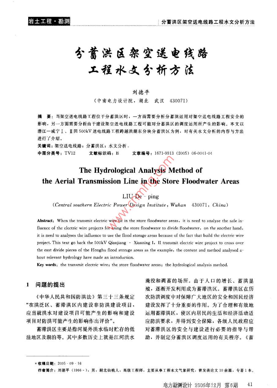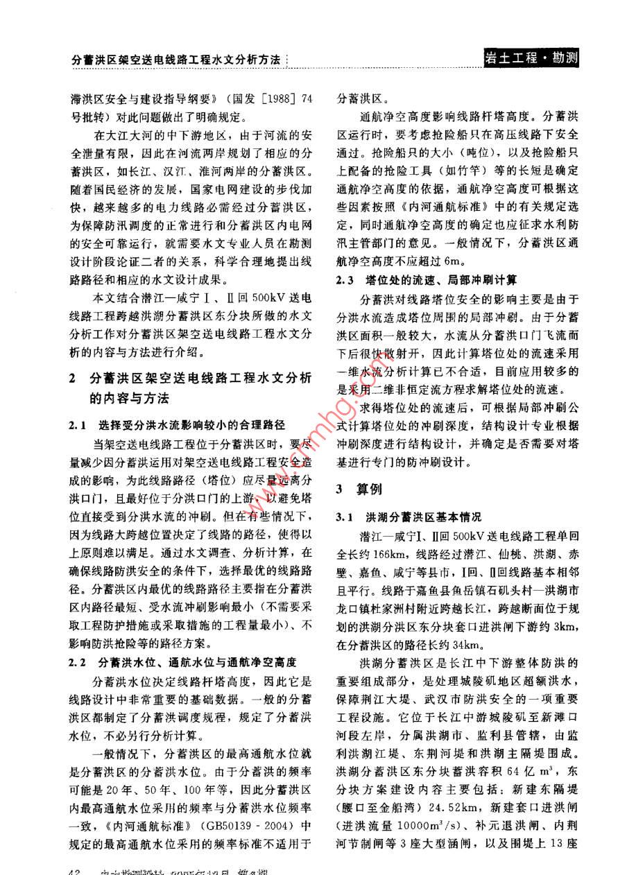巖土工程·勘測分蓄洪區(qū)架空送電線路工程水文分析方法分蓄洪區(qū)架空送電線路工程水女分析方法劉德平(中南電力設(shè)計(jì)院,湖北武漢430071)摘要:當(dāng)架空送電線路T程位于分蓄洪區(qū)時(shí),一方面需要分析分蓄洪運(yùn)用對架空送電線路工程安全的影響,另一方面需要分析由于建設(shè)架空送電線路工程可能對分蓄洪區(qū)的調(diào)度運(yùn)用所產(chǎn)生的影響。本文以潛江一咸寧Ⅰ、Ⅱ回500kV送電線路丁程跨越洪湖東分塊分蓄洪區(qū)為例,對有關(guān)水文分析的內(nèi)容與方法進(jìn)行了介紹。關(guān)鍵詞:架空送電線路;分蓄洪區(qū);水文分析中圖分類號:TV12文獻(xiàn)標(biāo)識碼:B文章編號:1671-9913(2005)06-004104The Hydrological Analysis Method ofthe aerial Transmission Line in the Store Floodwater AreasLIU De ping(Central southern Electric Power Design Institute, Wuhan 430071, China)Abstract: When the transmit electric wire lie in the store floodwater areas, it is need to analyse the safefluence of the electric wire projects for using the store floodwater to divide floodwater, on the another handit is need to analyses the influence to use the flood storage areas becausc of the fact that build the electric wireproject. This text go back the 500kV Qianjiang- Xianning I, II transmit electric wire project to cross overthe east divide pieces of the Honghu flood storage areas as the example, the content and method analysed a-bout relevant hydrology have made an introduction.Key words the transmit electric wire: the store floodwater areas: the hydrological analysis method1問題的提出淹沒和調(diào)蓄的場所。由于人口的增長、蓄洪墾殖,逐漸開發(fā)利用成為蓄滯洪區(qū)。蓄滯洪區(qū)在歷《中華人民共和國防洪法》第三十三條規(guī)定次防洪調(diào)度中對保障廣大地區(qū)的安全和國民經(jīng)濟(jì)“在洪泛區(qū)、蓄滯洪區(qū)內(nèi)建設(shè)非防洪建設(shè)項(xiàng)目,建設(shè)發(fā)揮了十分重要的作用。為了合理和有效地應(yīng)當(dāng)就洪水對建設(shè)項(xiàng)目可能產(chǎn)生的影響和建設(shè)運(yùn)用蓄滯洪區(qū),使區(qū)內(nèi)居民的生活和經(jīng)濟(jì)活動(dòng)適項(xiàng)目對防洪可能產(chǎn)生的影響作出評價(jià)”。應(yīng)防洪要求,并得到安全保障,各級人民政府應(yīng)蓄滯洪區(qū)主要是指河堤外洪水臨時(shí)貯存的低對薔滯洪區(qū)的安全與建設(shè)進(jìn)行必要的指導(dǎo)與幫洼地區(qū)及湖泊等。其中多數(shù)歷史上就是江河洪水助,并制定分蓄洪區(qū)調(diào)度運(yùn)用的有關(guān)程序。《蓄著收稿日期:2005-09-16作者簡介:劉德平(1966-),男,湖北仙桃人,髙級工程師,主要從事工程水文氣象研究,曾發(fā)表論文10余篇,專著1本電力測設(shè)計(jì)2005年12月猬期41分蓄洪區(qū)架空送電線路工程水文分析方法巖土工程·勘滯洪區(qū)安全與建設(shè)指導(dǎo)綱要》(國發(fā)[1988]74分蓄洪區(qū)。號批轉(zhuǎn))對此問題做出了明確規(guī)定通航凈空高度影響線路桿塔高度。分蓄洪在大江大河的中下游地區(qū),由于河流的安區(qū)運(yùn)行時(shí),要考慮搶險(xiǎn)船只在高壓線路下安全全泄量有限,因此在河流兩岸規(guī)劃了相應(yīng)的分通過。搶險(xiǎn)船只的大小(噸位),以及搶險(xiǎn)船只蓄洪區(qū),如長江、漢江、淮河兩岸的分蓄洪區(qū)。上配備的搶險(xiǎn)工具(如竹竿)等的長短是確定隨著國民經(jīng)濟(jì)的發(fā)展,國家電網(wǎng)建設(shè)的步伐加通航凈空高度的依據(jù),通航凈空高度可根據(jù)這快,越來越多的電力線路必需經(jīng)過分蓄洪區(qū),些因素按照《內(nèi)河通航標(biāo)準(zhǔn)》中的有關(guān)規(guī)定選為保障防汛調(diào)度的正常進(jìn)行和分蓄洪區(qū)內(nèi)電網(wǎng)定,同時(shí)通航凈空高度的確定也應(yīng)征求水利防的安全可靠運(yùn)行,就需要水文專業(yè)人員在勘測汛主管部門的意見。一般情況下,分蓄洪區(qū)通設(shè)計(jì)階段論證二者的關(guān)系,科學(xué)合理地提出線航凈空高度不應(yīng)超過6m。路路徑和相應(yīng)的水文設(shè)計(jì)成果。23塔位處的流速、局部沖刷計(jì)算本文結(jié)合潛江一咸寧Ⅰ、Ⅱ回500kV送電分薔洪對線路塔位安全的影響主要是由于線路工程跨越洪湖分蓄洪區(qū)東分塊所做的水文分洪水流造成塔位周圍的局部沖刷。由于分蓄分析工作對分蓄洪區(qū)架空送電線路工程水文分洪區(qū)面積一般較大,水流從分蓄洪口門飛流而析的內(nèi)容與方法進(jìn)行介紹。下后很快散射開,因此計(jì)算塔位處的流速采用2分薔洪區(qū)架空送電線路工程水文分析維水流分析計(jì)算已不合適,目前應(yīng)用較多的的內(nèi)容與方法是采用二維非恒定流方程求解塔位處的流速。求得塔位處的流速后,可根據(jù)局部沖刷公2.1選擇受分洪水流影響較小的合理路徑式計(jì)算塔位處的沖刷深度,結(jié)構(gòu)設(shè)計(jì)專業(yè)根據(jù)當(dāng)架空送電線路工程位于分蓄洪區(qū)時(shí),要盡沖刷深度進(jìn)行結(jié)構(gòu)設(shè)計(jì),并確定是否需要對塔量減少因分蓄洪運(yùn)用對架空送電線路工程安全造基進(jìn)行專門的防沖刷設(shè)計(jì)。成的影響,為此線路路徑(塔位)應(yīng)盡量遠(yuǎn)離分洪口門,且最好位于分洪口門的上游,以避免塔3算例位直接受到分洪水流的沖刷。但在有些情況下,3.1洪湖分蓄洪區(qū)基本情