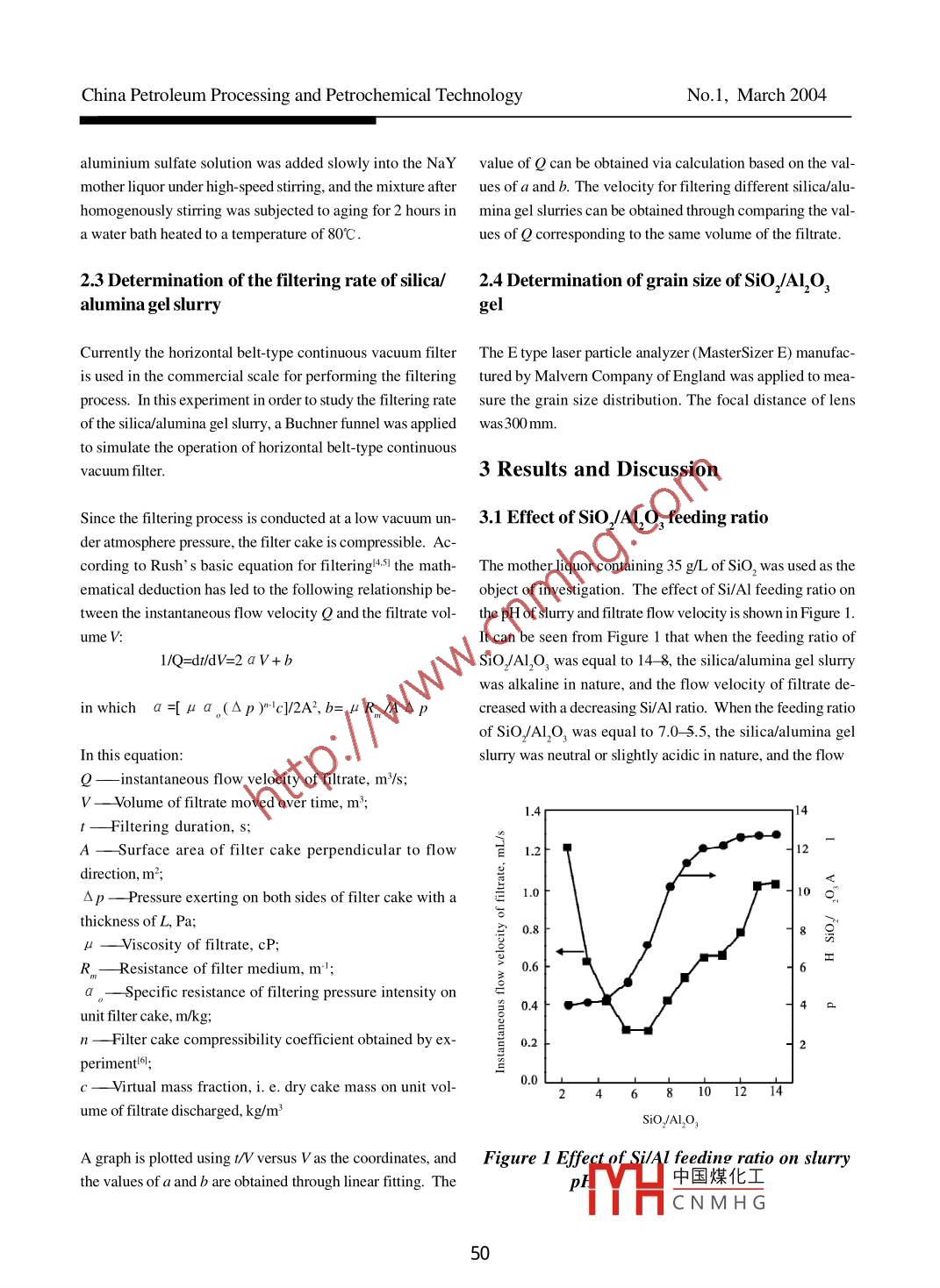 Scientific ResearchStudy on Filtration Performance of Silica/Alumina Slurry in the Process of RecyclingMother Liquor of NaY ZeoliteGuo Yaoqing; Ma Yuelong; Deng Jinghui(Research Institute of Petroleum Processing, Beijing 100083)Abstract: In order to recover the SiO2 contained in the mother liquor in the course of NaY zeolite synthesisto minimize pollution, the influence of various preparation conditions on the filtering velocity of gel slurywas studied using the SiO/A1,O, gel recovered from the NaY mother liquor in the laboratory. The results ofstudy had shown that at a SiO,/Al,O, ratio in the feed equating to 9:1 the SiO2 recovery rate and Al,O,utilization rate were high with a faster flow velocity of the filtrate. The pH value of the system had greatimpact on the flow velocity of filtrate. Between the two methods for regulating the pH value, the one forformation of silica/alumina gel slurry by addition of sulfuric acid prior to adding aluminium sulfate in thesolution could secure a faster filtration velocity. The filtration velocity was decreased in tandem withincreasing SiO, concentration in mother liquor, meanwhile an increase in dry filter cake yield.Key words: NaY zeolite; mother liquor; filtration performance; Si/Al ratio; gel; waste utilization; laboratoryscale1 IntroductionAl,O, gel slurry differs significantly because of the differ-ence in colloidal state of silica/alumina gel. This researchThe synthesis of NaY zeolite generates a large amount of project has conducted a study on the factors affecting thesynthetic mother liquor, which contains a lot of silicate ions filtering rate of the silica/alumina gel slurry and investigatedand caustic soda. The conventional treatment for handling the recovery and utilization rate of SiO2/Al,O, contained insoluble silicate waste liquid is the addition of an acidic the slurry to provide reference data necessary for filteringsolution, which can react with soluble silicate to form silica silica/alumina gel slurry in the commercial unit.gel slurry or a gel slurry containing other components. Thewater is then separated from the gel slurry through separa- 2 Experimentaltion and filtration with the gel filter cake being recovered toreclaim the soluble silica. Recovery and utilization of the said 2.1 Raw materials used in the experimentssynthetic mother liquor has assumed great importance withrespect to realization of“zero discharge”of silica, pollution Aluminium sulfate solution with a mass concentration ofreduction, as well as reduction of production cost.Al,O, equating to 84g/L;WR Grace & Davison Company has published an open infor- NaY mother liquor, technical grade, with a mass concentra-mation on the technique for recovery of mother liquorl"I, while tion of SiO, in mother liquor equating to 35g/L.the catalyst factory of Lanzhou refinery has given a success-ful example for realization of this technique in commercial 2.2 Preparation of silica/alumina gel slurryscalel2-3I. Because different NaY compositions are appliedduring synthesis of zeolite, the NaY mother liquor contains The silica/alumina gel was prenared through precipitate for-various concentrations of SiO,, and the filtering rate of SiO/ mation following中國煤化Itherliquor. TheYHCNMHG19.China Petroleum Processing and Petrochemical TechnologyNo. 1, March 2004aluminium sulfate solution was added slowly into the NaY value of Q can be obtained via calculation based on the val-mother liquor under high-speed stiring, and the mixture after ues of a and b. The velocity for filtering different silica/alu-homogenously stirring was subjected to aging for 2 hours in mina gel slurries can be obtained through comparing the val-a water bath heated to a temperature of 80C.ues of Q corresponding to the same volume of the filtrate.2.3 Determination of the filtering rate of silica/2.4 Determination of grain size of SiO2/Al,O3alumina gel slurrygelCurrently the horizontal belt-type continuous vacuum filter The E type laser particle analyzer (MasterSizer E) manufac-is used in the commercial scale for performing the filtering tured by Malvern Company of England was applied to mea-process. In this experiment in order to study the filtering rate sure the grain size distribution. The focal distance of lensof the silica/alumina gel slurry, a Buchner funnel was applied was 300 mm.to simulate the operation of horizontal belt-type continuousvacum filter.3 Results and DiscussionSince the fltering process is conducted at a low vacuumun- 3.1 Effect of SiO,/AI,O3 feeding ratioder atmosphere pressure, the filter cake is compressible. According to Rush' s basic equation for filtering!4.5I the math- The mother liquor containing 35 g/L of SiO2 was used as theematical deduction has led to the following relationship be-object of investigation. The effect of Si/Al feeding ratio ontween the instantaneous flow velocity Q and the filtrate vol- the pH of slurry and fltrate flow velocity is shown in Figure 1.ume V:It can be seen from Figure 1 that when the feeding ratio of1/Q=dt/dV=2aV+bSiO,/Al,O3 was equal to 14- &, the silica/alumina gel slurrywas alkaline in nature, and the flow velocity of filtrate de-inwhich a=[ μ a,(Ap)"c]/2A',b= μR /A Spcreased with a decreasing Si/Al ratio. When the feeding ratioof SiO,/A1,O, was equal to 7.0- 5.5, the silica/alumina gelIn this equation:slurry was neutral or slightly acidic in nature, and the flowQ一instantaneous flow velocity of filtrate, m/s; .V - Volume of filtrate moved over time, m);1.414Filtering duration, s;A一Surface area of filter cake perpendicular to flow1.2-direction, m;△p - Pressure exerting on both sides of filter cake with a1.0-10 。thickness ofL, Pa;0.8μ - Viscosity of filtrate, cP;xR ,一Resistance of filter medium, mil;0.6a.- Specific resistance of filtering pressure intensity on0.4unit filter cake, m/kg;n一Filter cake compressibility coefficient obtained by ex-).2 Iperiment().0.0ume of filtrate discharged, kg/m3SiO,/AIO,A graph is ploted using /V versus 