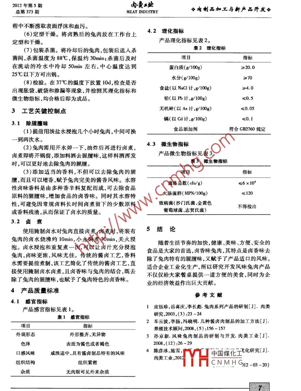 ◆肉制品加工與新產(chǎn)品開發(fā)◆肉′豪些業(yè)2012年第5期MEAT INDUSTRY總第373期鹵味兔肉加工工藝陳興盛本國(guó)王軍鋒李海龍嚴(yán)文南京貝特爾食品科技有限公司江蘇南京210032橢要闡迷了鹵味兔肉的加工工藝、操作關(guān)鍵點(diǎn)及質(zhì)量要求,此加工工藝簡(jiǎn)化了傳統(tǒng)的醬鹵工藝,且鹵香味與兔肉的結(jié)合,既去除了兔肉的腥膻味,也賦予了兔肉特色的鹵香味。關(guān)鍵詞鹵味兔肉加工工藝腌制鹵煮Processing technology of assorted spiced rabbit meatAbstract The assorted spiced rabbit meat processing technology, operating key points and qualityequirements were elaborated; using this processing technology could simplify the traditional sauce halogenand halogen technology, and combine the fragrance with rabbit meat, which not only removed fishy andeepy smell of rabbit meat, but also gave the meat characteristic bittern flavorKeywords assorted spiced rabbit meat; processing technology pickled; cooking俗話說(shuō)“飛禽莫如鴣,走獸莫如兔”。兔肉有1.1原輔料“葷中之素”的說(shuō)法。每百克含優(yōu)質(zhì)蛋白質(zhì)21.6g兔肉、水溶鹵味香料(自產(chǎn))、食用鹽、白砂糖、味比豬肉、羊肉,雞肉,牛肉都高。兔肉中的維生素含量較高,尤以煙酸較多,以干物質(zhì)計(jì),每百克含稍、料酒、植物油、磷酸鹽、醬油。66mg。兔肉中礦物質(zhì)含量也多,鈣含量豐富,因而是2主要設(shè)備孕婦、兒童的營(yíng)養(yǎng)食品。兔肉的膽固醇含量每百克夾層鍋、電子天平、冷藏庫(kù)、真空包裝機(jī)。僅60~80mg,不僅比一般肉類低,比魚類也低。兔加工工藝肉還含有豐富的卵磷脂。卵磷脂有抑制血小板凝聚和防止血栓形成的作用,還有保護(hù)血管壁、防止動(dòng)脈2.1工藝流程硬化的功效。卵磷脂中的膽堿能改善人的記憶力,原料選擇→解凍→焯水過(guò)油→配料腌制→鹵防止腦功能衰退。兔肉不但營(yíng)養(yǎng)豐富,而且是一種煮→定型干燥→包裝殺菌→成品。對(duì)人體十分有益的藥用補(bǔ)品。兔肉有補(bǔ)中益氣、涼2.2工藝要點(diǎn)血解毒功效,可用于病后體虛、消渴。小兒痘疹不出、便血、便秘等,還能增加人體血液中的磷脂,抑制1)原料選擇。選擇新鮮或冷凍兔肉,必須是按膽固醇的有害作用,有助于避免動(dòng)脈粥樣硬化的發(fā)規(guī)定屠宰合格的兔肉。生和發(fā)展。身體虛弱的人,可將兔肉加水煮致極爛(2)解凍、清洗。凍兔肉需放置在干凈衛(wèi)生的解濾出骨肉,飲其汁。兔肉加鯉魚等份燉食,治療慢性凍池中解凍,兔肉應(yīng)完全浸沒(méi)在流動(dòng)的清水中,水溫氣管炎;兔肉加蛇肉等份燉食治癱瘓;兔肉加紅棗適控制在1~5℃,室溫控制在15℃以下,解凍視氣溫量治療虛弱兔肉加胡椒治胃寒,并具有一定抗癌防情況,必須完全解凍,要求無(wú)凍塊和硬塊。解凍后用癌作用。吃兔肉可以阻止血栓的形成,并且對(duì)血管自來(lái)水清洗干凈。壁有時(shí)顯的保護(hù)作用。本文以兔肉為原料簡(jiǎn)易的加(3)焯水過(guò)油。兔肉焯水后瀝于,植物油加熱至工工藝,制得美味的即食類兔肉制品170℃左右時(shí)加入兔肉,過(guò)油2min取出放涼,待腌制。中國(guó)煤化工1材料與設(shè)備(4)配準(zhǔn)確稱量后,溶解于水中CNMHG(5)鹵煮。用腌制鹵水直接鹵煮,注意在煮制過(guò)2012年第5期內(nèi)賣業(yè)總第373期MEAT INDUSTRY◆內(nèi)制品加工與新產(chǎn)品開發(fā)令程中不斷撈取表面浮沫和血污。6)定型干燥。將鹵熟后的兔肉放在工作臺(tái)上4.2理化指標(biāo)定型和干燥。產(chǎn)品理化指標(biāo)見表2。7)包裝殺菌。將冷卻后的兔肉,包裝后送入殺表2理化指標(biāo)菌間,殺菌溫度為88℃,保溫約30min;殺菌后及時(shí)項(xiàng)目指標(biāo)在流動(dòng)的冷水中冷卻50min左右,中心溫度達(dá)到蛋白質(zhì)(g/100g)≥20.025℃以下方可出鍋。水分(g/100g)8)檢驗(yàn)。在37℃的溫度下放置10d,檢查是否出現(xiàn)脹袋、破袋和滲漏等現(xiàn)象,并檢測(cè)其理化指標(biāo)和食鹽(以NaCl計(jì),g/100g)≥4.0微生物指標(biāo),均合格后即為成品鉛(以P計(jì),g100g)3工藝關(guān)鍵控制點(diǎn)無(wú)機(jī)砷(以As計(jì),g/100g)≤0.05鎘(以Cd計(jì),g/100g)3.1除腥膻味(1)提前用淡鹽水浸泡幾個(gè)小時(shí)兔肉,中間可換食品添加劑符合GB2760規(guī)定一到兩次水。(2)兔肉需用開水焯一下,油炸后再進(jìn)行鹵煮4.3微生物指標(biāo)鹵煮即將開鍋前,添加料酒去腥膻味,這樣料酒揮發(fā)產(chǎn)品微生物指標(biāo)見表3。時(shí),可以更好地去除兔肉的腥膻。表3微生物指標(biāo)(3)添加適當(dāng)?shù)南懔?不但可以去除兔肉的腥項(xiàng)目指標(biāo)膻,而且可以增香,賦予兔肉完美的醬香風(fēng)味。水溶菌落總數(shù)(cfu/g)性鹵味香料是由多種香辛料復(fù)配而成,可去除食品原料的腥膻味,增加食品的鹵香味。同時(shí)其水溶特大腸菌群(MPN100g性,可避免因常規(guī)鹵料長(zhǎng)時(shí)間鹵煮留下的少數(shù)原料致病菌(沙門氏菌、金黃色不得檢出或香料殘?jiān)?從而保證了鹵水的質(zhì)量。葡萄球菌、志賀氏菌)3.2鹵煮使用腌制鹵水對(duì)兔肉直接鹵煮鹵煮時(shí)將裝有5結(jié)論兔肉的鹵水燒沸約10min,小火燜煮30min,關(guān)火浸泡。鹵水浸泡和重復(fù)煮一次,可以讓鹵汁充分浸泡隨著生活節(jié)奏的加快,健康、美味、方便、安全的兔肉,鹵味更濃,風(fēng)味尤佳。傳統(tǒng)的醬鹵工藝