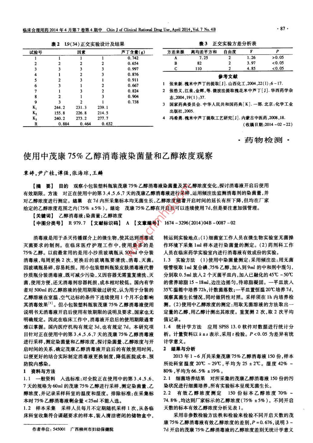 臨床合理用藥2014年4月第7卷第4期中 Chin J of Clinical Rational Drug Use,Apnl2014,voL7Na4B87表2I9(34)正交實(shí)驗(yàn)設(shè)計(jì)及結(jié)果表3正交實(shí)驗(yàn)方差分析表試驗(yàn)號(hào)素蘆丁含量(g)方差來(lái)源離均差平方和自由度F10.747.253.97<0.052345670.997110<0.05參考文獻(xiàn)21232313121233122310.9111張來(lái)新槐米中蘆丁的提取[刀].山西化工,2004,22(1):6-170.8242張浩義,江泉,金輝等.微波法提取槐花米中蘆丁[J]華西藥學(xué)雜20.90489KKK志,0.738244.2231.33國(guó)家藥典委員會(huì)中華人民共和國(guó)藥典[K].一部北京:化學(xué)工業(yè)155.8226.8出版社,2005240.2273.2277.74馮希勇槐米中蘆丁提取工藝研究[J]內(nèi)蒙古中醫(yī)藥,2008,180.6(收稿日期2014-02-22)藥物檢測(cè)使用中茂康75%乙醇消毒液染菌量和乙醇濃度觀察覃婷,尹廣桂,譚強(qiáng),張海瓊,王麟【摘要】目的觀察小包裝塑料瓶裝茂康75%乙醇消毒液染菌量及其乙醇濃度變化探討消毒液開(kāi)啟后使用有效期限。方法對(duì)正在使用中的第34567天的茂康乙醇消毒液進(jìn)行采樣運(yùn)用傾注法監(jiān)測(cè)消毒劑的染菌量,并對(duì)乙醇濃度進(jìn)行測(cè)定。結(jié)果在7d內(nèi)所采集標(biāo)本均無(wú)菌生長(zhǎng),乙醇濃度隨著開(kāi)啟時(shí)間的延長(zhǎng)有所下降,但均在廠家給定的乙醇濃度范圍之內(nèi)(75%±5%)。結(jié)論茂康75%乙醇在開(kāi)啟后可以連續(xù)使用7d,但是要注意加強(qiáng)管理?!娟P(guān)鍵詞】乙醇消毒液;染菌量;乙醇濃度【中圖分類號(hào)】R979.7【文獻(xiàn)標(biāo)識(shí)碼】A【文章編號(hào)】1674-3296(2014)04B-0087-02消毒液是用于殺滅傳播媒介上的微生物使其達(dá)到消毒或轉(zhuǎn)運(yùn)到實(shí)驗(yàn)地點(diǎn):(1)細(xì)菌室工作人員在微生物實(shí)驗(yàn)室無(wú)菌操滅菌要求的制劑。在臨床醫(yī)療護(hù)理工作中,使用最多的是作環(huán)境下采集1ml樣本進(jìn)行染菌量的測(cè)定。(2)藥劑科工作75%乙醇。以前最常用的是用小沙質(zhì)玻璃瓶從500m中分裝人員在臨床藥學(xué)實(shí)驗(yàn)室內(nèi)進(jìn)行消毒液有效成份的實(shí)驗(yàn)。消毒液,每周更換2次,更換后的玻璃瓶要清洗、消毒、滅菌。1.3實(shí)驗(yàn)方法(1)使用中染菌量測(cè)定:采用傾注法:用無(wú)菌因玻璃瓶易碎容易耗損。用小包裝塑料瓶裝皮膚消毒液代替吸管吸取1ml復(fù)合碘、75%乙醇加入到9ml的中和劑中混勻,沙質(zhì)瓶分裝消毒液既可減少污染,又因容器無(wú)需重復(fù)清洗、滅分別取0.5ml放人2個(gè)滅菌平皿內(nèi)加入已融化的45℃~50℃菌使用方便,還無(wú)消毒劑容器耗損成本相對(duì)較低。國(guó)內(nèi)有學(xué)的營(yíng)養(yǎng)瓊脂15-18ml,邊注邊搖勻,待瓊脂凝固。一平皿放人者對(duì)500ml的乙醇溶液的使用期限做過(guò)研究,認(rèn)為用于分裝的35℃溫箱中培養(yǎng)72h,計(jì)數(shù)菌落數(shù);一平皿置恒溫20℃培養(yǎng)7d乙醇溶液在室溫、空氣達(dá)標(biāo)的條件下連續(xù)使用1個(gè)月不會(huì)影響觀察真菌生長(zhǎng)情況,同時(shí)做陰性對(duì)照。采樣須在1h內(nèi)培養(yǎng)檢其消毒效果。但小包裝塑料瓶裝茂康75%乙醇消毒液使用測(cè)。(2)使用中乙醇濃度的測(cè)定:用取無(wú)菌溶液的方法取出說(shuō)明書無(wú)消毒液開(kāi)啟后使用有效期限的說(shuō)明及要求,國(guó)家也無(wú)定量的乙醇用乙醇計(jì)測(cè)出其濃度。重復(fù)測(cè)2次,取2次平均明確規(guī)定。因此在臨床工作中,消毒液開(kāi)啟后的使用期限通常值記錄。難以掌握。國(guó)內(nèi)醫(yī)療機(jī)構(gòu)有規(guī)定3d,也有規(guī)定7d。本研究項(xiàng)1.4統(tǒng)計(jì)學(xué)方法應(yīng)用SPs13.0軟件對(duì)數(shù)據(jù)進(jìn)行統(tǒng)計(jì)分目針對(duì)正在使用中的第34、5、67天的茂康75%乙醇消毒液析。計(jì)量資料以x±5表示,采用t檢驗(yàn)。P<0.05為差異有統(tǒng)進(jìn)行采樣,測(cè)定染菌量和乙醇濃度探討染菌量、乙醇濃度與開(kāi)計(jì)學(xué)意義。啟時(shí)間的關(guān)系,確定茂康乙醇消毒液開(kāi)啟后的有效使用時(shí)間,2結(jié)果與分析以便更好的結(jié)合實(shí)際制定消毒液更換制度,降低醫(yī)院成本、預(yù)2013年1~6月共采集茂康75%乙醇消毒液150份,樣本防院內(nèi)感染。所處科室溫度20℃~29℃,平均為25±2℃。濕度42%1資料與方法80%,平均為66.5%±19%。1.1一般資料入選標(biāo)準(zhǔn):對(duì)全院正在使用中的第3、4、5、6、2.1細(xì)菌培養(yǎng)結(jié)果對(duì)所采集的茂康乙醇消毒液150份的污7天的規(guī)格為60m的茂康75%乙醇進(jìn)行采樣測(cè)定染菌量、乙染狀況進(jìn)行細(xì)菌培養(yǎng),所有實(shí)驗(yàn)標(biāo)本呈現(xiàn)無(wú)菌生長(zhǎng)醇濃度,并記錄采樣科室的溫度和濕度。排除標(biāo)準(zhǔn):在采集標(biāo)2.2有效乙醇濃度測(cè)定150份標(biāo)本乙醇濃度70%~本時(shí)75%乙醇消毒液剩余量<25m不能入選。74.8%,均達(dá)到廠家標(biāo)示的乙醇濃度(75%±5%)。不同開(kāi)啟1.2樣本采集采樣人員每月不定期隨機(jī)采樣1次,從各臨天數(shù)的標(biāo)本有效乙醇濃度分析見(jiàn)表1床科室收集符合課題要求的樣本,裝入清潔密閉的儲(chǔ)物盒中采用非參數(shù)檢驗(yàn)方法秩和檢驗(yàn)來(lái)檢驗(yàn)不同開(kāi)啟天數(shù)的茂康75%乙醇消毒液有效乙醇濃度的差別,P=0.676,說(shuō)明3作者