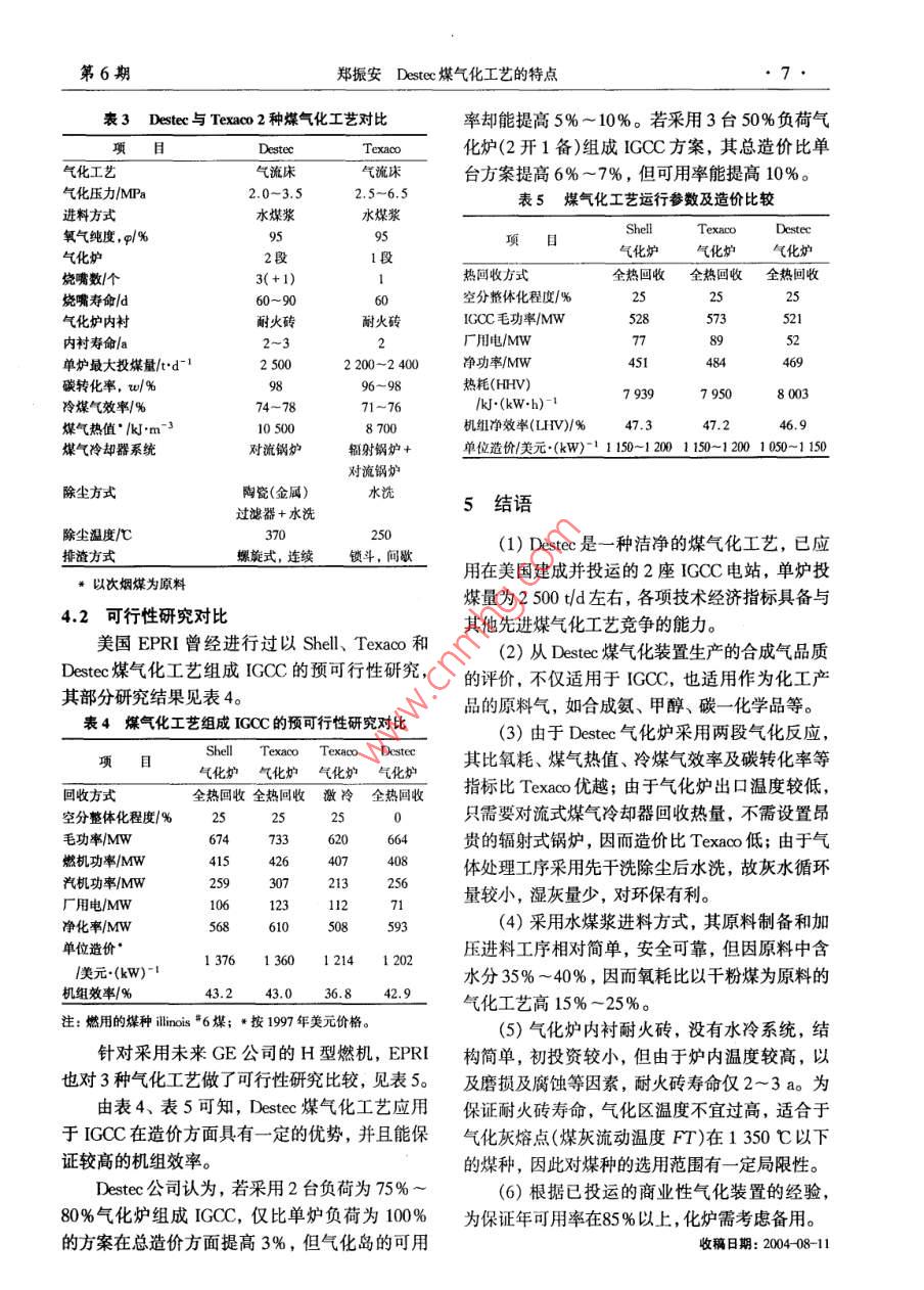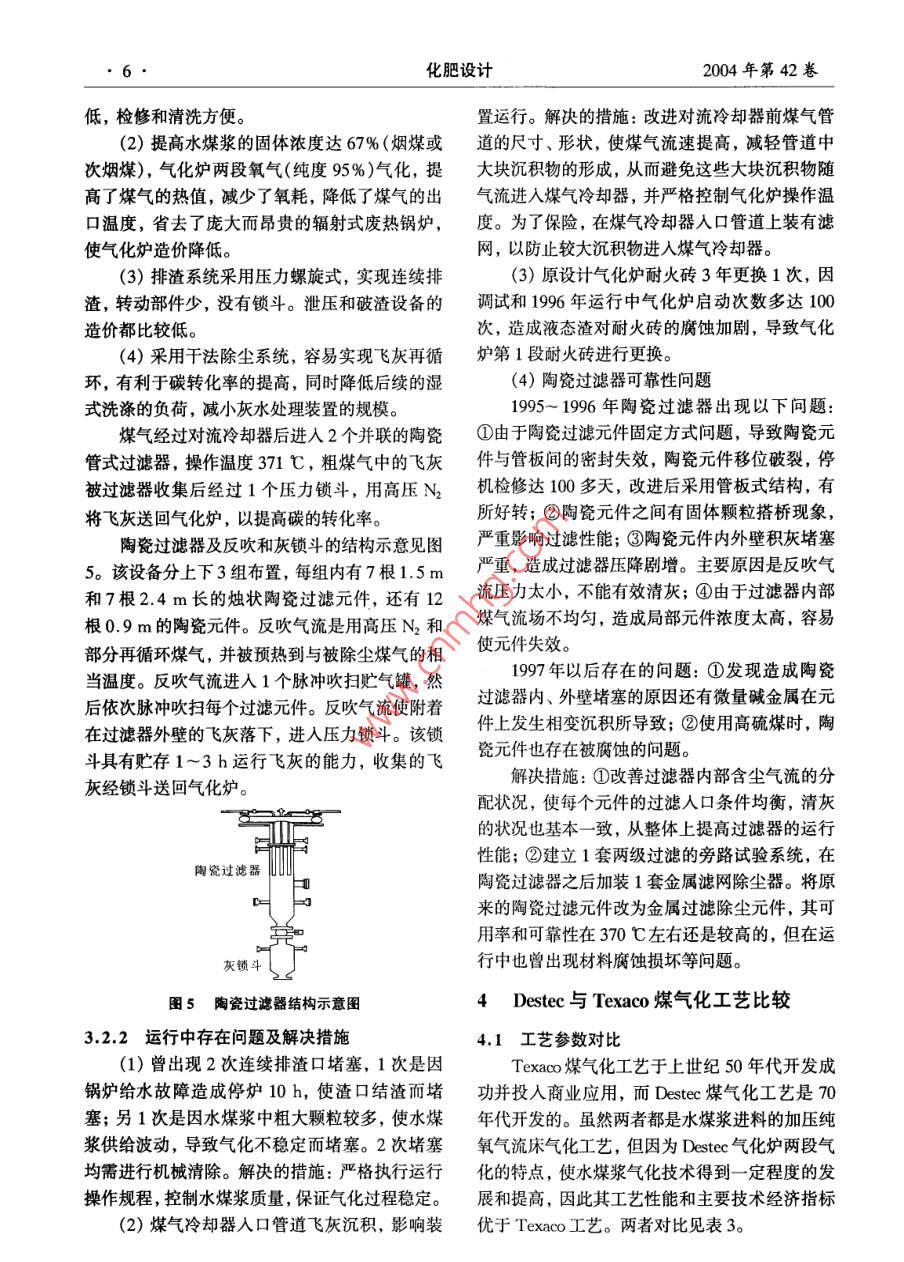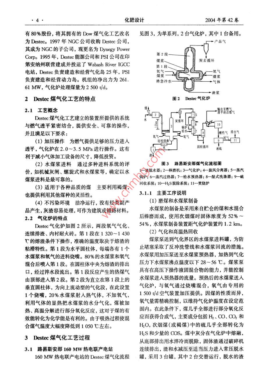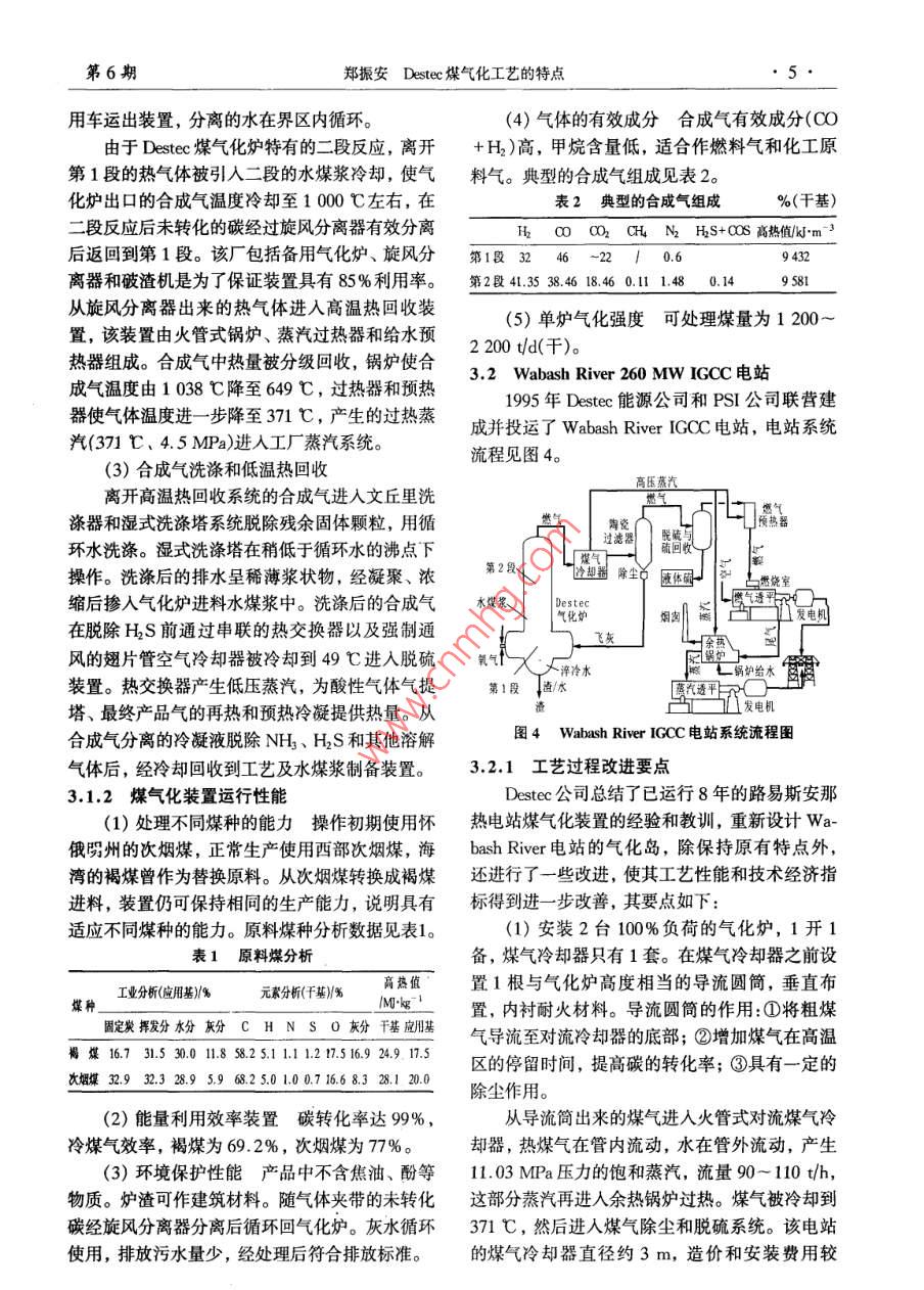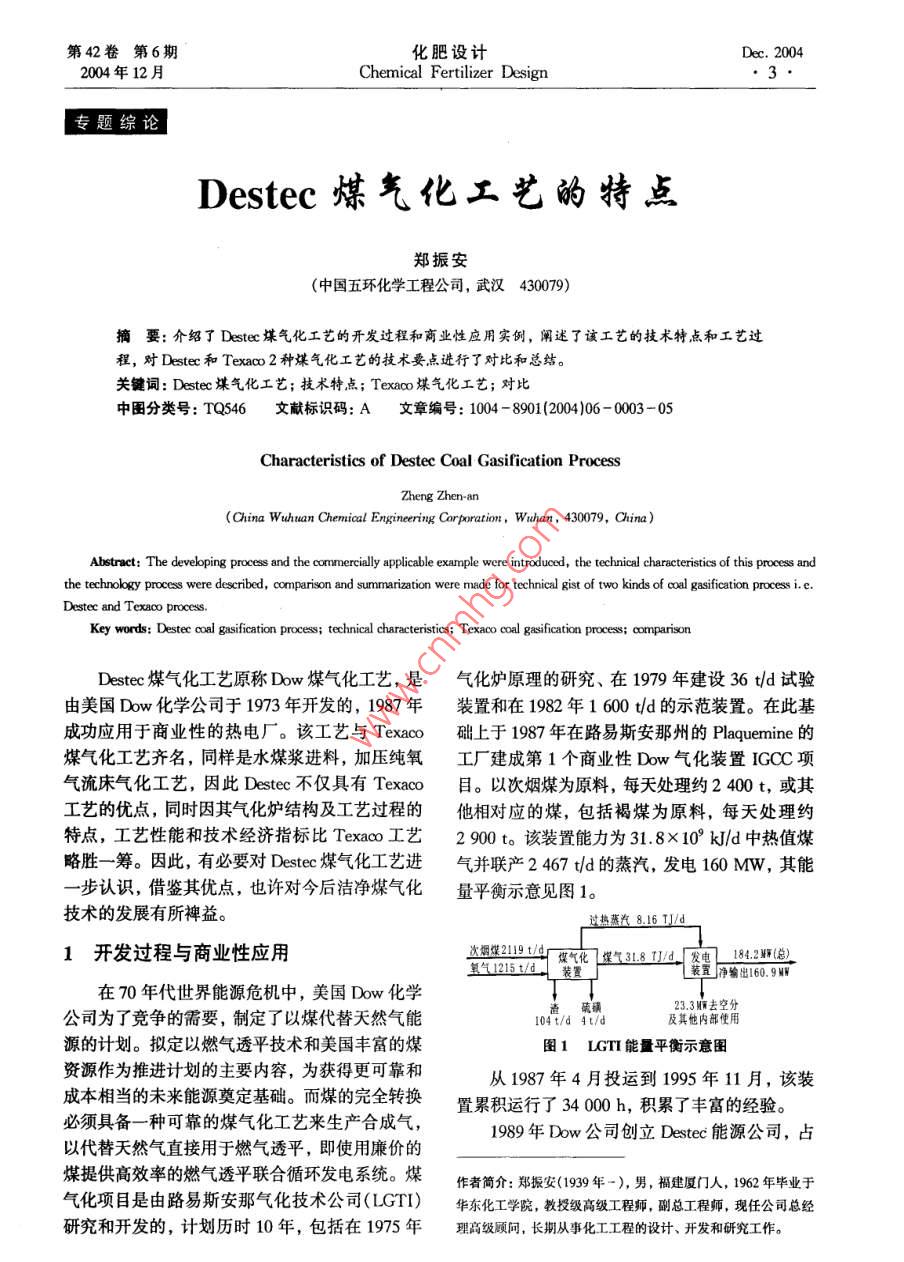 第42卷第6期化肥設(shè)計(jì)Dec. 20042004年12月Chemical Fertilizer Design●3.專(zhuān)題綜論Destec煤氣化工藝的特點(diǎn)鄭振安(中國(guó)五環(huán)化學(xué)工程公司,武漢430079)摘要:介紹了Destec煤氣化工藝的開(kāi)發(fā)過(guò)程和商業(yè)性應(yīng)用實(shí)例,闡述了該工藝的技術(shù)特點(diǎn)和工藝過(guò)程,對(duì)Destec和Texaco 2種煤氣化工藝的技術(shù)要點(diǎn)進(jìn)行了對(duì)比和總結(jié)。關(guān)鍵詞: Destec 煤氣化工藝;技術(shù)特點(diǎn); Texaco煤氣化工藝;對(duì)比中圖分類(lèi)號(hào): TQ546文獻(xiàn)標(biāo)識(shí)碼: A文章編號(hào): 1004 - 8901 (2004)106 -0003-05Characteristics of Destec Coal Gasification ProcessZheng Zhen-an(China Wuhuan Chemial Enginering Crporation,Wuhan, 430079, China)Abstract: The developing process and the comercially pplicable example were introduced, the techniead characteristics of this process andthe technologsy process were described, comparison and summarizarion were made for technical gist of two kinds of coal gasification process ie.Destec and Texaco process.Key words: Destec coal gasification process; technical characteristis; Texaco coal gasification process; comparisonDestec煤氣化工藝原稱(chēng)Dow煤氣化工藝,是氣化爐原理的研究、 在1979年建設(shè)36 t/d 試驗(yàn)由美國(guó)Dow化學(xué)公司于1973年開(kāi)發(fā)的,1987年.裝置和在1982年1 600 t/d的示范裝置。在此基成功應(yīng)用于商業(yè)性的熱電廠(chǎng)。該工藝與Texaco礎(chǔ)上于1987年在路易斯安那州的Plaquemine的煤氣化工藝齊名,同樣是水煤漿進(jìn)料,加壓純氧工廠(chǎng)建成第1個(gè)商業(yè)性Dow氣化裝置IGCC項(xiàng)氣流床氣化工藝,因此Destec不僅具有Texaco目。以次煙煤為原料,每天處理約2400 t,或其工藝的優(yōu)點(diǎn),同時(shí)因其氣化爐結(jié)構(gòu)及工藝過(guò)程的他相對(duì)應(yīng)的煤,包括褐煤為原料,每天處理約特點(diǎn),工藝性能和技術(shù)經(jīng)濟(jì)指標(biāo)比Texaco工藝2 900 t。該裝置能力為31.8x 10° kJ/d中熱值煤略勝一籌。因此,有必要對(duì)Destec煤氣化工藝進(jìn)氣并聯(lián)產(chǎn)2 467 t/d的蒸汽,發(fā)電160 MW,其能-步認(rèn)識(shí),借鑒其優(yōu)點(diǎn),也許對(duì)今后潔凈煤氣化量平衡示意見(jiàn)圖1。技術(shù)的發(fā)展有所裨益。過(guò)熱燕汽8.16 TJ]/d1開(kāi)發(fā)過(guò)程與商業(yè)性應(yīng)用次煙煤2119t/r煤氣化煤氣31.87]/1d發(fā)電184.2.(總)復(fù)氣1215/0裝置裝置凈輸出160.9W在70年代世界能源危機(jī)中,美國(guó)Dow化學(xué)23.3師去空分公司為了競(jìng)爭(zhēng)的需要,制定了以煤代替天然氣能104t/d 4t/d及其他內(nèi)部使用源的計(jì)劃。擬定以燃?xì)馔钙郊夹g(shù)和美國(guó)豐富的煤圖1 LGTI 能量平衡示意圖資源作為推進(jìn)計(jì)劃的主要內(nèi)容,為獲得更可靠和從1987年4月投運(yùn)到1995年11月,該裝成本相當(dāng)?shù)奈磥?lái)能源奠定基礎(chǔ)。而煤的完全轉(zhuǎn)換置累積運(yùn)行了34 000 h,積累了豐富的經(jīng)驗(yàn)。必須具備- -種可靠的煤氣化工藝來(lái)生產(chǎn)合成氣,1989年Dow公司創(chuàng)立Destec能源公司,占以代替天然氣直接用于燃?xì)馔钙剑词褂昧畠r(jià)的煤提供高效率的燃?xì)馔钙铰?lián)合循環(huán)發(fā)電系統(tǒng)。煤作者簡(jiǎn)介:鄭振安(1939年-),男,福建廈門(mén)人,1962年畢業(yè)于氣化項(xiàng)目是由路易斯安那氣化技術(shù)公司(LGTI)華東化工學(xué)院,教授級(jí)高級(jí)工程師,副總工程師,現(xiàn)任公司總經(jīng)研究和開(kāi)發(fā)的,計(jì)劃歷時(shí)10年,包括在1975年理高級(jí)顧問(wèn),長(zhǎng)期從事化工工程的設(shè)計(jì)、開(kāi)發(fā)和研究工作。化肥設(shè)計(jì)2004年第42卷有80%股份,將其擁有的Dow煤氣化工藝改名見(jiàn)圖3,為單系列,2臺(tái)氣化爐,其中1臺(tái)備用。為Desteco 1997 年NGC公司收購(gòu)Destec公司,產(chǎn)品氣其成為NGC的子公司,現(xiàn)更名為Dynegy Power第2段-Corp。1995 年,Destec 能源公司和PSI公司在印煤漿~炭去循環(huán)第安納州聯(lián)營(yíng)建成并投運(yùn)了Wabash River IGCC第1段、電站,Destec 負(fù)責(zé)建造和經(jīng)營(yíng)氣化島25年,PSI氧氣煤漿一煤漿負(fù)責(zé)建造和經(jīng)營(yíng)動(dòng)力島。機(jī)組的凈出力為261.渣急冷水-61 MW,氣化爐處理煤量為2 500 t/d。渣漿2 Destec 煤氣化工藝的特點(diǎn)圖2 Destec 氣化爐2.1工藝概念Destec煤氣化工藝建立的裝置所提供的系統(tǒng)炭循環(huán)與燃?xì)馔钙骄o密結(jié)合,提供安全、可靠的操作,鍋爐心e10并且滿(mǎn)足以下要求:酸性氣得出氣-氧氣(1)加壓操作 為燃?xì)馓峁┳銐虻膲毫M(jìn)入透平,氣化爐在2.0~3.5 MPa進(jìn)行操作。這有固粒循環(huán)液硫利于減小氣體加工設(shè)備的尺寸,降低投資。¥(2)水煤漿進(jìn)料通過(guò)多種進(jìn)料系統(tǒng)的評(píng)圖3路易斯安那煤氣化流程圖價(jià),如機(jī)械灰閘、螺旋式和水煤漿等,確定以水1-渣脫水器; 2--棒磨機(jī); 3-氣化爐;4←旋風(fēng)分離器;5- -蒸汽鍋爐; 6-蒸汽過(guò)熱器; 7- -給水預(yù)熱器; 8-濕式洗滌器;9硫煤漿進(jìn)料是最可靠的。.(3)適用于各種品質(zhì)的煤主 要利用褐煤,回收系統(tǒng); 10-HS脫除系統(tǒng); 11-焚燒爐3.1.1主要工序說(shuō)明也提供利用其他煤種的靈活性。(4)不污染環(huán)境潔凈運(yùn)行, 沒(méi)有烴類(lèi)副產(chǎn)(1)磨煤和水煤漿制備品產(chǎn)生,灰渣容易