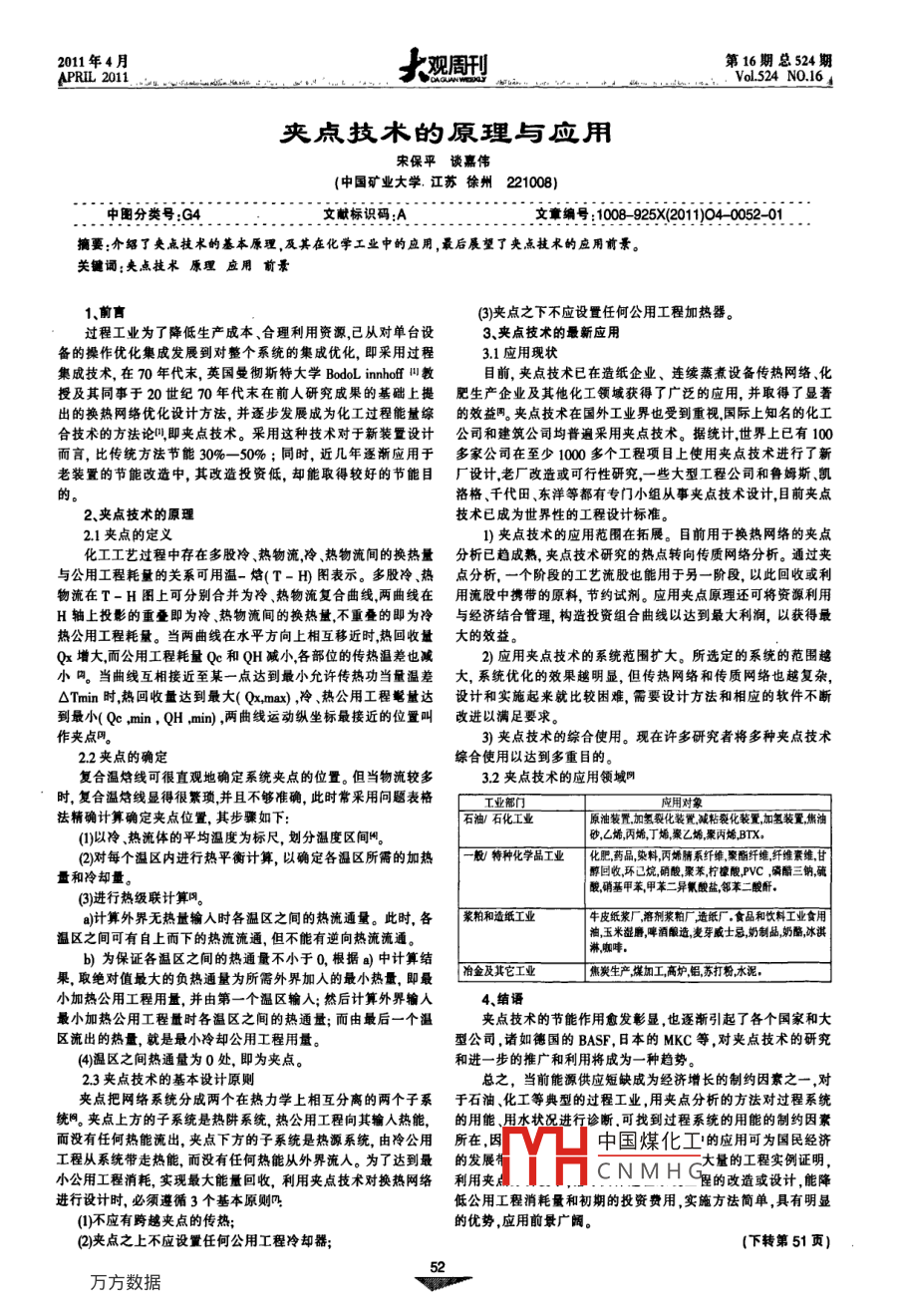 2011年4月觀周刊第16期總524期APRIL 2011VoL.524 NO16夾點(diǎn)技術(shù)的原理與應(yīng)用宋保平談嘉偉中國(guó)礦業(yè)大學(xué)江蘇徐州221008)中圖分類號(hào):G4文獻(xiàn)標(biāo)識(shí)碼:A文章編號(hào):1008925X(2011)040052-01摘要:介紹了央點(diǎn)技術(shù)的基本原理,及其在化學(xué)工業(yè)中的應(yīng)用,最后展望了夾點(diǎn)技術(shù)的應(yīng)用前景。關(guān)鑣詞:夾點(diǎn)技術(shù)原理應(yīng)用前景1、前言(3)夾點(diǎn)之下不應(yīng)設(shè)置任何公用工程加熱器。過程工業(yè)為了降低生產(chǎn)成本、合理利用資源已從對(duì)單臺(tái)設(shè)3、夾點(diǎn)技術(shù)的最新應(yīng)用備的操作優(yōu)化集成發(fā)展到對(duì)整個(gè)系統(tǒng)的集成優(yōu)化,即采用過程31應(yīng)用現(xiàn)狀集成技術(shù),在70年代末,英國(guó)曼徹斯特大學(xué) Bool innhof叫教目前,夾點(diǎn)技術(shù)已在造紙企業(yè)、連續(xù)蒸煮設(shè)備傳熱網(wǎng)絡(luò)、化授及其同事于20世紀(jì)70年代末在前人研究成果的基礎(chǔ)上提肥生產(chǎn)企業(yè)及其他化工領(lǐng)域獲得了廣泛的應(yīng)用,并取得了顯著出的換熱網(wǎng)絡(luò)優(yōu)化設(shè)計(jì)方法,并逐步發(fā)展成為化工過程能量綜的效益兩夾點(diǎn)技術(shù)在國(guó)外工業(yè)界也受到重視國(guó)際上知名的化工合技術(shù)的方法論叫即夾點(diǎn)技術(shù)。采用這種技術(shù)對(duì)于新裝置設(shè)計(jì)公司和建筑公司均普遍采用夾點(diǎn)技術(shù)。據(jù)統(tǒng)計(jì)世界上已有100而言,比傳統(tǒng)方法節(jié)能30%-50%;同時(shí),近幾年逐漸應(yīng)用于多家公司在至少1000多個(gè)工程項(xiàng)目上使用夾點(diǎn)技術(shù)進(jìn)行了新老裝置的節(jié)能改造中,其改造投資低,卻能取得較好的節(jié)能目廠設(shè)計(jì)老廠改造或可行性研究,一些大型工程公司和魯姆斯凱的洛格、千代田東洋等都有專門小組從事夾點(diǎn)技術(shù)設(shè)計(jì)目前夾點(diǎn)2、夾點(diǎn)技術(shù)的原理技術(shù)已成為世界性的工程設(shè)計(jì)標(biāo)準(zhǔn)2.1夾點(diǎn)的定義1)夾點(diǎn)技術(shù)的應(yīng)用范圍在拓展。目前用于換熱網(wǎng)絡(luò)的夾點(diǎn)化工工藝過程中存在多股冷、熱物流冷、熱物流間的換熱量分析已趨成熟,夾點(diǎn)技術(shù)研究的熱點(diǎn)轉(zhuǎn)向傳質(zhì)網(wǎng)絡(luò)分析。通過夾與公用工程耗量的關(guān)系可用溫焙(T-H圖表示。多股冷、熱點(diǎn)分析,一個(gè)階段的工藝流股也能用于另一階段,以此回收或利物流在T-H圖上可分別合并為冷熱物流復(fù)合曲線兩曲線在用流股中攜帶的原料,節(jié)約試劑。應(yīng)用夾點(diǎn)原理還可將資源利用H軸上投影的重疊即為冷、熱物流間的換熱量不重疊的即為冷與經(jīng)濟(jì)結(jié)合管理,構(gòu)造投資組合曲線以達(dá)到最大利潤(rùn),以獲得最熱公用工程耗量。當(dāng)兩曲線在水平方向上相互移近時(shí)熱回收量大的效益。Qx增大而公用工程耗量q和QH減小各部位的傳熱溫差也減2)應(yīng)用夾點(diǎn)技術(shù)的系統(tǒng)范圍擴(kuò)大。所選定的系統(tǒng)的范圍越小四。當(dāng)曲線互相接近至某一點(diǎn)達(dá)到最小允許傳熱功當(dāng)量溫差大,系統(tǒng)優(yōu)化的效果越明顯,但傳熱網(wǎng)絡(luò)和傳質(zhì)網(wǎng)絡(luò)也越復(fù)雜,△Tmin時(shí)熱回收量達(dá)到最大( Qx, max),冷、熱公用工程憋量達(dá)設(shè)計(jì)和實(shí)施起來就比較困難,需要設(shè)計(jì)方法和相應(yīng)的軟件不斷到最小(qe,min,QH,min),兩曲線運(yùn)動(dòng)縱坐標(biāo)最接近的位置叫改進(jìn)以滿足要求。作夾點(diǎn)夾點(diǎn)技術(shù)的綜合使用。現(xiàn)在許多研究者將多種夾點(diǎn)技術(shù)22夾點(diǎn)的確定綜合使用以達(dá)到多重目的。復(fù)合溫焓線可很直觀地確定系統(tǒng)夾點(diǎn)的位置。但當(dāng)物流較多32夾點(diǎn)技術(shù)的應(yīng)用領(lǐng)域網(wǎng)時(shí),復(fù)合溫焓線顯得很繁瑣并且不夠準(zhǔn)確,此時(shí)常采用問題表格應(yīng)用對(duì)象法精確計(jì)算確定夾點(diǎn)位置,其步驟如下:石油/石化工業(yè)原油裝置加氫裂化裝置減粘裂化裝置,加氫裝置焦油)以冷、熱流體的平均溫度為標(biāo)尺,劃分溫度區(qū)間。砂,L烯丙烯丁烯聚乙烯聚丙烯BIX(2對(duì)每個(gè)溫區(qū)內(nèi)進(jìn)行熱平衡計(jì)算,以確定各溫區(qū)所需的加熱數(shù)特種化學(xué)品工業(yè)化肥藥品染料丙烯系纖維酶纖纖維素維甘量和冷卻量。酸硝基甲苯甲苯二異氟酸鹽鄰二酸舵,三鈉硫醇回收環(huán)已烷硝酸聚苯檸檬酸PVc(3)進(jìn)行熱級(jí)聯(lián)計(jì)算同。0計(jì)算外界無(wú)熱量輸入時(shí)各溫區(qū)之間的熱流通量。此時(shí)各(相和造紙工業(yè)牛皮紙漿廠溶劑漿粕廠造紙廠,食品和飲料工業(yè)食用溫區(qū)之間可有自上而下的熱流流通,但不能有逆向熱流流通油玉米濕磨啤酒釀造麥芽威士忌奶制品奶酪冰淇b)為保證各溫區(qū)之間的熱通量不小于0,根據(jù)a)中計(jì)算結(jié)果,取絕對(duì)值最大的負(fù)熱通量為所需外界加入的最小熱量,即最冶金及其它工業(yè)焦炭生產(chǎn)煤加工高爐,鋁蘇打粉水泥小加熱公用工程用量,并由第一個(gè)溫區(qū)輸人;然后計(jì)算外界輸入4、結(jié)語(yǔ)最小加熱公用工程量
