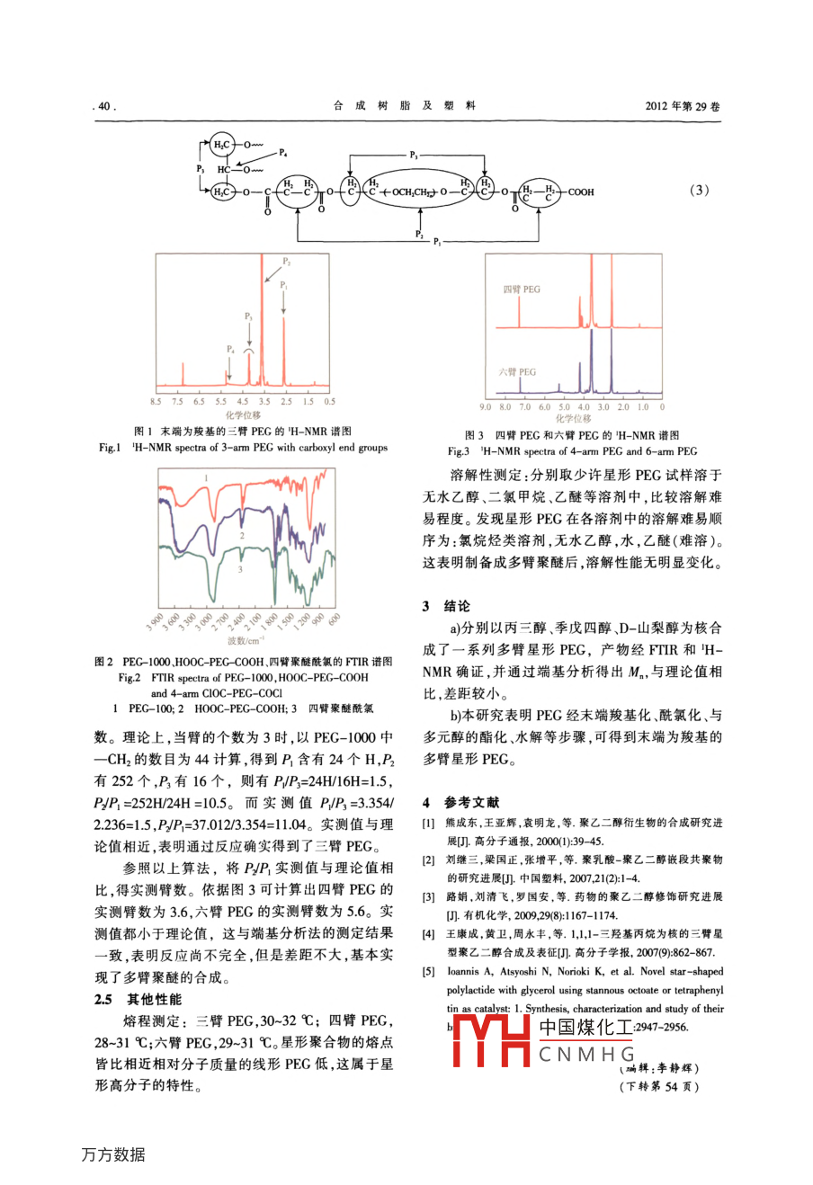 研究與開發(fā)合成樹脂及塑料,2012,29(4):38CHINA SYNTHETIC RESIN AND PLASTICS多臂星形聚乙二醇的合成張海連,郭暉,向清祥(樂山師范學(xué)院化學(xué)與生命科學(xué)學(xué)院,四川省樂山市614004)摘要:聚乙二醇(PEG)經(jīng)與丁二酸酐發(fā)生酯化后,在兩末端引入羧基,再與氯化亞砜反應(yīng)得到聚乙二醇酰氯,此產(chǎn)物再分別與丙三醇季戊四醉或D-山梨醇等多元醇反應(yīng),可分別得到三臂、四臂和六臂星形PEG用傅里葉變換紅外光譜和核磁共振氫譜等對(duì)各產(chǎn)物進(jìn)行了表征,端基分析法得到三臂、四臂和六臂PEG的數(shù)均分子量平均值分別為3794,4738,6432,表明采用上述合成路線可成功得到末端為羧基的多臂星形PEG關(guān)鍵詞:聚乙二醇星形聚合物多元醇酰氯化中圖分類號(hào):TQ326.5文獻(xiàn)標(biāo)識(shí)碼:B文章編號(hào):1002-1396201204-0038-04聚乙二醇(PEG)及其衍生物,既可溶于水,又氯仿振蕩,靜置后有白色沉淀,抽濾。濾液用濃鹽可溶于絕大多數(shù)有機(jī)溶劑,相對(duì)分子質(zhì)量范圍很酸調(diào)節(jié)pH值至2-3,再用30mL氯仿舉取,用10寬,從幾百到數(shù)十萬,常用作藥物賦形劑、乳化劑、mL蒸餾水洗滌有機(jī)層,用無水硫酸鈉干燥后,過造紙助劑、潤(rùn)濕劑、原油破乳劑等。對(duì)PEG的改性濾、旋蒸除去氯仿,得白色黏稠物。將此物轉(zhuǎn)移至或共聚物的報(bào)道甚多,這些共聚物一般是嵌段、60mL乙醚中,冷凍沉淀、干燥,得白色蠟狀固體。接枝、超支化或星形聚合物,但星形PEG的合成經(jīng)標(biāo)準(zhǔn)NaOH溶液檢驗(yàn),該固體為羧基封端的方法沒有介紹。星形聚合物具有許多特殊性能(如PEG,即HOOC- PEG-COOH。低結(jié)晶度、低玻璃化轉(zhuǎn)變溫度、較小的流體力學(xué)體1.3聚乙二醇二酰氯(COC-PEG-COC)的合成積、端基數(shù)量更多等),受到科學(xué)界和工業(yè)界的廣將11.657g的HOOC-PEG-COOH、17mL氯泛關(guān)注。星形PEG的制備有“先核后臂”法和“先化亞砜、60mL甲苯在80℃下反應(yīng)24h后,減壓臂后核”兩種方法。前者如多元醇引發(fā)環(huán)氧乙烷蒸餾出未反應(yīng)的氯化亞砜,得黏稠液體,此產(chǎn)物被負(fù)離子或正離子的開環(huán)聚合,此法步驟繁瑣,條件置干燥器中冷卻后變?yōu)辄S棕色固體。取出少量產(chǎn)苛刻。后者直接以市售或端基改性的PEG為臂,物,充分水解后測(cè)定酸值,表明該固體為末端酰氯選擇合適的核制備而成。本工作將通過PEG的化的PEG,即COC-PEG-CO末端羧基化、酰氯化、酯化等一系列反應(yīng),旨在合14多臂星形PEG的合成成以多元醇為核的星形聚醚。將COC-PEG-COCl和一定量的丙三醇(或季戊四醇、D-山梨醇)在90℃下反應(yīng)8h,得深黃1實(shí)驗(yàn)部分褐色黏稠狀液體,冷卻后變?yōu)楣腆w。在固體中加人L.1原料水,充分水解后用二氯甲烷萃取、無水硫酸鈉干燥PEG-1000分析純;氯化亞砜,純度95%:均后,旋蒸除去二氯甲烷,得末端為羧基的星形為成都市科龍化工試劑廠生產(chǎn)。丙三醇,分析純,PEG,分別命名為三臂、四臂和六臂PEG。四川天宇油脂化學(xué)有限公司生產(chǎn)。季戊四醇,分析純,成都金山試劑廠生產(chǎn)。D-山梨醇,乙醇中重結(jié)收稿日期2-01-30晶兩次后使用,四川航嘉生物醫(yī)藥科技有限責(zé)任修回日期:2012-04-28。公司生產(chǎn)。鄰苯二甲酸氫鉀,基準(zhǔn)試劑,中國(guó)成都作者簡(jiǎn)介:張海連,1978年生,講師博士化學(xué)試劑廠生產(chǎn)。中國(guó)科學(xué)瞎成都有機(jī)化學(xué)研中國(guó)煤化工1.2PEG-1000的末端羧基化將25083gPEG-1000,12.518g丁二酸酐和CNMHGI:1 JoI oL。150mL甲苯混合并加熱回流6h后,加入50mL基金項(xiàng)目:樂山師范學(xué)院青年教師科研啟動(dòng)項(xiàng)目(Z0976)第4期張海連等。多臂星型聚乙二醇的合成15測(cè)試方法加入適量水溶解,以酚酞為指示劑,用NaOH溶液傅里葉變換紅外光譜(FIR)分析:采用日本標(biāo)定,平行實(shí)驗(yàn)兩次,測(cè)定聚合物的數(shù)均分子量島津公司生產(chǎn)的 Prestige-21型傅里葉變換紅外(M)。光譜儀KBr壓片。核磁共振氫譜(H-NMR)分析采用德國(guó) Bruker公司生產(chǎn)的 Bruker300MHz型2結(jié)果與討論核磁共振儀,氘代氯仿作溶劑,四甲基硅烷為內(nèi)21HOOC-PEG-COOH的合成標(biāo)。凝膠滲透色譜一十八角激光散射( GPC-MALIS)多臂星形PEG的合成原理見式(1)。羥基封技術(shù)分析:采用美國(guó)Wya公司生產(chǎn)的 WyatHDAWN端的PEG-1000經(jīng)過末端羧基化、酰氯化,再與多HELEOS18角度激光光散射儀,溶劑為N,N-二甲元醇化合物酯化,水解后可得到羧基封端的多臂基甲酰胺,柱流速為0.5mL/min星形聚醚。如不做水解,末端酰氯基團(tuán)還可繼續(xù)端基分析:用配制的O』mol/L鄰苯二甲酸氫與其他官能團(tuán)反應(yīng)制備各種嵌段共聚物,因此,鉀基準(zhǔn)溶液滴定NaOH標(biāo)準(zhǔn)溶液,測(cè)得NaOH濃這種線形或星形的PEG可作為下一步聚合的活性度(cw)為00899mo/L。準(zhǔn)確稱取一定量的產(chǎn)物“種子”。m0,2(甲, PECICOOCH-CHCOOH, socLH或HOHC+CHOHG(COOCH CH COCTh星形PEG(1)OH OHOH OH22產(chǎn)物M,測(cè)定表2多臂星形PEG的端基分析HOOC-PEG-COOH或多臂星形PEG末端皆Tab2 End group analysis of multi-arm PEG含有羧基,并溶于水??筛鶕?jù)酸堿滴定原理測(cè)定試樣wM。計(jì)算公式見式(2)。實(shí)測(cè)值實(shí)測(cè)均值理論值07593683371037943638四臂1049504684706式中:n為試樣中被分析的端羧基的個(gè)數(