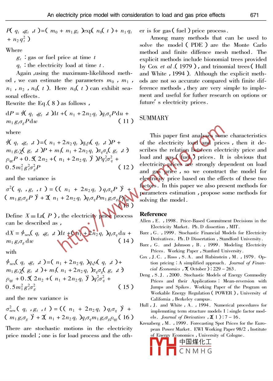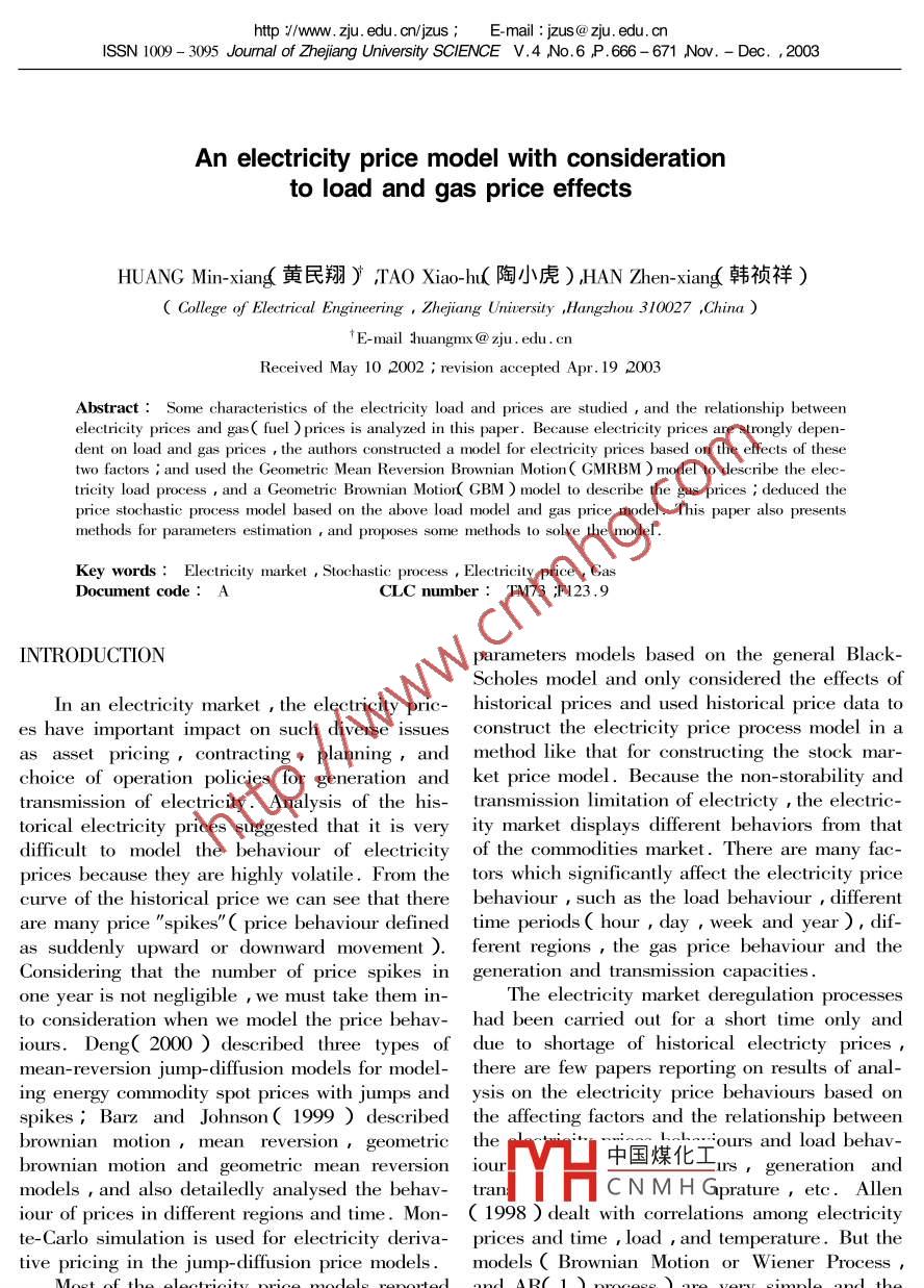 http:/www.zju.educn/jzus;E-mail:jzus@zju.edu.cnISSN 1009-3095 Joumal of Zhejiang University SCIENCE V 4 No 6 P 666-671 Nov.-Dec., 2003An electricity price model with considerationto load and gas price effectsHUANG Min- xiang黃民翔 )i TAO Xiao-hu(陶小虎)han Zhen-xang韓禎祥)College of Electrical Engineering, Zhejiang University, Hangzhou 310027, ChinaTE-mailhuangmx@zju.edu.cnReceived May 10 2002; revision accepted Apr 19 22003Abstract: Some characteristics of the electricity load and prices are studied and the relationship betweenlectricity prices and gas( fuel prices is analyzed in this paper. Because electricity prices are strongly depen-dent on load and gas prices the authors constructed a model for electricity prices based on the effects of thesetwo factors i and used the Geometric Mean Reversion Brownian Motion( GMRBM)model to describe the electricity load process and a Geometric Brownian Motion( GBM ) model to describe the gas prices deduced theprice stochastic process model based on the above load model and gas price model. This paper also presentsmethods for parameters estimation and proposes some methods to solve the modelKey words: Electricity market, Stochastic process, Electricity price GasDocument code: ACLC number: TM73 F123INTRODUCTIONparameters models based on the general BlackScholes model and only considered the effects ofIn an electricity market the electricity pric- historical prices and used historical price data toes have important impact on such diverse issues construct the electricity price process model in aas asset pricing contracting planning, and method like that for constructing the stock marchoice of operation policies for generation and ket price model. Because thee non -stotransmission of electricity. Analysis of the his- transmission limitation of electricty the electrictorical electricity prices suggested that it is very ity market displays different behaviors from thatdifficult to model the behaviour of electricity of the commodities market. There are many facprices because they are highly volatile. From the tors which significantly affect the electricity pricecurve of the historical price we can see that there behaviour such as the load behaviour differentare many price"spikes"( price behaviour defined time periods( hour, day week and year ) difas suddenly upward or downward movement ) ferent regions, the gas price behaviour and theConsidering that the number of price spikes in generation and transmission capacitiesne year is not negligible we must take them inThe electricity market deregulation processesto consideration when we model the price behav- had been carried out for a short time only andiours. Deng( 2000) described three types of due to shortage of historical electricty pricesmean-reversion jump-diffusion models for model- there are few papers reporting on resulting energy commodity spot prices with jumps and ysis on the electricity price behaviours based onspikes Barz and Johnson( 1999) described the affecting factors and the relationship betweenbrownian motion, mean reversion, geometric thebrownian motion and geometric mean reversion iour中國煤化工cars, generation andmodels and also detailedly analysed the behav-tranCNMHGprature, etc.Alleniour of prices in different regions and time. Mon-( 1998) dealt with correlations among electricitte-Carlo simulation is used for electricity deriva- prices and time load and temperature. But thetive pricing in the jump-diffusionels. models( Brownian MotionMost of the electricity price models reported and AR( 1 process )are very simple and thein the literattre are only one-parameter or few- analysis can only be taken as an introductionAn electricity price model with consideration to load and gas price effects667Kreuzberg( 1999) took the generation ,transmision, efficiencies of power plants and startup Table 1 The correlation matrix CM) in PJM in 1999costs, into consideration, but did not analyze theTimecorrelations between them and the electricityLoadprices i he took these factors into the model di0.68rectly. In fact some parameters can be ignoredo small. This pa-0.440.231.O0per' s analysis results showed thatthe gas price and load behaviour is very imporGenerally speaking the load has the followtant. Considering the difficulty of including all ing characteristicsthe factors in thctricity price mod1. Strongly time-dependent( time mean re-took the most important factors, load and gas version and seal). Load changes accordiprice behaviour, as the variables to construct the to different hours everyday and everyday thermodel in the Part Ill of this paper. Simulation are two load peaks one at about 9: 00 AM toresults demonstraded that this model is feasible. 13 00 PM, the other from 16 00 PM to 19 :00PM. In one year most load curves have also twoCHARACTERISTICS OF THE PRICE AND LOAD peaks one in summer and the other in winteBEHAVIOURThe height of the load peaks in different areasare different. For example in the USa the peakin summer is higher than the one in winter butBecause of its non-storablility and limitationsIn Germanythe opposite is trueof transmia2. Region dependent. In different areasspecial commodity. The limitations on the possi- even at the same time, the electricity loads arebilities of transmitting electricity across time and different. It is caused by the different consumpspace strongly affect the behaviour of electricity tion structure at each region. The characteristicsspot and derivative prices as compared to other of electricity load seasonality are also differentcommodities especially the behaviorof the For example, in California or PJM the peak inprice"spikes". The non-storability of electricity summer is higher than that in winter, but in Gerrequires that electricity must be used at the same many the opposite is truetime it is generated. Limitations in transmissiongly temperature dependent. Allencapacity and transmission losses are important (1998)described in detail the relat