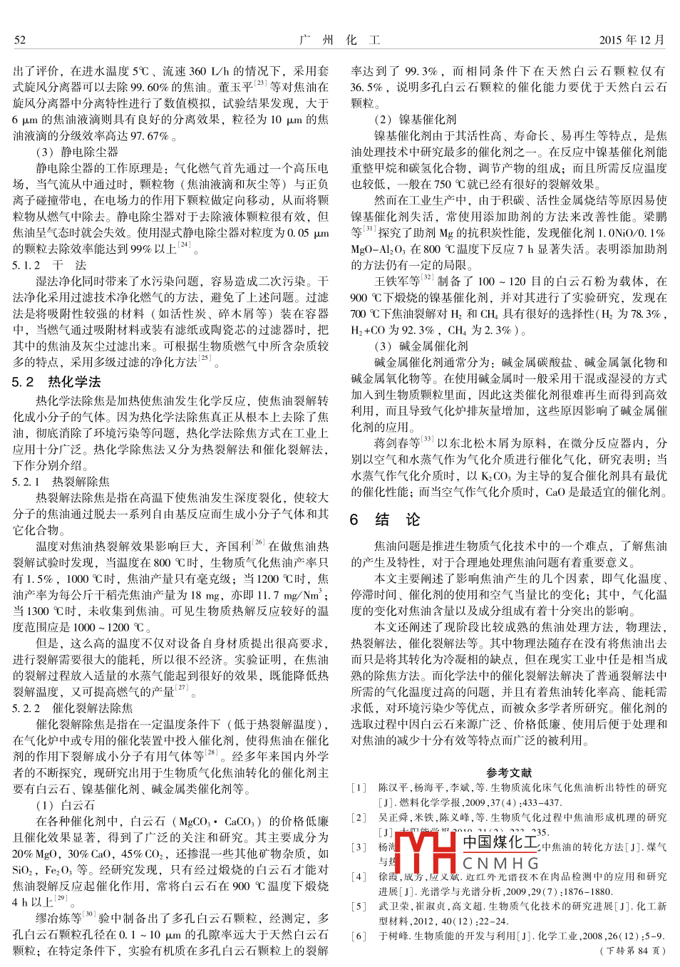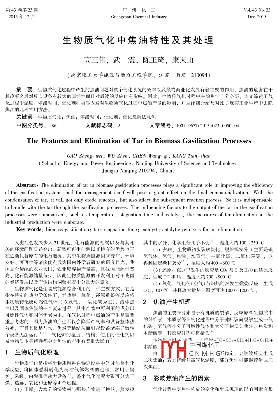 第43卷第23期廣州化工Vol. 43 No 23015年12月Guangzhou Chemical IndustryDec.2015生物質(zhì)氣化中焦油特性及其處理高正偉,武震,陳王琦,康天山(南京理工大學(xué)能源與動力工程學(xué)院,江蘇南京210094)摘要:生物質(zhì)氣化過程中產(chǎn)生的焦油問題對整個氣化系統(tǒng)的效率以及最終商業(yè)化發(fā)展有著重要的作用,焦油的危害在于其冷凝之后對反應(yīng)設(shè)備有較大的腐蝕性而且對后續(xù)的反應(yīng)也有影響。因此,生物質(zhì)氣化過程中去除焦油十分必要。本文綜述了氣化過程中溫度、停滯時間、催化劑種類等因素對生物質(zhì)氣化過程中焦油產(chǎn)量的影響,并且詳細介紹與對比了現(xiàn)實工業(yè)生產(chǎn)中去除焦油的幾種常用方法。關(guān)鍵詞:生物質(zhì)氣化;焦油;停滯時間;催化劑;催化裂解法除焦中圖分類號文獻標(biāo)志碼:A文章編號:1001-96772015)023-0050-04The features and Elimination of Tar in Biomass gasification ProcessesGAO Zheng-wei, WU Zhen, CHEN Wang-gi, KANG Tian-shanSchool of Energy and Power Engineering, Nanjing University of Science and TechnologyJiangsu Nanjing 210094, ChinaAbstract: The elimination of tar in biomass gasification processes plays a significant role in improving the efficiencyof the gasification system, and the management itself will pose a great effect on the final commercialization. With thecondensation of tar, it will not only erode reactors, but also affect the subsequent reaction process. So it is indispensableto handle with the tar through the gasification processes. The influencing factors to the output of the tar in the gasificationprocesses were summarized, such as temperature, stagnation time and catalyst, the measures of tar elimination in thendustrial production were elaborateKey words: biomass gasification; tar; stagnation time; catalyst; catalytic pyrolysis for tar elimination人類社會發(fā)展步入21世紀(jì),化石能源的枯竭以及與其相其中的水分,化學(xué)組分幾乎不變”,溫度大約100~250℃。關(guān)的環(huán)境問題日益突出,新型可再生能源以其特有的優(yōu)勢也正(2)熱解:生物質(zhì)初步裂解炭化,脫除揮發(fā)分(主要是碳在逐漸代替原有的化石能源,其中生物質(zhì)能源因來源廣、環(huán)境氫氣體、氫氣、焦油、水蒸氣、一氧化碳、二氧化碳等),以友好、可再生等諸多優(yōu)點成為國內(nèi)外學(xué)者研究的研究目光。我得到固定碳和灰分,溫度大約400-600C。國是個傳統(tǒng)的農(nóng)業(yè)大國,農(nóng)業(yè)廢棄物產(chǎn)量高,且我國能源消費(3)還原:在這里發(fā)生的反應(yīng)是CO2與C及H2O的還原反高、化石能源儲量偏少,因此生物質(zhì)能源的開發(fā)利用對于我國應(yīng),生成CO和H2,溫度大約700-900℃的經(jīng)濟發(fā)展以及產(chǎn)業(yè)結(jié)構(gòu)調(diào)整有著十分重大的意義。(4)氧化:氣化劑(空氣)與熾熱的炭發(fā)生燃燒反應(yīng),生成生物質(zhì)氣化是生物質(zhì)能源綜合利用的一種主要方式,它是CO2,CO等,并釋放大量熱,溫度可達1000100指在特定的熱力學(xué)條件下,經(jīng)熱解、氧化、還原重整等反應(yīng)將生物質(zhì)轉(zhuǎn)化成可燃性氣體(以氫氣、一氧化碳為主)、液體焦2焦油產(chǎn)生機理油以及固體焦炭的一個復(fù)雜過程,其中產(chǎn)物中可利用的成分以可燃性氣體和固體焦炭為主。在氣化過程中焦油的產(chǎn)生是需要焦油的主要來源來自于有機質(zhì)的裂解,反應(yīng)原料生物質(zhì)中重點考慮的,因為焦油的產(chǎn)生不僅會降低產(chǎn)氣率和設(shè)備整體熱的纖維素、木質(zhì)素等在氣化過程中分子鍵斷裂而裂解生成一氧效率,而且其極易與水、焦炭等粘結(jié)從而引起設(shè)備堵塞導(dǎo)致整化碳、氫氣等小分子可燃性氣體和大分子物質(zhì)如焦油、焦炭和個設(shè)備無法運行"3。氣化爐的溫度、結(jié)構(gòu)、使用的催化劑以木醋酸等。其反應(yīng)過程可概括為6)及生物質(zhì)本身特性都會對焦油的產(chǎn)生有著重大影響3。執(zhí)一崔巖CO+CO2+CH4+H2O+C2H4+木醋酸+中國煤化工1生物質(zhì)氣化原理CNMHG不穩(wěn)定,會繼續(xù)反應(yīng)生成生物質(zhì)氣化是指將生物質(zhì)燃料在特定設(shè)備中經(jīng)過加熱和化次焦油;若是持續(xù)升高氣化溫度,部分焦油可能繼續(xù)生成三學(xué)反應(yīng),將固體燃料轉(zhuǎn)化為清潔氣體燃料的過程,常用于鍋次焦油。爐、采暖、內(nèi)燃機等動力設(shè)備。整個氣化過程大致可分為干3影響焦油產(chǎn)生的因素燥、熱解、氧化和還原等4個過程。(1)干燥:含水分的濕物料與那些產(chǎn)物進行換熱,蒸發(fā)掉氣化過程中對焦油構(gòu)成的變化和生成機理的影響因素有很第43卷第23期高正偉,等:生物質(zhì)氣化中焦油特性及其處理多,主要有反應(yīng)溫度、停滯時間、空氣當(dāng)量比、催化劑、反應(yīng)3.4催化劑壓力以及反應(yīng)設(shè)備種類及其特點等,其中反應(yīng)溫度、停滯時間、空氣當(dāng)量比、催化劑的影響較為顯著。浙江大學(xué)熱能工程研究所在850℃時不同停留時間下高鋁磚、白云石、石灰石、碳化硅4種催化劑的催化效果,其結(jié)3.1反應(yīng)溫度果表明催化效果從高至低依次為高鋁磚,白云石、石灰石、碳目前大多數(shù)學(xué)者普遍認(rèn)為,在一定范圍內(nèi)焦油產(chǎn)量隨氣化化硅,而且隨著停留時間增長,催化效率也越高。此外 Garcia溫度升高而升高,而升至峰值后(約650℃),溫度