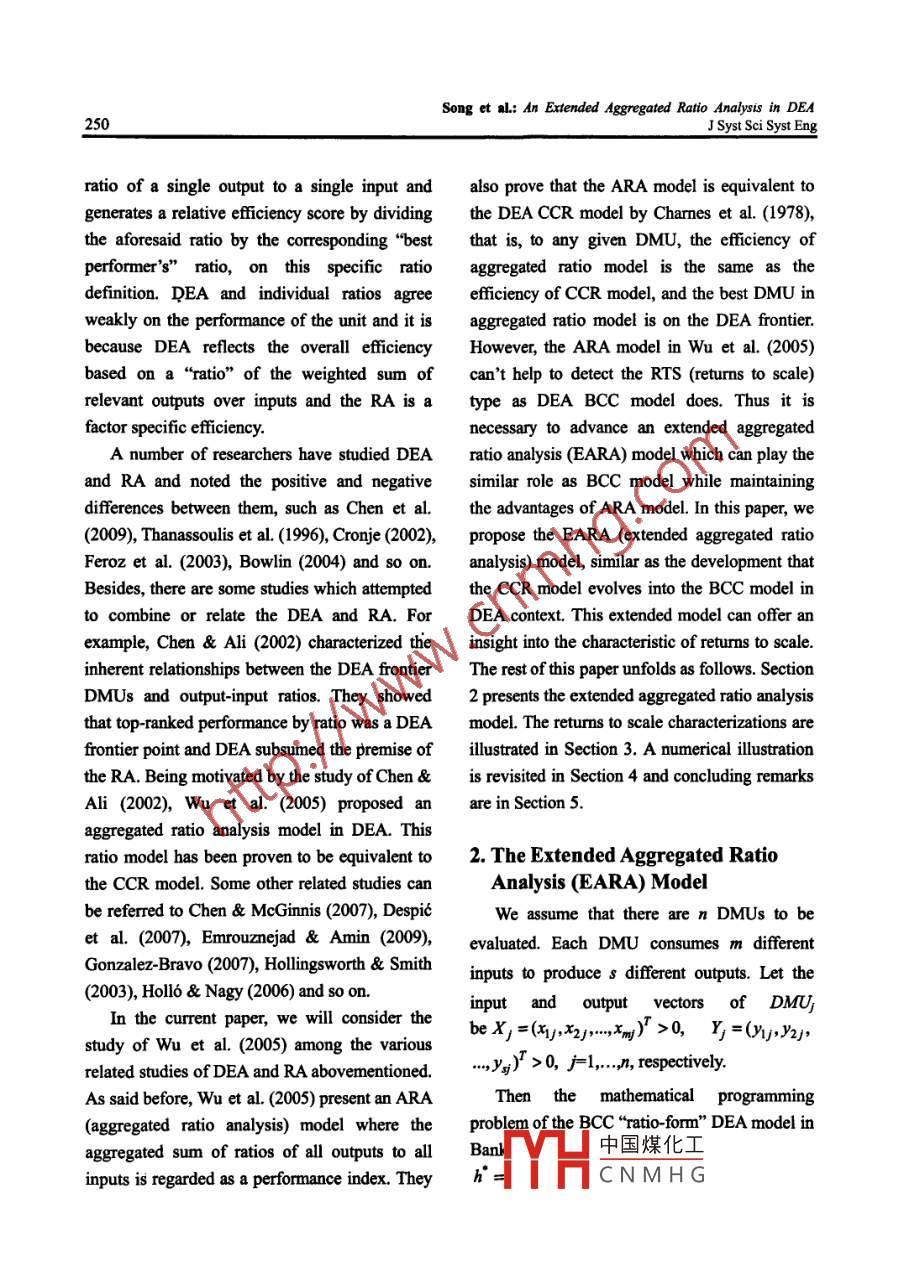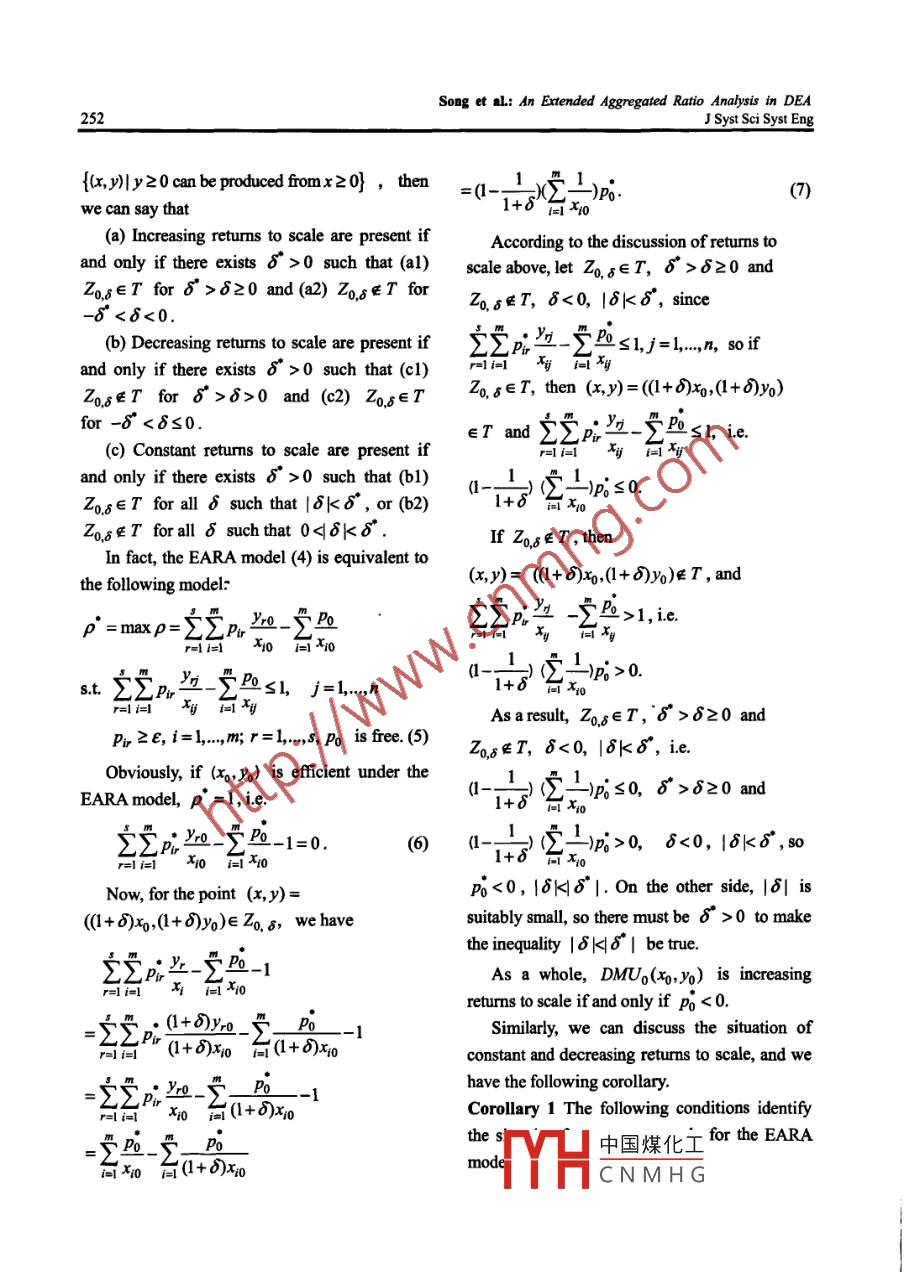 J Syst Sci Syst Eng (Jun 2011) 20(2): 249-256ISSN: 1004-3756 (Paper) 1861-9576 (Online)DOI: 10.1007/s11518-011-5162-1CNII -2983/NTechnical NoteAN EXTENDED AGGREGATED RATIO ANALYSIS IN DEAMalin SONG'Jie Wu2Yumei WANG3'School of Statistics and Applied Mathematics, Anhui University of Finance & Economics, Bengbu, 233030, Chinasongmartin@163.com (網(wǎng))School ofManagement, University of Science & Technology ofChina, Hefei, 230026, Chinajacky012@mail.ustc.edu.cn'School of Satistics and Applied Mathematics, Anhui University of Finance & Economics, Bengbu, 233030, Chinaacwangyumei@163.comAbstractData Envelopment Analysis (DEA) and Ratio Analysis (RA) are two widely used methods formeasuring units' productivity and any other criteria that could be assessed based on the available inputand output variables. A number of researchers have studied DEA and RA and noted the positive andnegative differences between them. Aggregated ratio analysis (ARA) model, which provide animportant linkage between DEA and RA theory, is. equivalent to the CCR DEA model, and thisequivalence property offers a great deal of opportunities for DEA to be interpreted and applied indifferent ways. This paper extends the results of ARA model and proposes an extended aggregatedratio analysis (EARA) model, similar as the development ftom CCR model to BCC model in DEAcontext. The proposed model can offer an insight into the characteristic of returns to scale, playing thecorresponding role as BCC model does. The numerical example is revisited in the paper and the resultsare compared.Keywords: Data Envelopment Analysis (DEA), aggregated ratio analysis, efficiency evaluation,returs to scale1. Introductionvariables. Although the two methods share theData Envelopment Analysis (DEA) andsame goal, their approach is different in manyRatio Analysis (RA) are two methods foraspects. In brief, DEA is a nonparametricbenchmarking production units' productivity,method that generates a single relative efficiencyproftability or any other criteria that could bescore, while considering multiple inputs andassessed based on the available input and outputoutputs simultaneously. RA, in contrast, uses theThis work is fnancial support by National Natural Science59), Ministry ofEducation Foundation of Humanities and Social Sciences of P.R.中國煤化工aton of NauralScience for Colleges and Universities in Anhui, China (KJ2011AMYHC N M H Gdation of Anbui,China (AHSK07-08D25, AHSKF09-10D116, AHSK09-10D14).◎Systems Engineering Society ofChina and Springer-Verlag Berlin Heidelberg 2011Song et al: An Extended Aggregated Ratio Analysis in DEA250J Syst Sci Syst Engratio of a single output to a single input andalso prove that the ARA model is equivalent togenerates a relative efficiency score by dividingthe DEA CCR model by Charmes et al. (1978),the aforesaid ratio by the corresponding "bestthat is, to any given DMU, the efficiency ofperformer's”ratio, on this specific ratioaggregated ratio model is the same as thedefinition. DEA and individual ratios agreeefficiency of CCR model, and the best DMU inweakly on the performance of the unit and it isaggregated ratio model is on the DEA frontier.because DEA reflects the overall efficiencyHowever, the ARA model in Wu et al. (2005)based on a“ratio” of the weighted sum ofcan't help to detect the RTS (returns to scale)relevant outputs over inputs and the RA is atype as DEA BCC model does. Thus it isfactor specific efficiency.necessary to advance an extended aggregatedA number of researchers have studied DEAratio analysis (EARA) model which can play theand RA and noted the positive and negativesimilar role as BCC model while maintainingdifferences between them, such as Chen et al.the advantages of ARA model. In this paper, we(2009), Thanassoulis et al. (1996), Cronje (2002),propose the EARA (extended aggregated ratioFeroz et al. (2003), Bowlin (2004) and so on.analysis) model, similar as the development thatBesides, there are some studies which attemptedthe CCR model evolves into the BCC model in0 combine or relate the DEA and RA. ForDEA context. This extended model can offer anexample, Chen & Ali (2002) characterized theinsight into the characteristic of returns to scale.inherent relationships between the DEA frontierThe rest of this paper unfolds as follows. SectionDMUs and output-input ratios. They showed2 presents the extended aggregated ratio analysisthat top-ranked performance by ratio was a DEAmodel. The returns to scale characterizations arefrontier point and DEA subsumed the premise ofillustrated in Section 3. A numerical illustrationthe RA. Being motivated by the study of Chen &is revisited in Section 4 and concluding remarksAli (2002), Wu et al. (2005) proposed anare in Section 5.aggregated ratio analysis model in DEA. Thisratio model has been proven to be equivalent to2. The Extended Aggregated Ratiothe CCR model. Some other related studies canAnalysis (EARA) Modelbe referred to Chen & McGinnis (2007), DespicWe assume that there are n DMUs to beet al. (2007), Emrouznejad & Amin (2009),evaluated. Each DMU consumes m differentGonzalez- Bravo (2007), Hollingsworth & Smithinputs to produce s different outputs. Let the(2003), Holl6 & Nagy (2006) and so on.inpuand output vectors of DMUIn the current paper, we will consider thebe x,+=(x2..xmy)" >0,y =(Yyj,Y2j,study of Wu et al. (2005) among the variousrelated studies of DEA and RA abovementioned...y).. >0, +.... respetively.As said before, Wu et al. (2005) present an ARAThen themathematicalprogramming(aggregated ratio analysis) model where theproblem of the BCC“ratio-form”DEA model inaggregated sum of ratios of all outputs to allBanl中國煤化工inputs is regarded as a performance index. TheyYHCNMHGSong et l: An ExtendedAggregated Ratio Analysis in DEAJSyst Sci Syst Eng251=它u4ryro -uo)/analysis framework, here we introduce thei=following extended aggregated ratio analysis(EARA) model for DMUg:s.t.(_ny-u)/2xySl,網(wǎng)ρ° =maxp= SpWo -只Poj=.