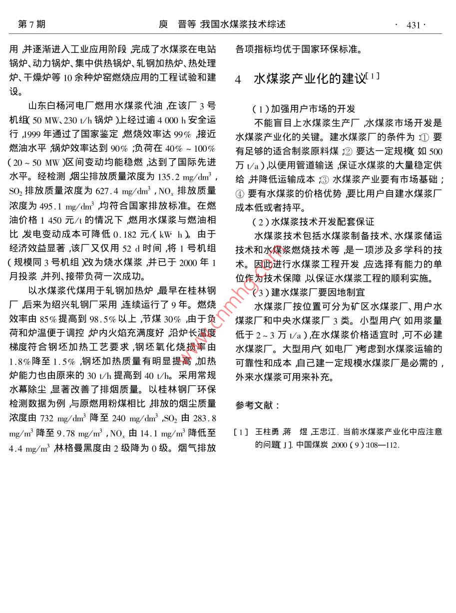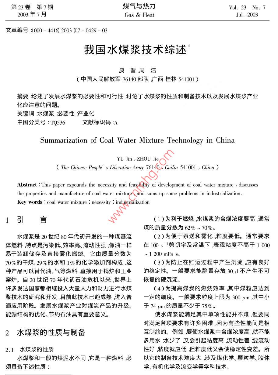 第23卷第7期煤氣與熱力Vol. 23 No. 72003年7月Gas heatJul.2003文章編號:1000-4414200307-0429-03我國水煤漿技術綜述庾晉周潔中國人民解放軍76140部隊廣西桂林541001)摘要淰論述了發(fā)展水煤漿的必要性和可行性討論了水煤漿的性質和制備技術以及發(fā)展水煤漿產業(yè)化應注意的問題關鍵詞水煤漿必要性產業(yè)化中圖分類號:TQ536文獻標識碼:ASummarization of Coal Water Mixture Technology in ChinaYU Jin, ZHoU JieThe Chinese People's Liberation Army 76140, Guilin 541001, ChinaAbstract: This paper expounds the necessity and feasibility of development of coal water mixture discussesthe properties and manufacture of coal water mixture and sums up some problems in industrializationKey words: coal water mixture necessity i industrialization1引言(1)為利于燃燒水煤漿的含煤濃度要高通常煤的質量分數為62%~70%水煤漿是20世紀80年代初開發(fā)的一種煤基流(2)為便于泵送和霧化粘度要低。通常要求體燃料特點是污染低、效率高、流動性強像油一樣在100s-1剪切率及常溫下表觀粘度不高于1000易于裝卸儲存及直接霧化燃燒。它由質量分數為~1200mPas70%的干煤、29%的水和1%的化學添加劑構成這(3)為防止在貯運過程中產生沉淀應有良好種產品可以替代油、氣等燃料直接用于鍋爐和工業(yè)的穩(wěn)定性。一般要求能靜置存放30d不產生不可窯爐。自20世紀70年代初石油危機以來,世界上恢復的硬沉淀。許多發(fā)達國家都相繼投入大量人力和財力進行水煤4)為提高煤炭的燃燒效率其中煤粒應達到漿技術的研究和開發(fā)目前此技術已趨成熟進入普定的細度。一般要求粒度上限為300μm其中小遍應用階段。發(fā)展水煤漿產業(yè)對煤炭產品的升級、于74m的質量不少于75%。能源結構的優(yōu)化、節(jié)約石油具有重要意義。使水煤漿能滿足其中單項性能并不難但要同時滿足各項要求有許多困難因為有些性能間是相2水煤漿的性質與制備互制約的。例如要使水煤漿中含煤濃度高就不能多用水水少了又會引起粘度高流動性差要流動2.1水煤漿的性質性好粘度就應低但粘度低又會使穩(wěn)定性變差。所水煤漿和一般的煤泥水不同,它是一種燃料必以它的制備技術難度大涉及煤化學、顆粒學、膠體須具備下述性質:學、有機化學及流變學等學科技術。430煤氣與熱力2003年2.2水煤漿的制備爐子要求煤炭的灰熔點(t2)高于1250℃。至于要制岀符合上述性能要求的高濃度水煤漿單煤炭的發(fā)熱量、灰分與硫分指標則應根據用戶的需用細煤粉與水簡單混合是無法實現的還必須采取求而定。煤炭的成漿性需對有代表性的煤樣進行專些特殊的技術措施主要有門的試驗研究后才能判定。一般地說煤炭的內在1)要使煤與水能混為一體,至少必須使煤粒水分越低可磨性越好煤中氧含量越低則成漿性能全部為水所浸潤。通常煤顆粒間有較多空隙水越佳首先要將這些空隙充滿才可浸沒全部煤粒所以耗水量大難以做成高濃度水煤漿。為了提高制漿濃3水煤漿技術的發(fā)展與應用度必須使煤顆粒間空隙要少。使空隙最少的技術稱為級配″是制漿的關鍵技術之一。其中涉及兩3.1發(fā)展水煤漿技術的原因項技術,是要能判定什么樣的粒度分布顆粒間空(1)煤炭資源豐富隙少仁二是如何根據給定的煤炭性質與粒度組成制我國煤炭、水電資源十分豐富而石油、天然氣定合理的制漿工藝選擇曆碎設備的類型設計曆機資源相對不足70%以上的一次能源來自煤炭而且的結構與運行參數使之能達到顆粒間空隙少的粒在相當長的時期內這種能源構成狀況不會發(fā)生大度分布。的變化。但隨著經濟發(fā)展和人民生活水平的提高2)煤炭的主體是有機質,它是結構十分復雜石油、天然氣需求大幅度增加到2020年左右石油的大分子碳氫化合物。這些有機質的表面具有強烈缺口將超過消費總量的50%。石油資源的日趨減的疏水性不易為水所潤濕。細煤粉又具有極大的少價格的上下波動使中國的能源安全問題日益突比表面積在水中很容易自發(fā)地彼此聚結這就使煤出因而水煤漿是一種具有戰(zhàn)略意義的潔凈能源。粒與水不能密切結合成為一種漿體在較高濃度時(2)節(jié)能與環(huán)保效果好只會形成一種濕的泥團。所以制漿中必需加入少量作為現實的潔凈煤技術水煤漿技術給我們帶的化學添加劑,即分散劑,以改變煤粒的表面性質,來了清潔、廉價的新型能源既保護了環(huán)境又充分利使煤粒表面緊緊地被添加劑分子和水化膜包圍,讓用了我國的煤炭資源。該技術通過將原煤研成粉煤粒均勻地分散在水中防止煤粒聚結并提高水煤末使用特殊技術脫去原煤中產生污染的部分從而漿的流動性。由于各地煤炭的性質千差萬別適用制成液態(tài)的水煤漿。與原煤相比水煤漿大大降低的添加劑會因煤而異不是一成不變的了損耗和污染提高了燃燒效率而且還可以利用工3)煤漿畢竟是一種固、液兩相粗分散體系煤業(yè)廢水制漿。實踐證明水煤漿在鍋爐和窯爐中的粒又很容易自發(fā)地彼此聚結在重力或其他外力作燃燒效率可高達99%。用下很容易發(fā)生沉淀。為防止發(fā)生硬沉淀必需加3)經濟效益可觀入少量的化學添加劑,即穩(wěn)定劑。穩(wěn)定劑有兩種作使用水煤漿所產生的經濟效益也引起了人們的用,一方面使水煤漿具有剪切變稀的流變特性即當關注它的價格大大低于液化石油氣、天然氣、人工靜置存放