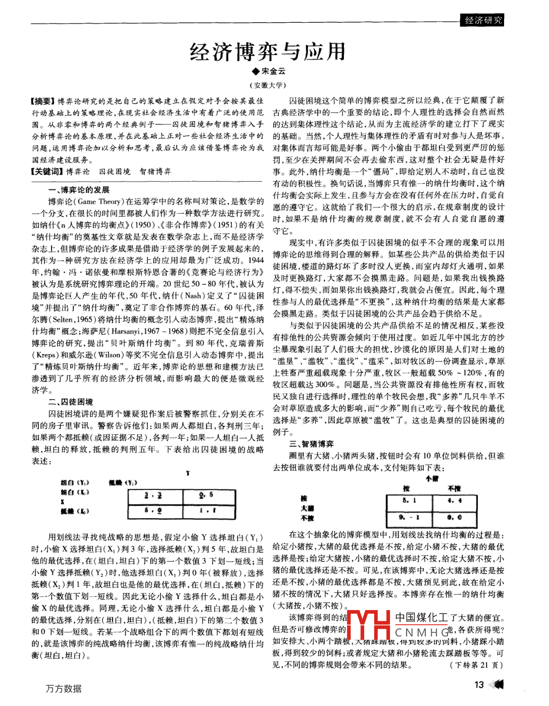 經(jīng)濟(jì)研經(jīng)濟(jì)博弈與應(yīng)用◆宋金云(安徽大學(xué))【摘要】博弈論研究的是把自己的策略建立在假定對手會按其最佳囚徒困境這個簡單的博弈模型之所以經(jīng)典,在于它顛覆了新行動基礎(chǔ)上的策略理論,在現(xiàn)實社會經(jīng)濟(jì)生活中有著廣泛的使用范古典經(jīng)濟(jì)學(xué)中的一個重要的結(jié)論,即個人理性的選擇會自然而然圍。從非零和博弈的兩個經(jīng)典例子——囚徒困境和智豬博弈入手的達(dá)到集體理性這個結(jié)論,從而為主流經(jīng)濟(jì)學(xué)的建立打下了現(xiàn)實分析博弈論的基本原理,并在此基礎(chǔ)上正對一些社會經(jīng)濟(jì)生活中的的基礎(chǔ)。當(dāng)然,個人理性與集體理性的矛盾有時對參與人是壞事問題,運用博弈論加以分析和思考,最后認(rèn)為應(yīng)該借鑒博弈論為我對集體而言卻可能是好事。兩個小偷由于都坦白受到更嚴(yán)厲的懲國經(jīng)濟(jì)建設(shè)服務(wù)。罰,至少在關(guān)押期間不會再去偷東西,這對整個社會無疑是件好【關(guān)鍵詞】博弈論囚徒困境智豬博弈事。此外,納什均衡是一個“僵局”,即給定別人不動時,自己也沒有動的積極性。換句話說,當(dāng)博弈只有惟一的納什均衡時,這個納、博弈論的發(fā)展博弈論( Game Theory)在運籌學(xué)中的名稱叫對策論,是數(shù)學(xué)的什均衡會實際上發(fā)生,且參與方會在沒有任何外在壓力時,自覺自一個分支,在很長的時間里都被人們作為一種數(shù)學(xué)方法進(jìn)行研究。愿的遵守它。這就給了我們一個很大的啟示,在規(guī)章制度的設(shè)計如納什《n人博弈的均衡點》(1950)、《非合作博弈》(1951)的有關(guān)時,如果不是納什均衡的規(guī)章制度,就不會有人自覺自愿的遵“納什均衡”的奠基性文章就是發(fā)表在數(shù)學(xué)雜志上,而不是經(jīng)濟(jì)學(xué)守它雜志上,但博弈論的許多成果是借助于經(jīng)濟(jì)學(xué)的例子發(fā)展起來的,現(xiàn)實中,有許多類似于囚徒困境的似乎不合理的現(xiàn)象可以用其作為一種研究方法在經(jīng)濟(jì)學(xué)上的應(yīng)用卻最為廣泛成功。194博弈論的思維得到合理的解釋。如某些公共產(chǎn)品的供給類似于囚年,約翰·馮·諾依曼和摩根斯特恩合著的《競賽論與經(jīng)濟(jì)行為》徒困境,樓道的路燈壞了多時沒人更換,而室內(nèi)卻燈火通明,如果被認(rèn)為是系統(tǒng)研究博弈理論的開端。20世紀(jì)50-80年代,被認(rèn)為及時更換路燈,大家都不會摸黑走路。問題是,如果我出錢換路是博弈論巨人產(chǎn)生的年代,50年代,納什(Nah)定義了“囚徒困燈,得不償失,而如果你出錢換路燈,我就會占便宜。因此,每個理境”并提出了“納什均衡”,奠定了非合作博弈的基石。60年代,澤性參與人的最優(yōu)選擇是“不更換”,這種納什均衡的結(jié)果是大家都爾騰( Selten,1965)將納什均衡的概念引入動態(tài)博弈,提出“精煉納會摸黑走路。類似于囚徒困境的公共產(chǎn)品會趨于供給不足。什均衡”概念;海薩尼( Harsanyi,1967-1968)則把不完全信息引入與類似于囚徒困境的公共產(chǎn)品供給不足的情況相反,某些沒博弈論的研究,提出“貝葉斯納什均衡”。到80年代,克瑞普斯有排他性的公共資源會傾向于使用過度。如近幾年中國北方的沙( Kreps)和威爾遜( Wilson)等獎不完全信息引入動態(tài)博弈中,提出塵暴現(xiàn)象引起了人們極大的擔(dān)憂,沙漠化的原因是人們對土地的了“精煉貝葉斯納什均衡”。近年來,博弈論的思想和建模方法已“濫墾”、“濫牧”、“濫伐”、“濫采”,如對牧區(qū)的一份調(diào)查顯示,草原滲透到了幾乎所有的經(jīng)濟(jì)分析領(lǐng)域,而影響最大的便是微觀經(jīng)上牲畜嚴(yán)重超載現(xiàn)象十分嚴(yán)重,牧區(qū)一般超載50%~120%,有的濟(jì)學(xué)牧區(qū)超載達(dá)300%。問題是,當(dāng)公共資源沒有排他性所有權(quán),而牧二、囚徒困境民又獨自進(jìn)行選擇時,理性的單個牧民會想,我“多養(yǎng)”幾只牛羊不囚徒困境講的是兩個嫌疑犯作案后被警察抓住,分別關(guān)在不會對草原造成多大的影響,而“少養(yǎng)”則自己吃虧,每個牧民的最優(yōu)同的房子里審訊。警察告訴他們:如果兩人都坦白,各判刑三年;選擇是“多養(yǎng)”,因此草原被“濫牧”了。這也是典型的囚徒困境的如果兩個都抵賴(或因證據(jù)不足),各判一年;如果一人坦白一人抵例子。賴,坦白的釋放,抵賴的判刑五年。下表給出囚徒困境的戰(zhàn)略三、智豬博弈表述圈里有大豬、小豬兩頭豬,按鈕時會有10單位飼料供給,但誰去按鈕誰就要付出兩單位成本,支付矩陣如下表齟日(Y)能個自〔LE(L]0.用劃線法尋找純戰(zhàn)略的思想是,假定小偷Y選擇坦白(Y1)在這個抽象化的博弈模型中,用劃線法找納什均衡的過程是時,小偷ⅹ選擇坦白(x1)判3年,選擇抵賴(X2)判5年,故坦白是給定小豬按大豬的最優(yōu)選擇是不按給定小豬不按,大豬的最優(yōu)他的最優(yōu)選擇,在(坦白,坦白)下的第一個數(shù)值3下劃一短線;當(dāng)選擇是按;給定大豬按,小豬的最優(yōu)選擇時不按給定大豬不按,小小偷Y選擇抵賴(Y2)時他選擇坦白(x1)判0年(被釋放),選擇豬的最優(yōu)選擇還是不按??梢?在該博弈中,無論大豬選擇還是按抵賴(X2)判1年,故坦白也是他的最優(yōu)選擇,在(坦白,抵賴)下